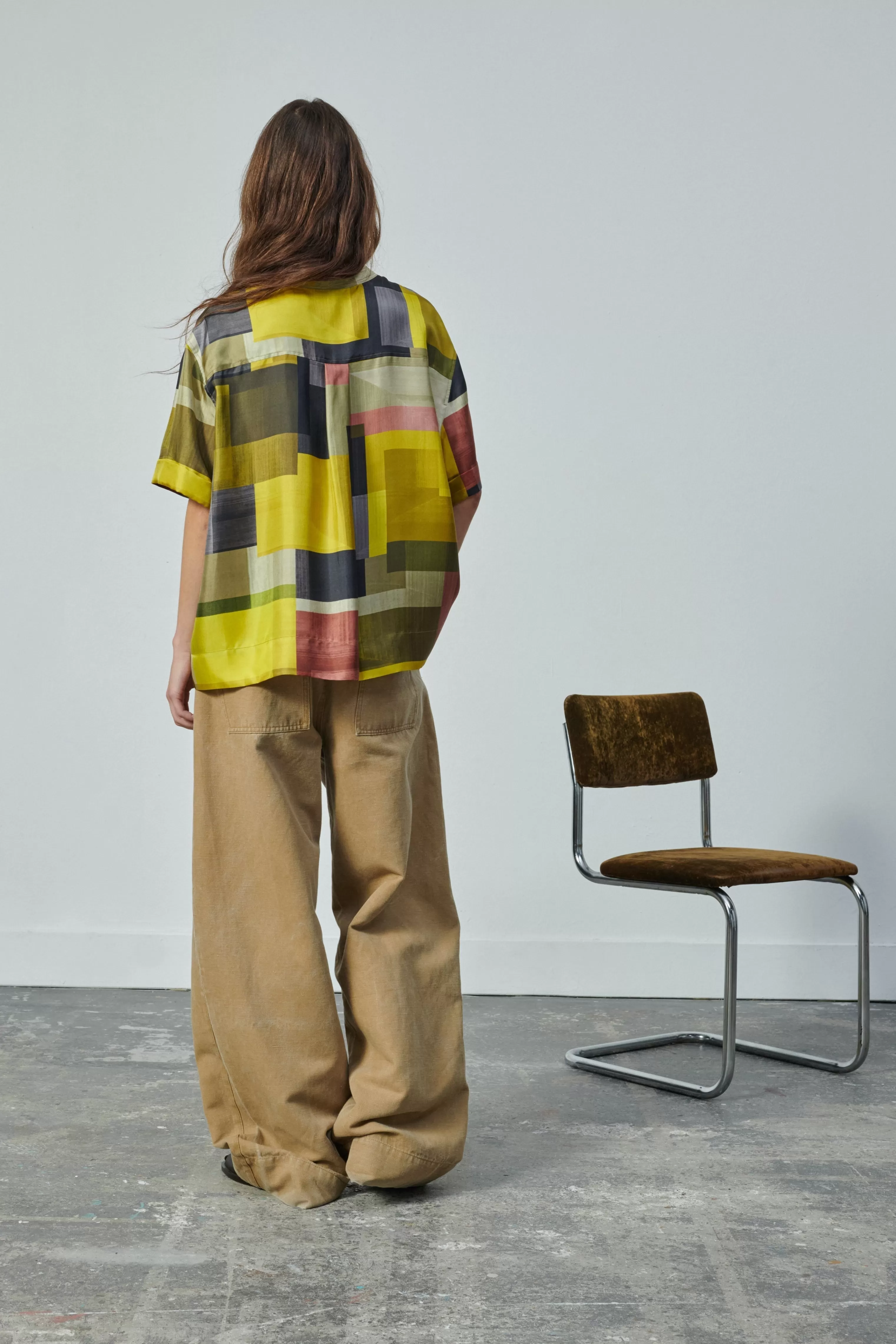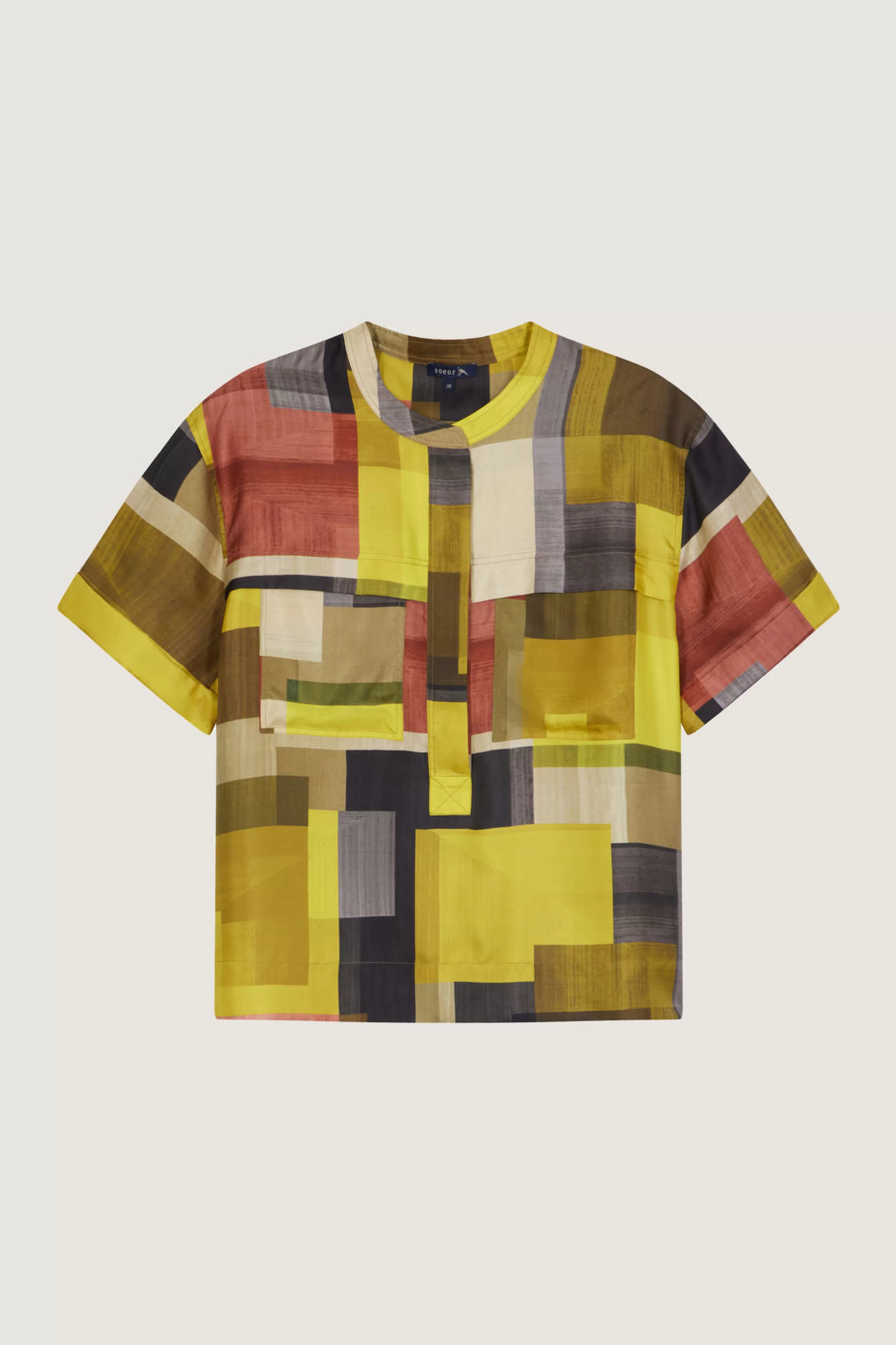 Blouse en twill de soie imprimé – Coupe droite et ample– Encolure ronde avec pied de col, ouverture boutonnée cachée– Manches courtes et larges à revers– Poches poitrines plaquées à rabat– Petites fentes sur les côtés