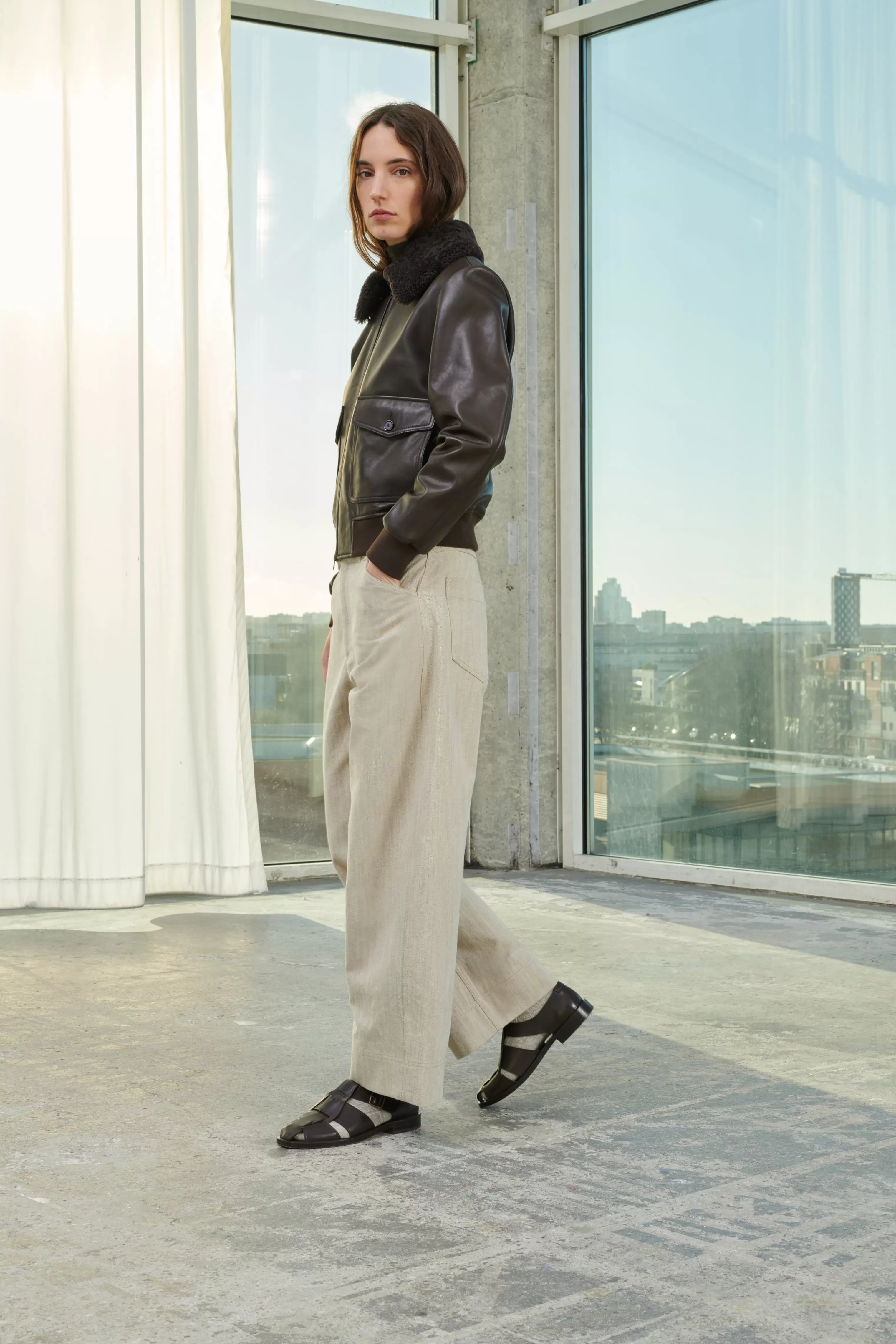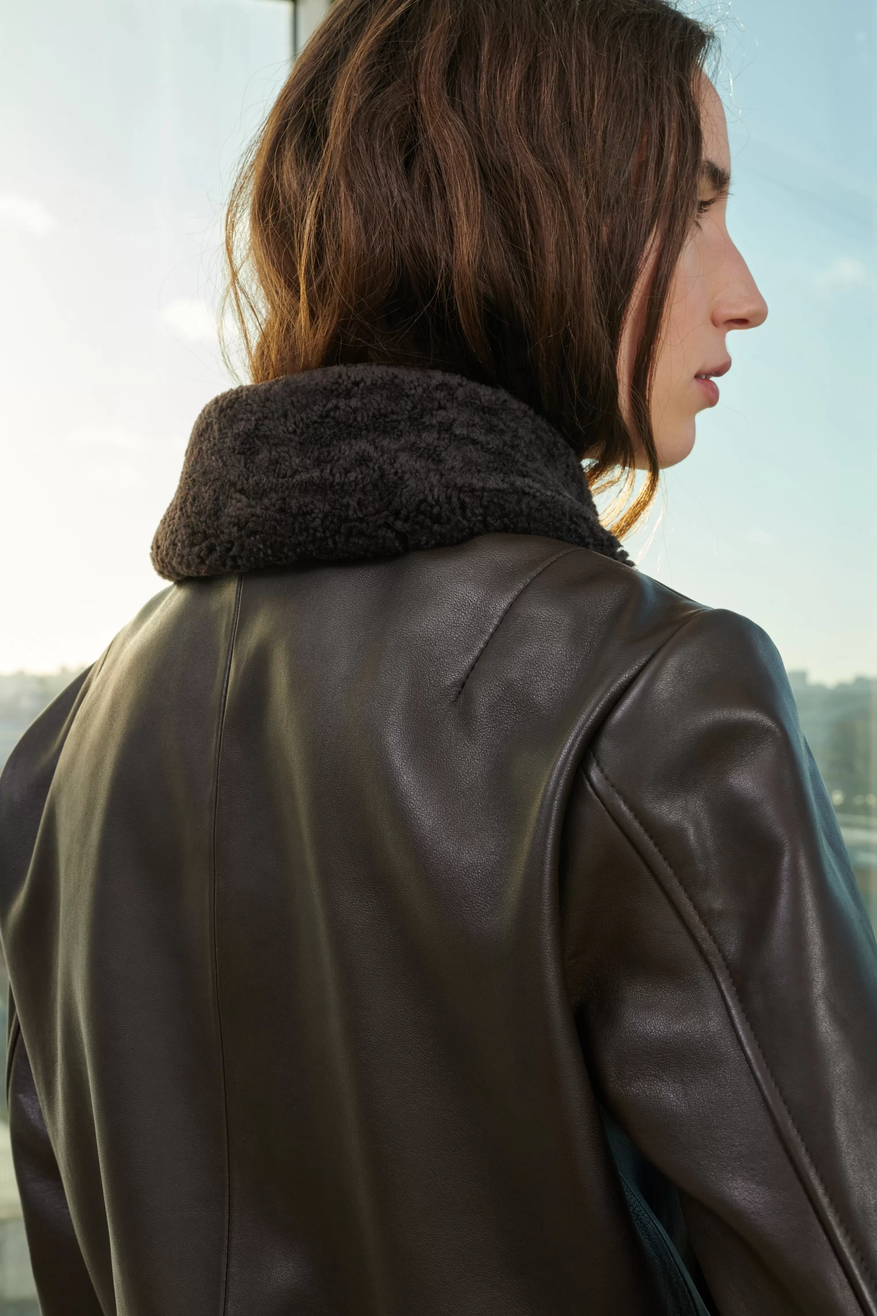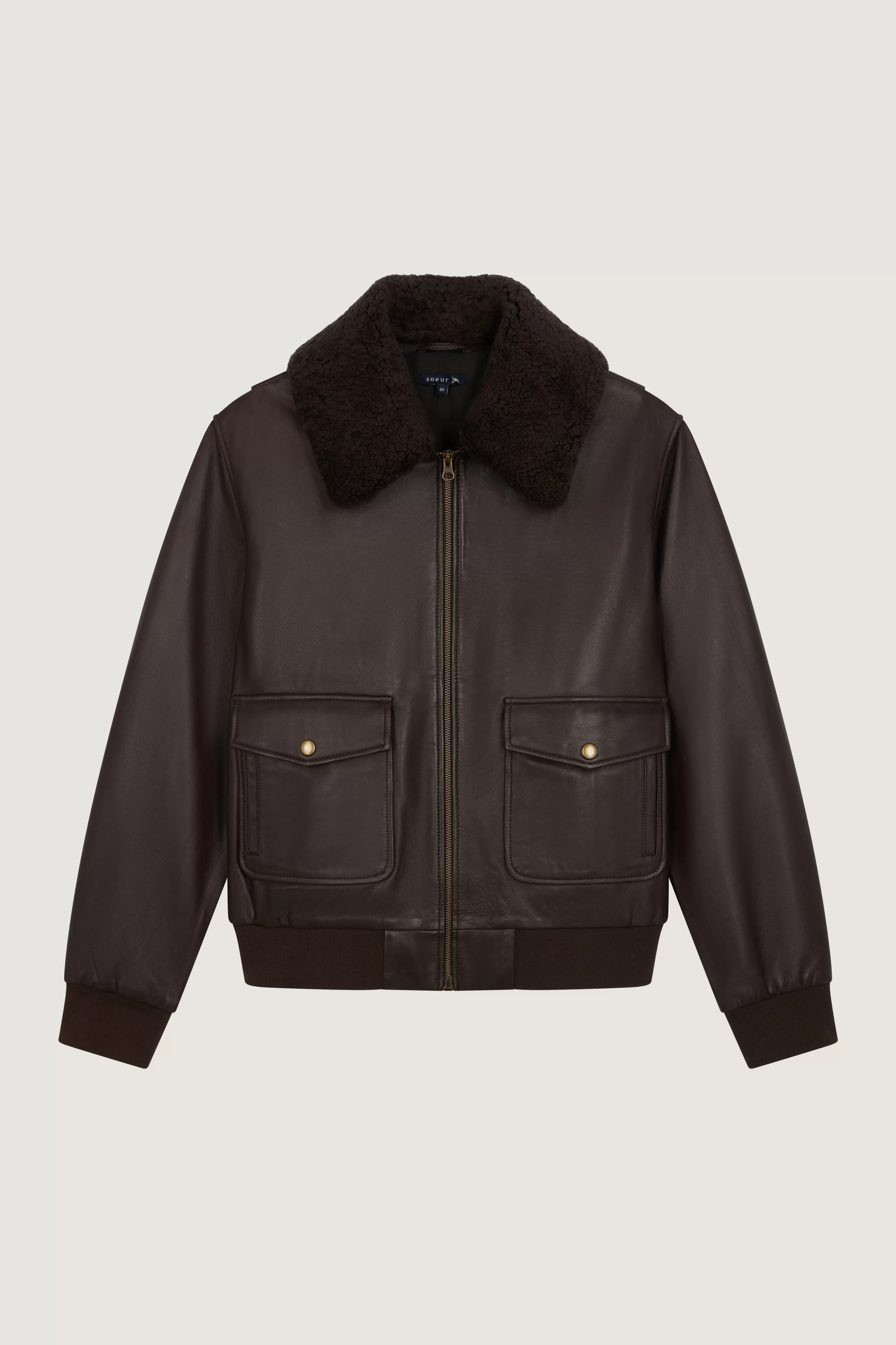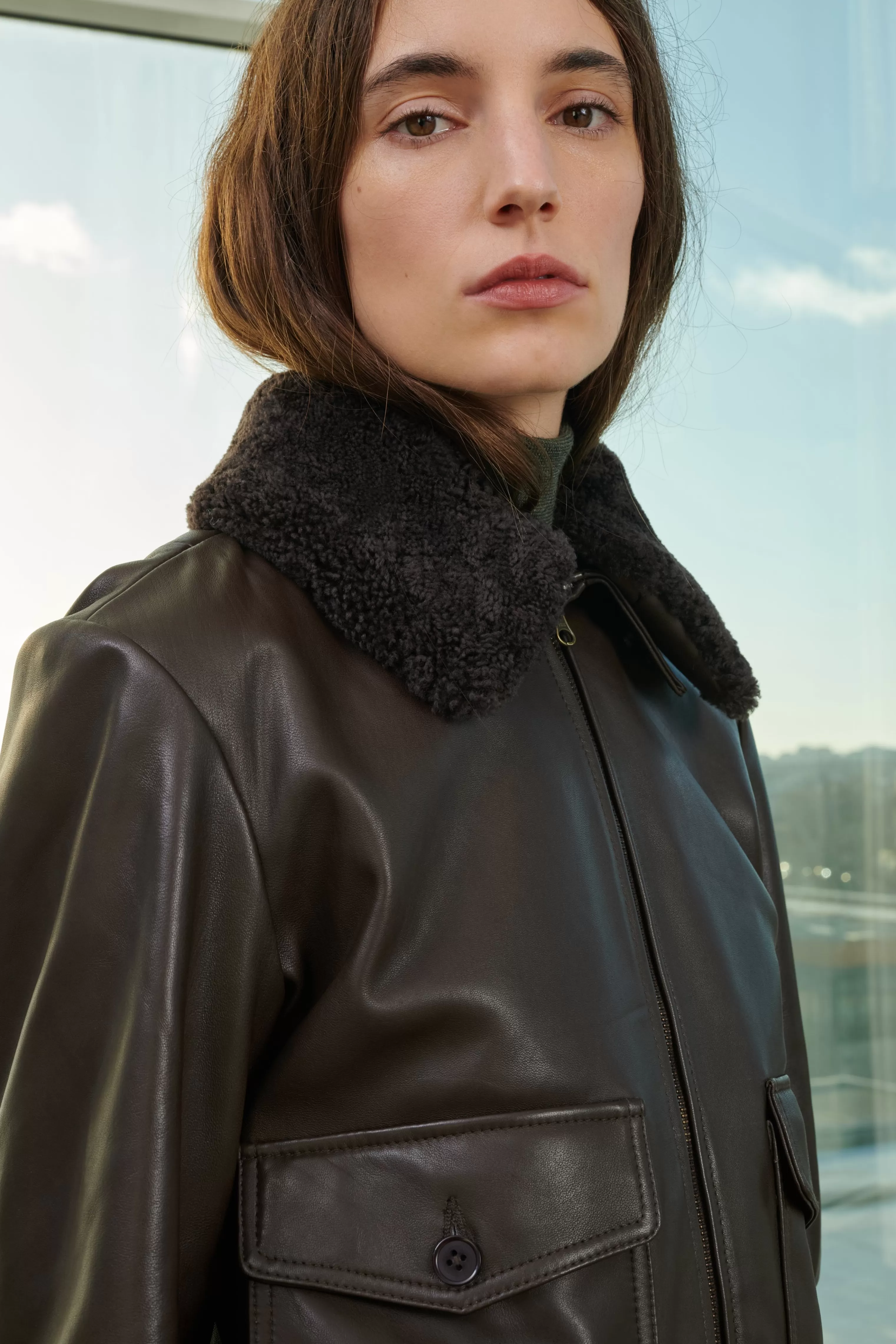 Blouson en cuir lisse d’agneau et col en fourrure – Coupe ajustée resserrée par bord côtes aux poignets et en bas de corps– Col en fourrure amovible– Ouverture zippée devant– Deux poches plaquées boutonnées à rabat