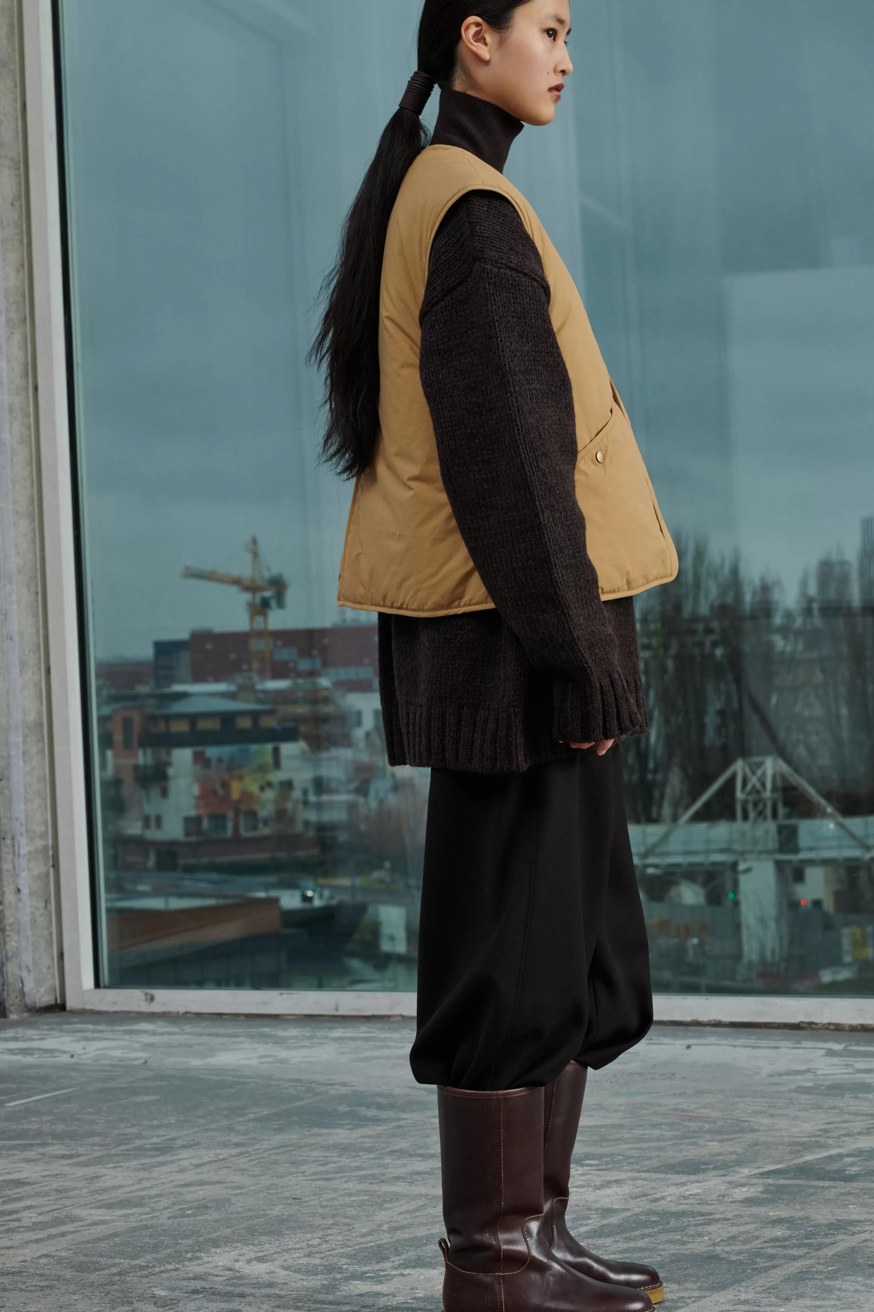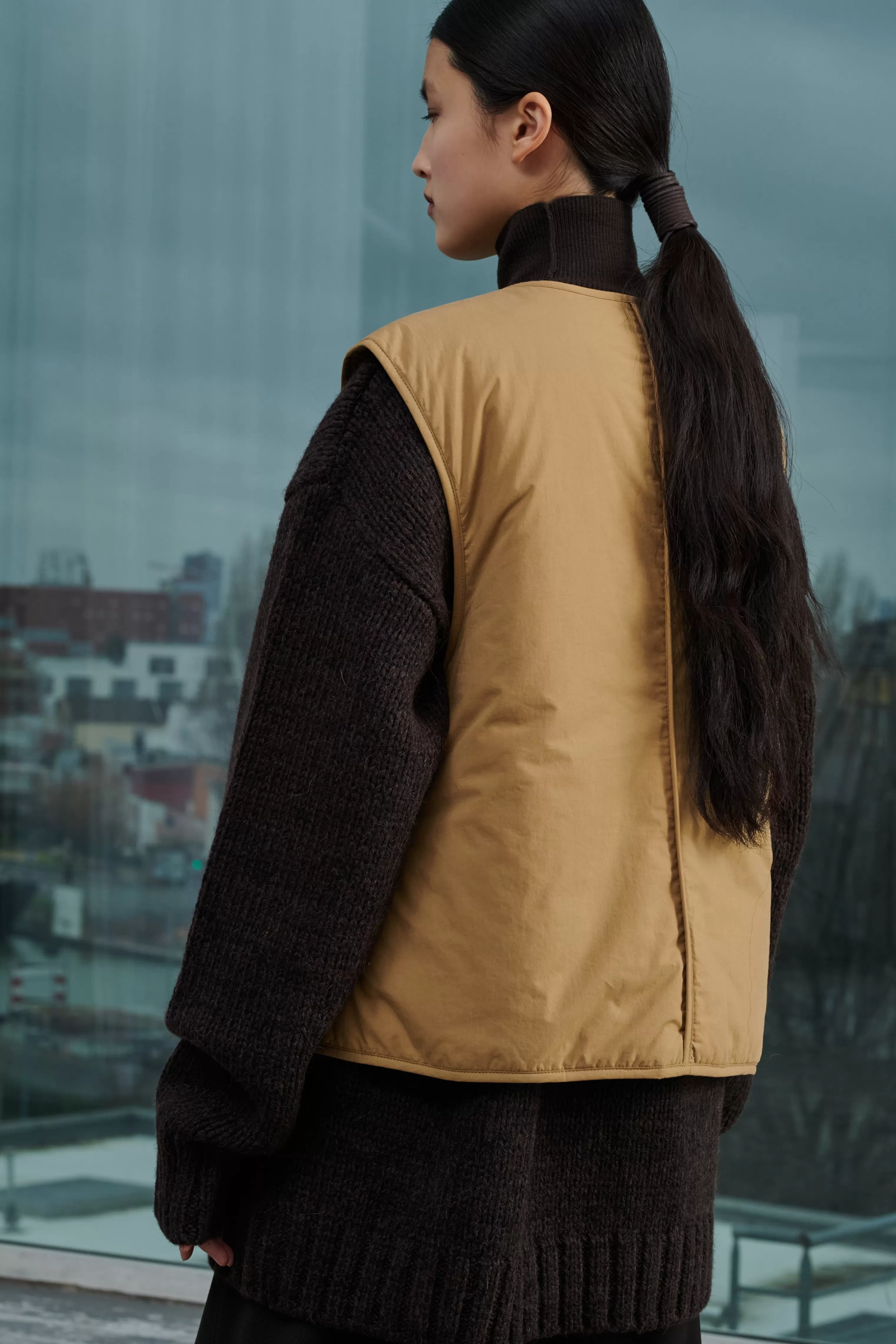 Doudoune sans-manche en coton – Gilet coupe ample, rembourrage léger– Fermeture à boutons pressions– Encolure ronde– Poches passepoilées – Sans manches