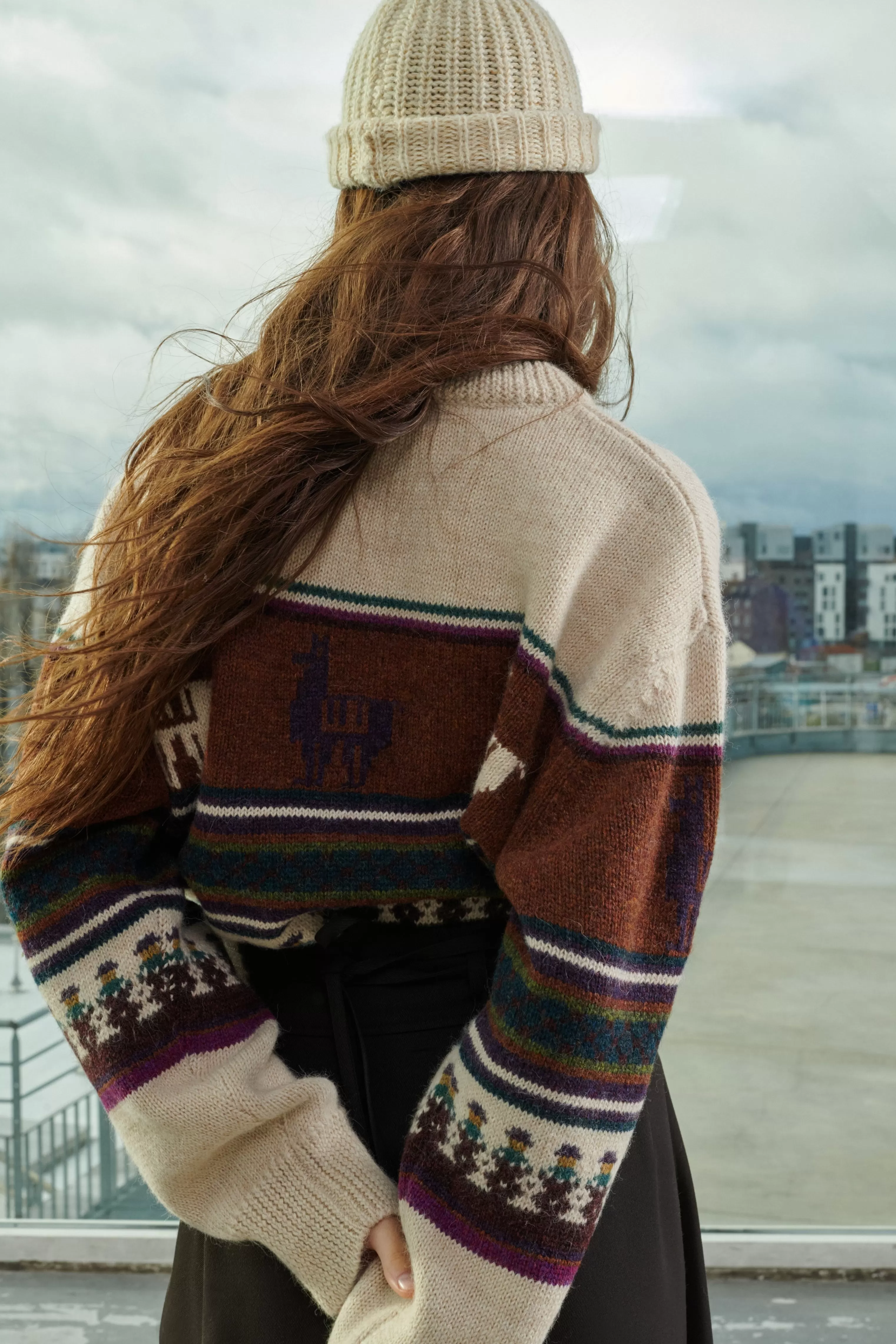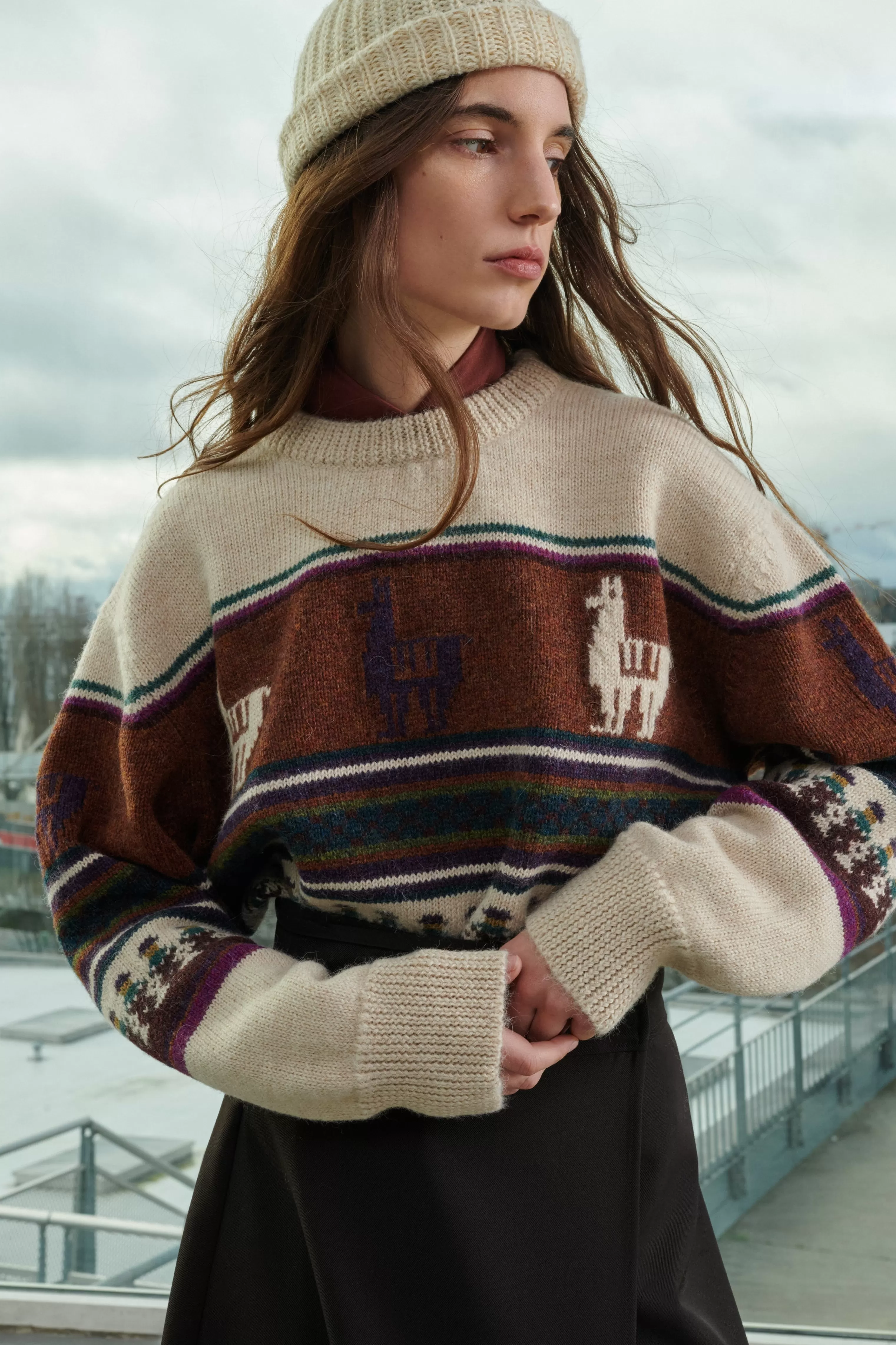 Cette maille est tricotée dans un fil subtilement chiné. Le fil de lin beige sec contraste avec le poil long et duveteux de l’alpaga écru. C’est un lainage unique qui traduit le savoir-faire de notre atelier de tricot à l’ile Maurice.