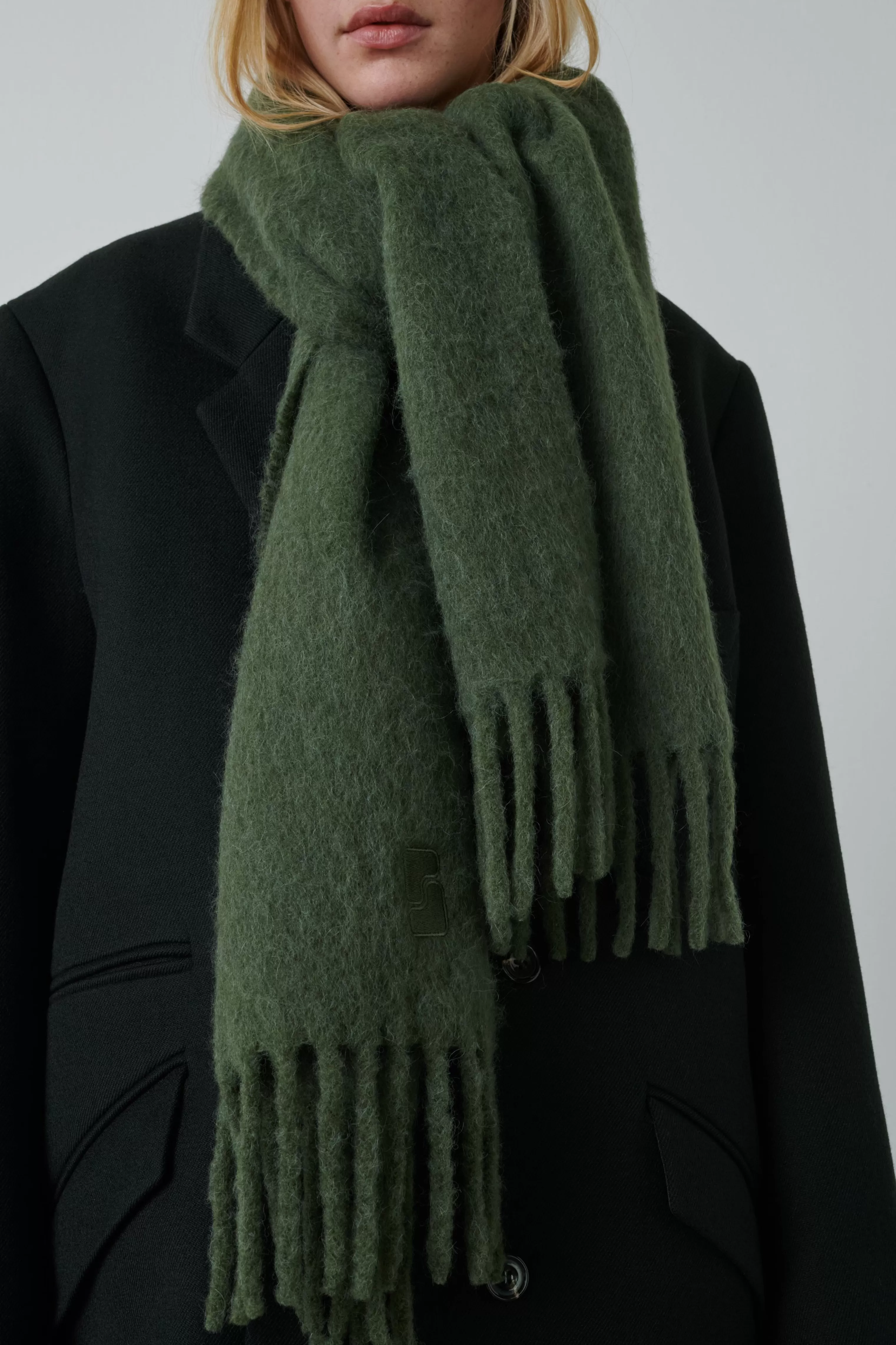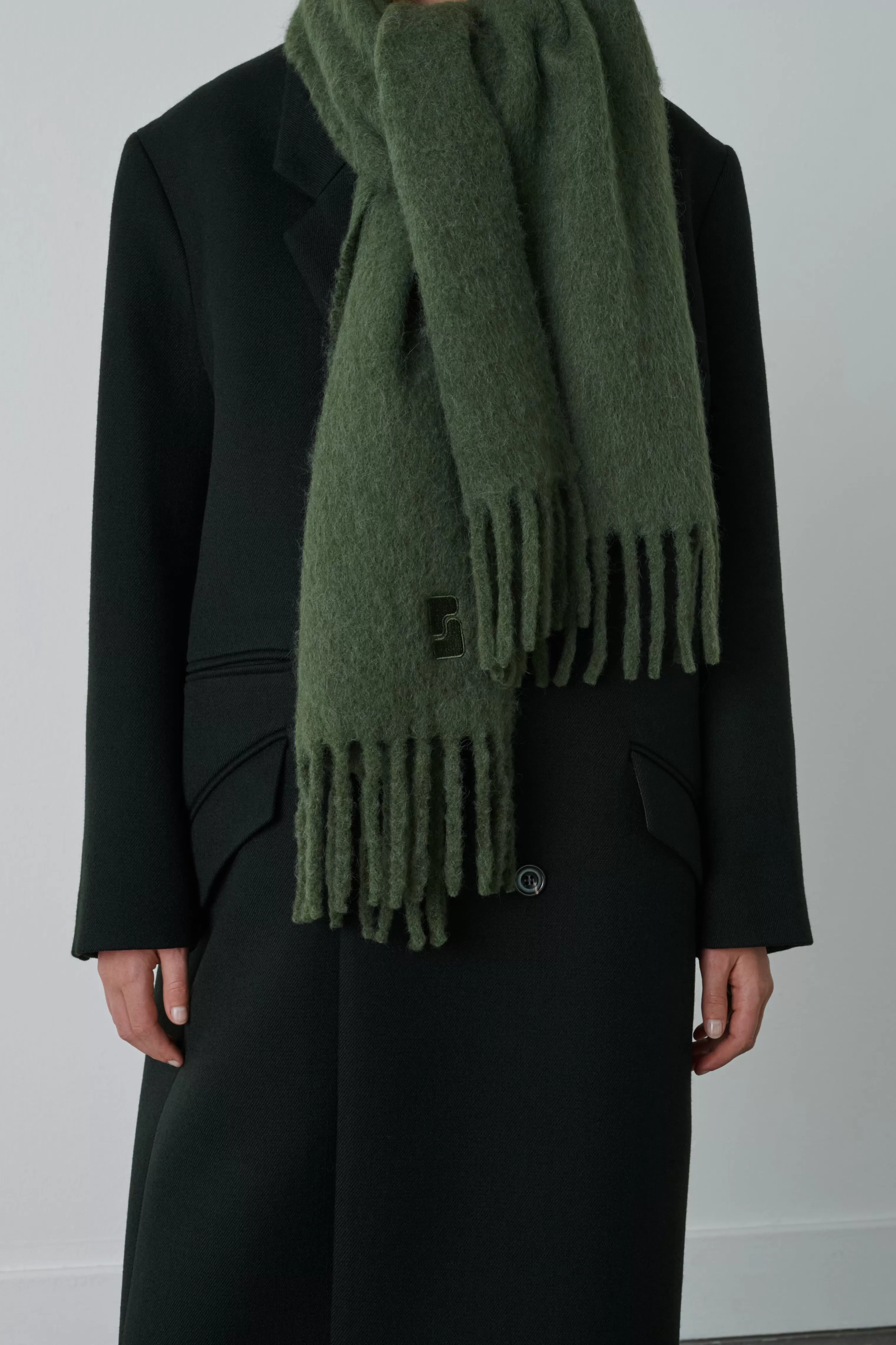 Écharpe unie à franges – 80% Alpaga – 20% Polyamide – 37cm x 220cm (franges comprises)– Détail broderie logo