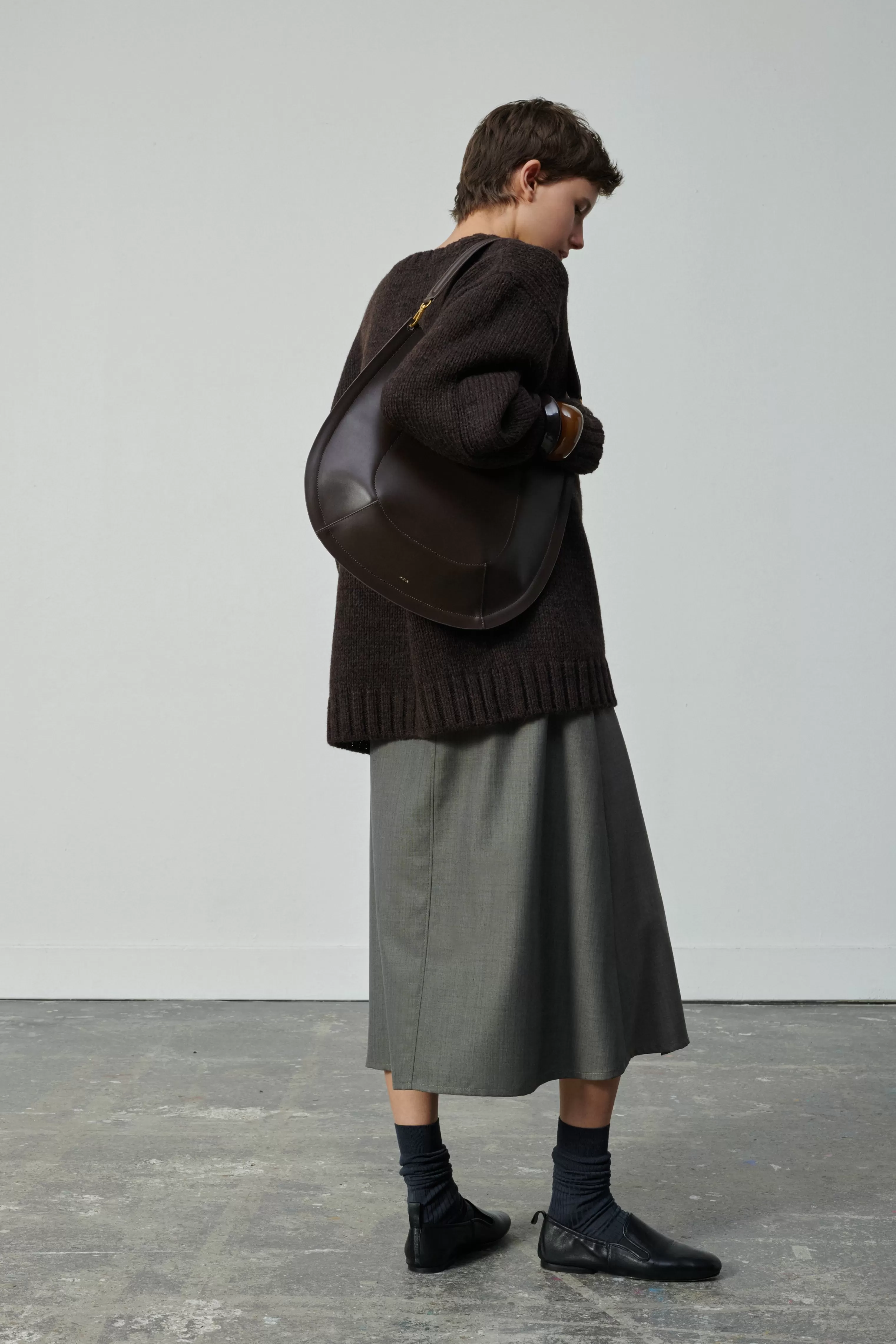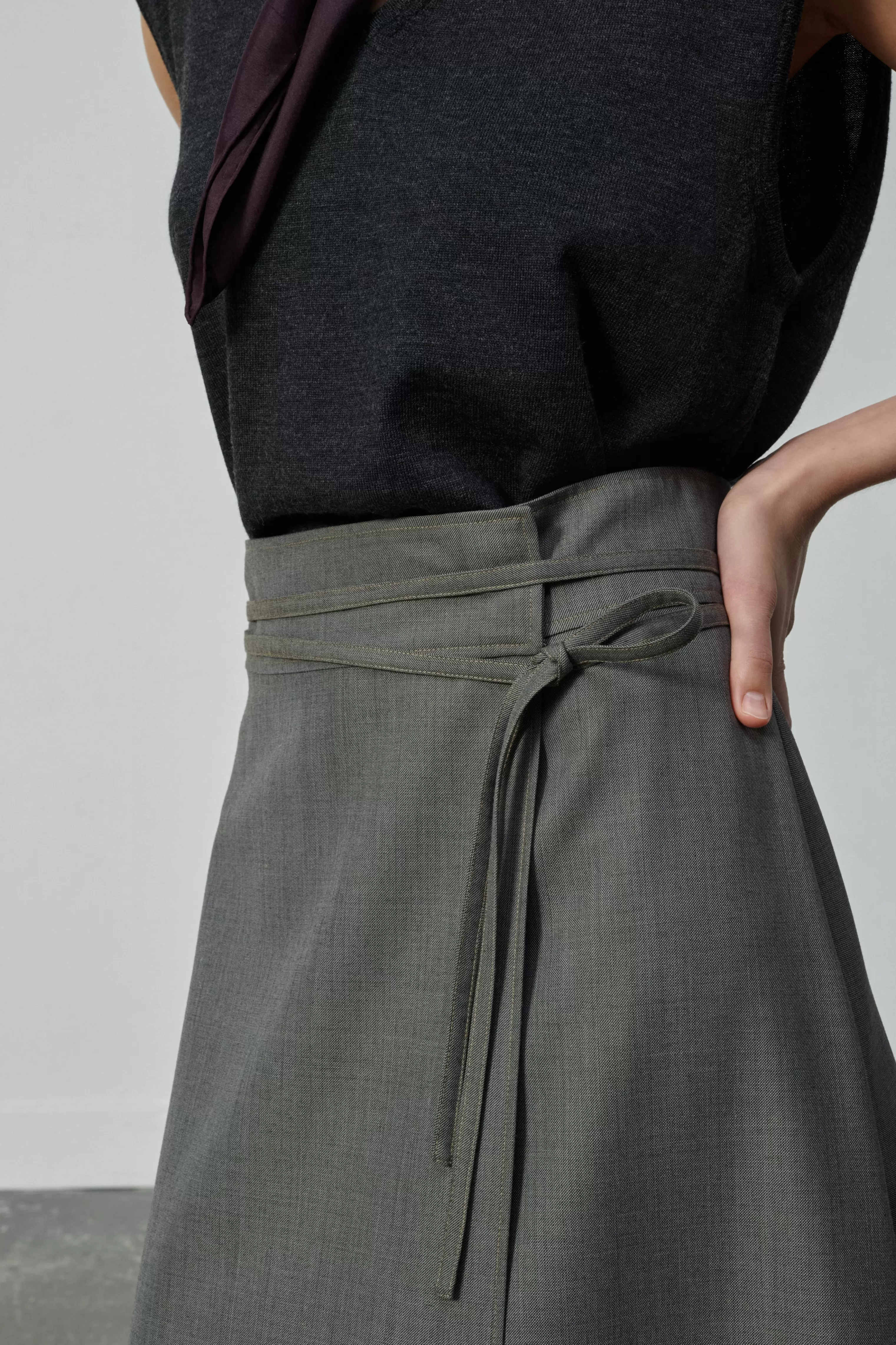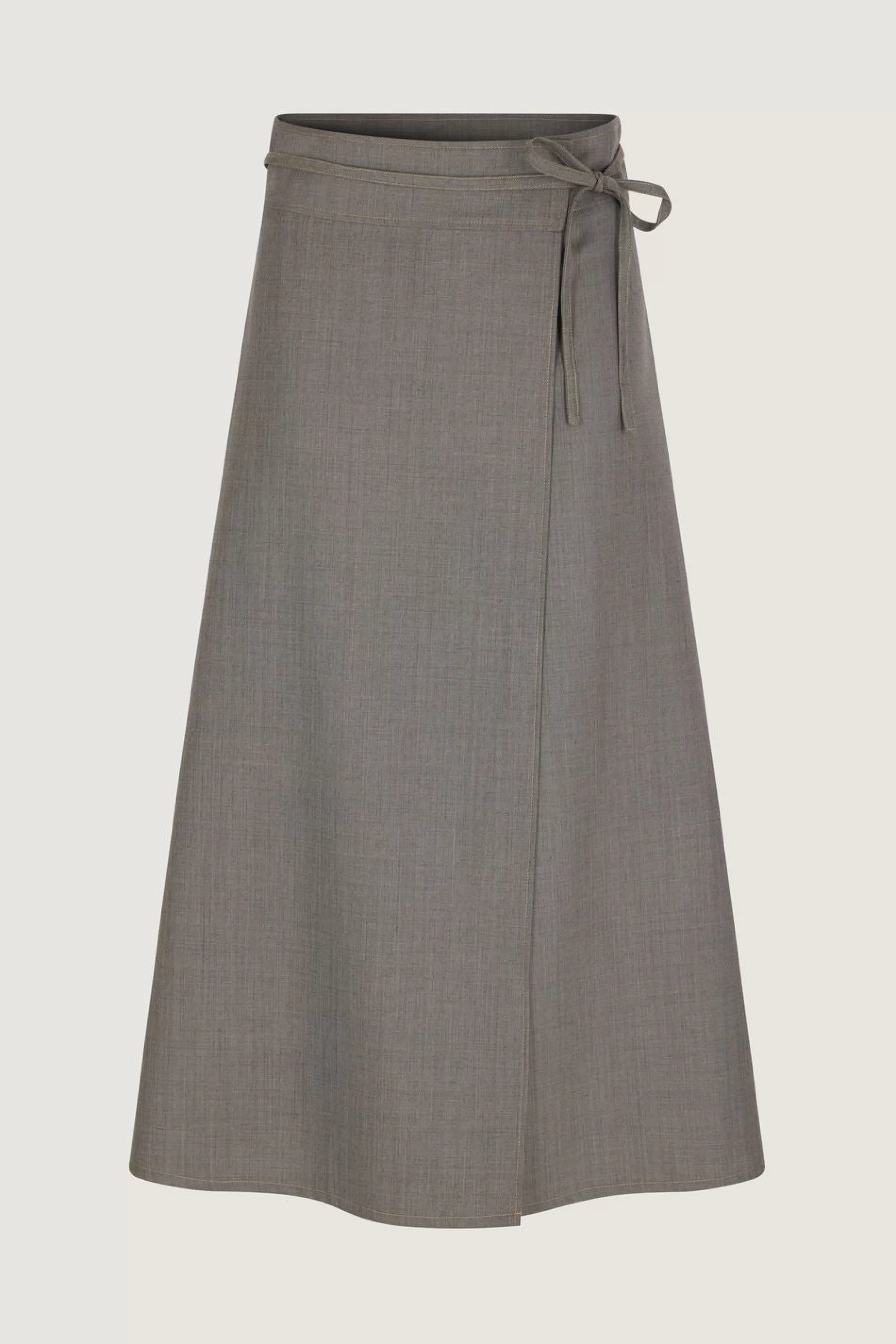 Jupe porte-feuille longueur midi en fil à fil de laine – Jupe porte-feuille– Volume trapèze, taille haute– Large ceinture et lien noué à la taille