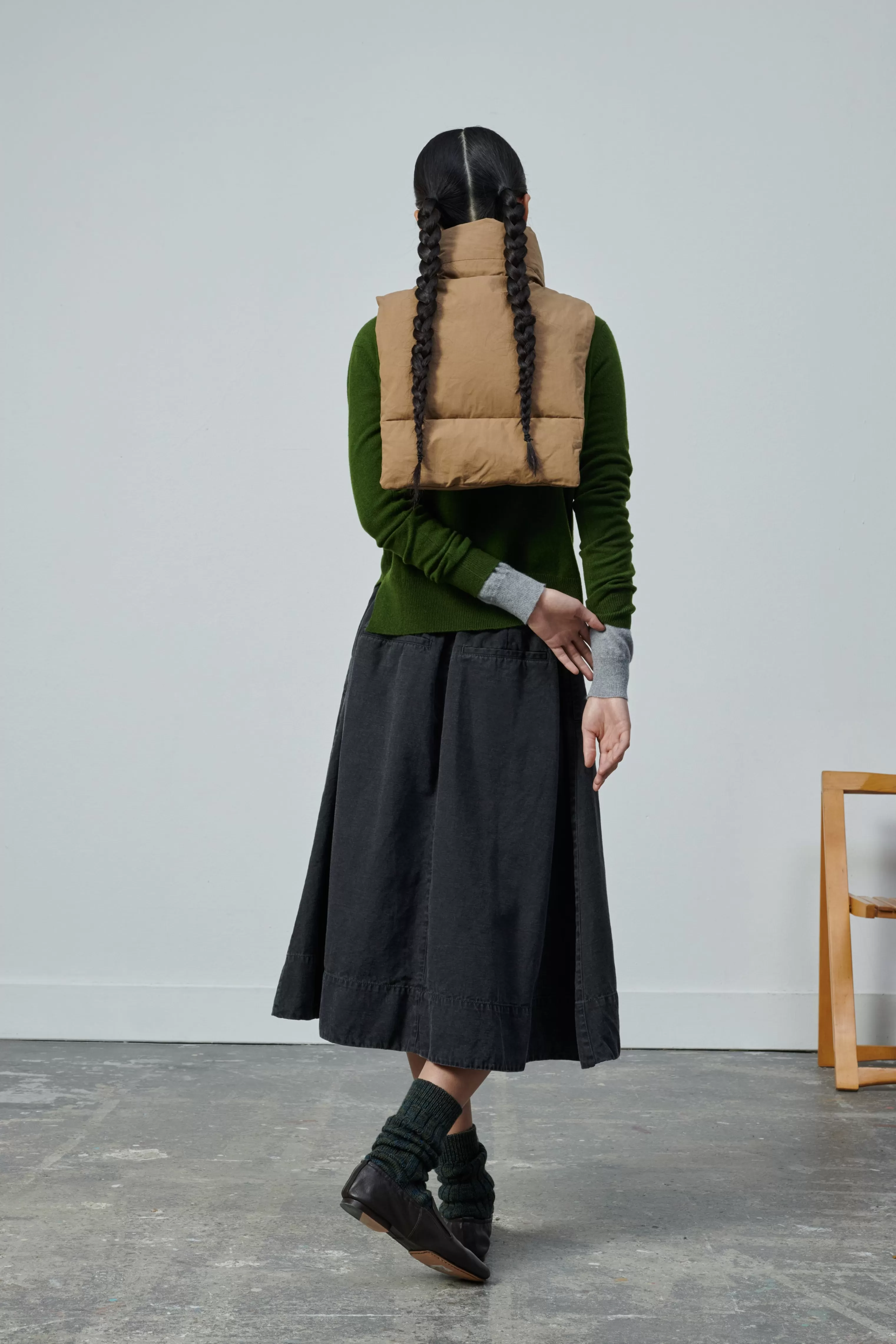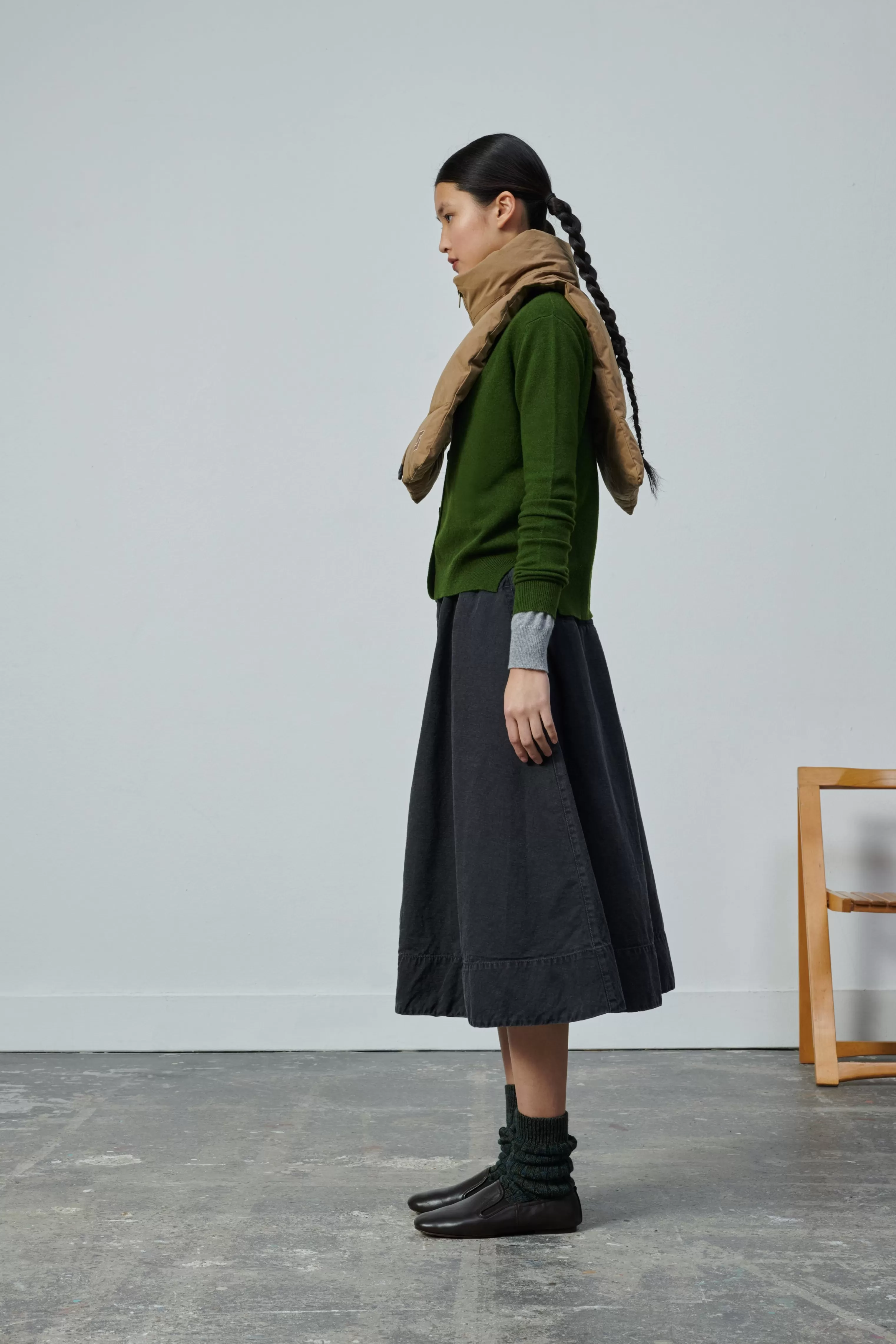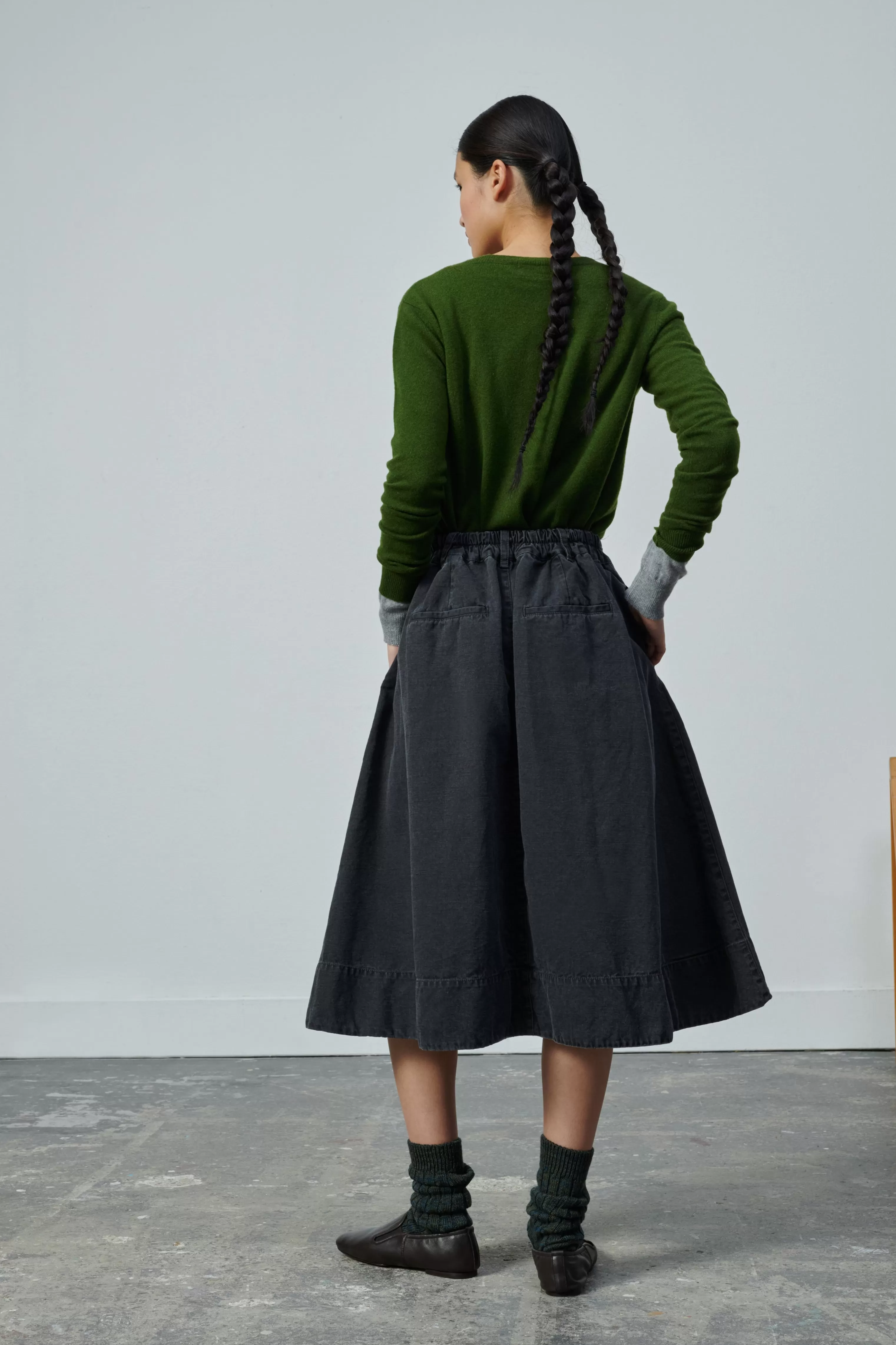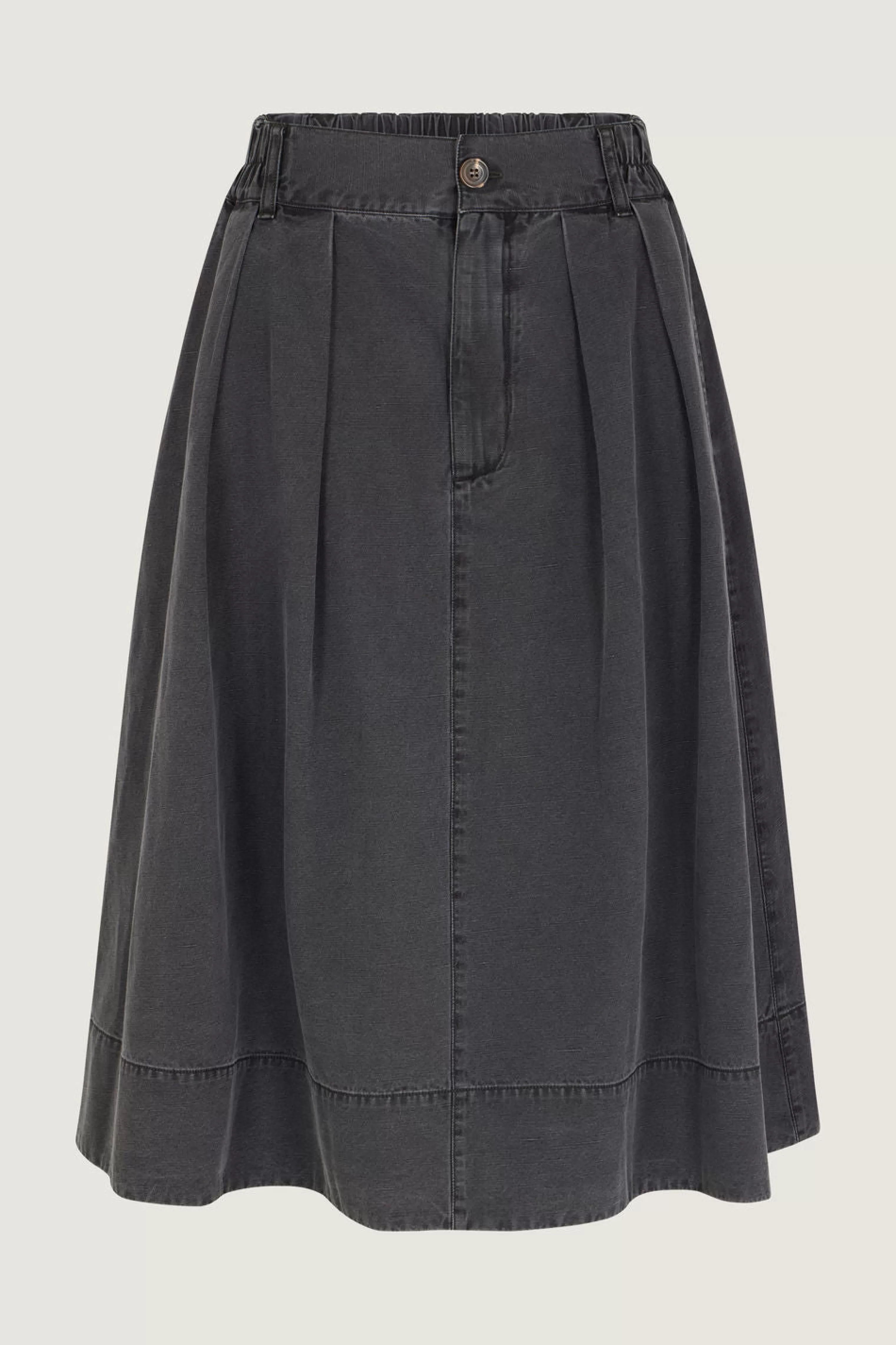 Jupe en coton lin lavé – Coupe trapèze– Ceinture élastiquée devant et dos– Poches côtés inserées dans les coutures et poches dos passepoilées