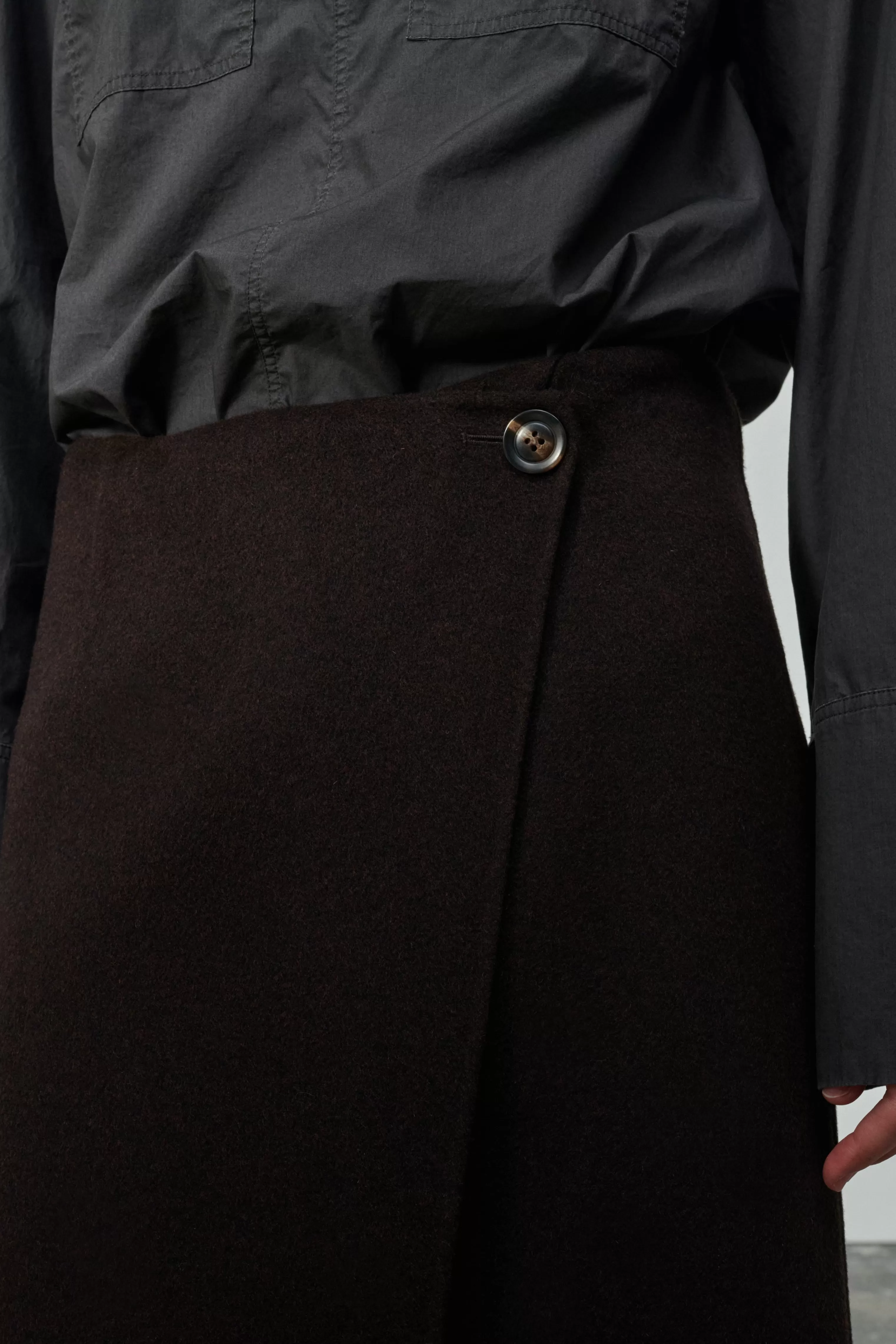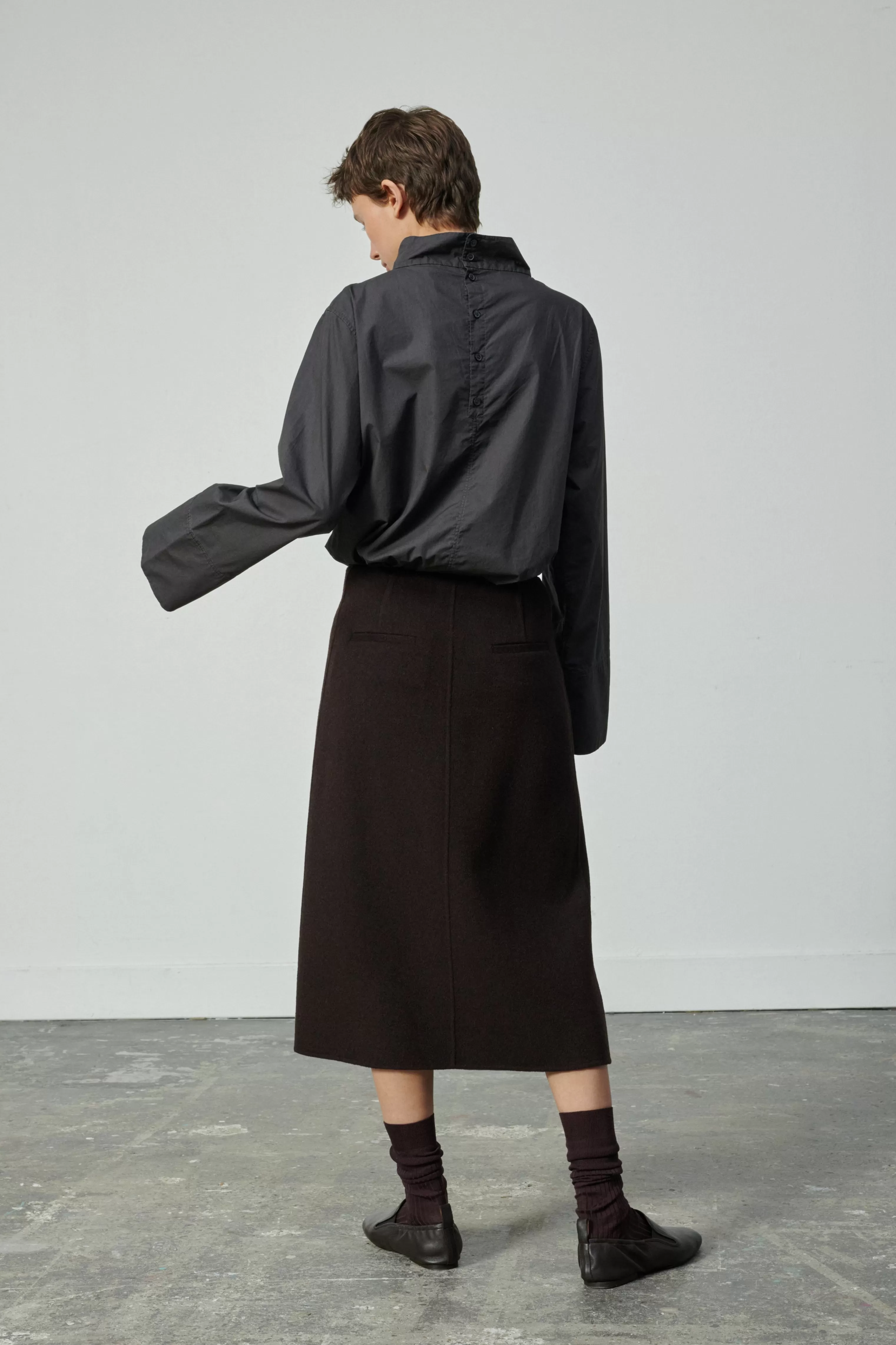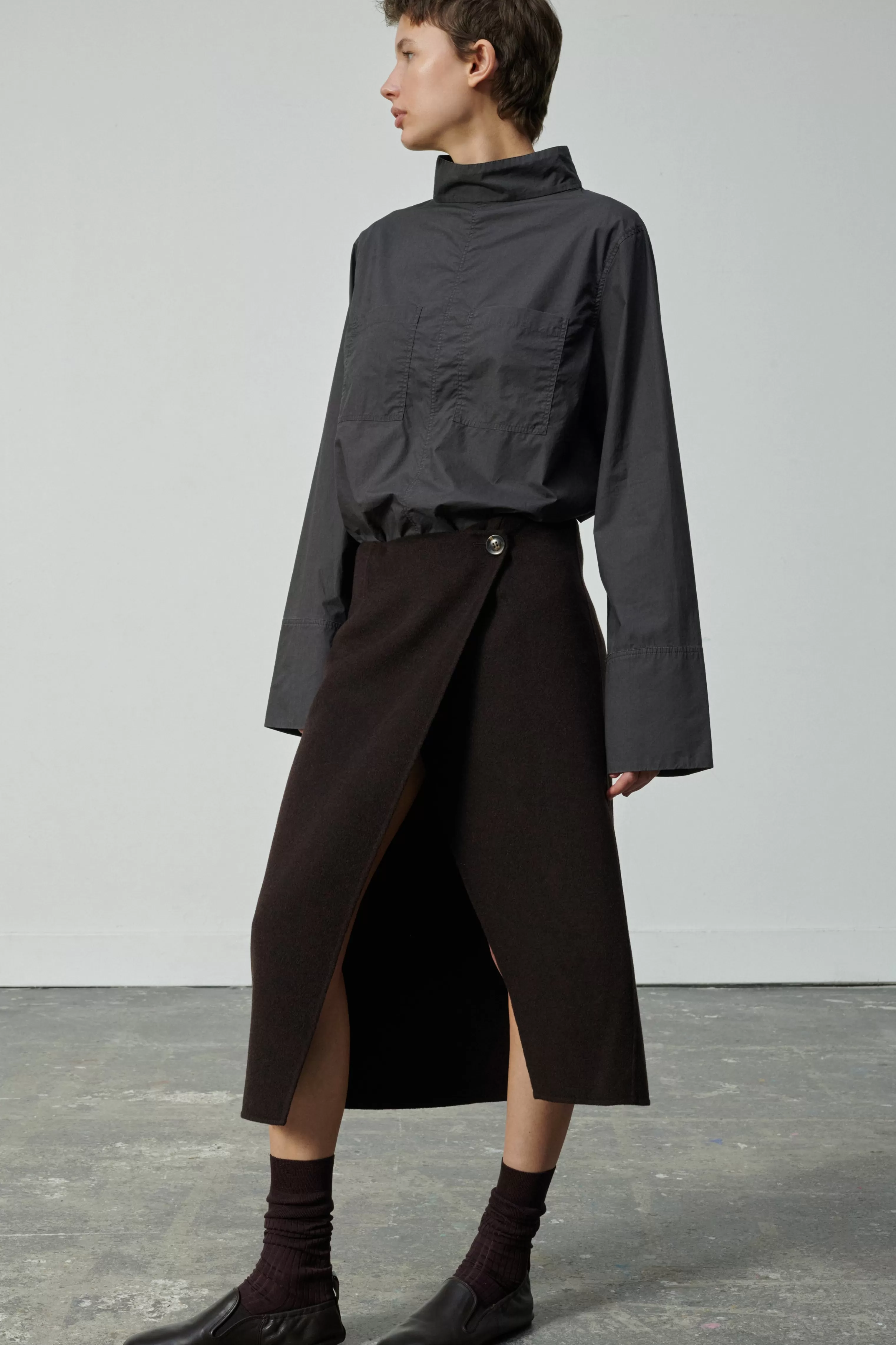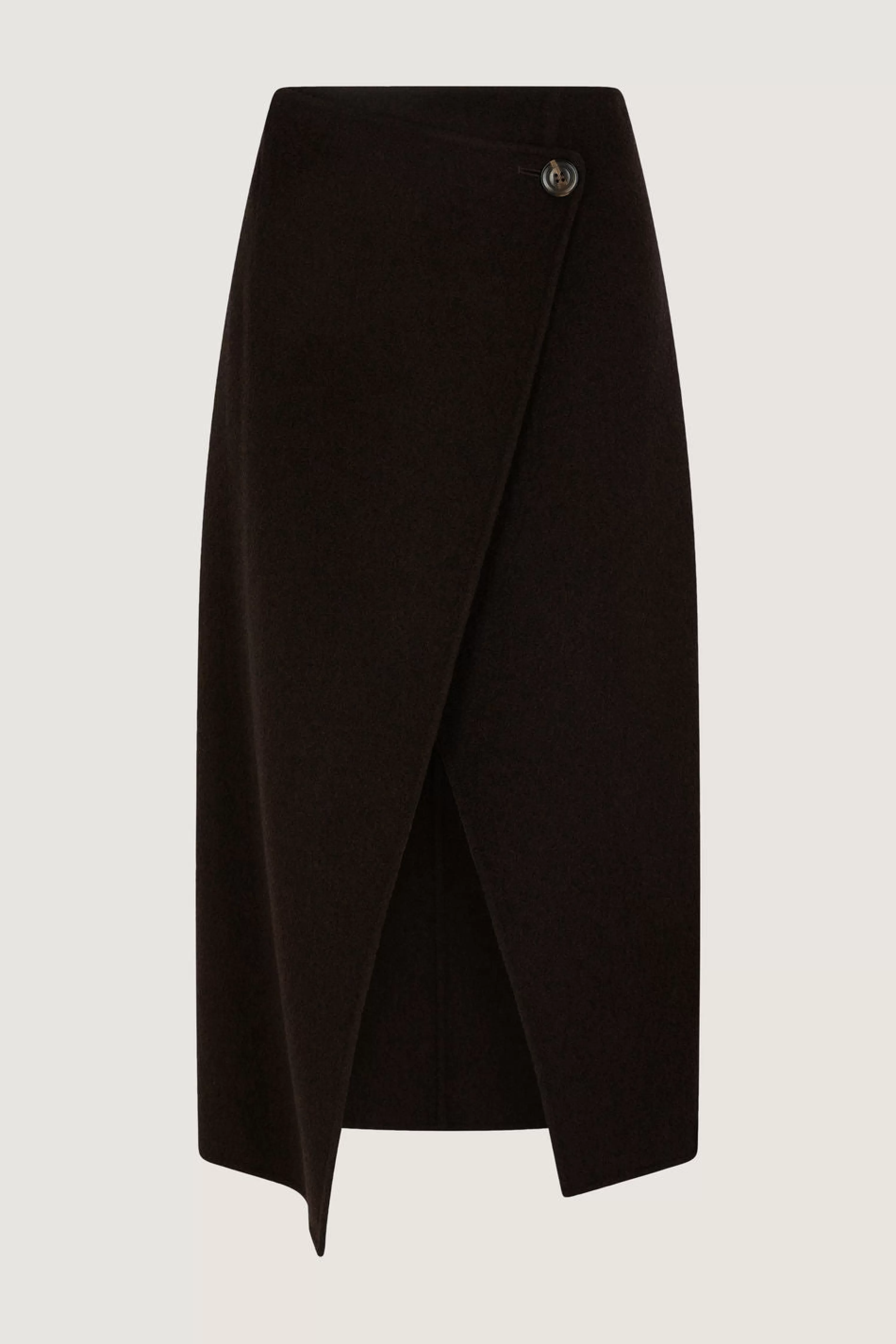 Jupe porte-feuille asymétrique en laine double face – Jupe porte-feuille asymétrique– Volume trapèze, taille haute– Boutonnée sur le côté– Poche passepoilée au dos– Pincée devant et au dos