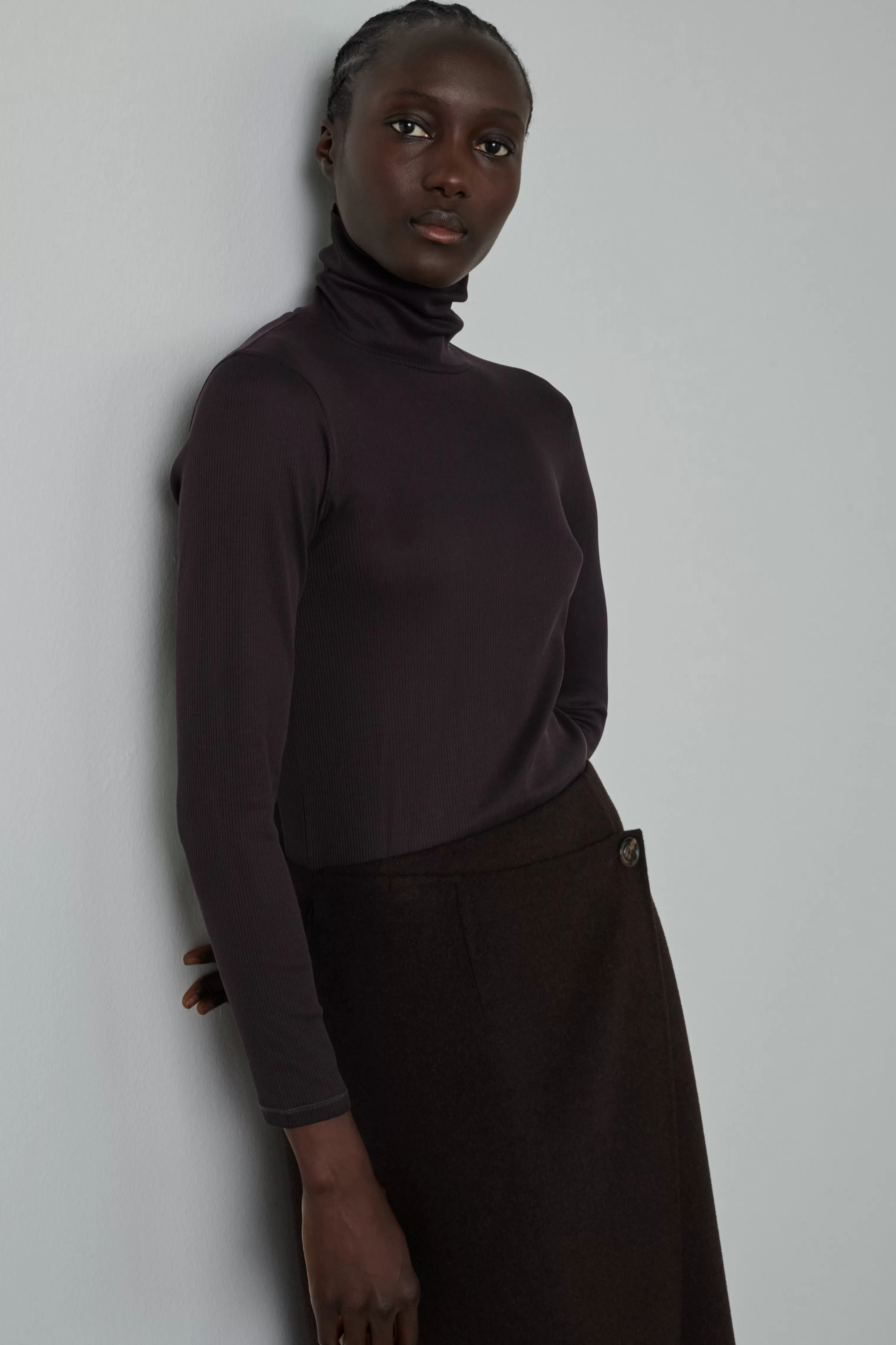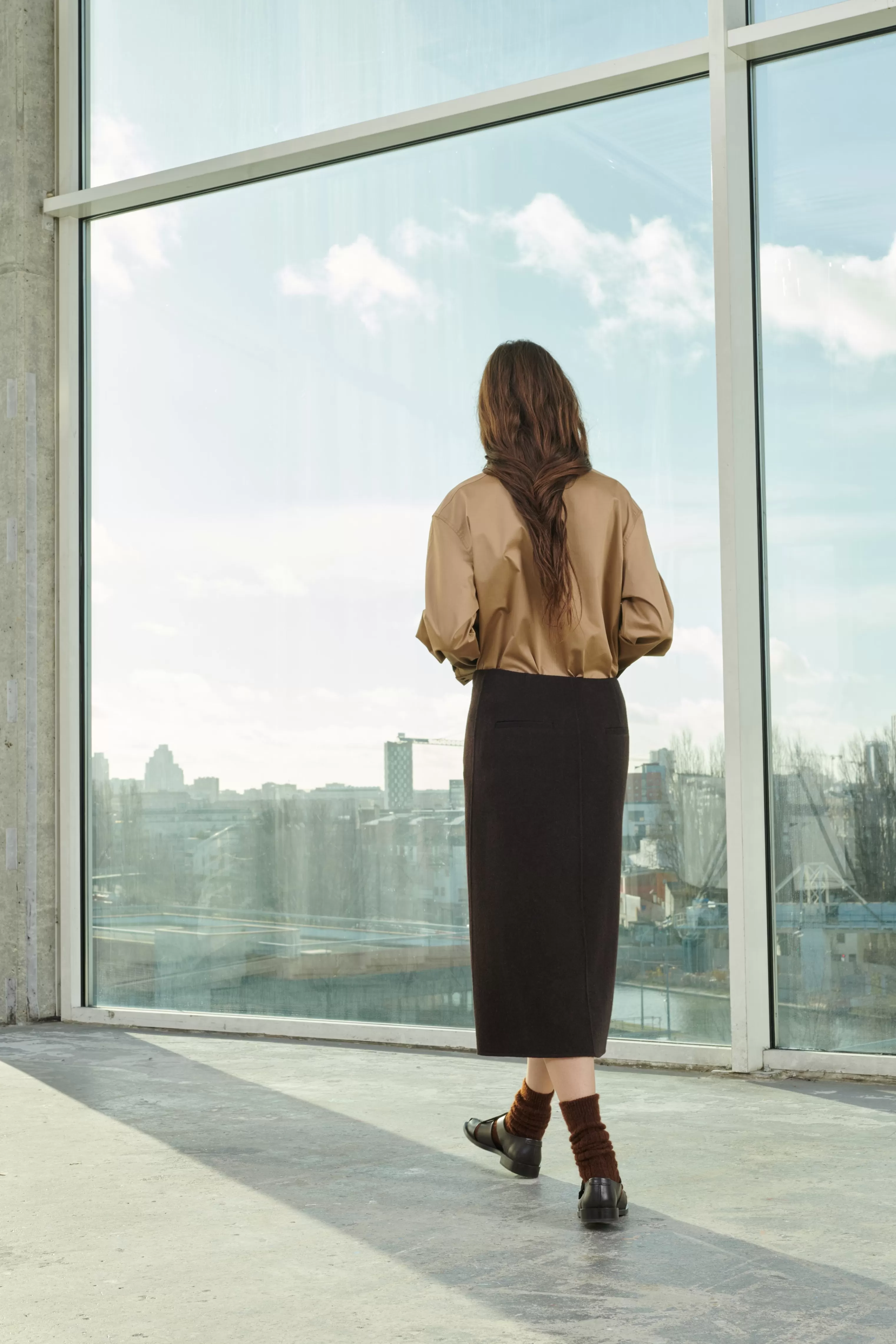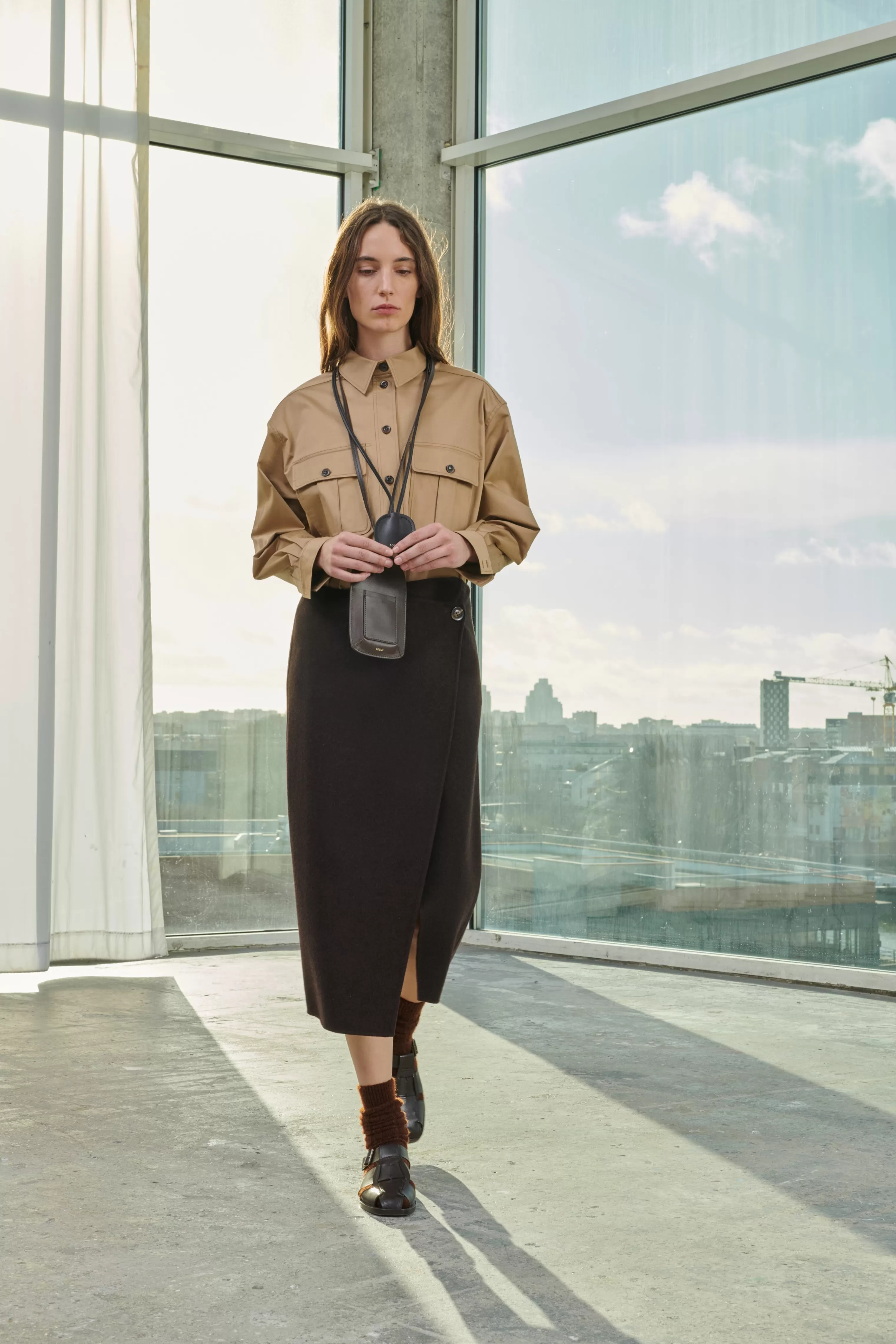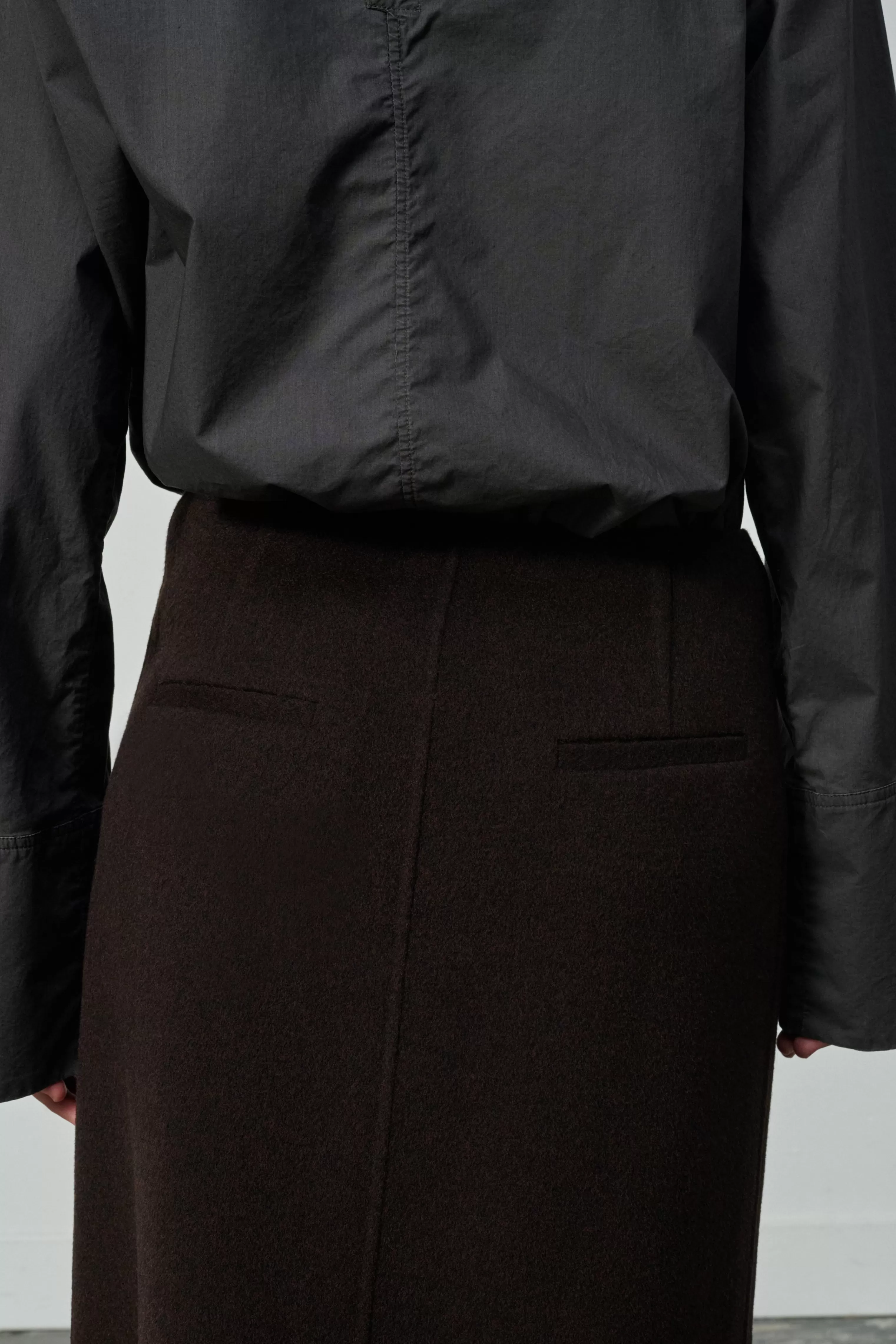 Jupe porte-feuille asymétrique en laine double face – Jupe porte-feuille asymétrique– Volume trapèze, taille haute– Boutonnée sur le côté– Poche passepoilée au dos– Pincée devant et au dos