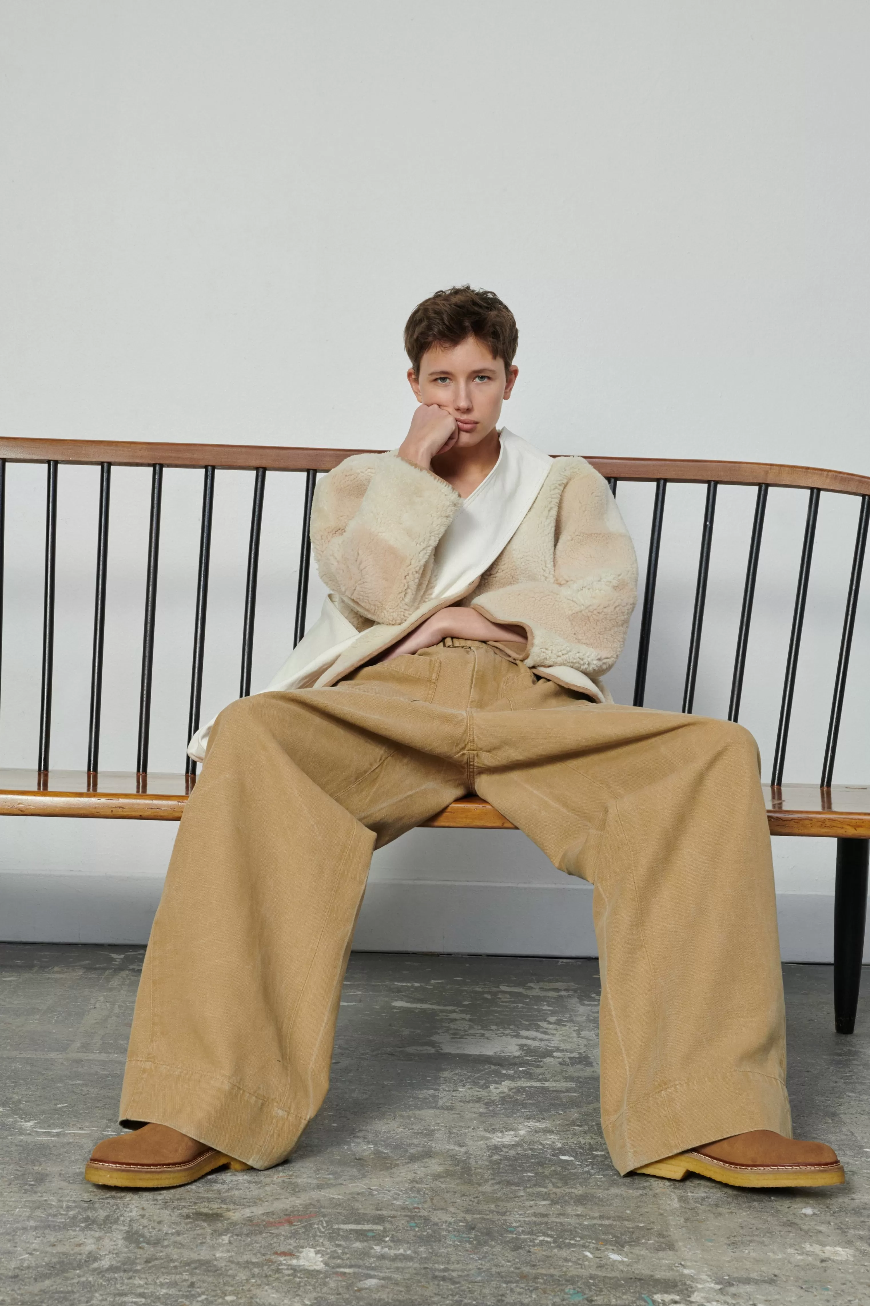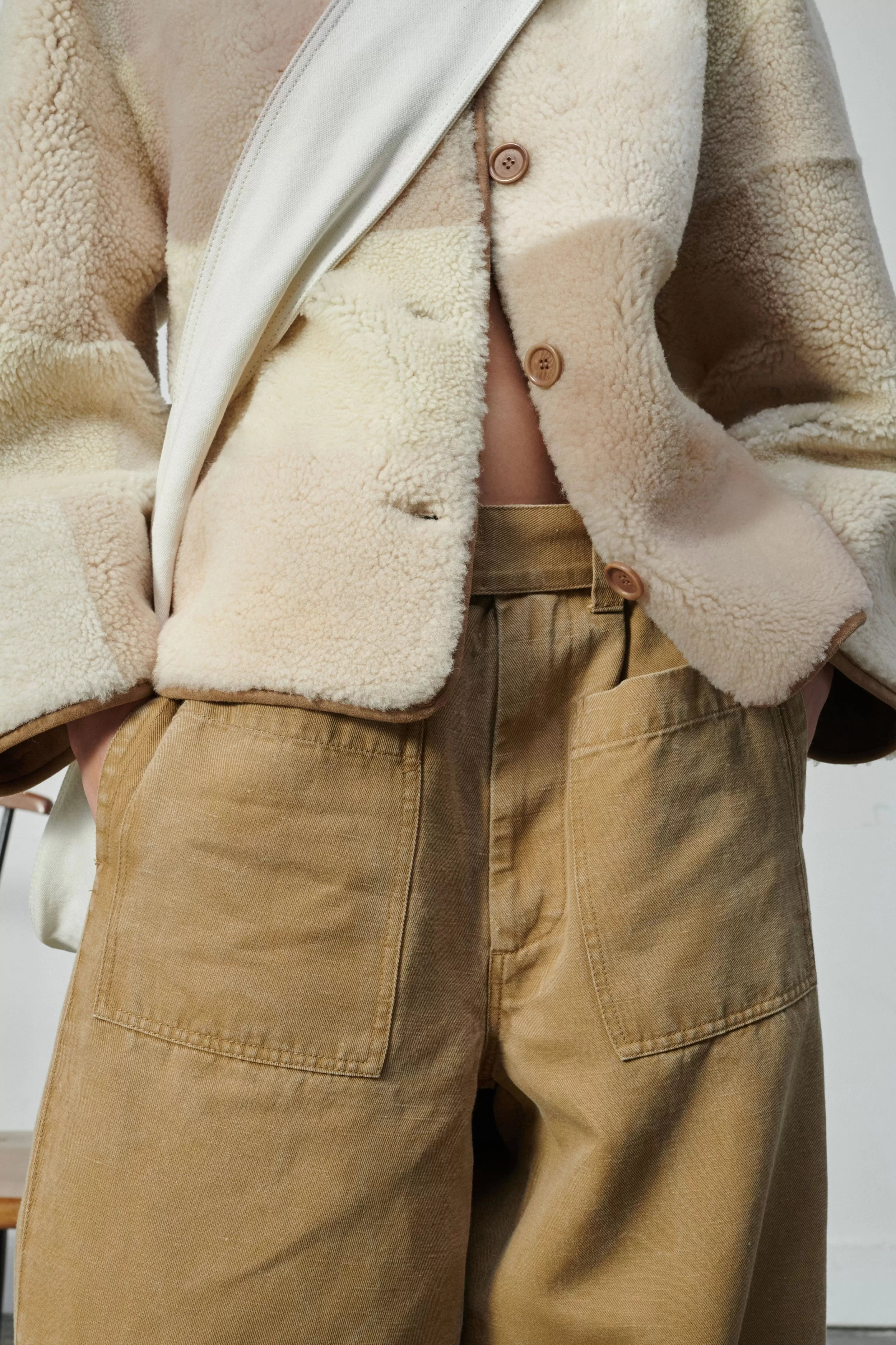 Cette pièce est en peau lainée naturelle, composée de morceaux aux nuances écrues, beiges et rosées. Elle est réversible. La peau garde la laine de l’animal sur une face et conserve la peau à l’aspect velours de l’autre.