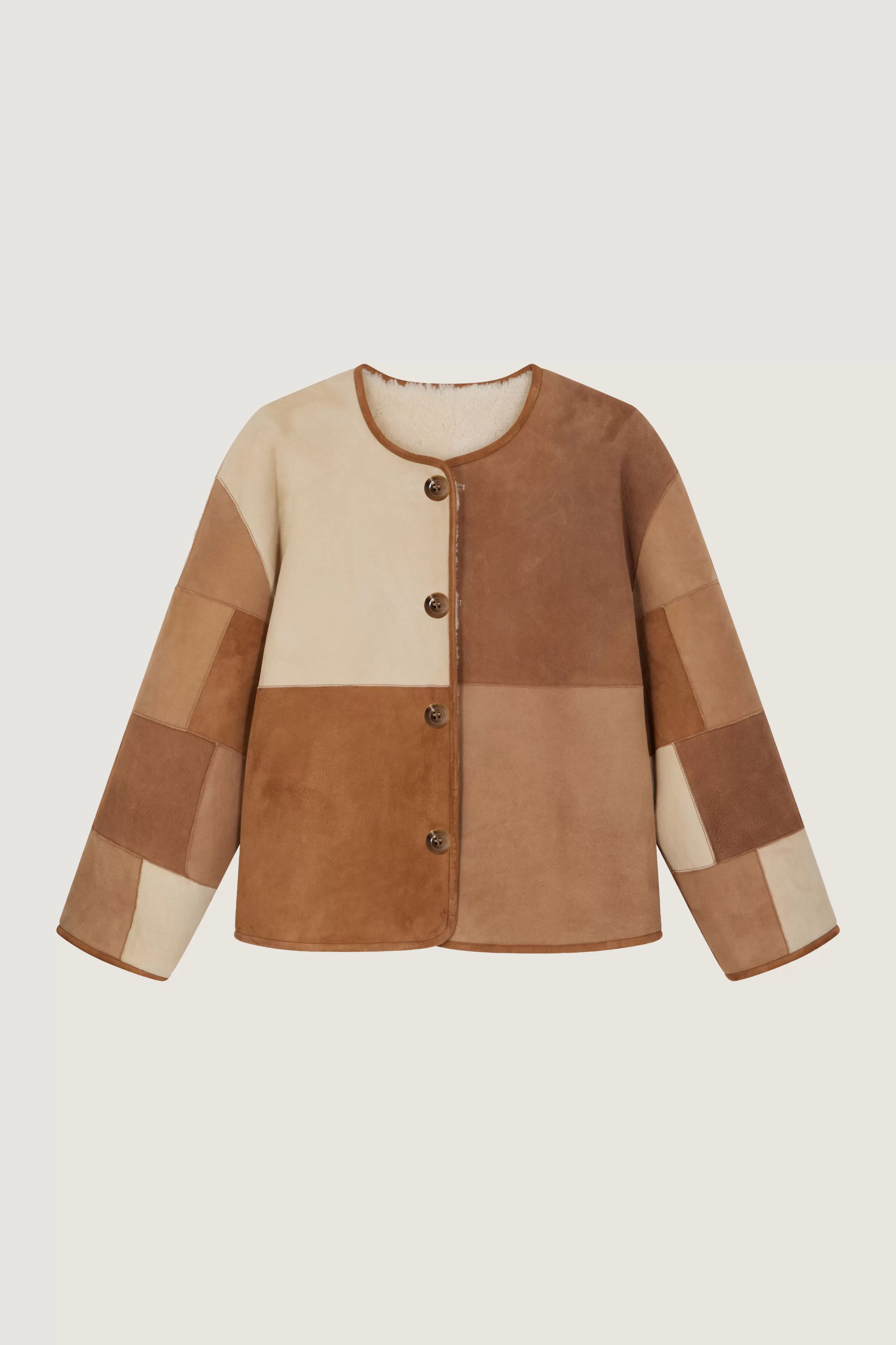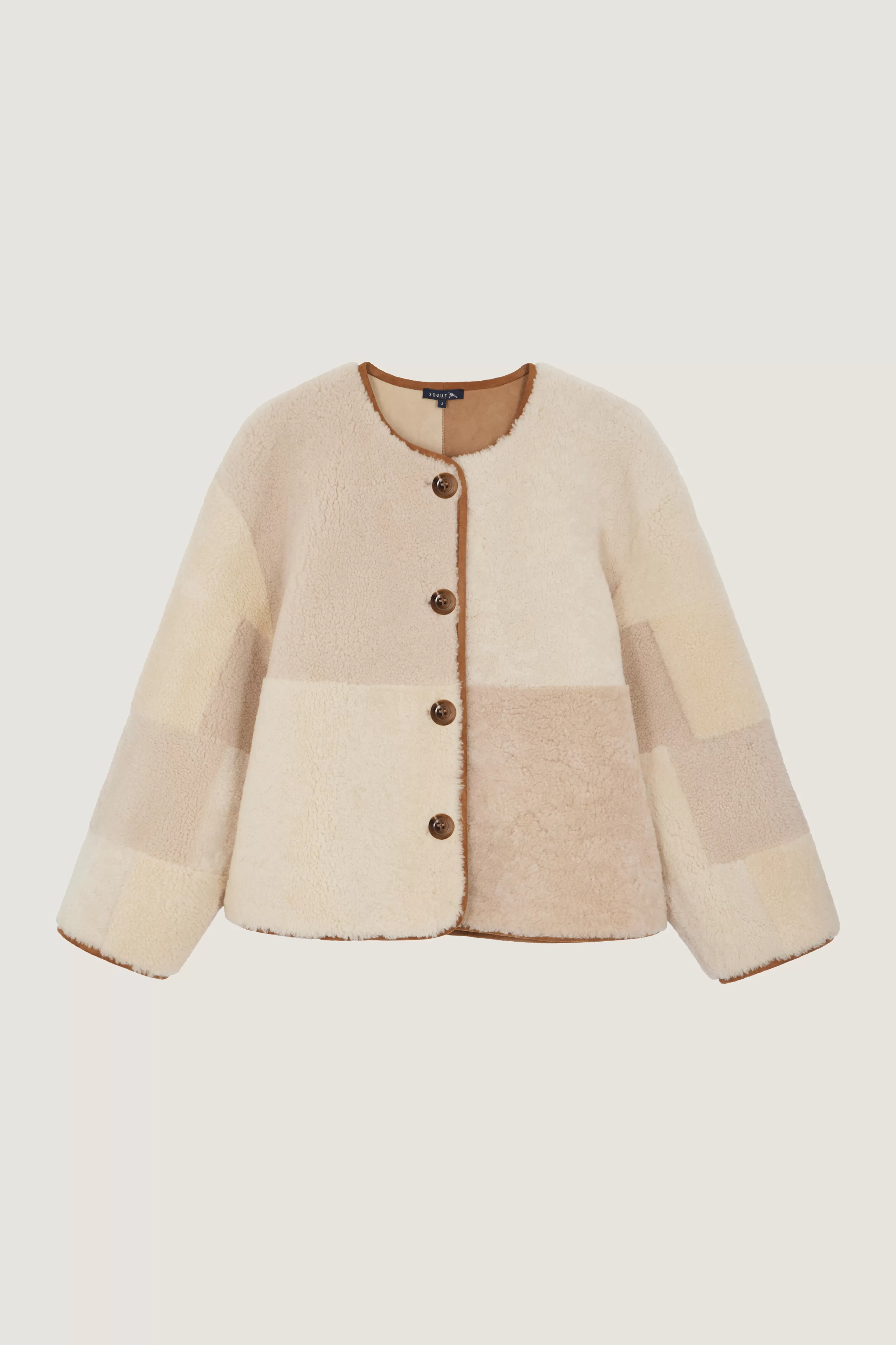 Blouson court en peau lainée patchwork réversible – Volume ample– Ganse en peau retournée– Éviter la pluie. Prendre conseils auprès d’un spécialiste pour imperméabiliser.