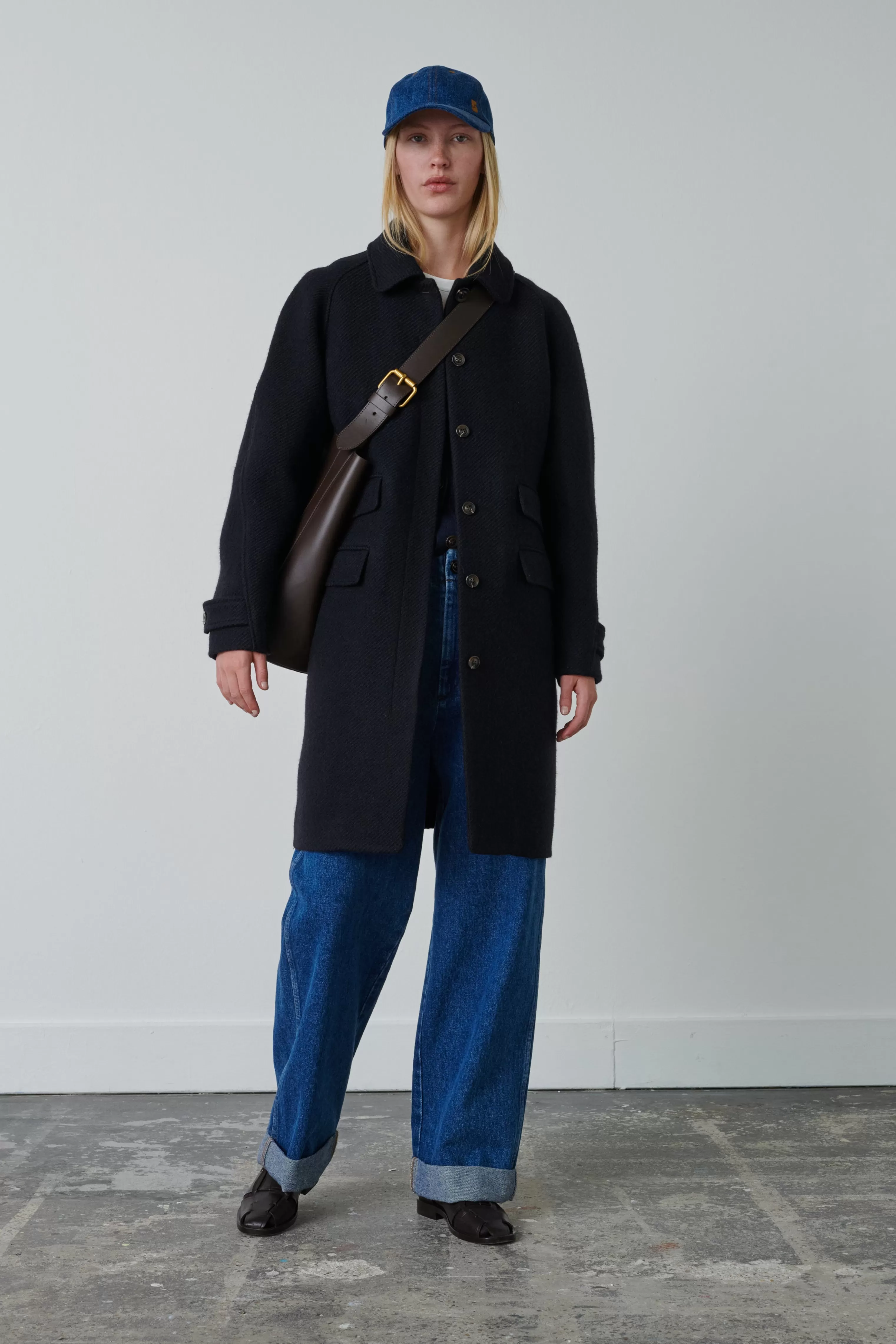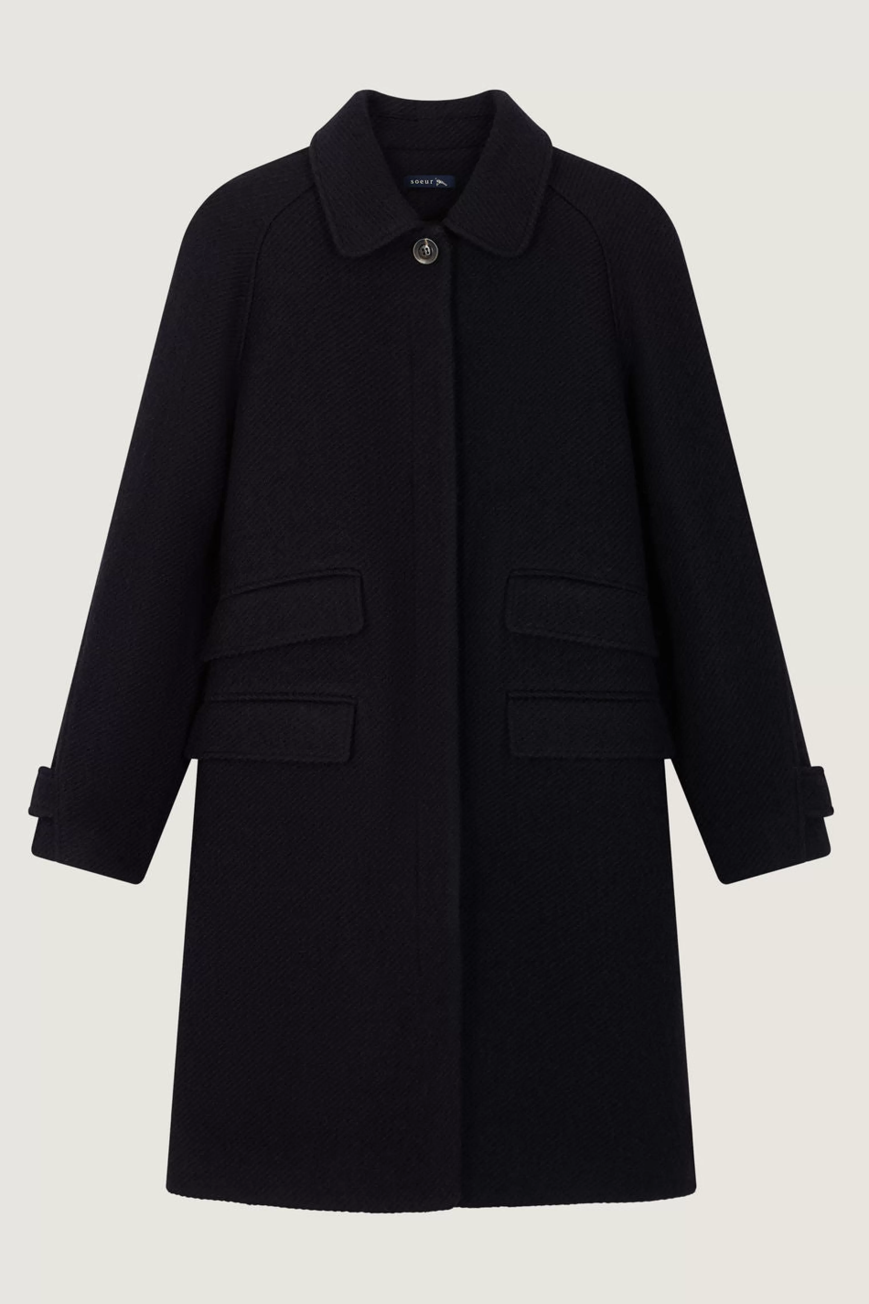 Manteau en tweed de laine lavée – Coupe droite ajustée– Col classique– Patte de boutonnage devant cachée– Manches raglan, longues et coudées– Quatre poches à rabat devant– Pattes de serrage boutonnée aux poignets