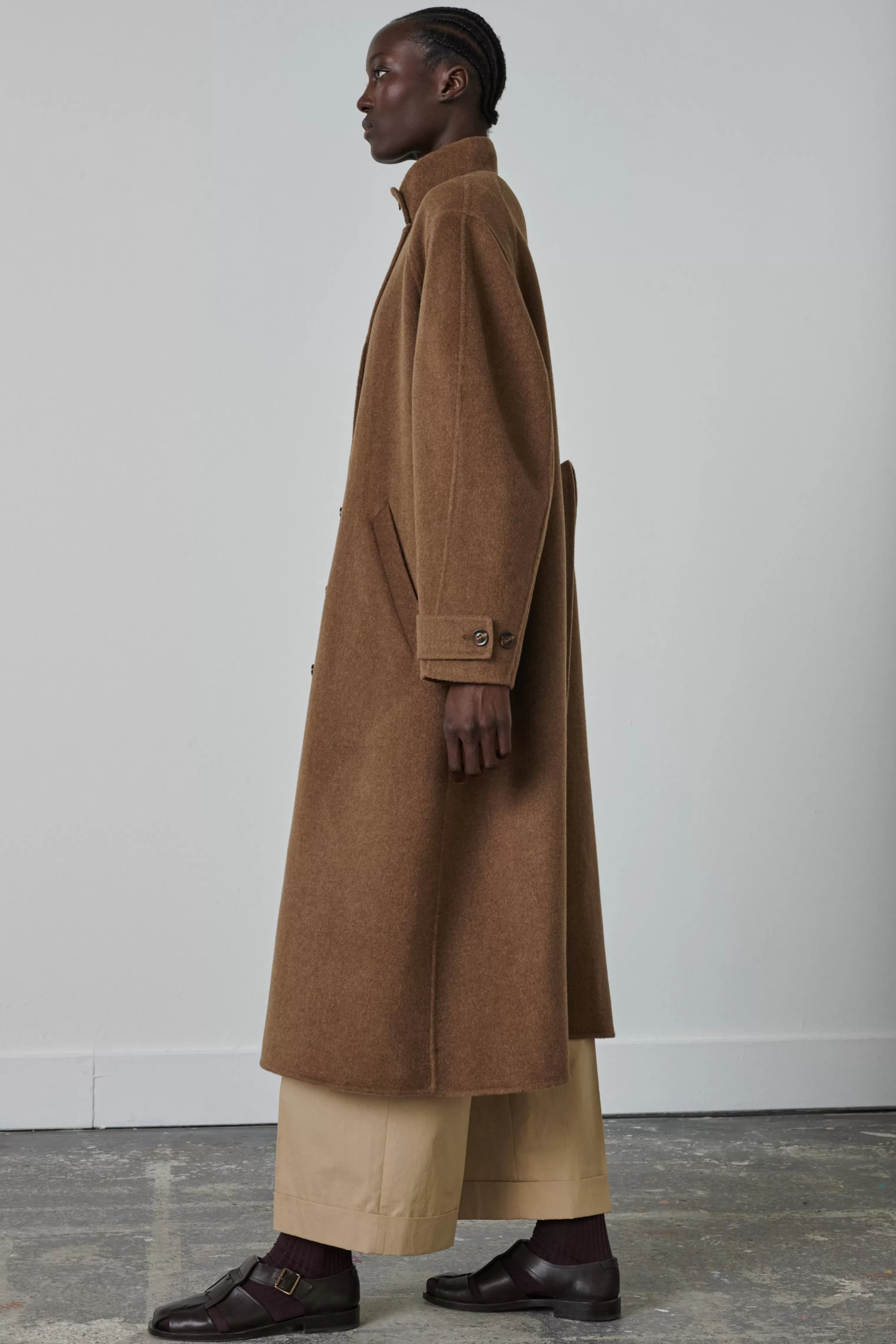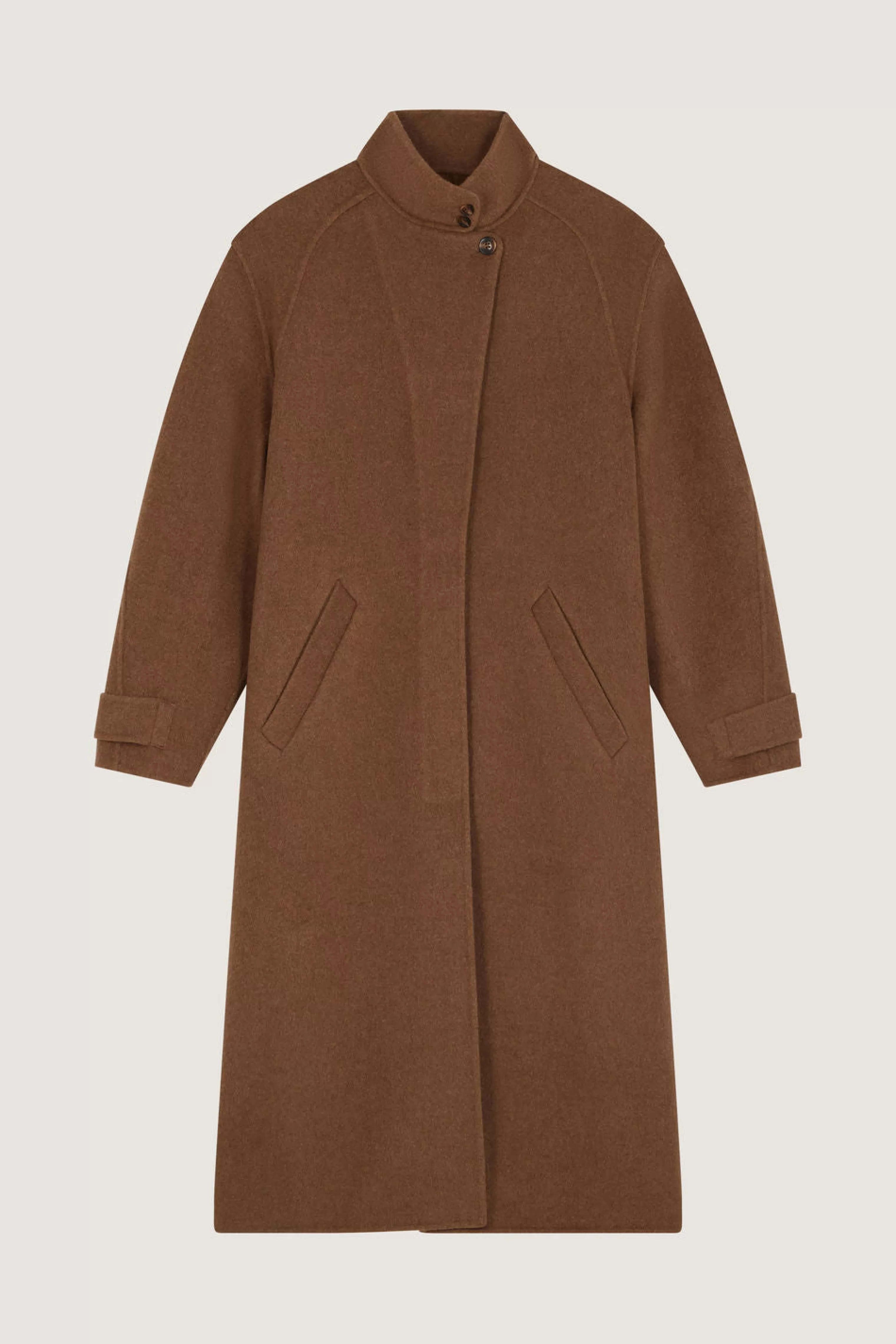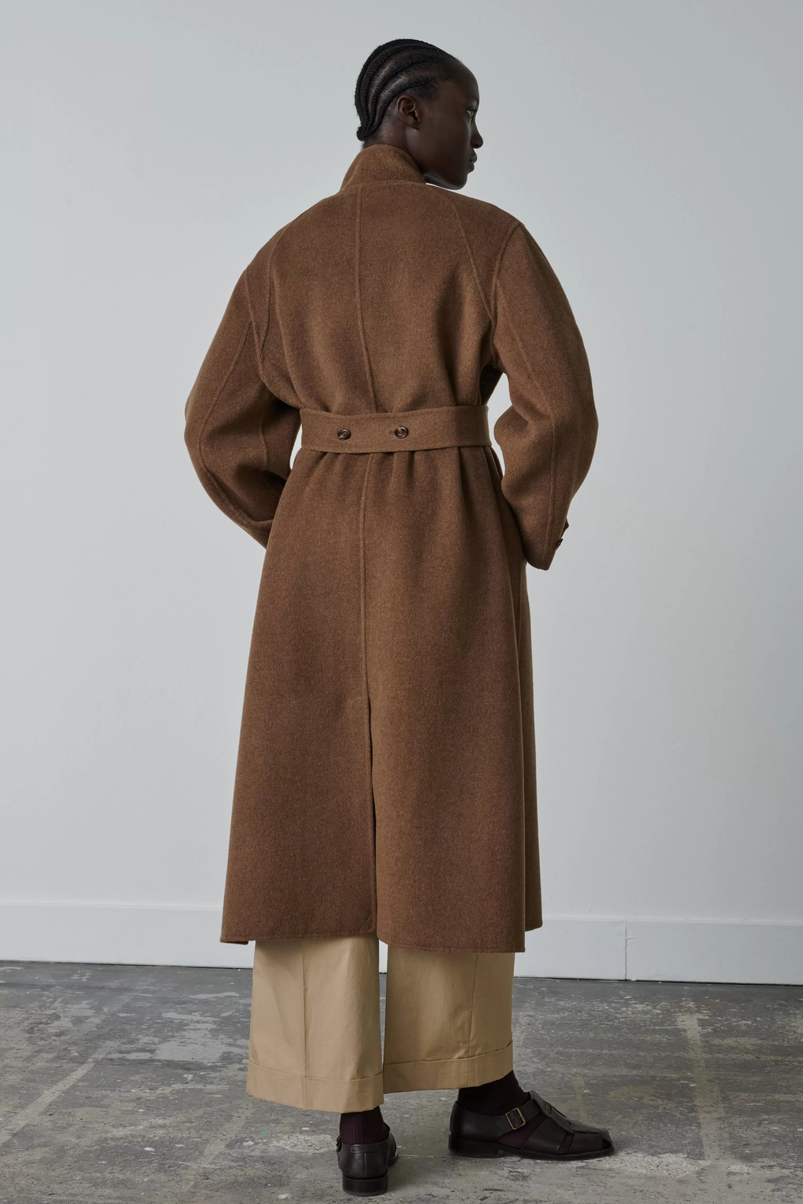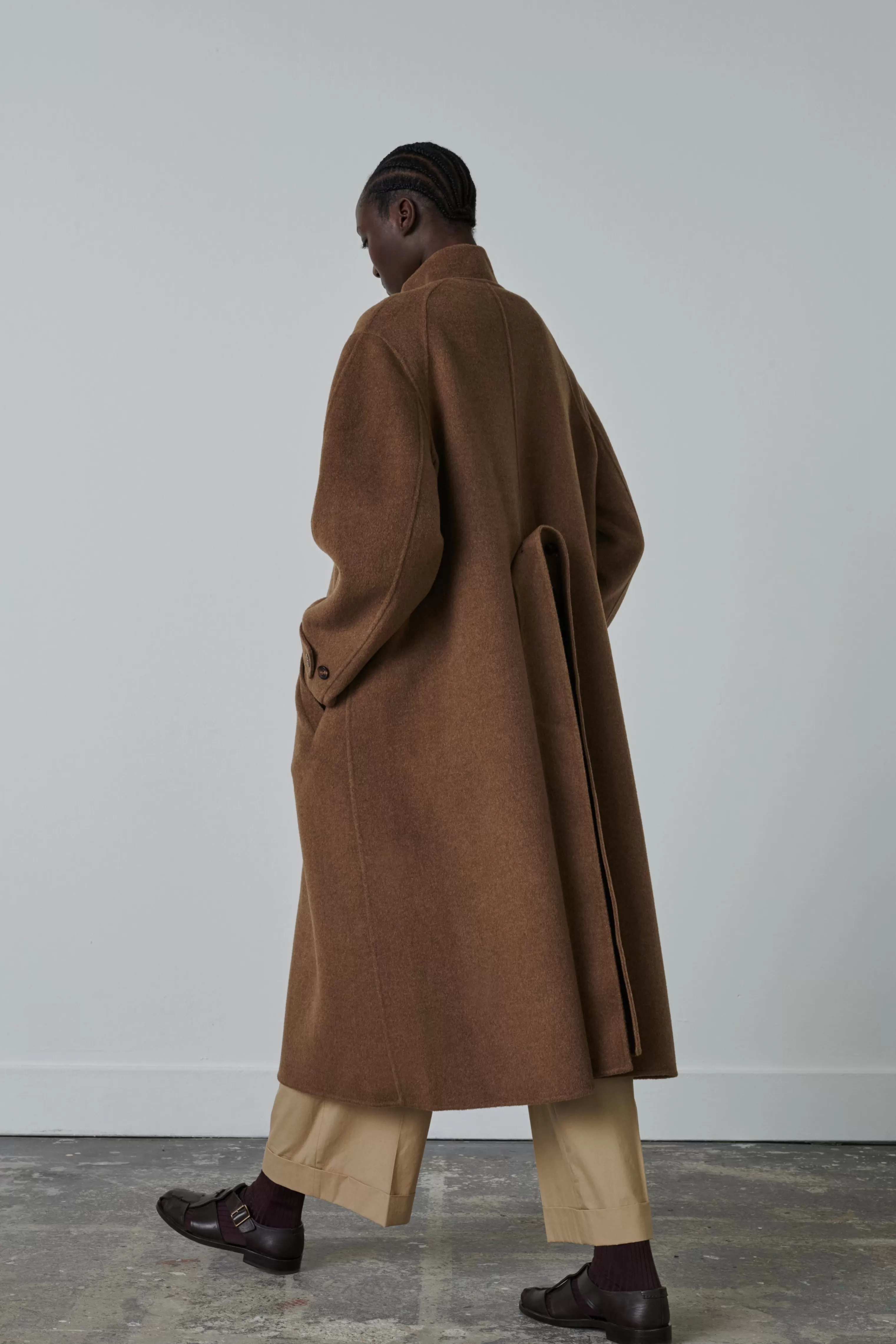 Manteau ceinturé en laine double face – Volume long et ample – Empiecements surpiqués aux épaules – Ceinture amovible, boutonnée au dos– Manche longues – Pattes de serrage boutonnée aux poignets