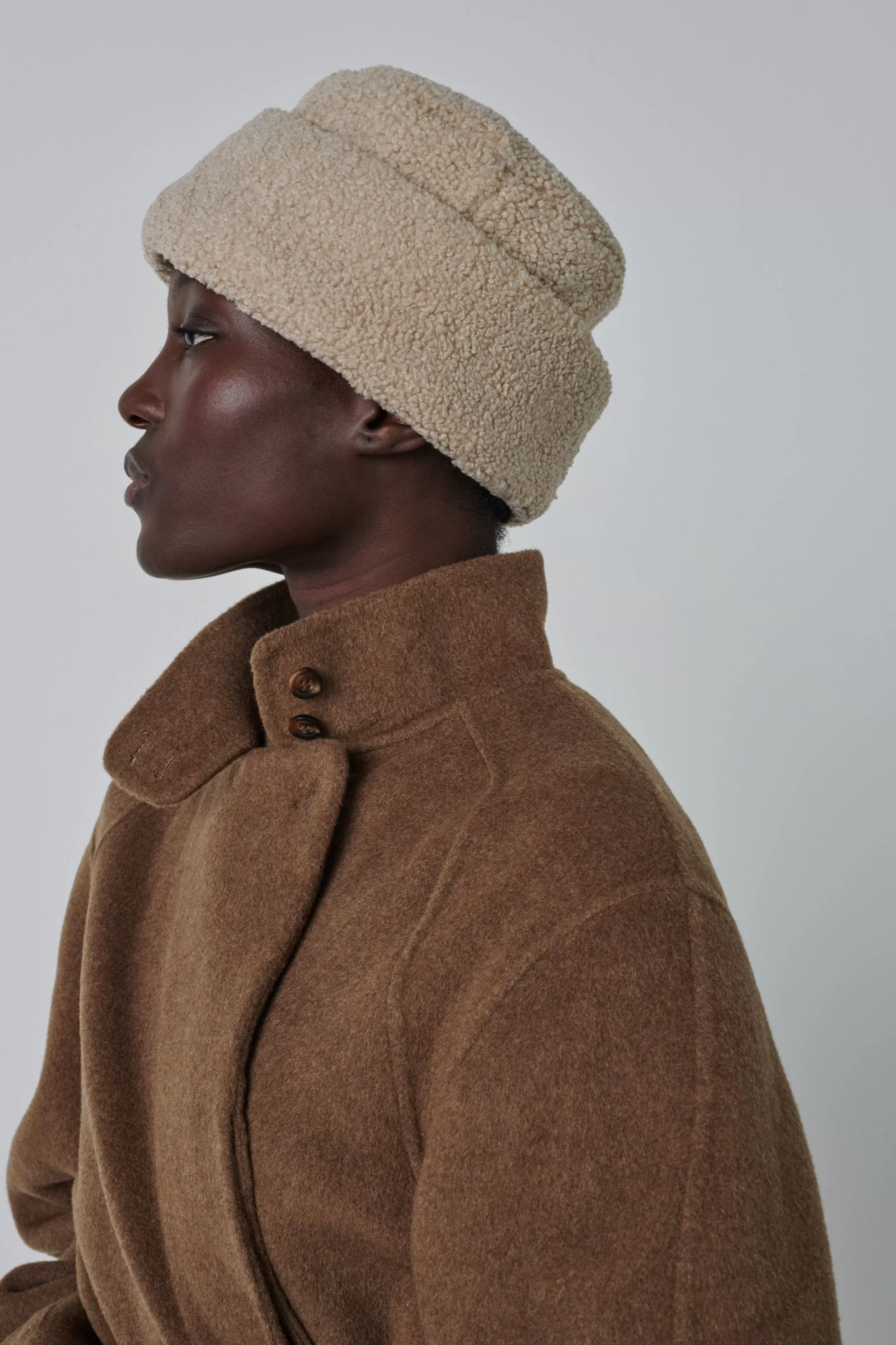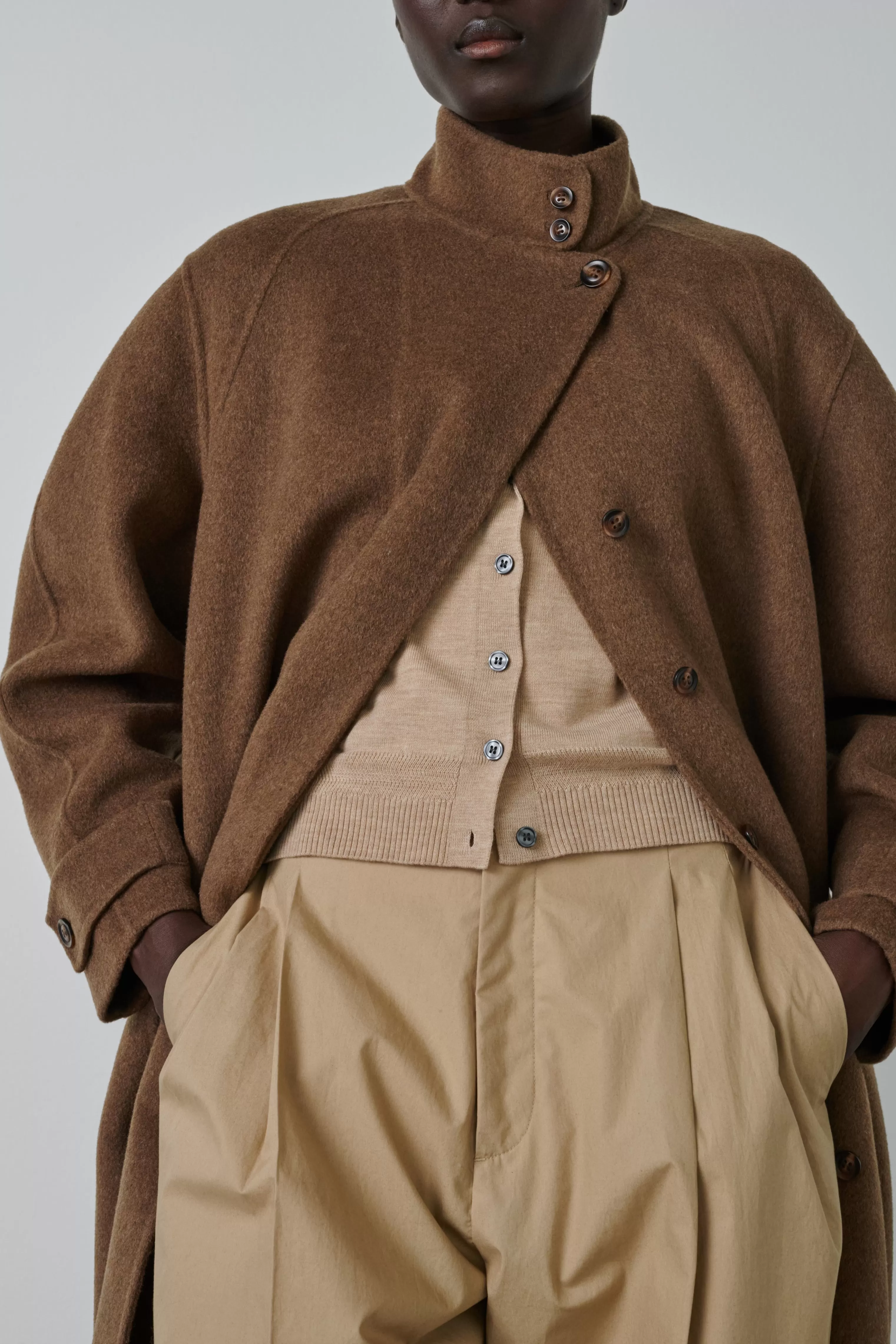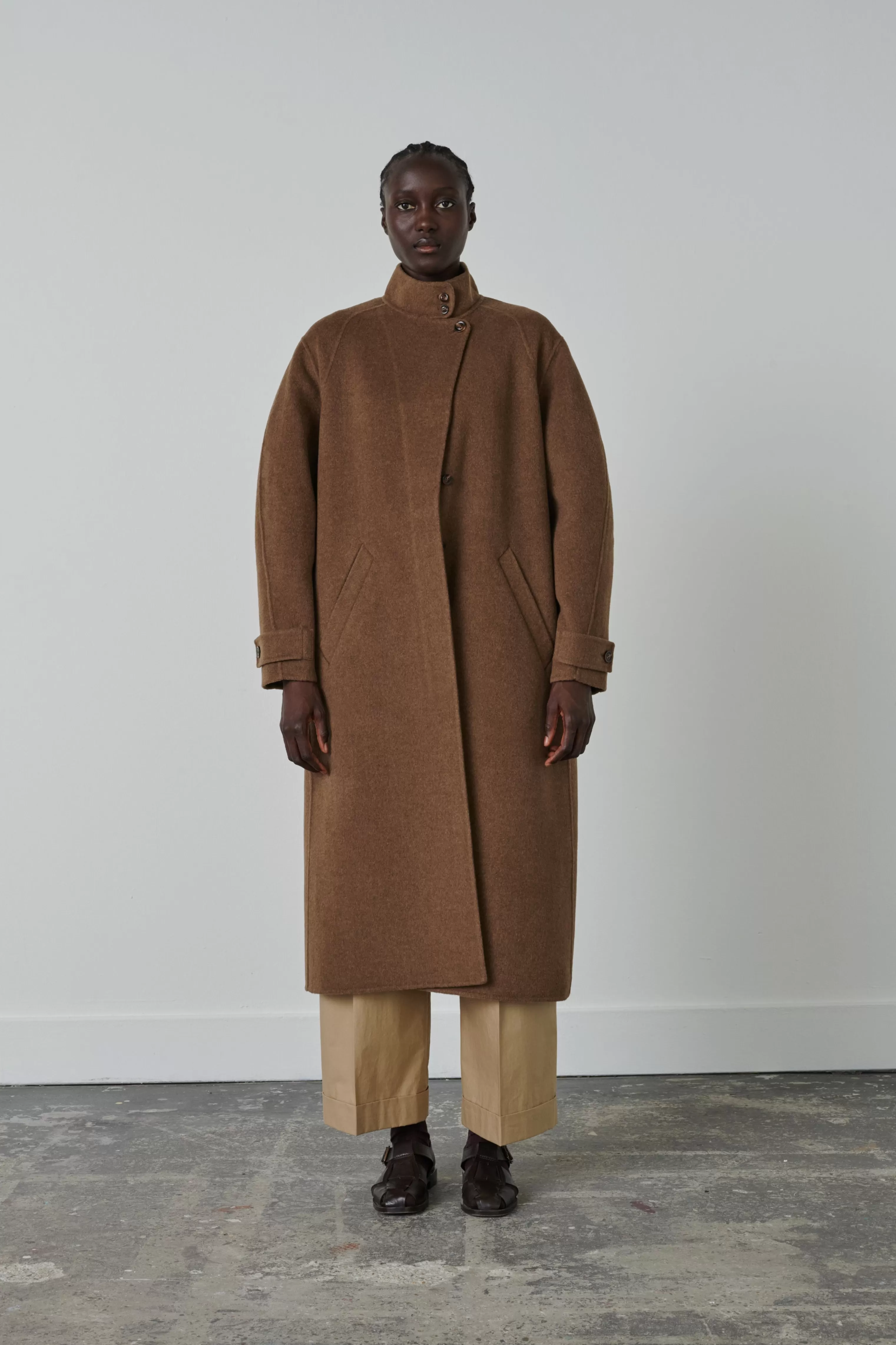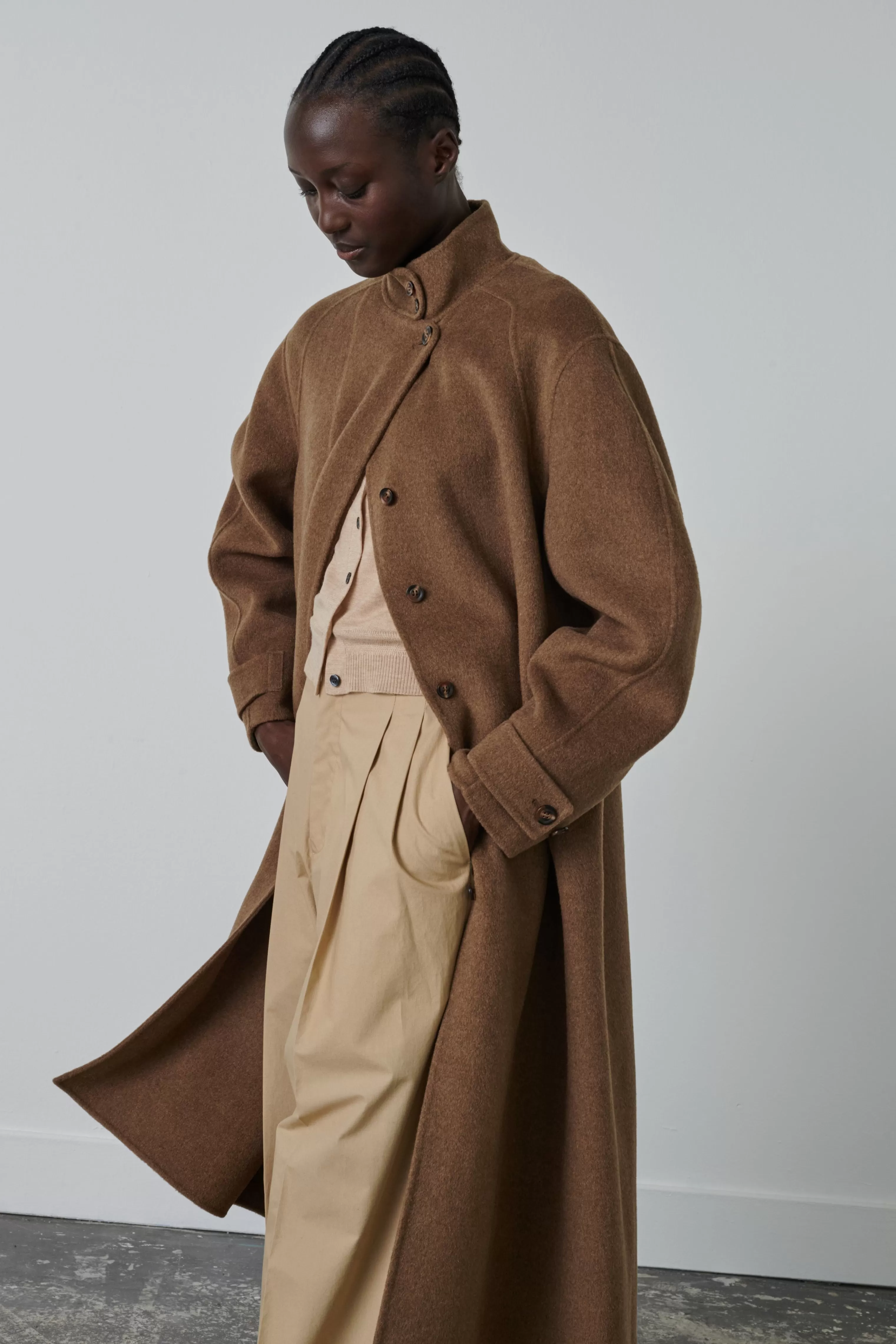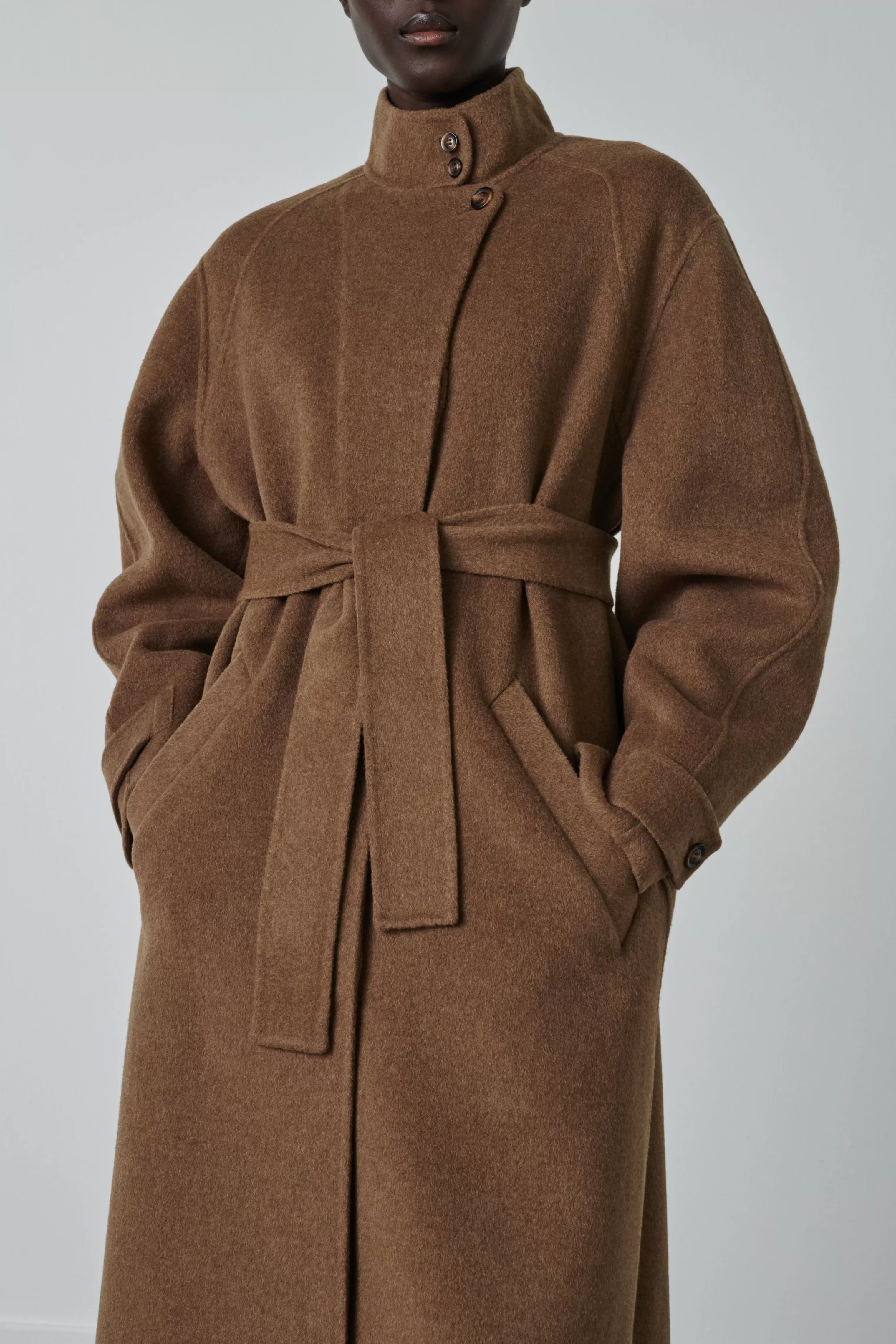Manteau ceinturé en laine double face – Volume long et ample – Empiecements surpiqués aux épaules – Ceinture amovible, boutonnée au dos– Manche longues – Pattes de serrage boutonnée aux poignets