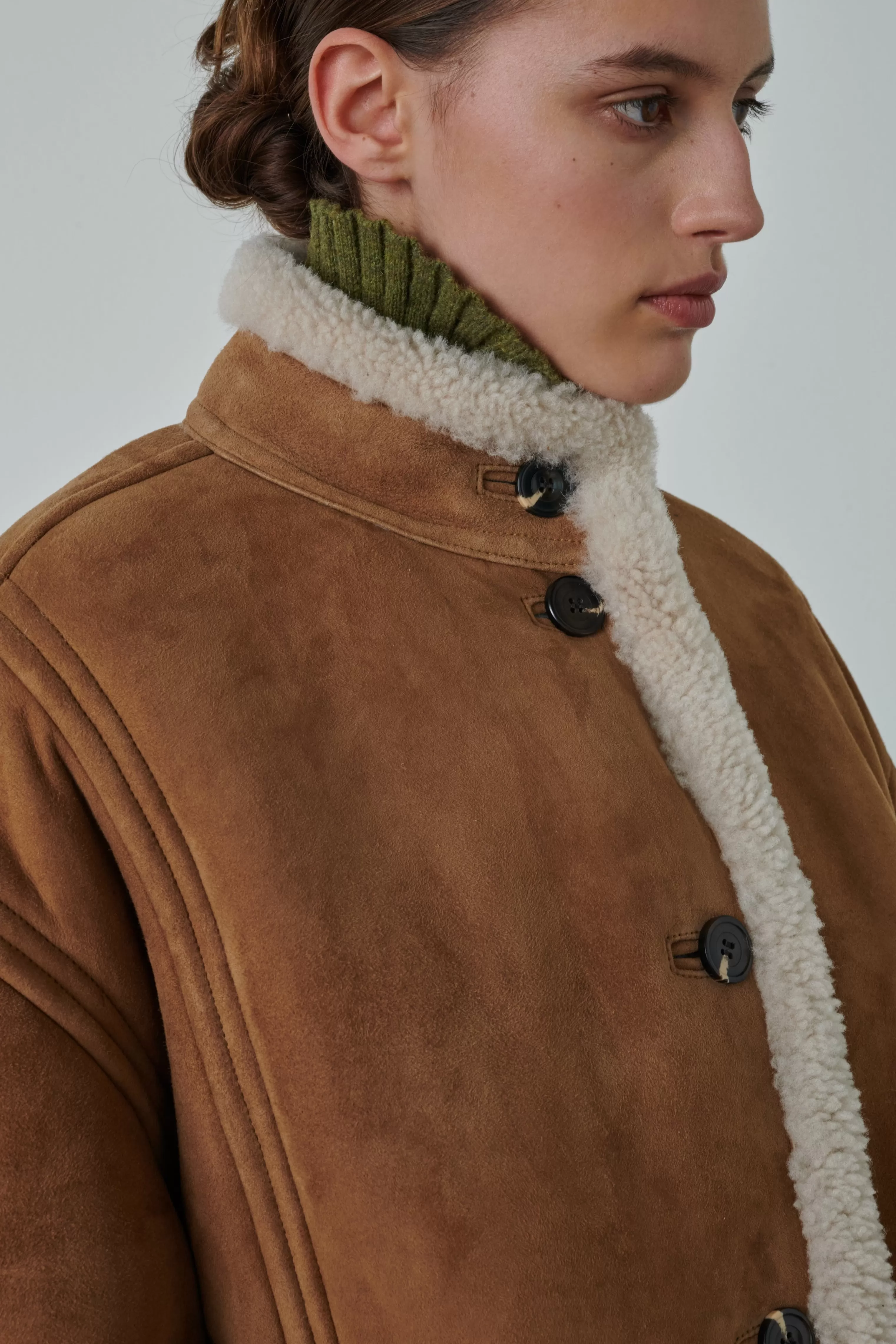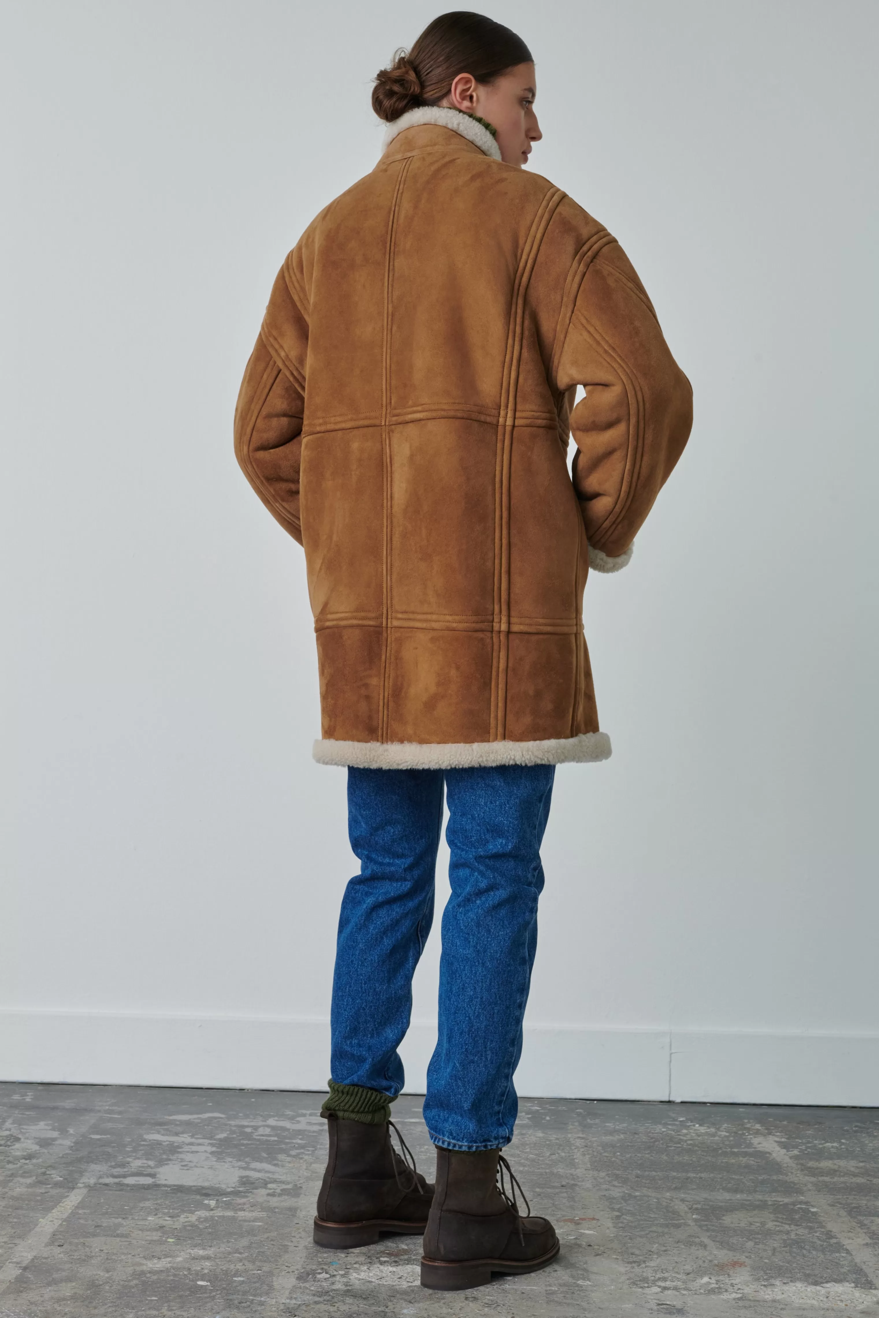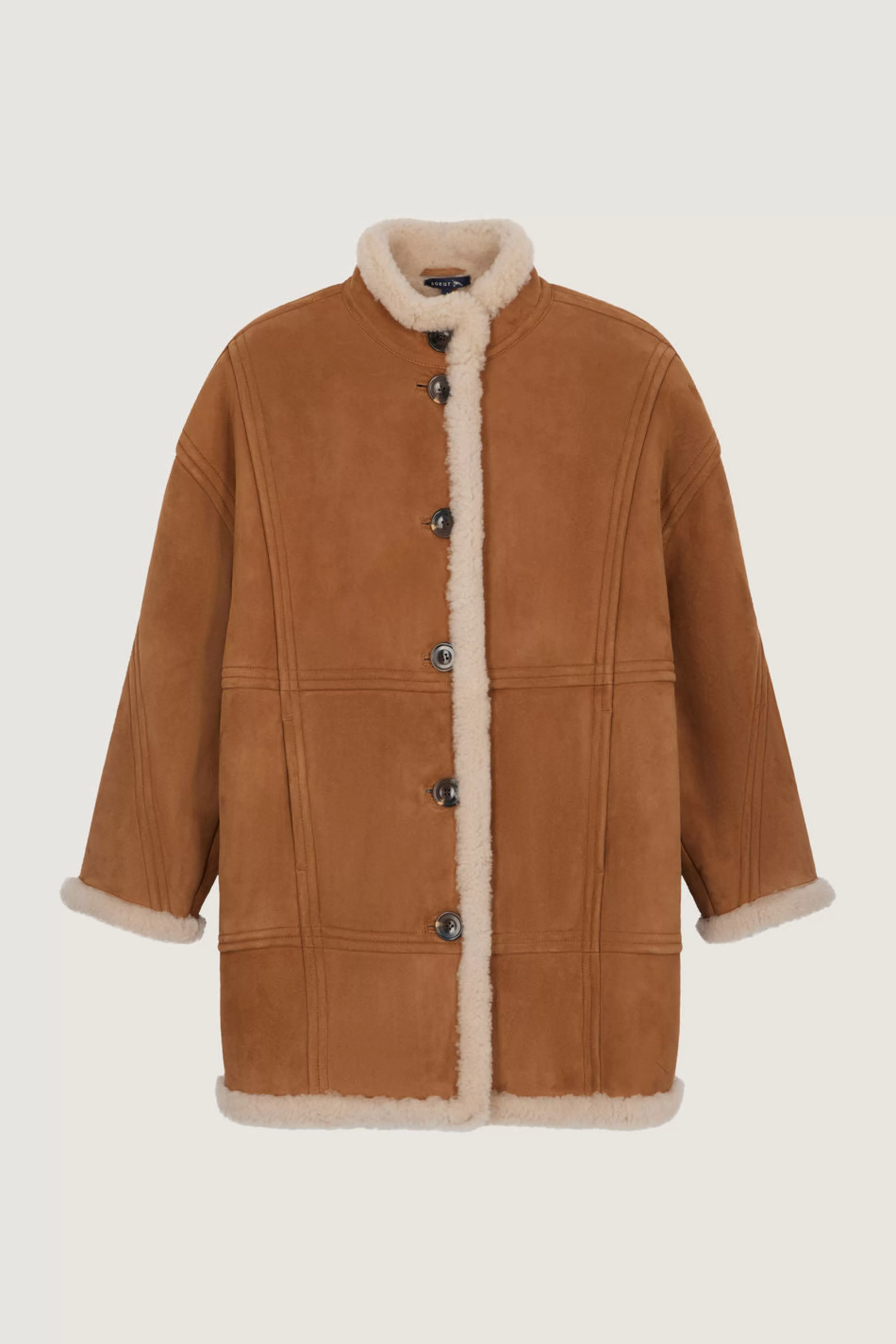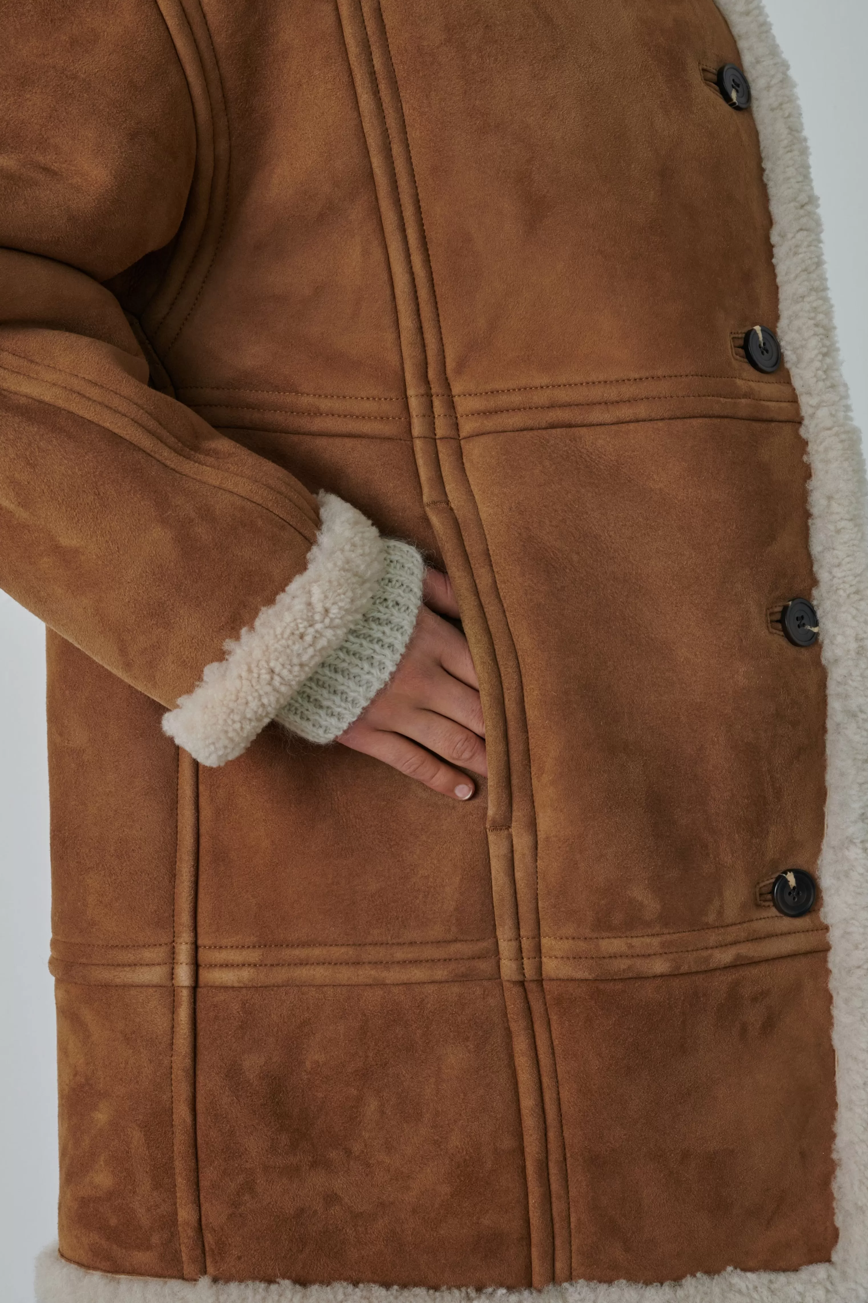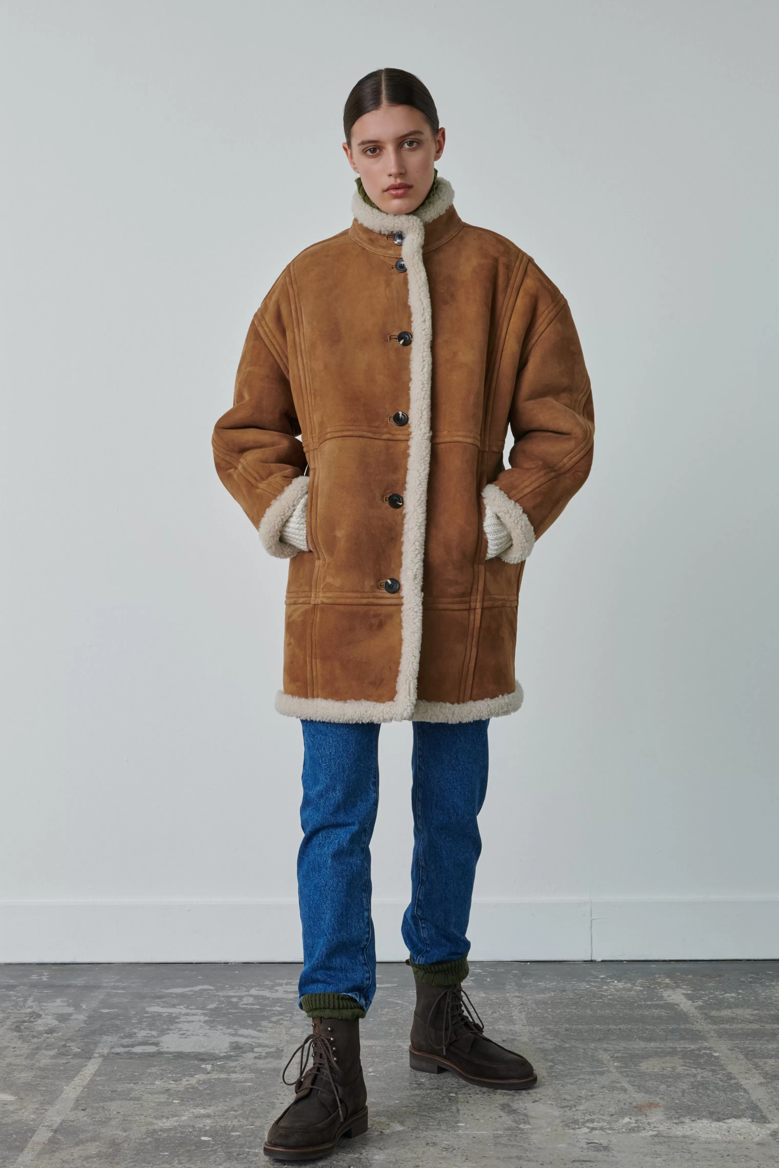 Manteau en peau lainée – Volume rond et long– Col montant et ouverture boutonné– Deux poches devant cachées dans la couture