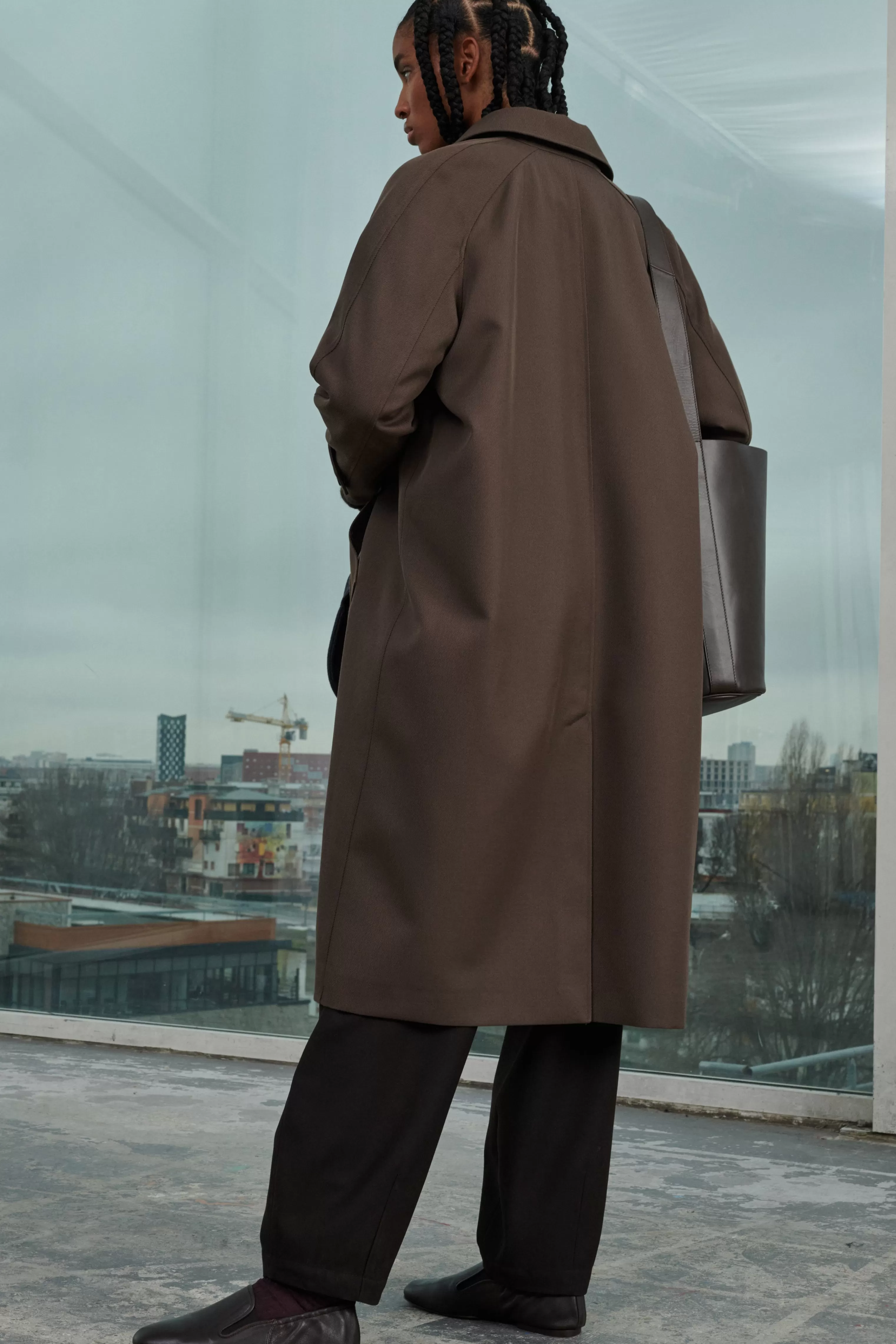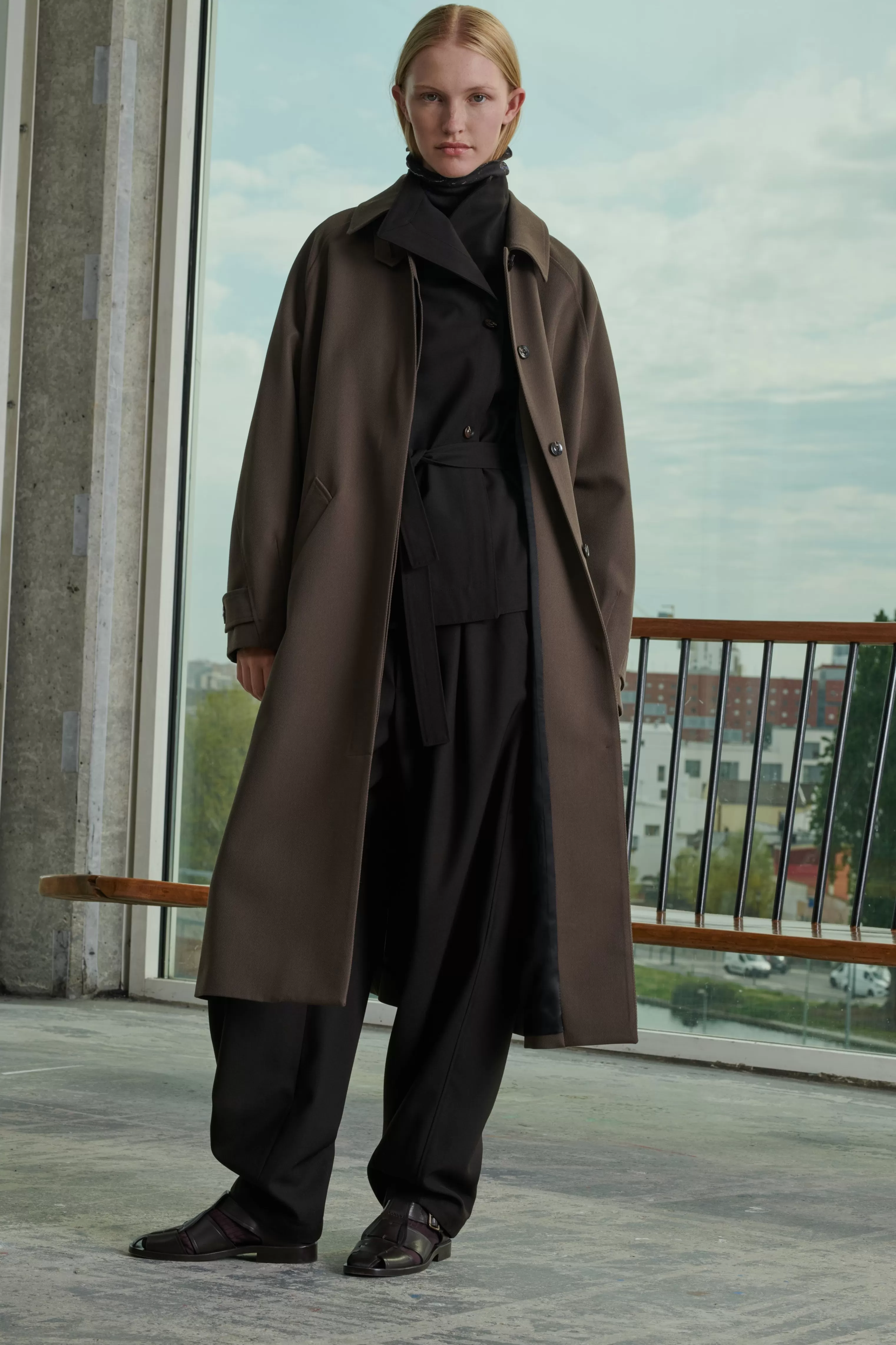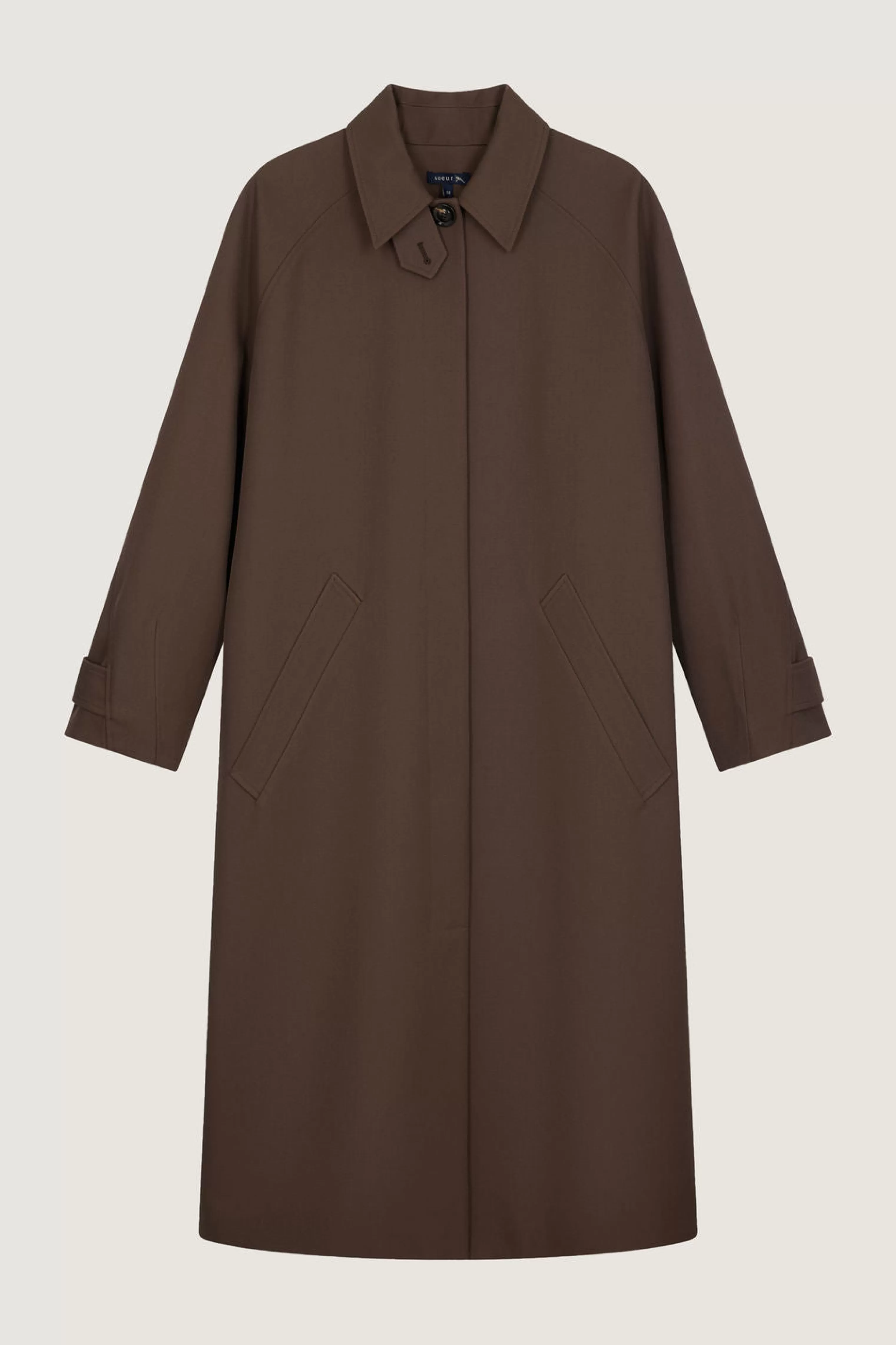 Trench en gabardine de laine – Volume ample– Manches longues raglan, larges et courbées– Patte de boutonnage milieu devant cachée– Patte de boutonnage au col– Poches devant avec un large passepoil