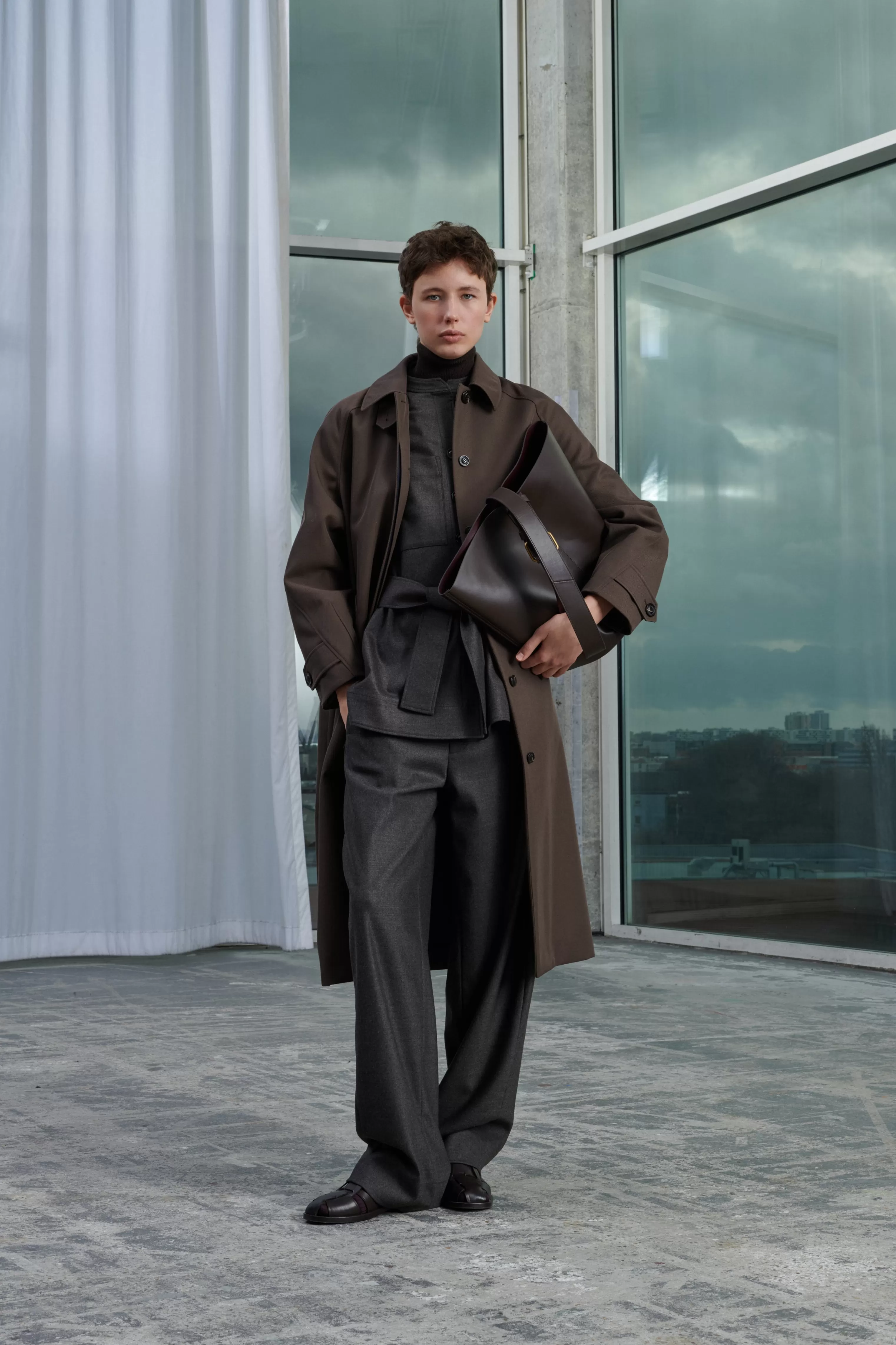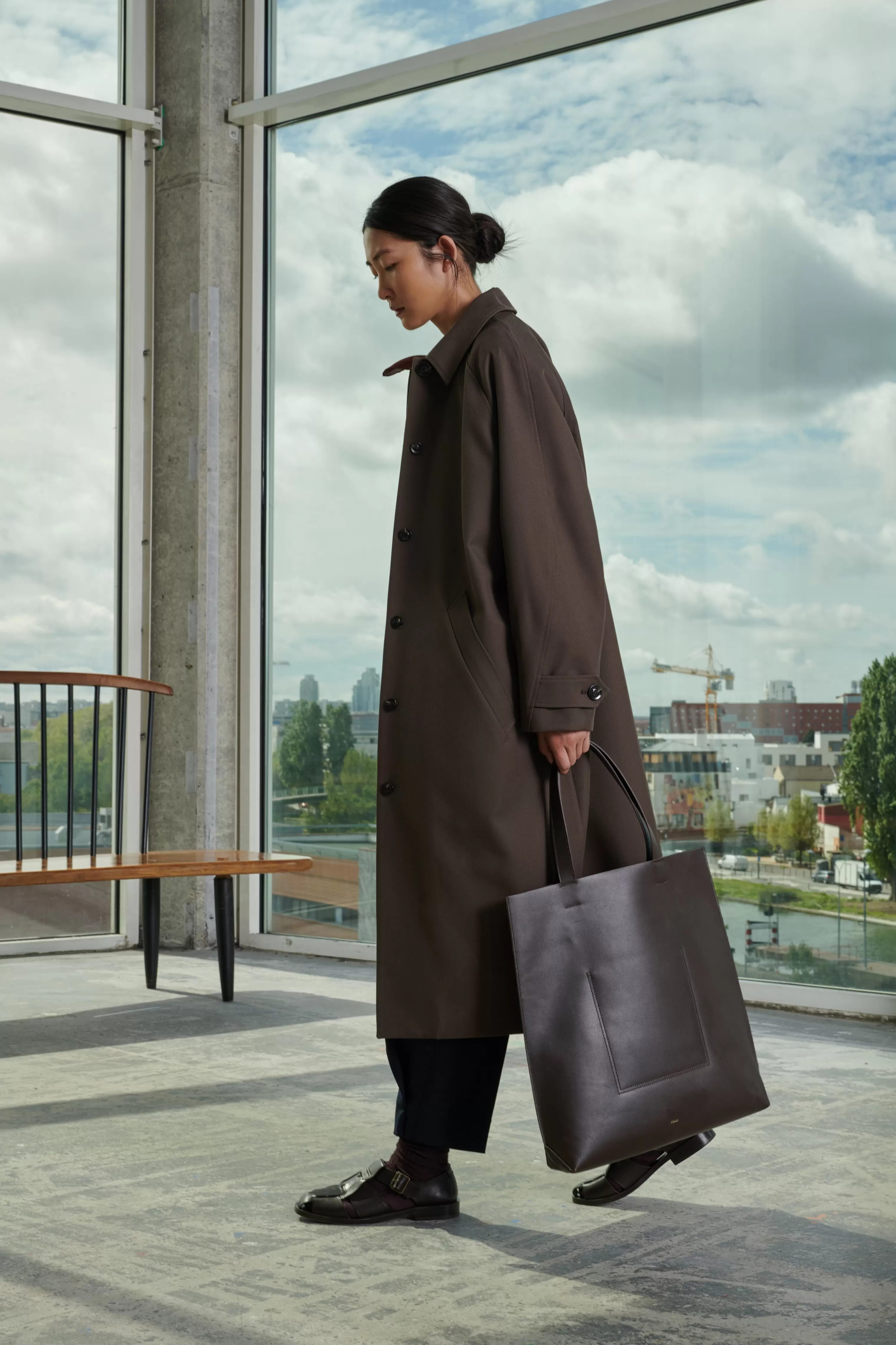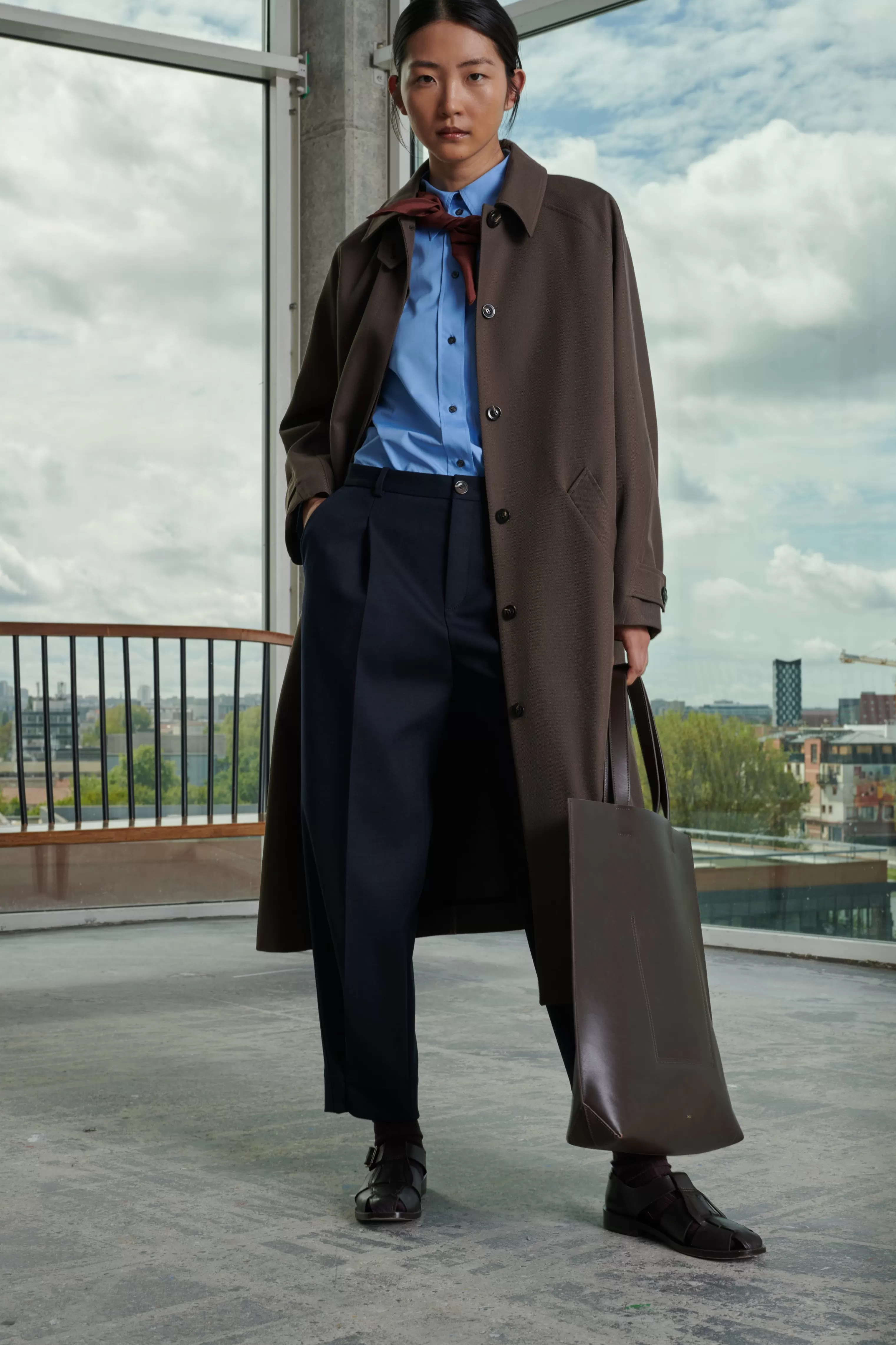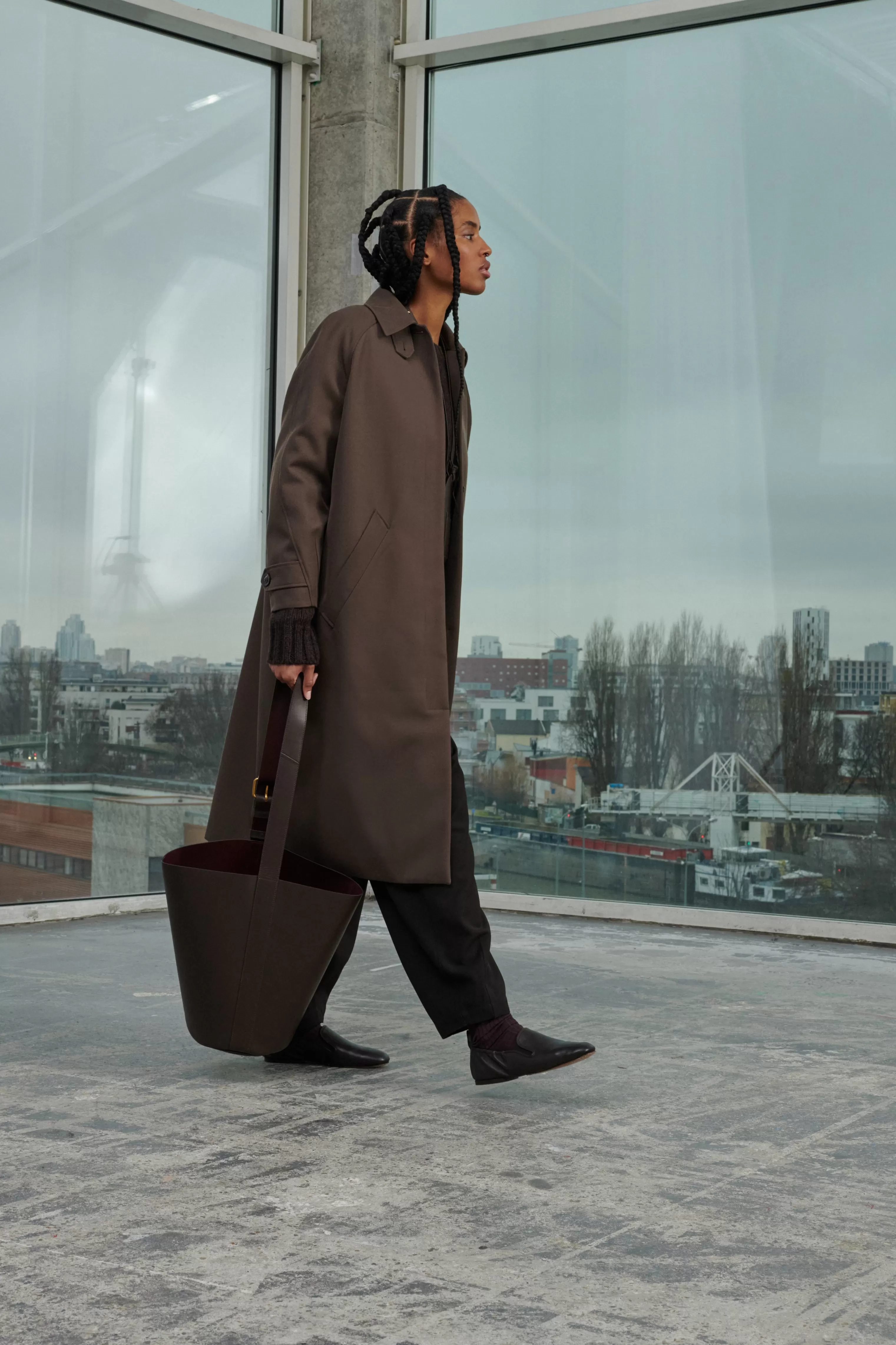 Trench en gabardine de laine – Volume ample– Manches longues raglan, larges et courbées– Patte de boutonnage milieu devant cachée– Patte de boutonnage au col– Poches devant avec un large passepoil
