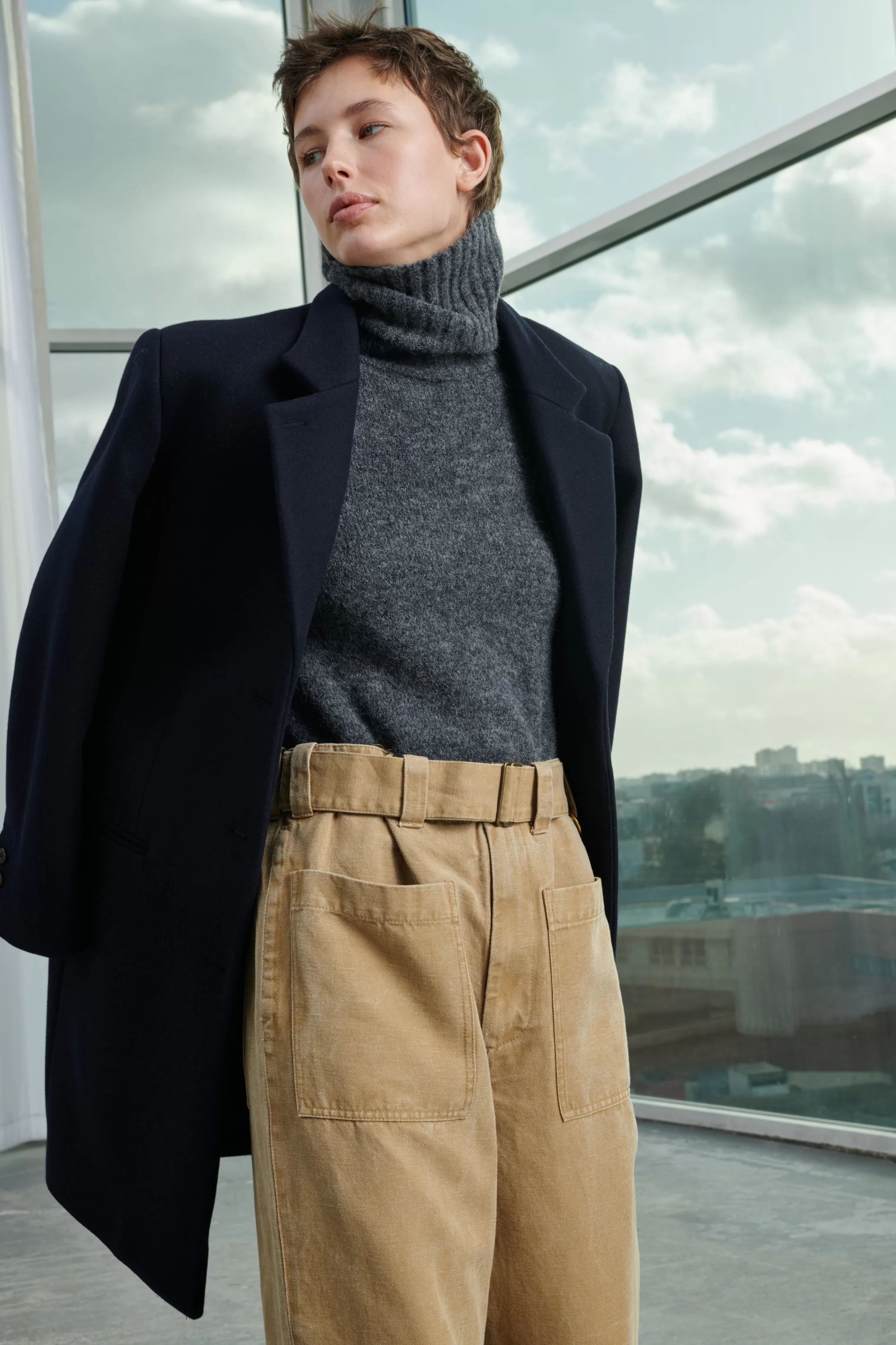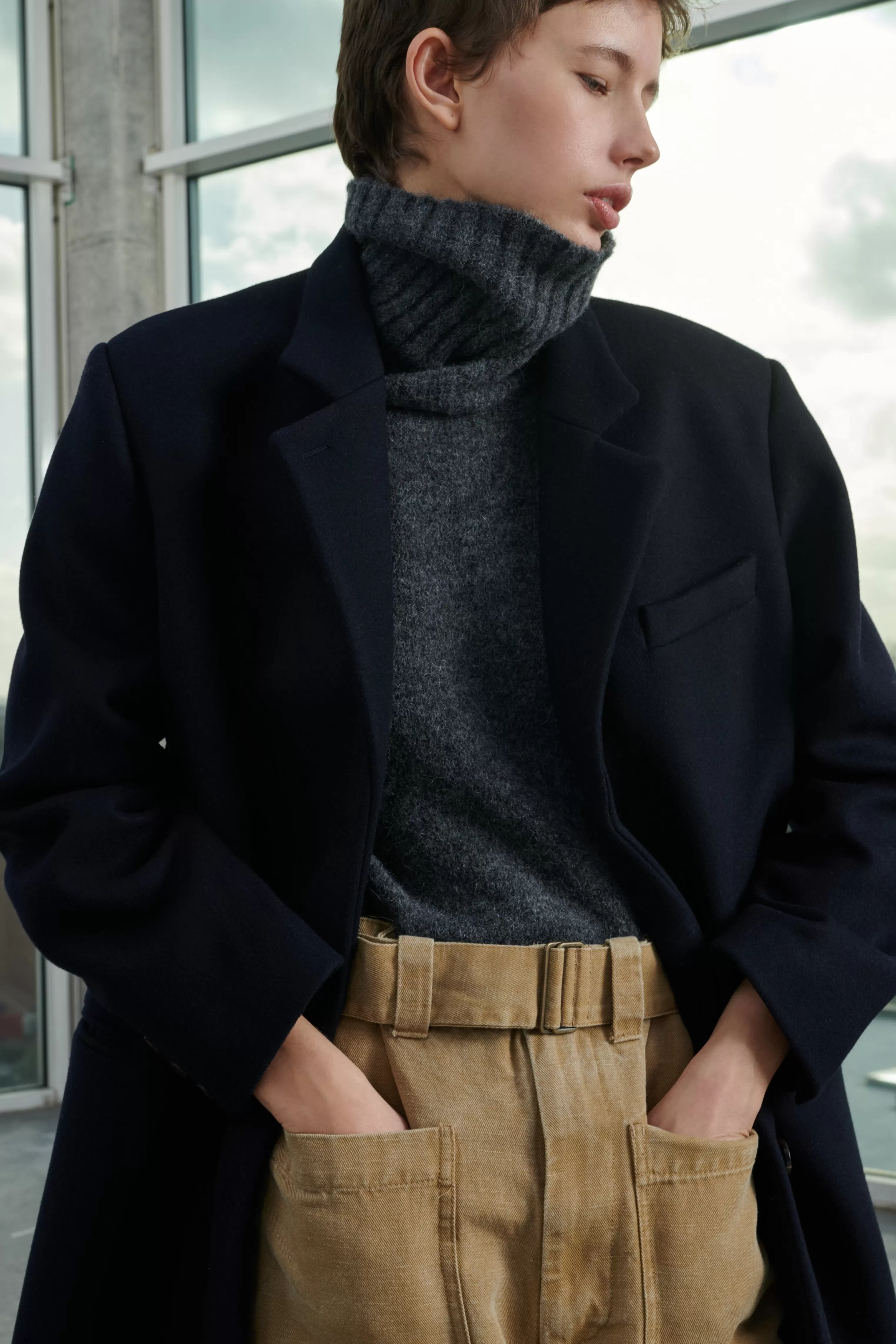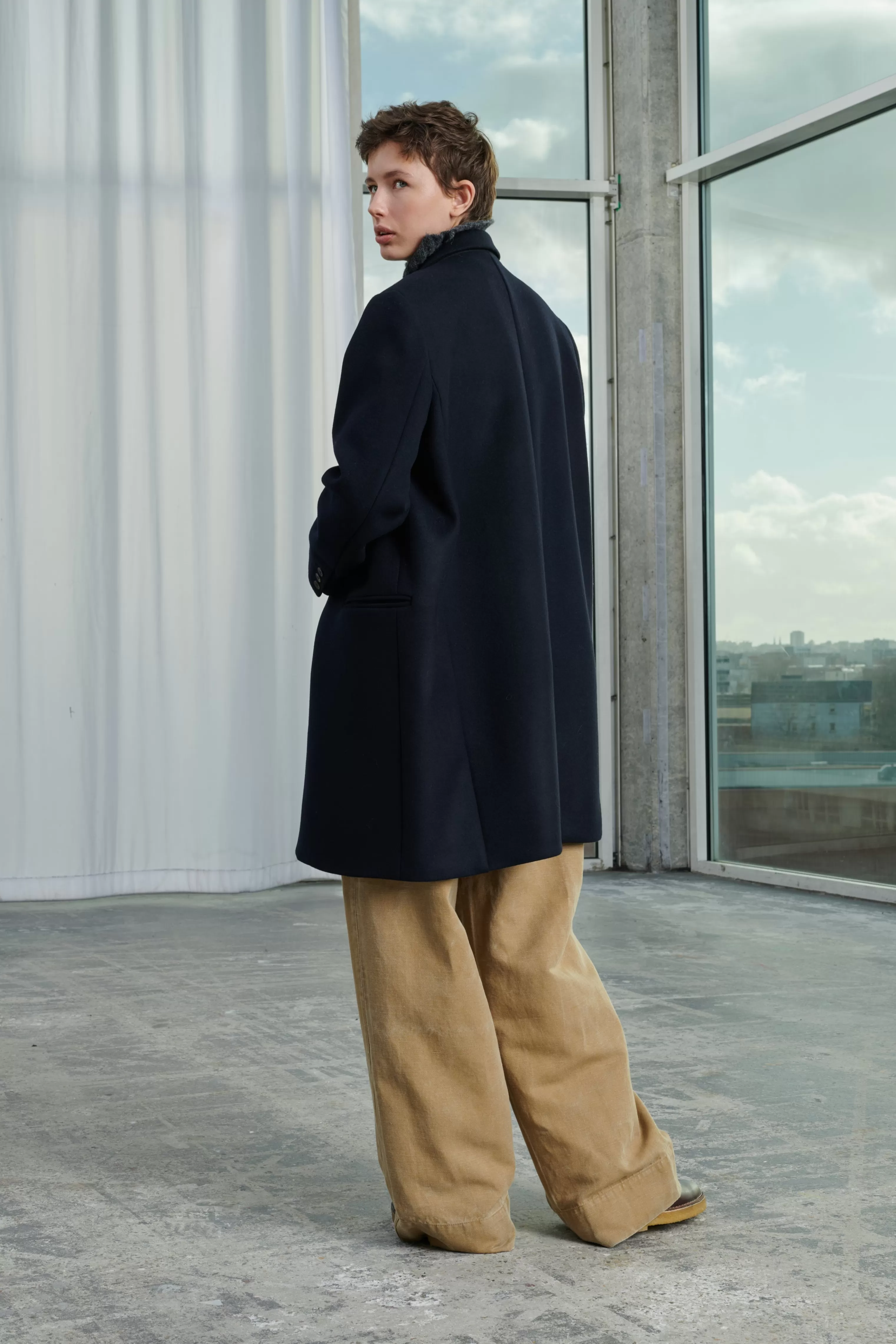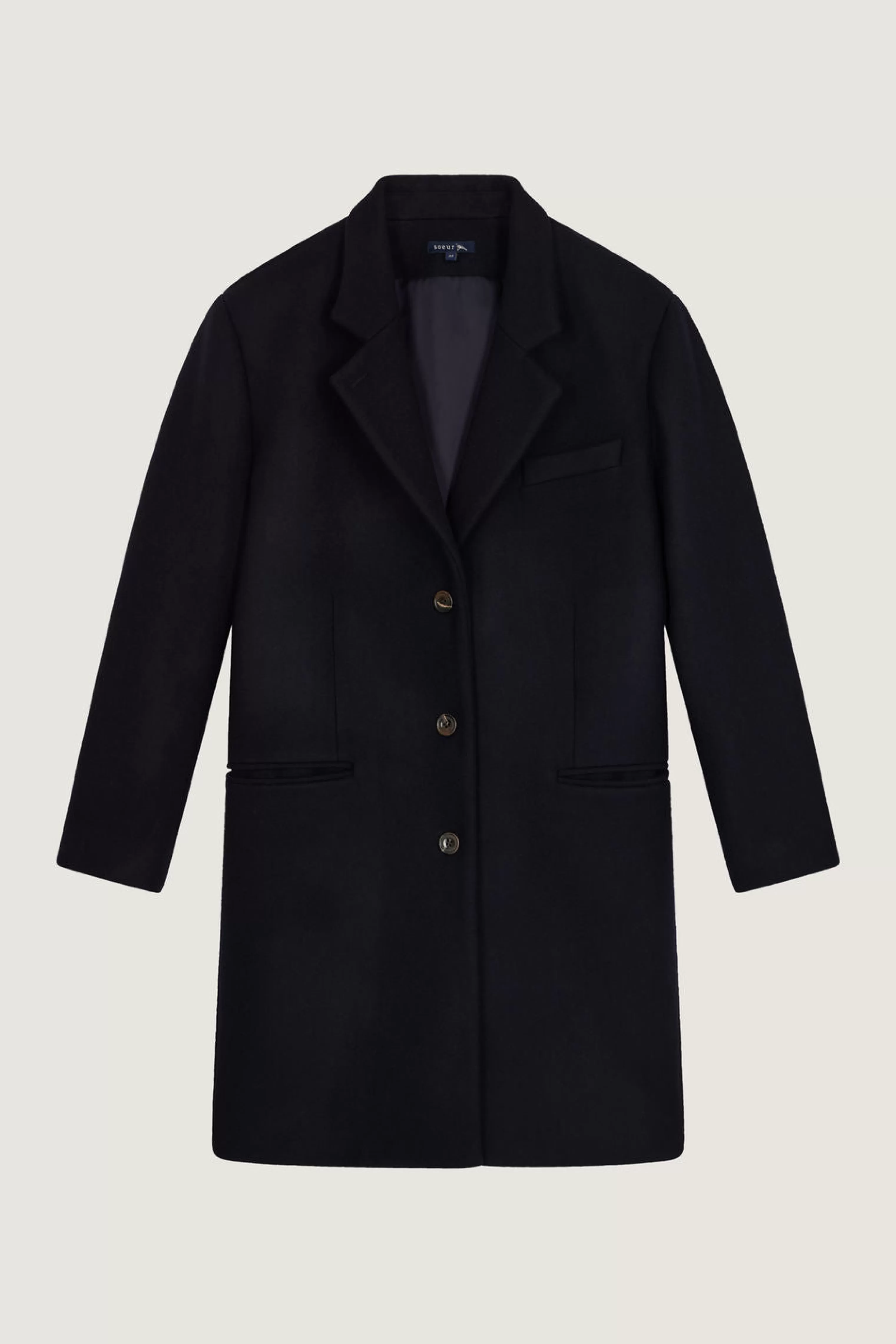 Manteau en drap de laine – Manteau mi-long au volume ample et droit– Col tailleur– Patte de boutonnage devant– Poches passepoilées