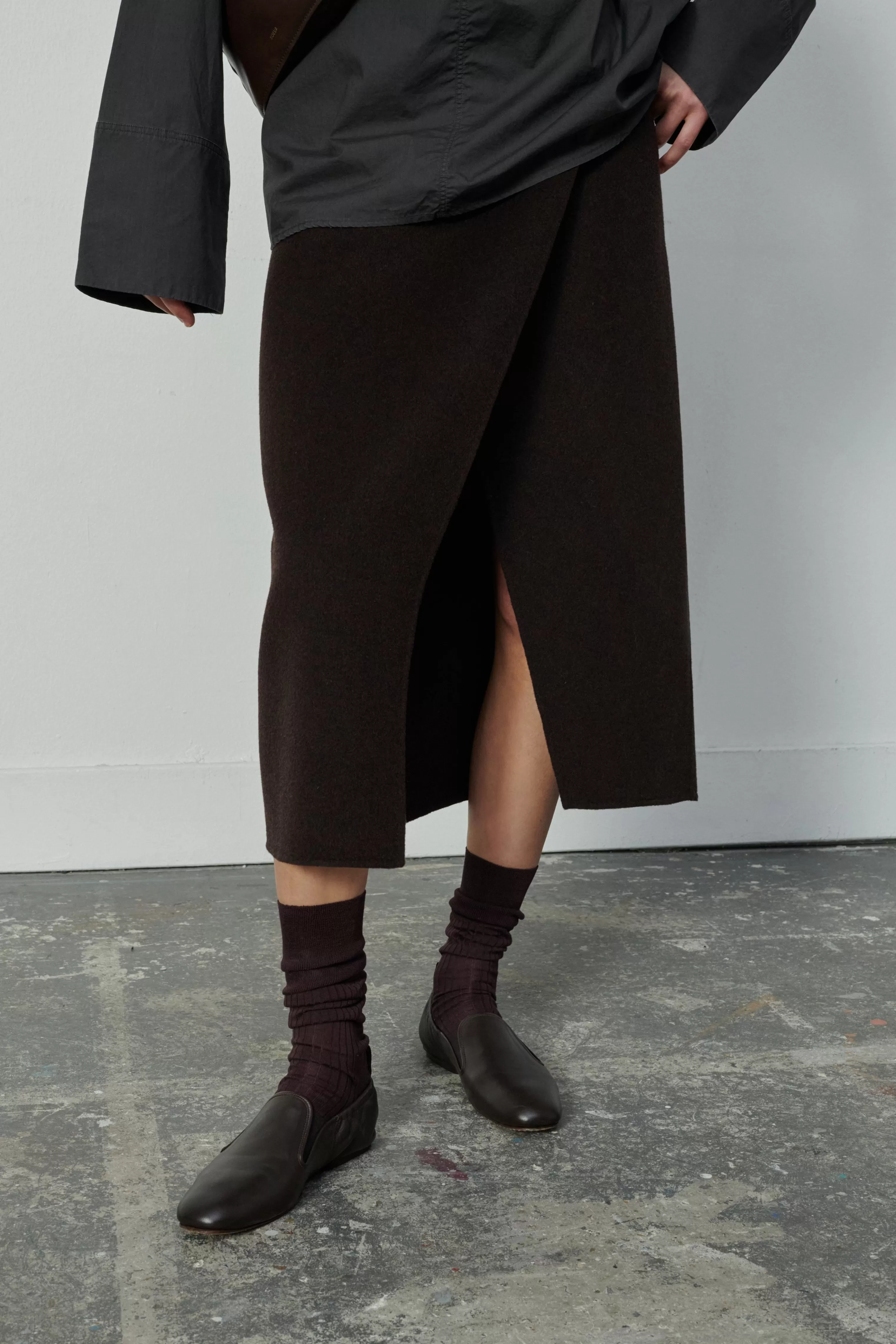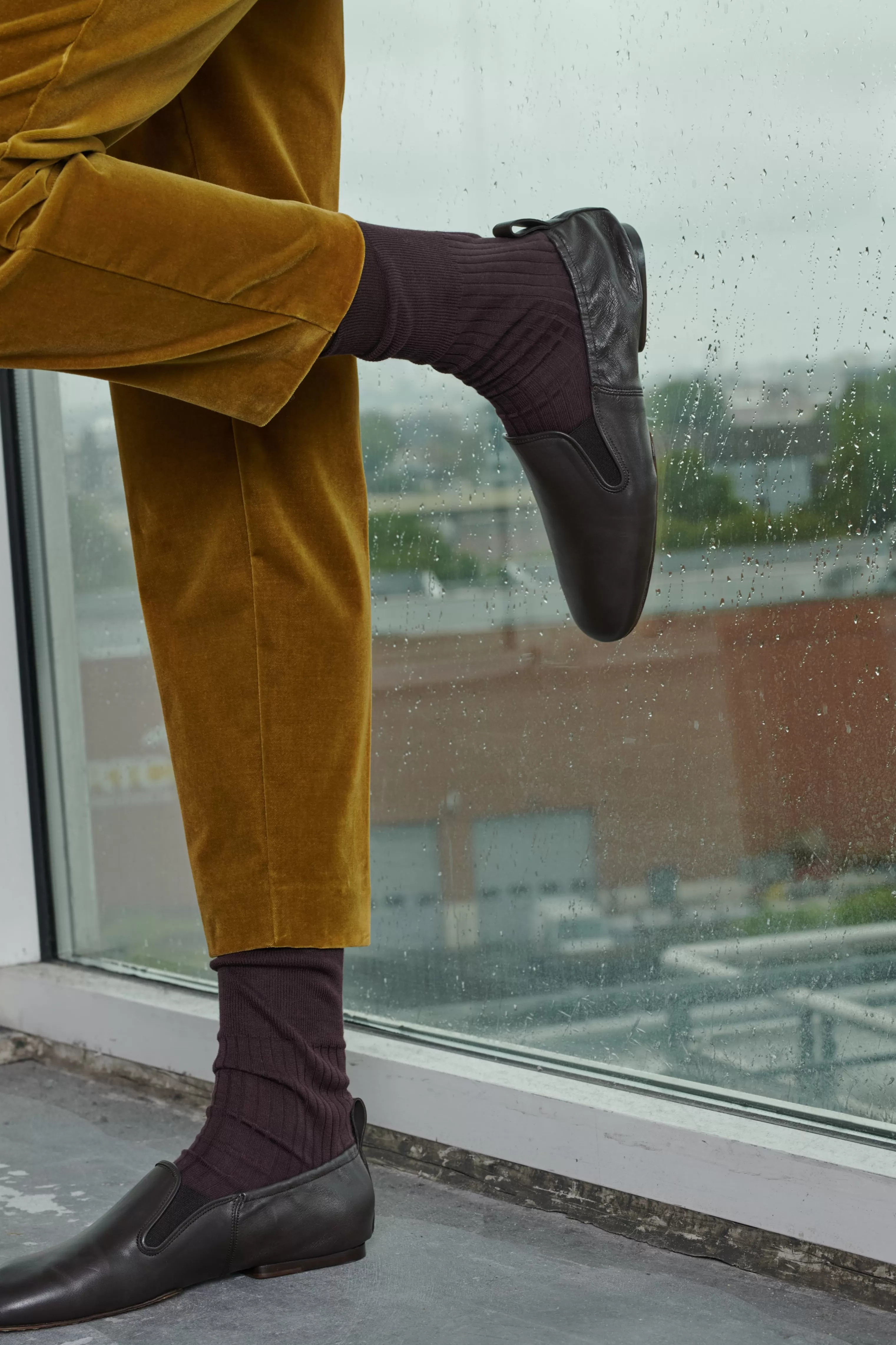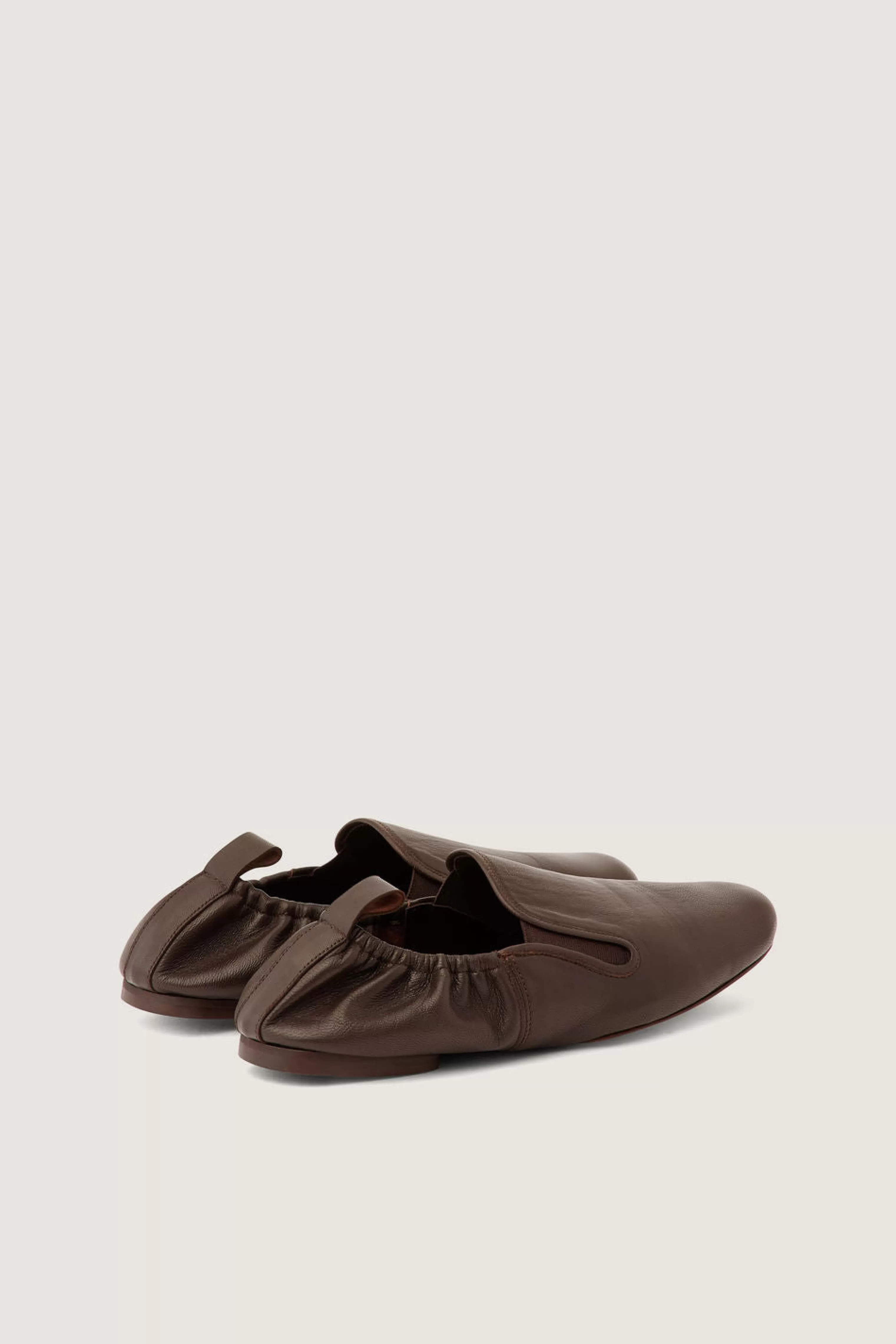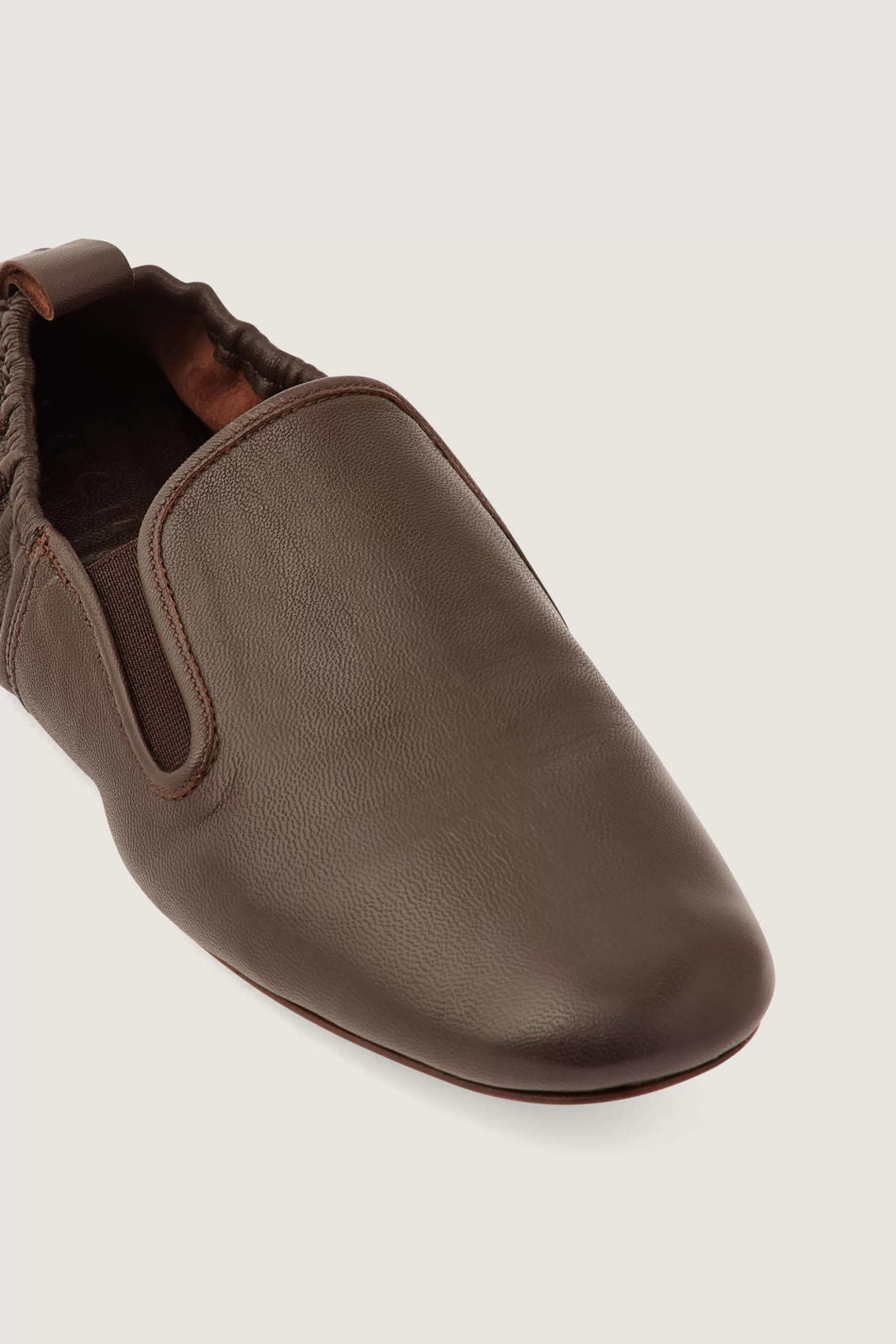 Ballerine en cuir souple marron foncé – Doublure en cuir souple – Hauteur de talon 1cm– Semelles fines bipartites – Elastique souple– Détails fronces– Cuir LWG