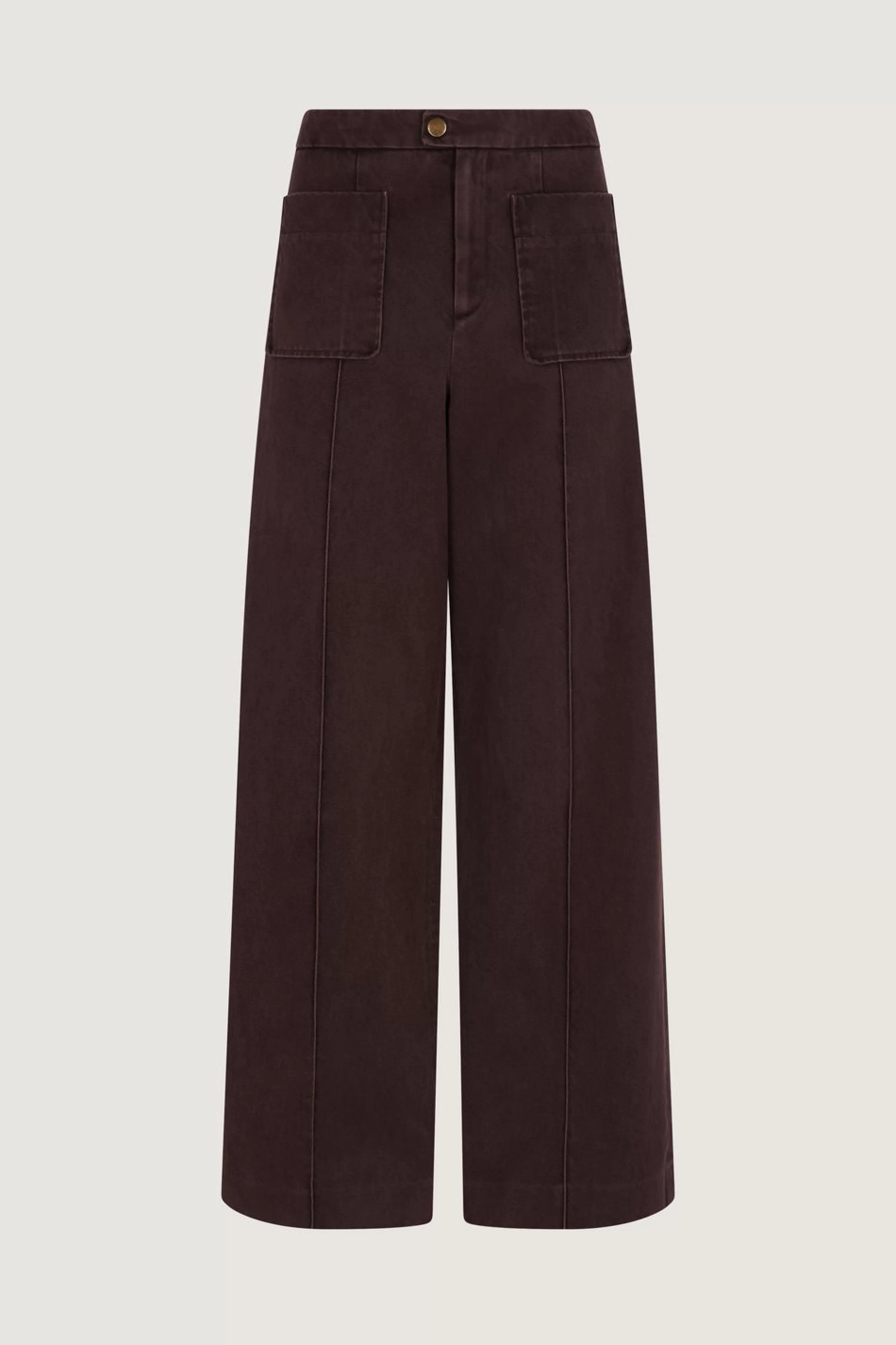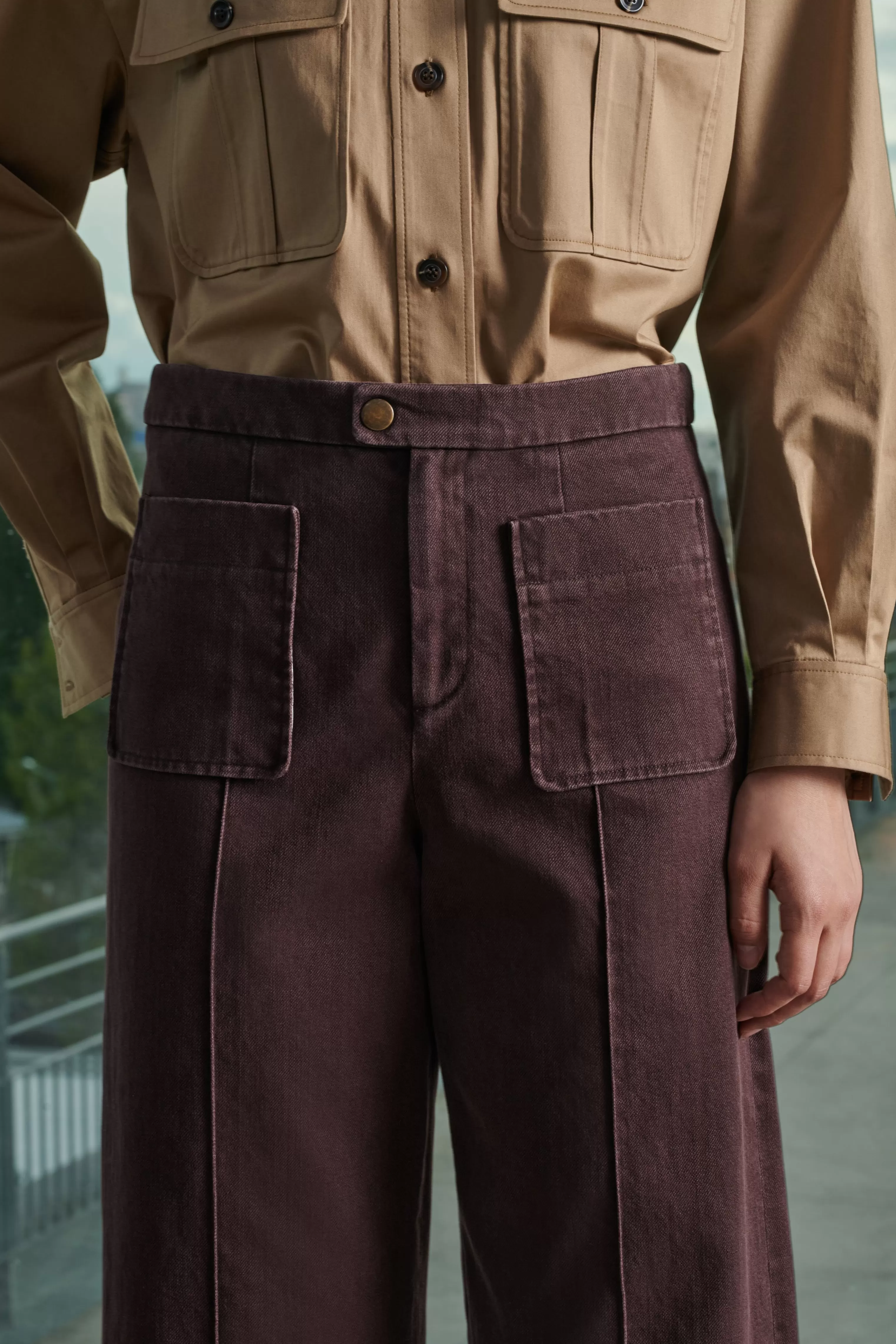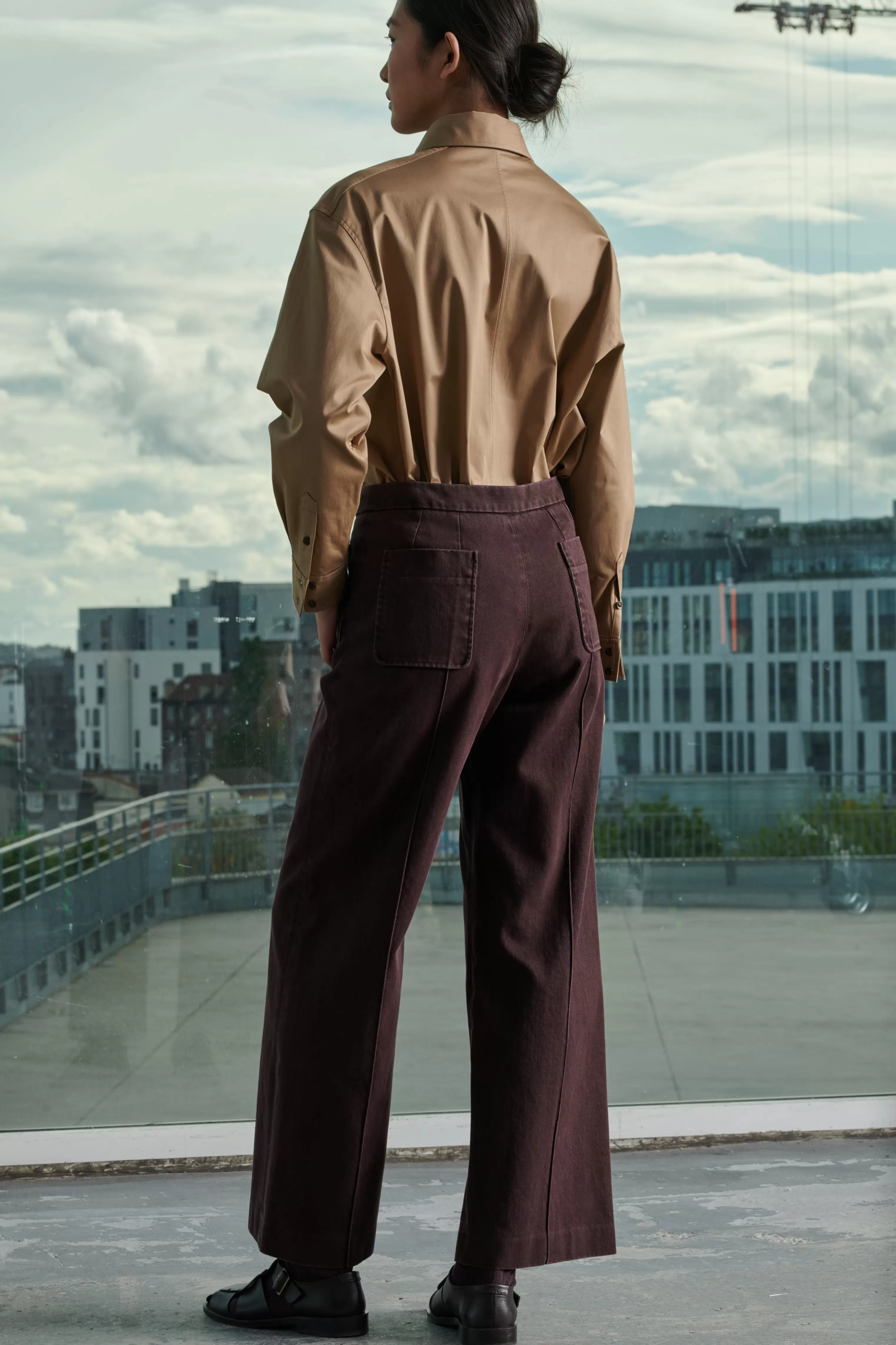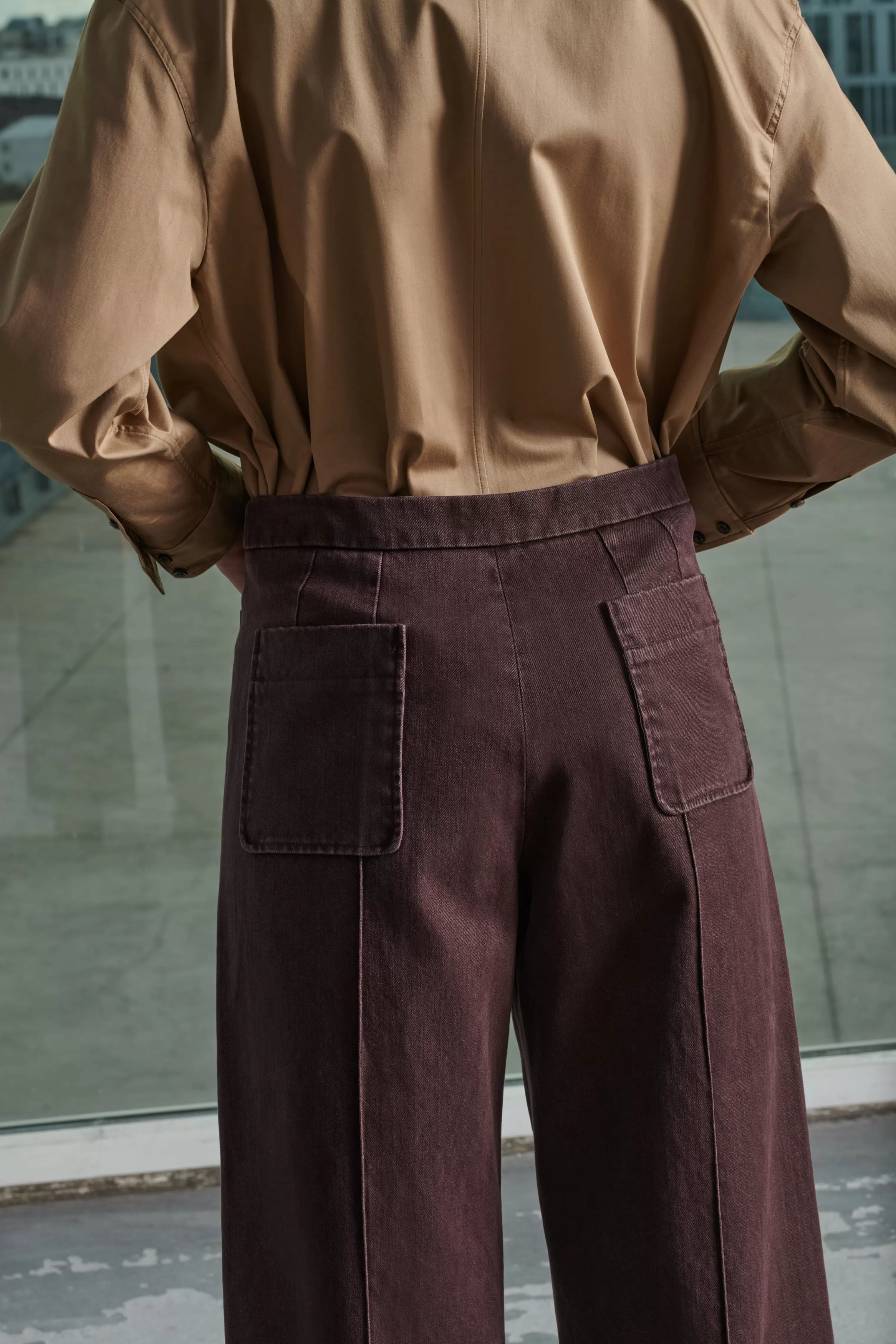Pantalon en sergé de coton lavé – Coupe droite légèrement évasée– Deux poches plaquées devant et dos– Pli piqué le long de la jambe