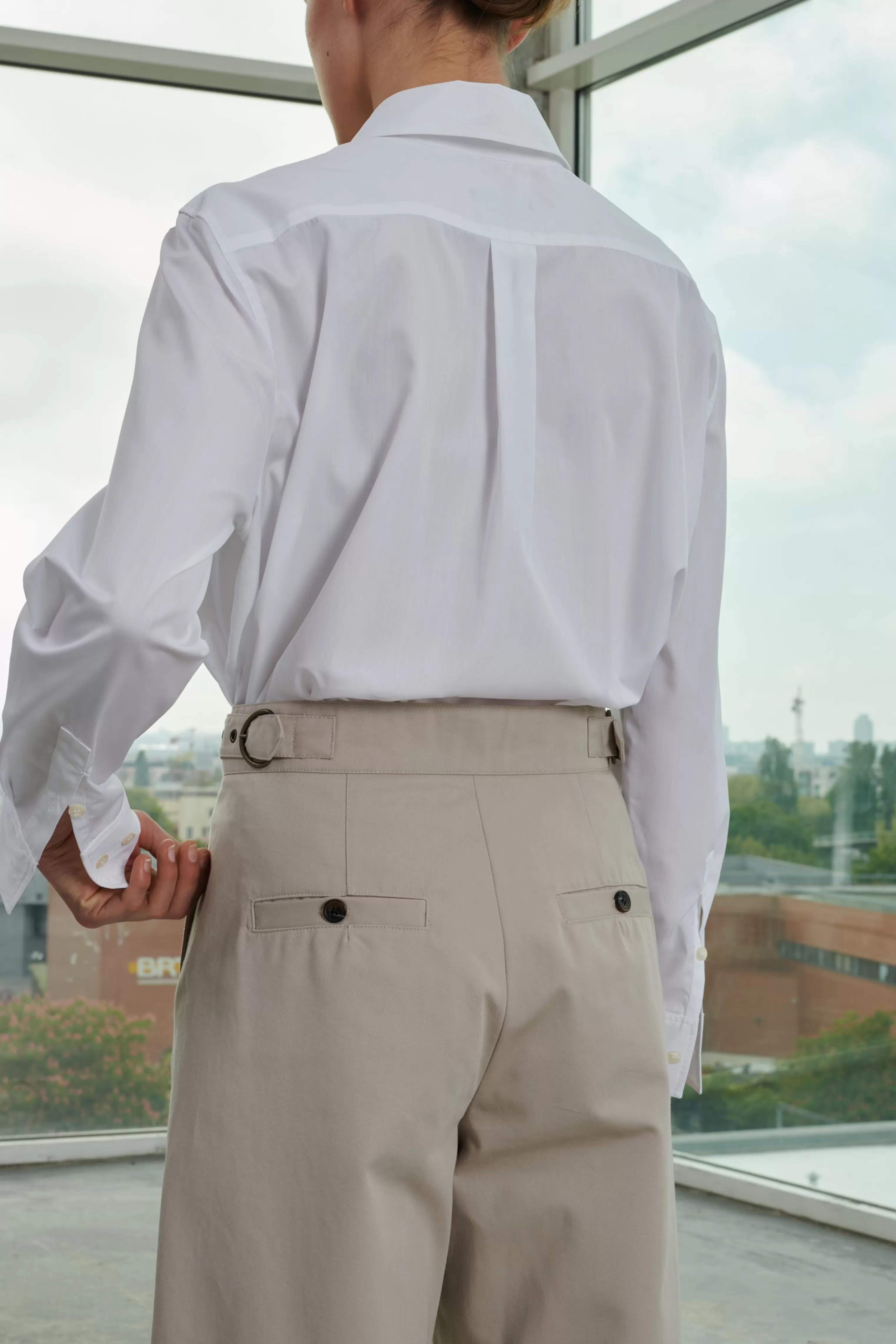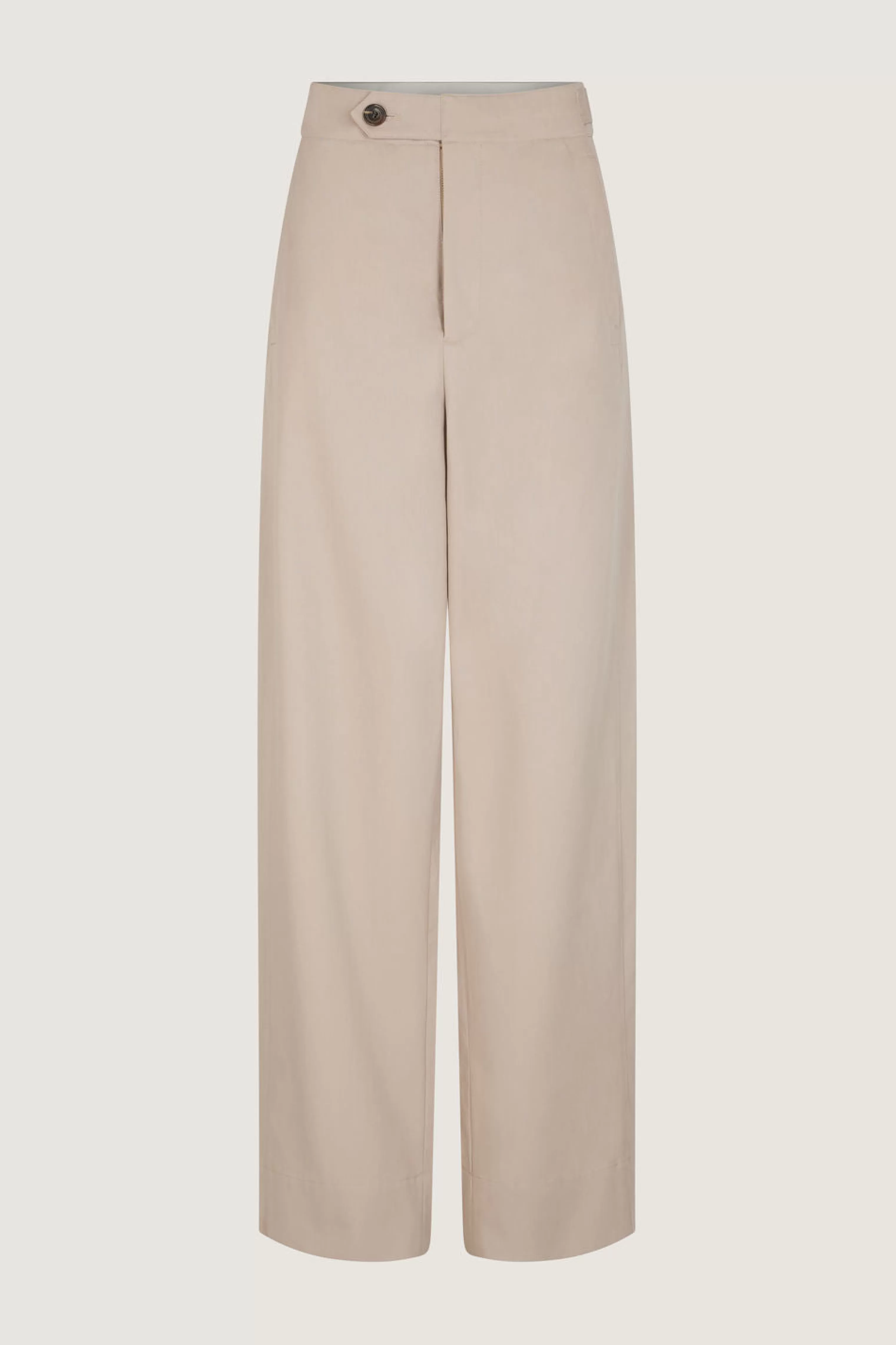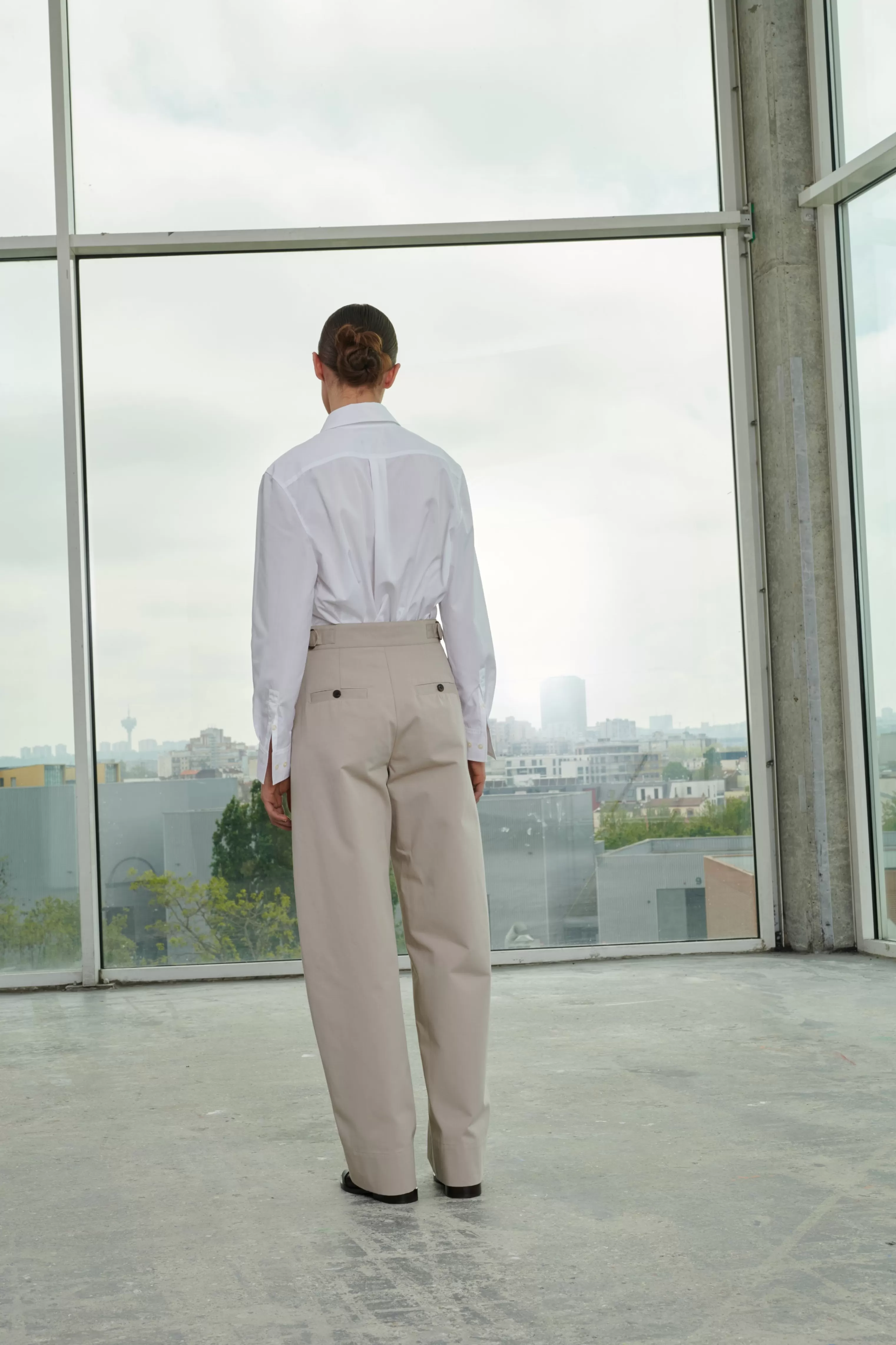 Pantalon en gabardine de coton lourde – Coupe ample– Pattes de serrage ajustables à la taille– Ceinture boutonnée par une patte déportée– Poches insérées dans les coutures côtés– Poches passepoilées boutonnées au dos