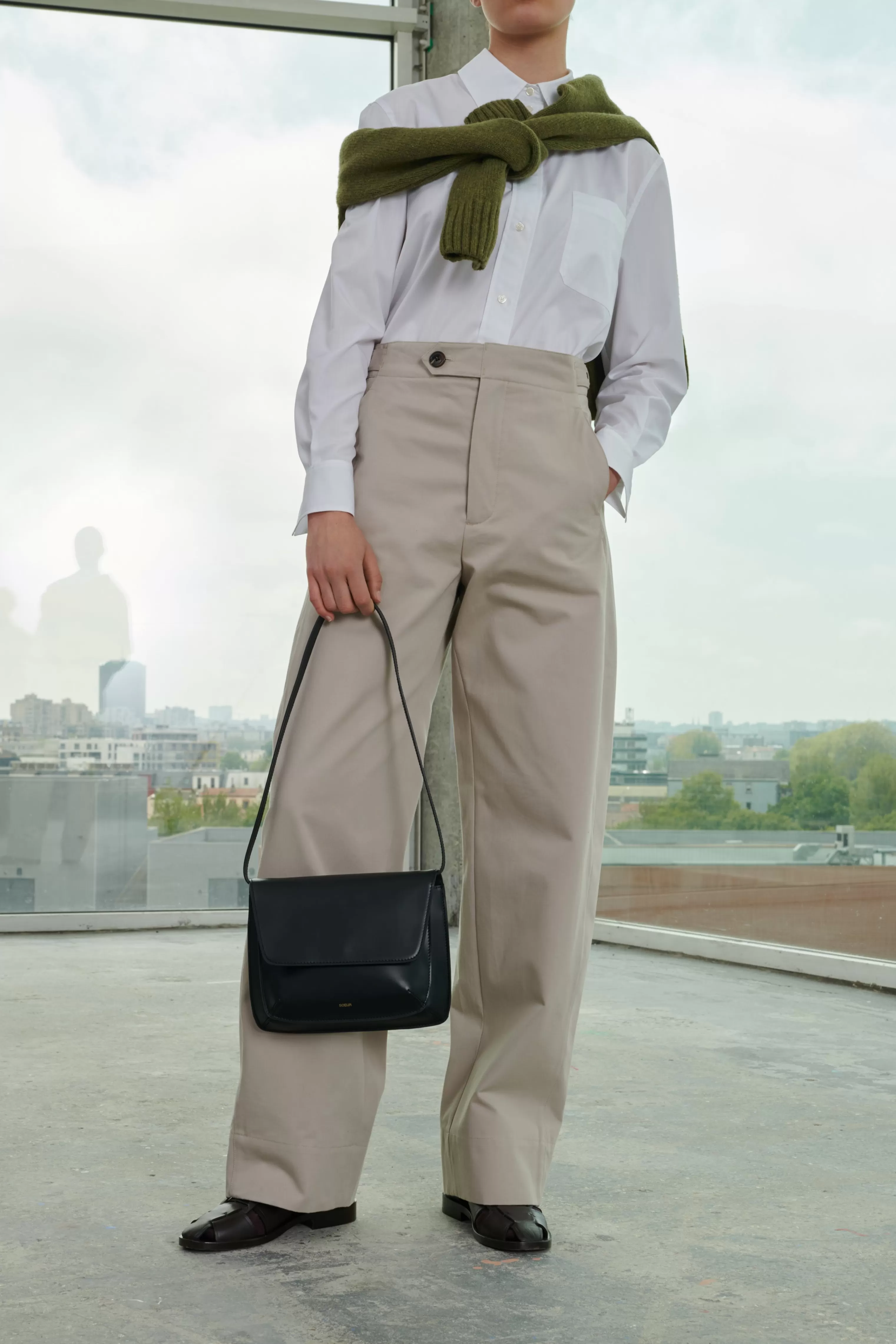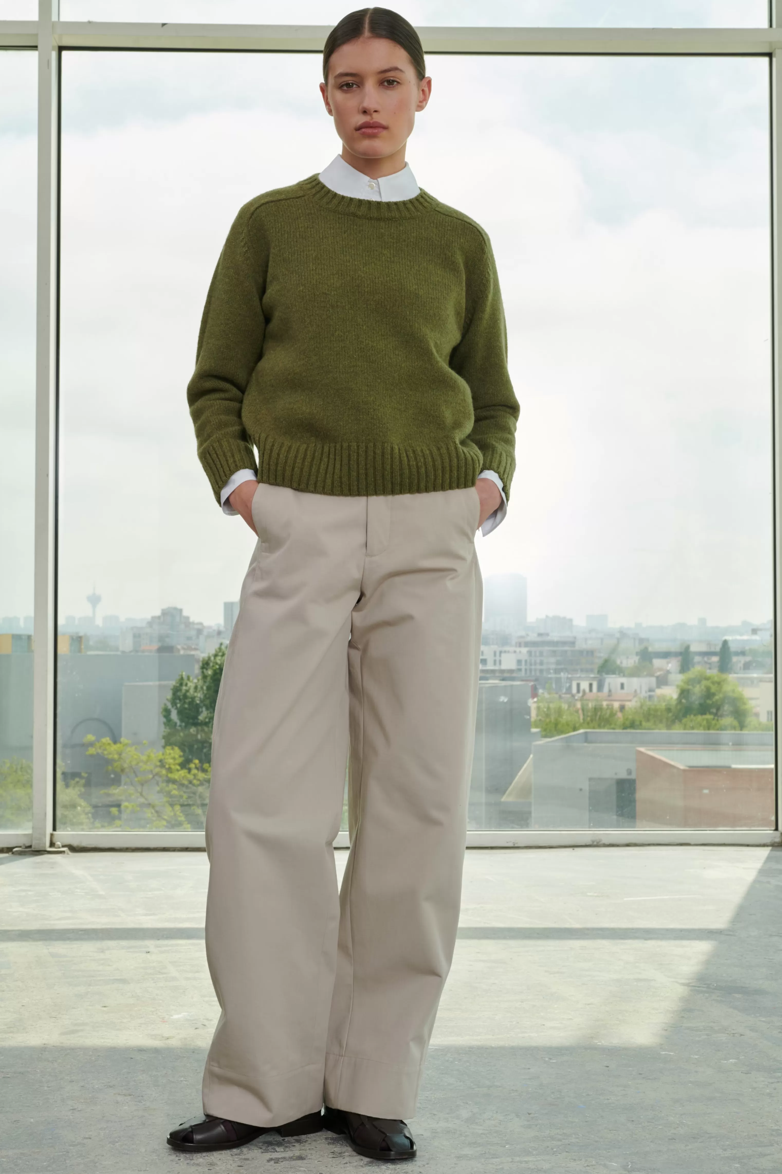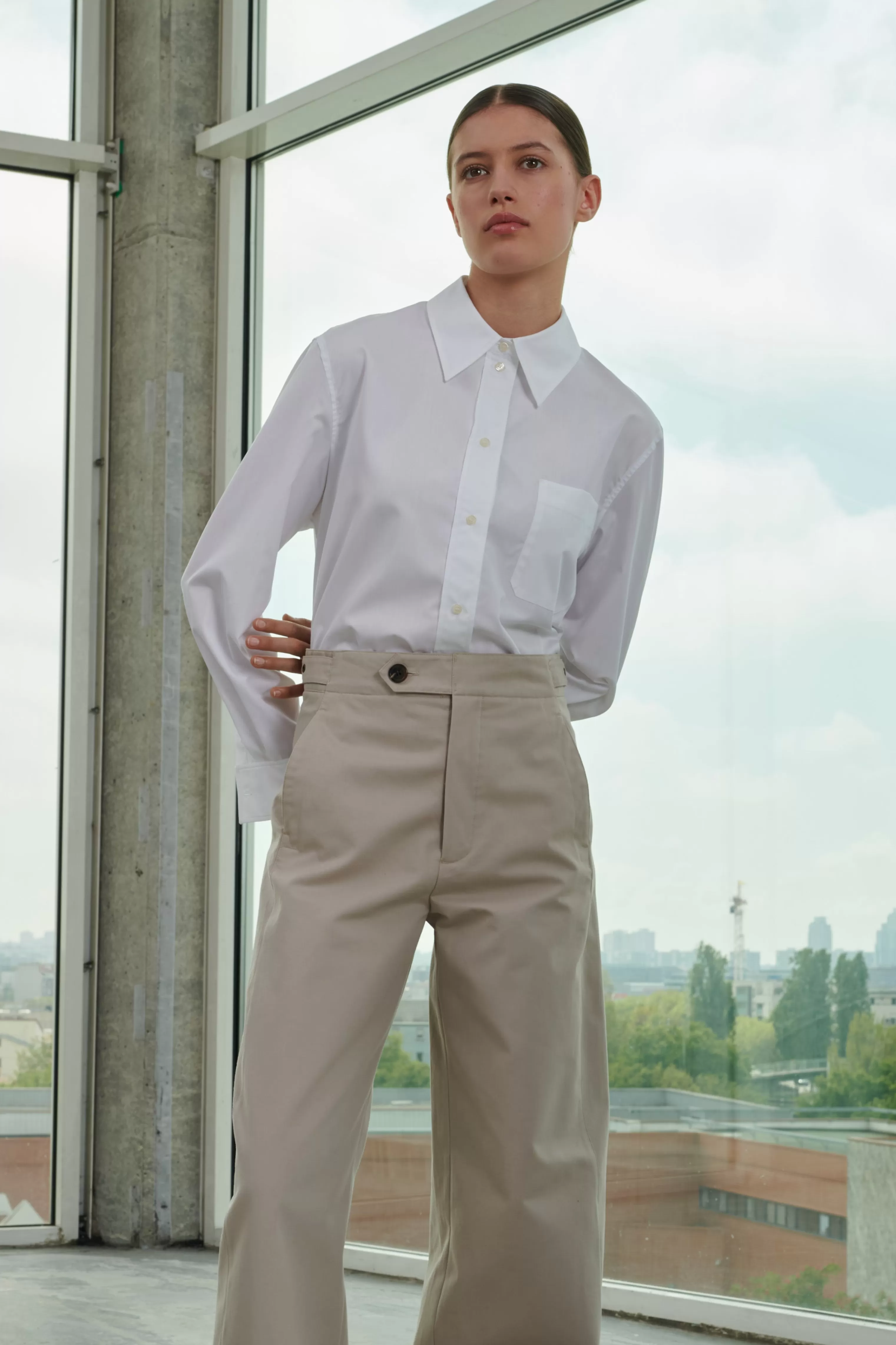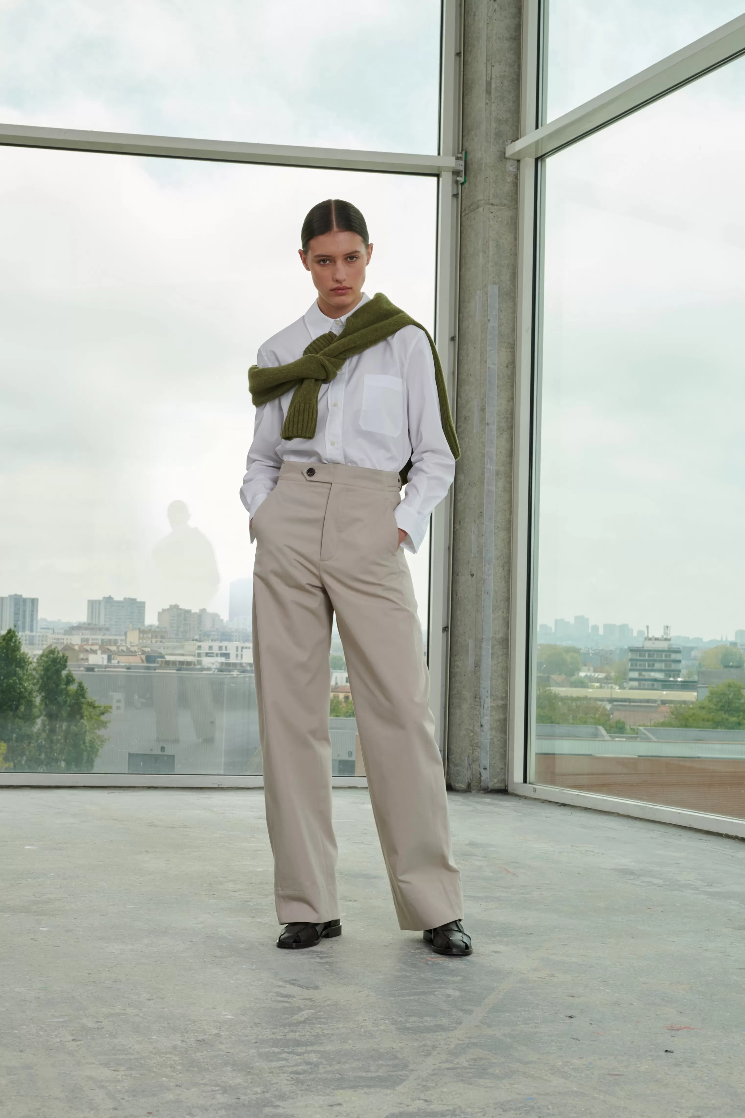 Pantalon en gabardine de coton lourde – Coupe ample– Pattes de serrage ajustables à la taille– Ceinture boutonnée par une patte déportée– Poches insérées dans les coutures côtés– Poches passepoilées boutonnées au dos