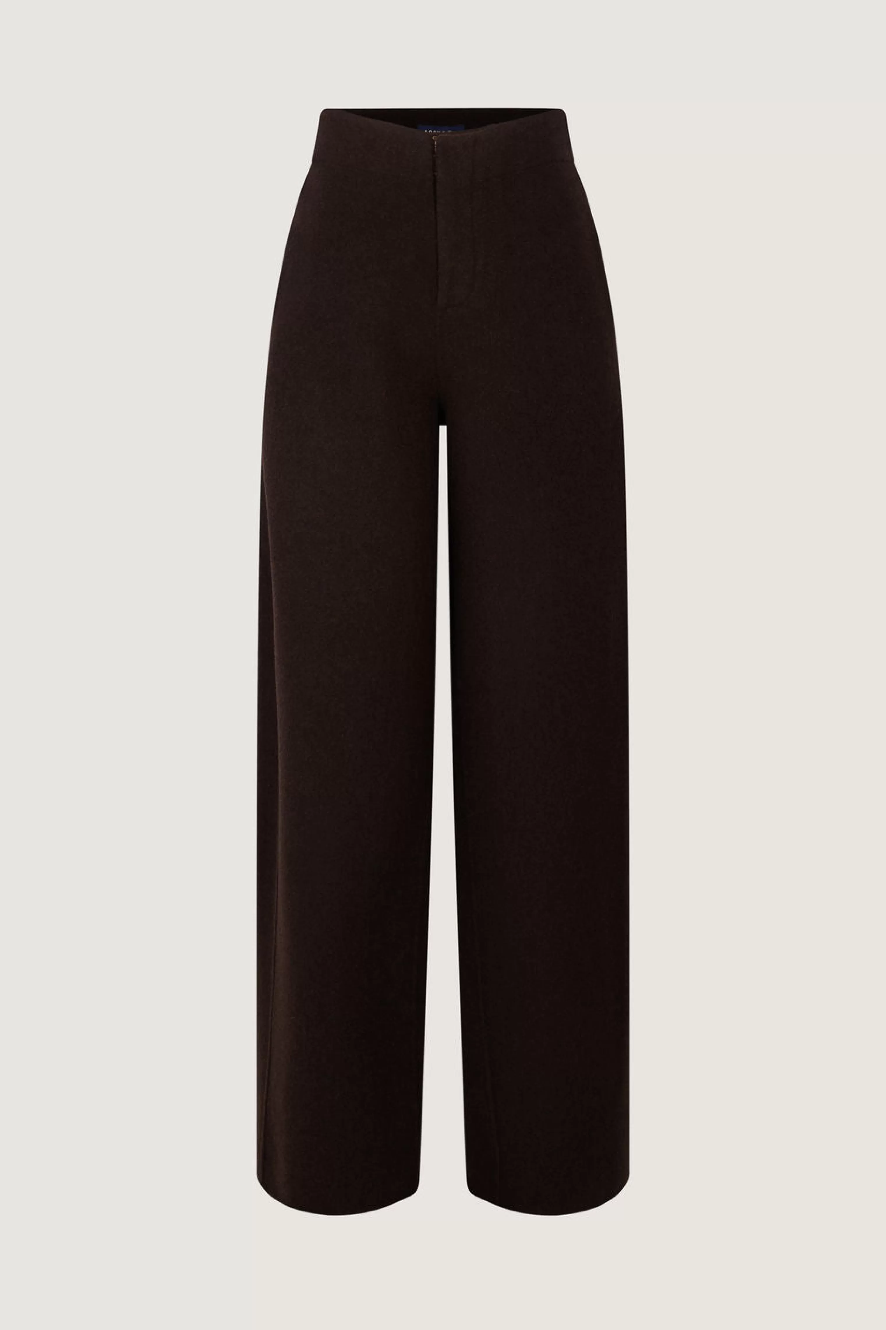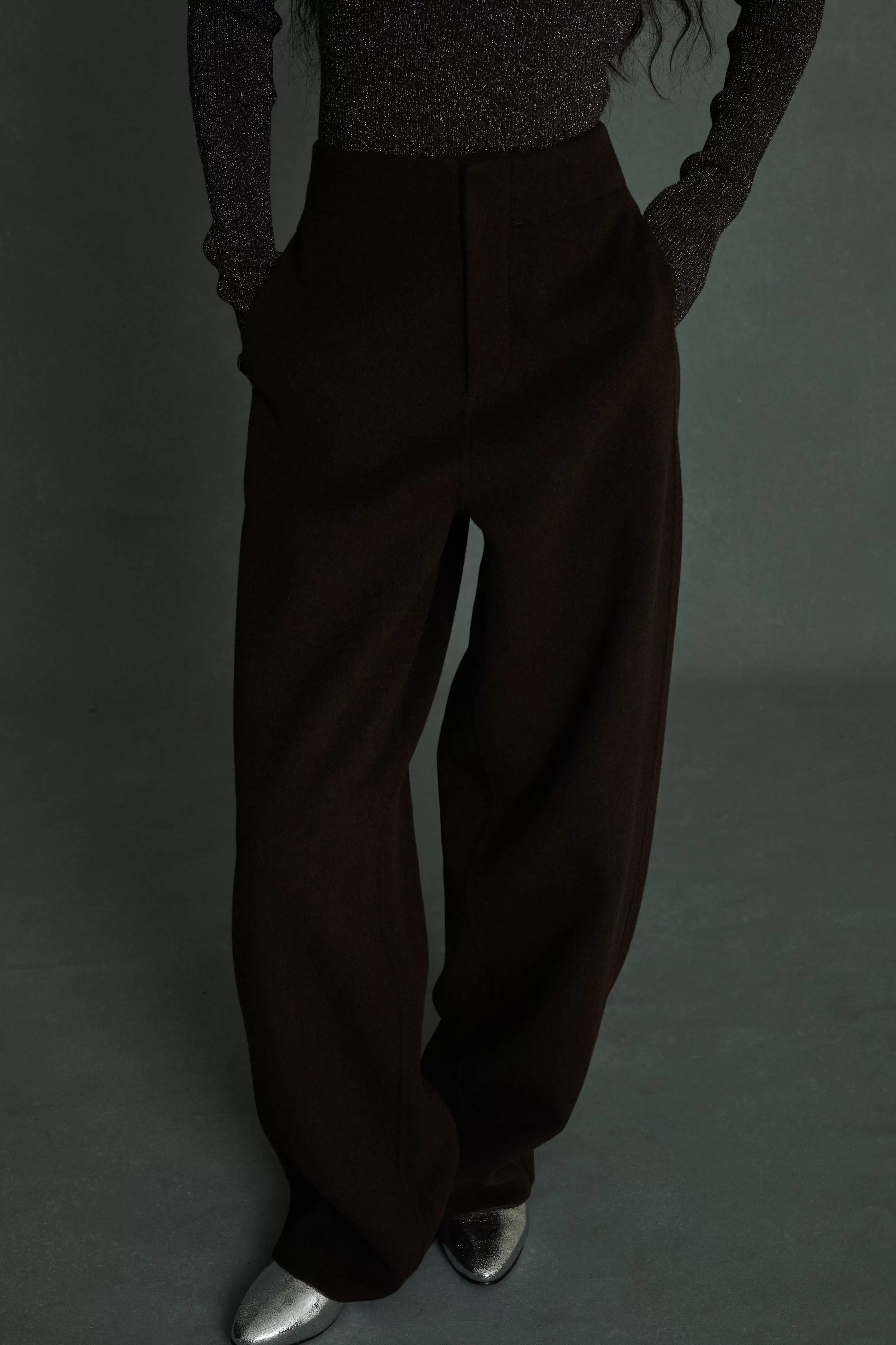 Pantalon en laine double face marron chiné– Coupe ample– Fermeture avec zip et crochet– Poches passepoilées devant– Ceinture avec enforme surpiquée