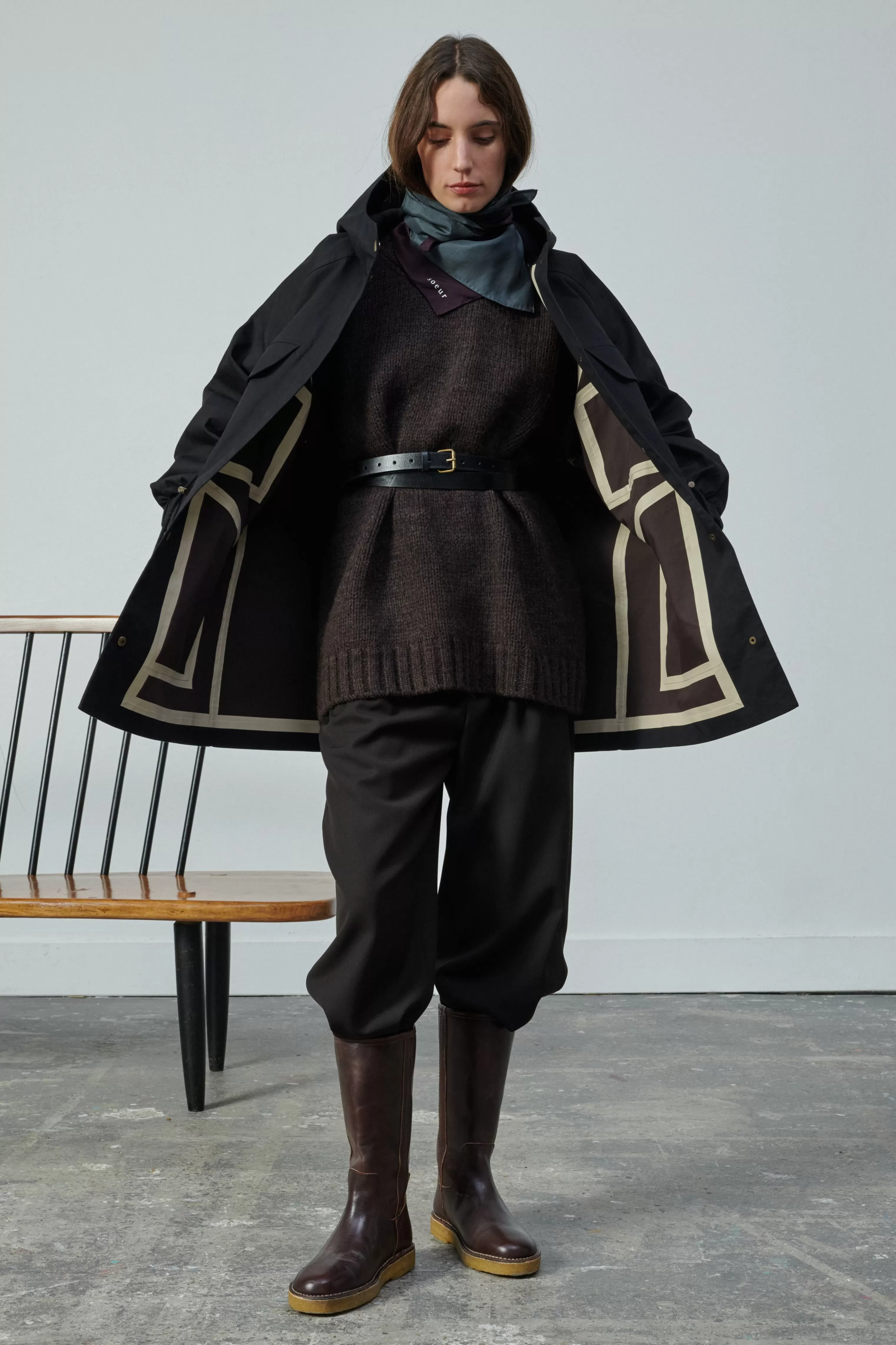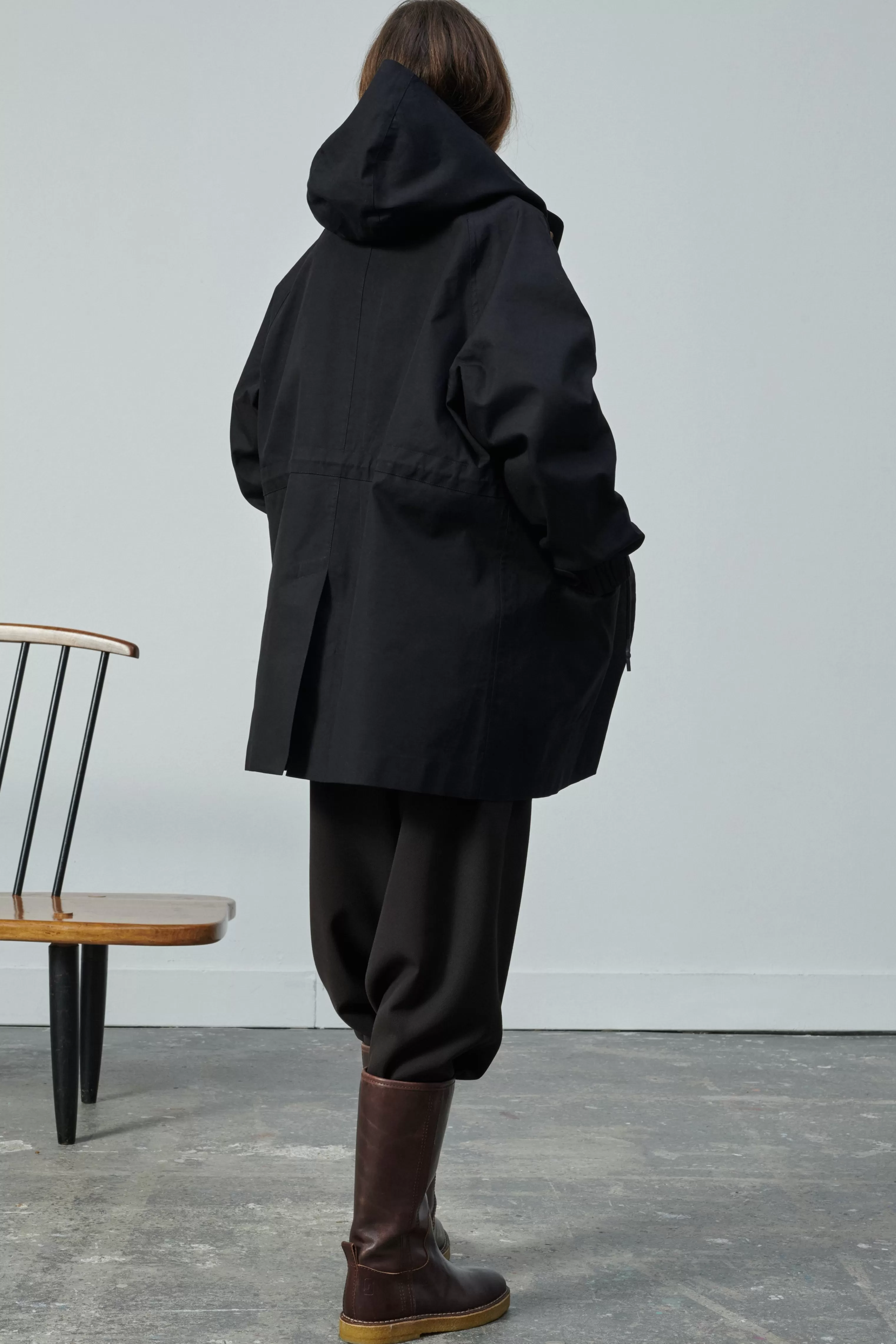 Cette toile de coton est doublée (deux épaisseurs) et a subi un traitement déperlant. La toile est compacte, avec beaucoup de tenue, afin d’accentuer le volume architecturale de la parka. Cette toile de coton est une alternative plus naturelle au nylon traditionnellement utilisé sur les pièces sportwear.