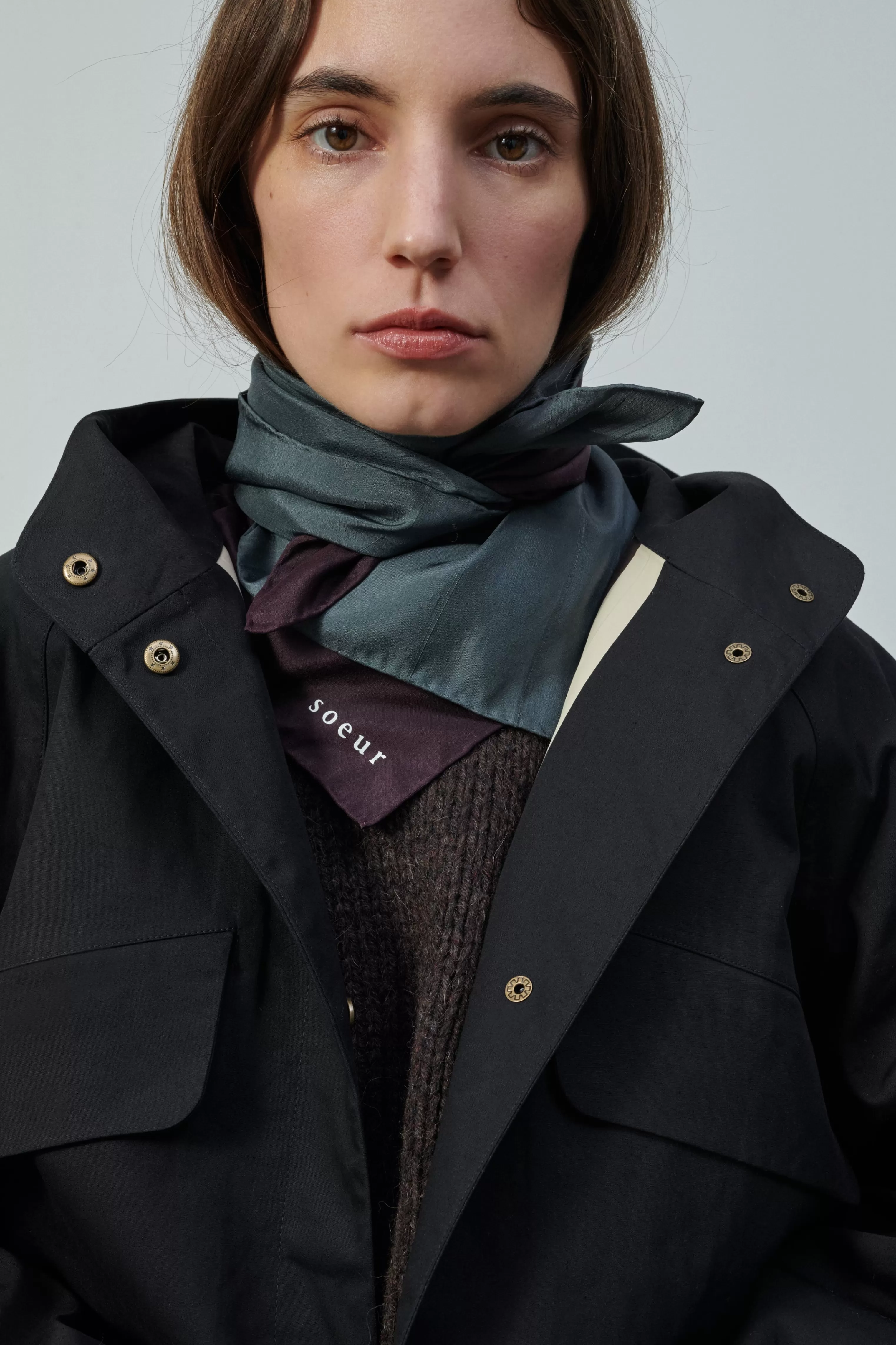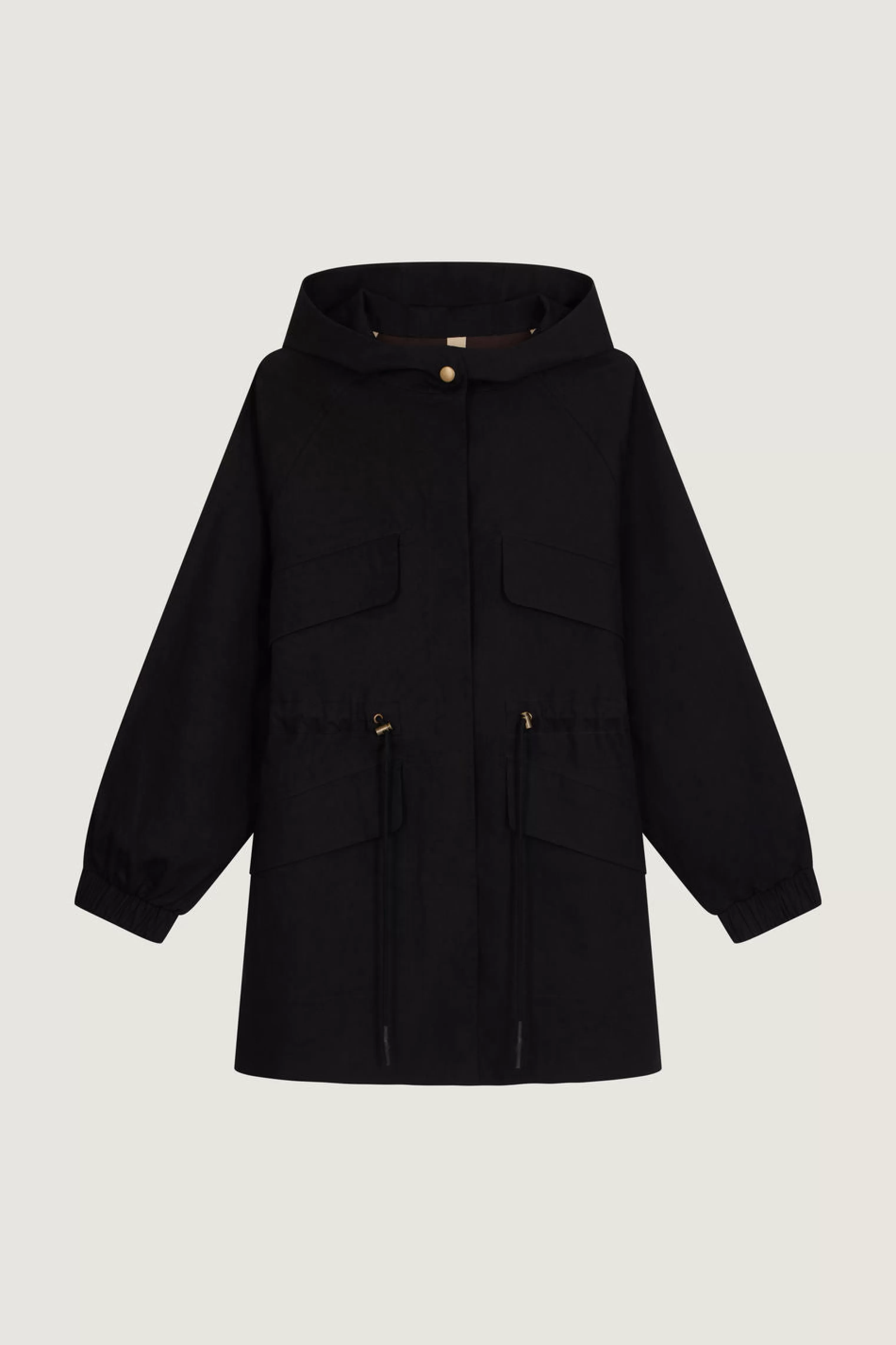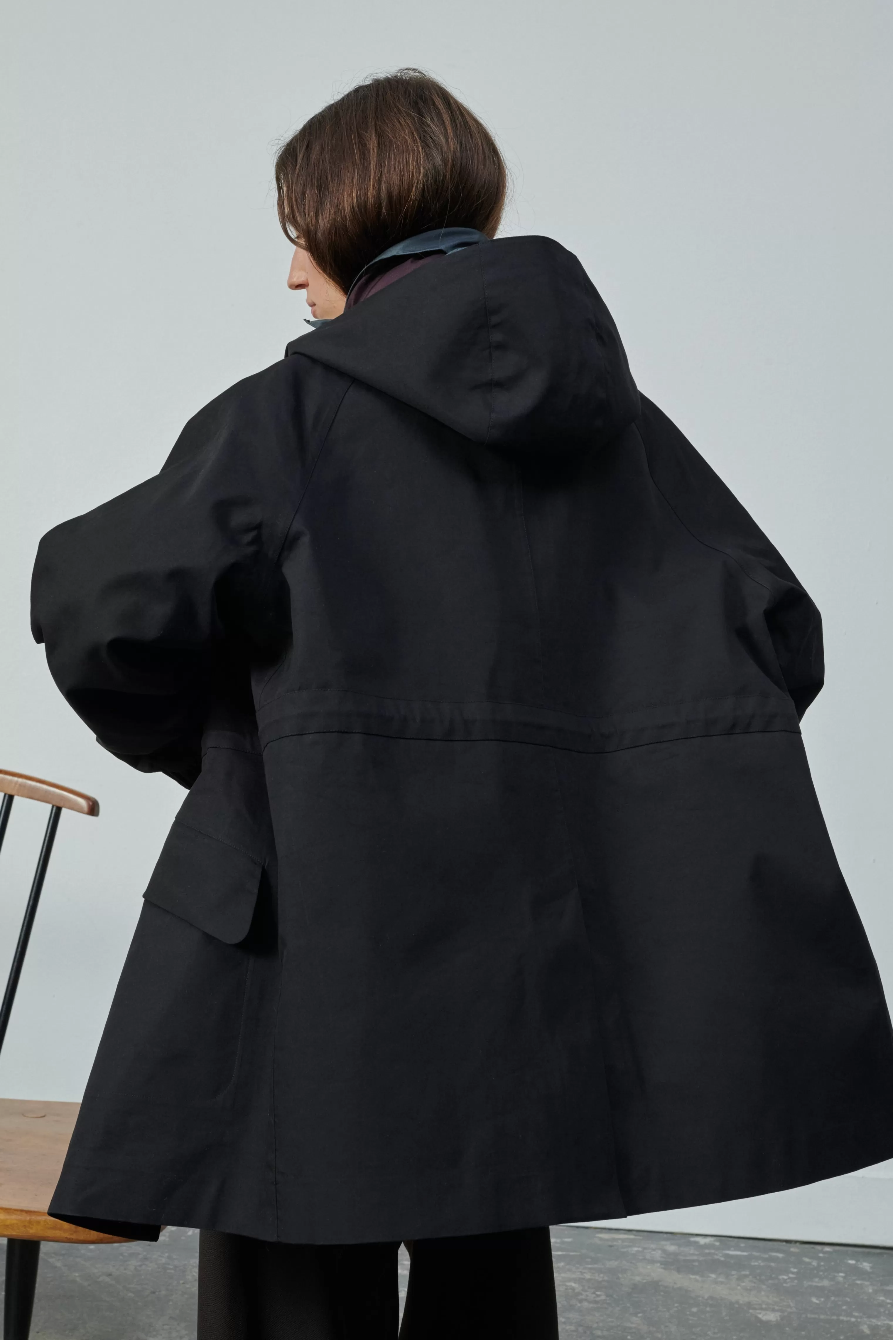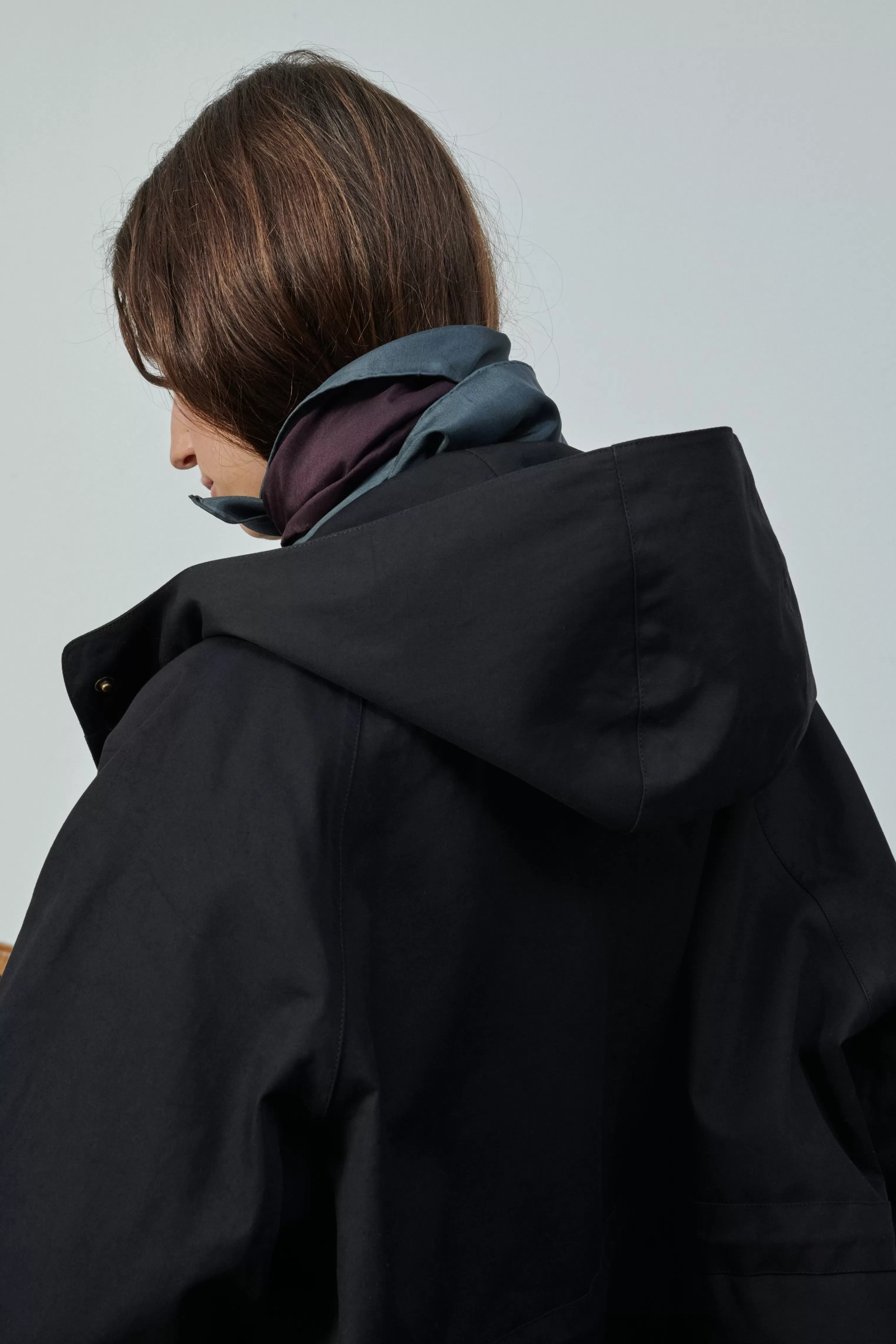 Parka en coton double bicolore – Volume ample mi-long– Capuche et col montant– Patte cachée boutonnée devant, avec boutons pression– Lien de serrage à la taille– Manches longues, raglan et poignets élastiqués– Quatre poches passepoilées à rabat devant– Détails de bandes thermosoudées en finitions intérieures