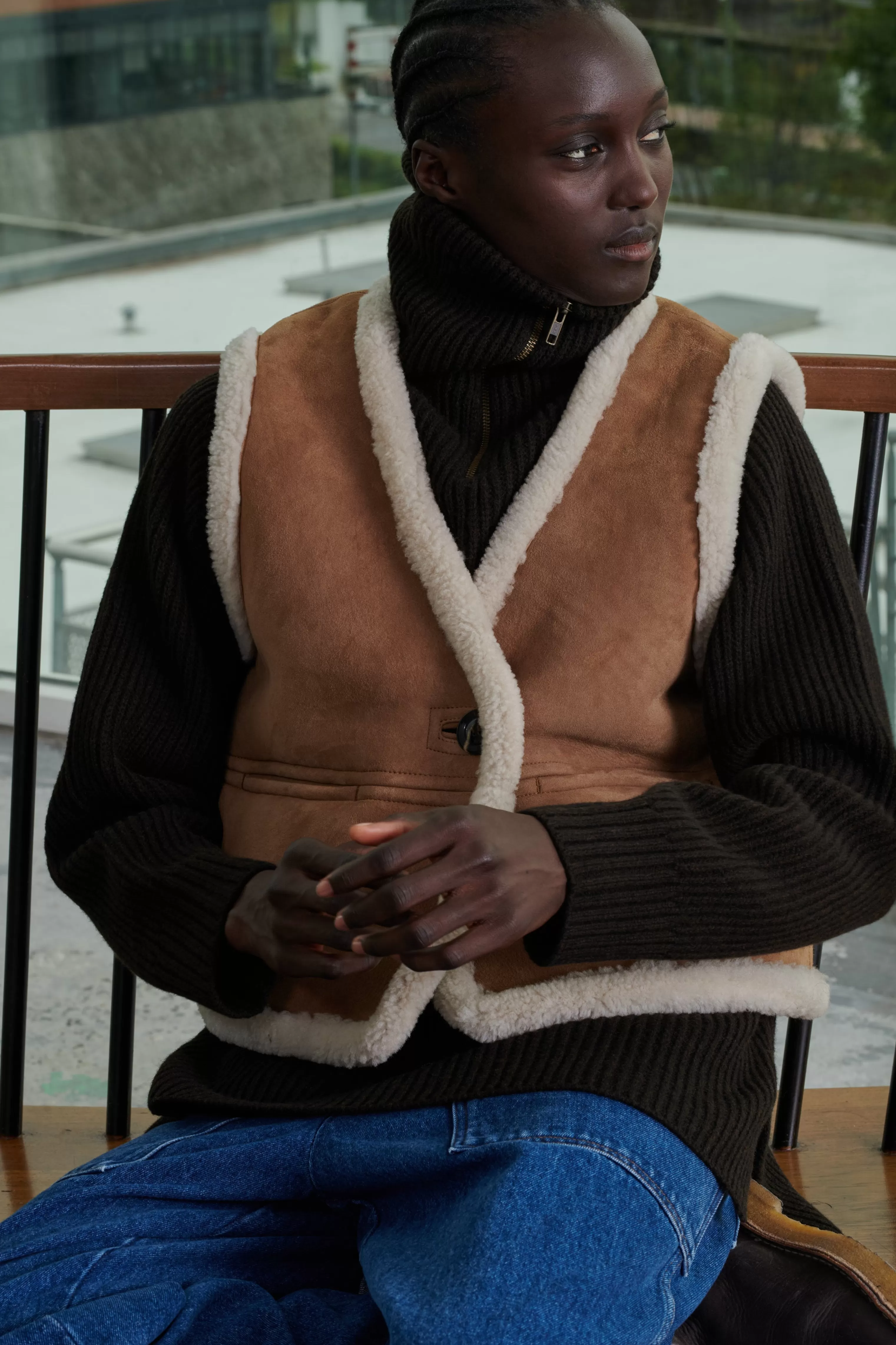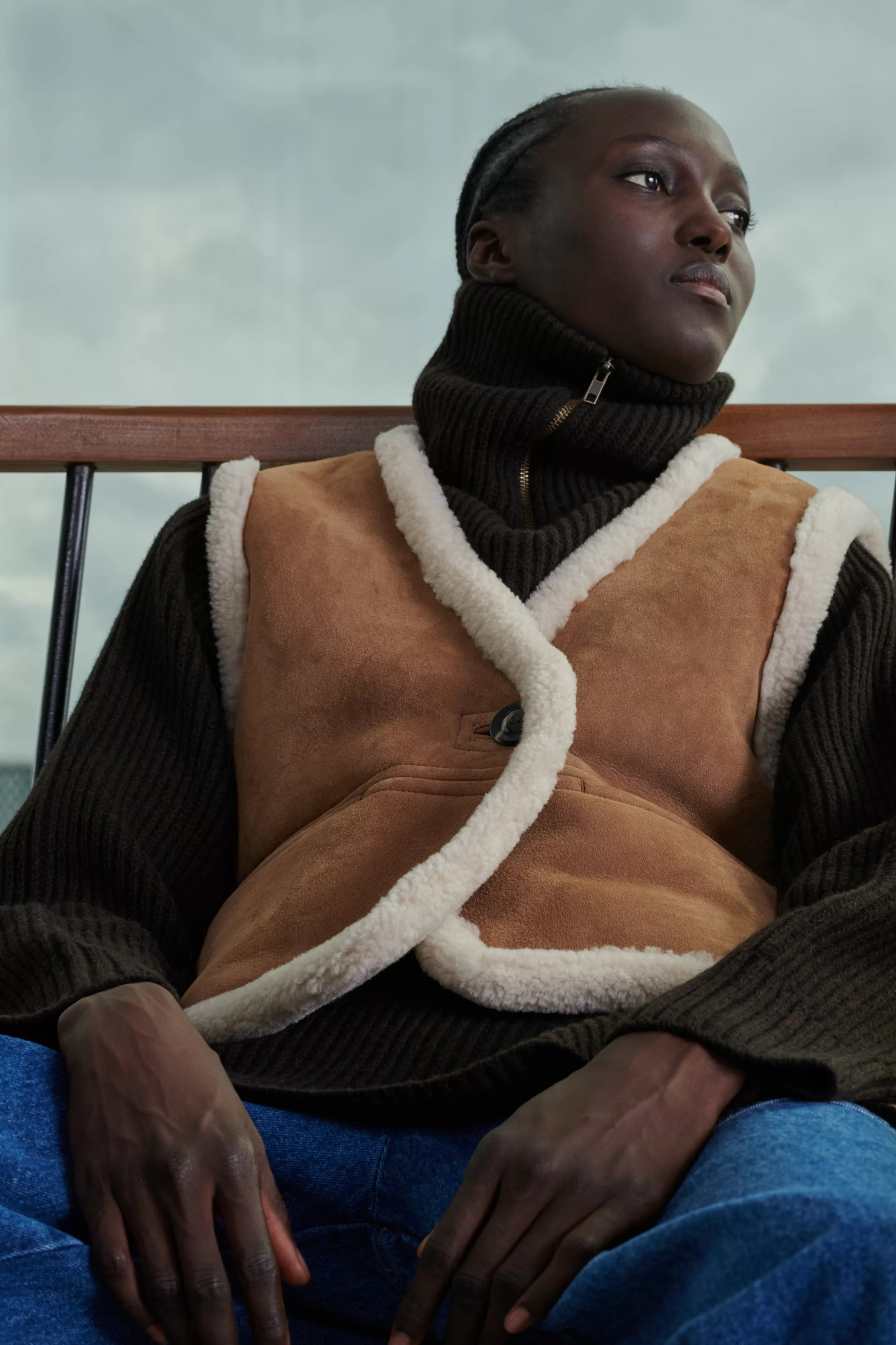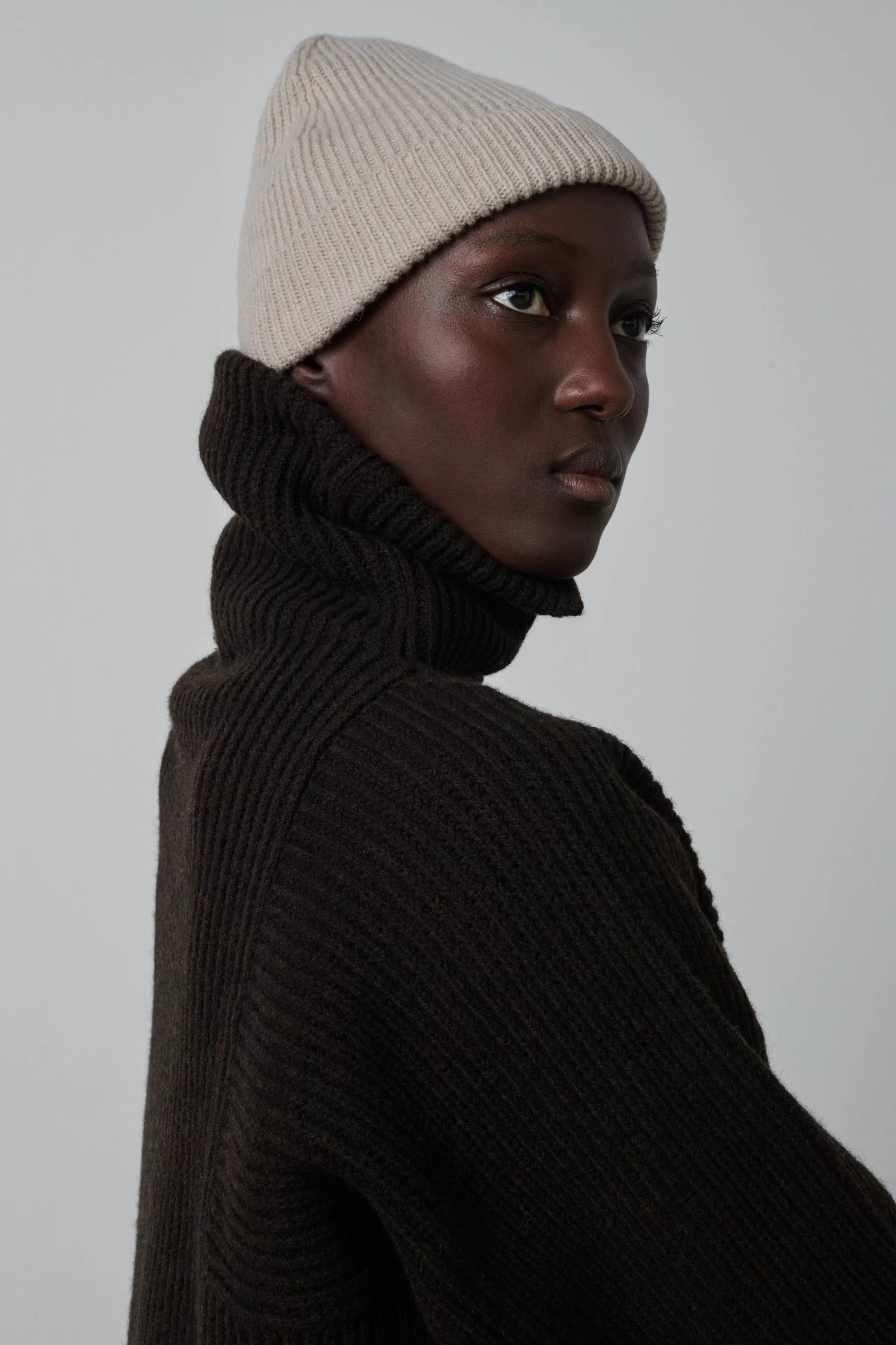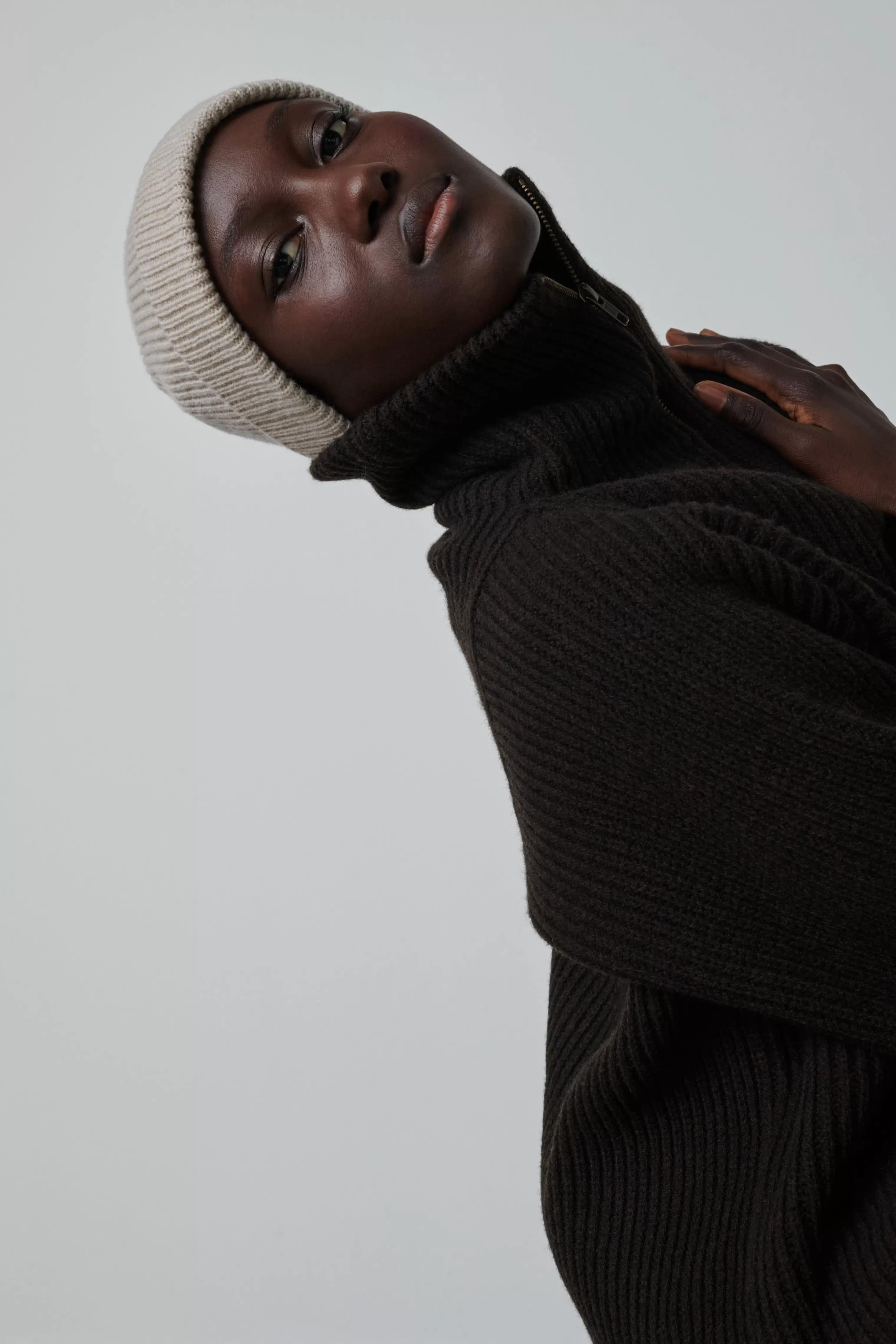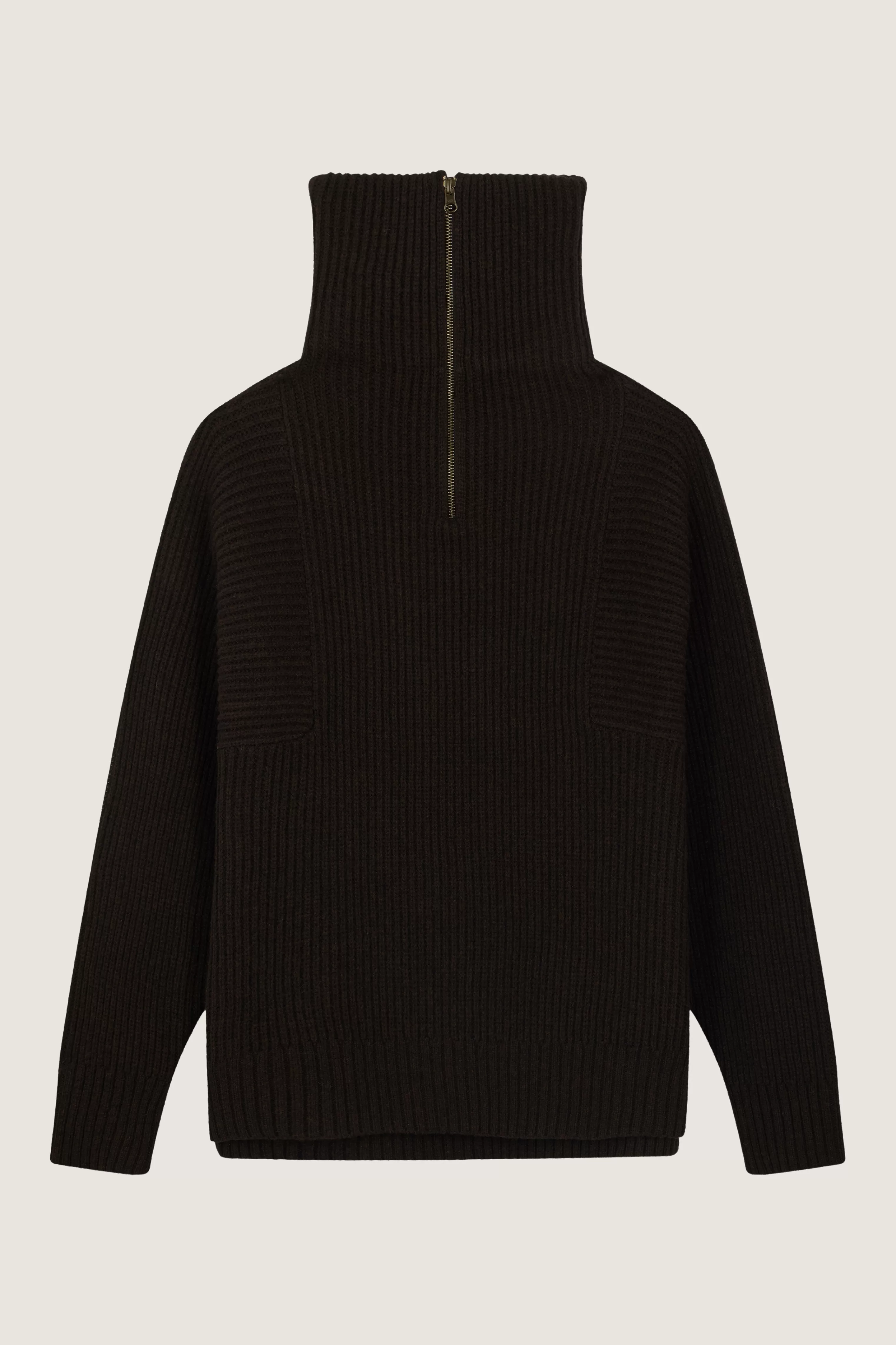 Pull col montant à côtes – Coupe droite, légèrement oversize– Col montant zippé– Fentes aux côtés – Grosse maille La laine est mulesing free.