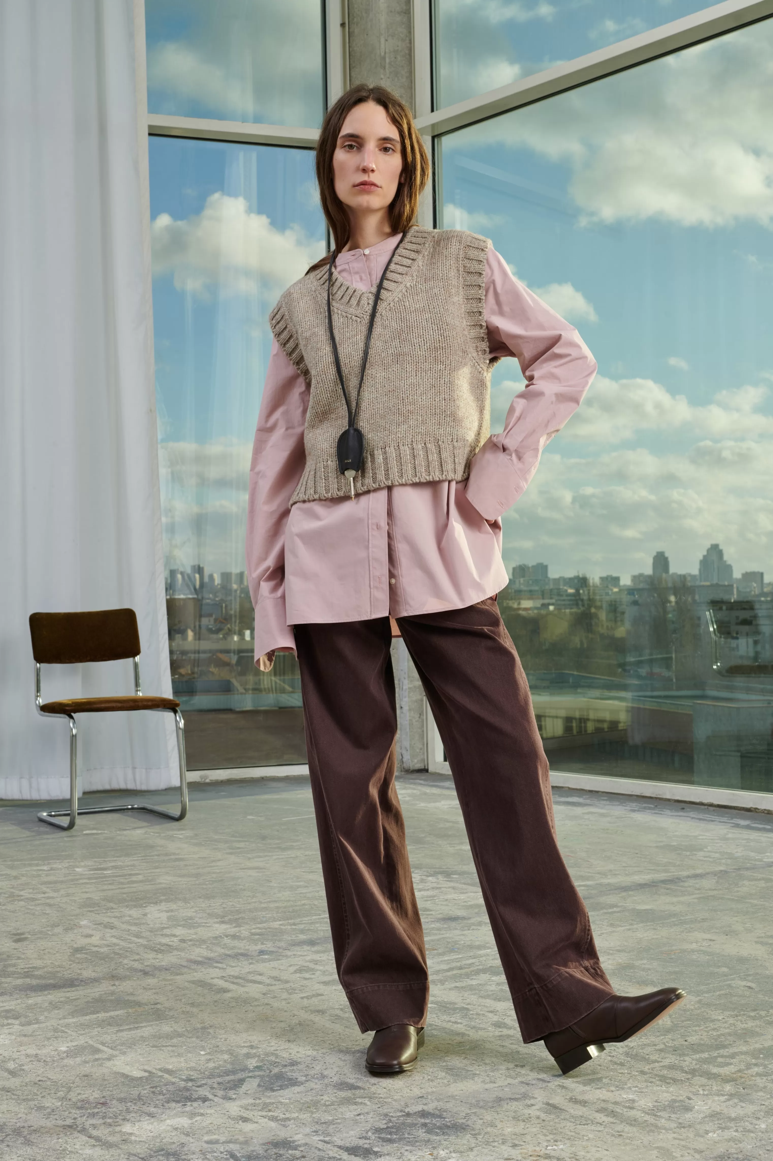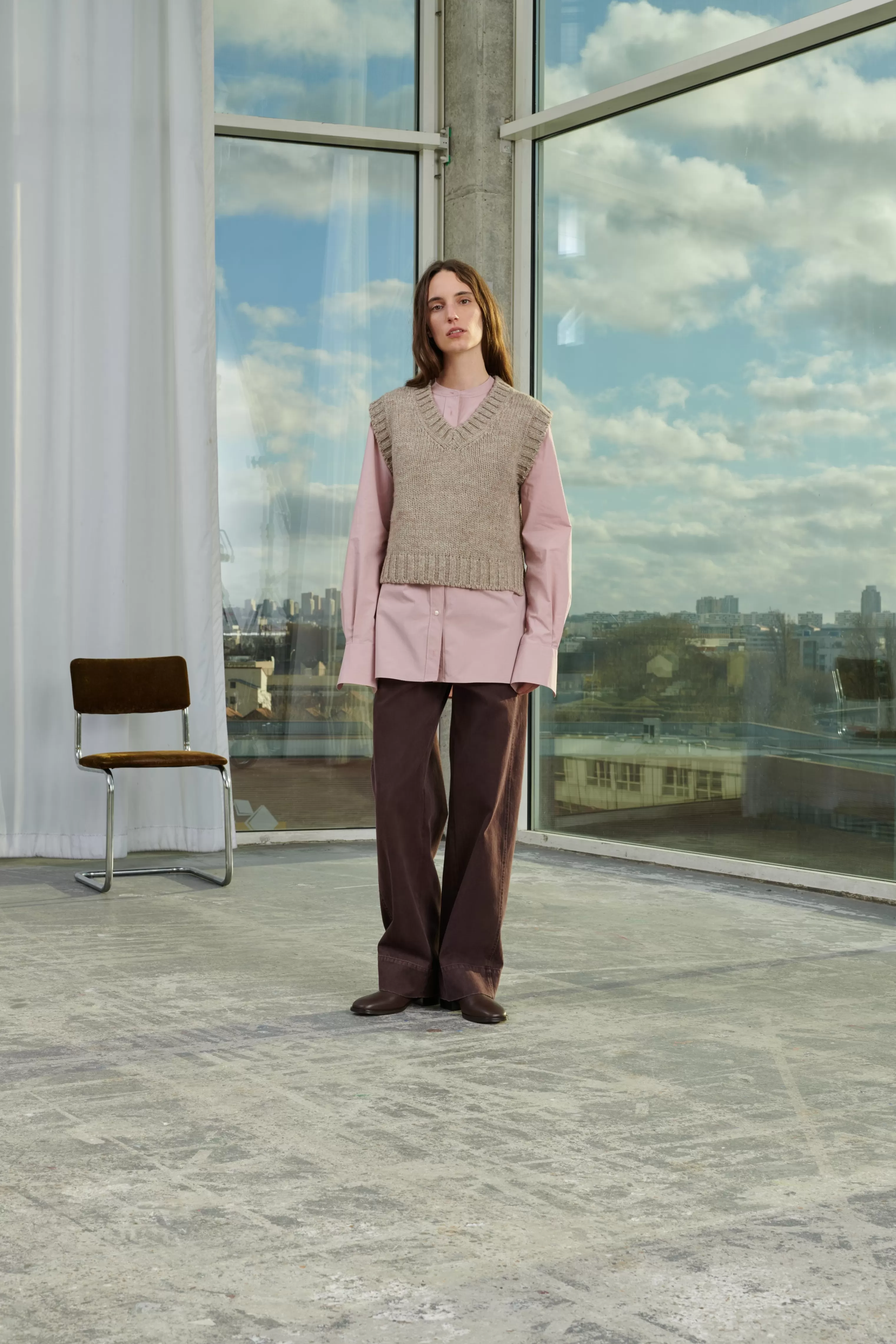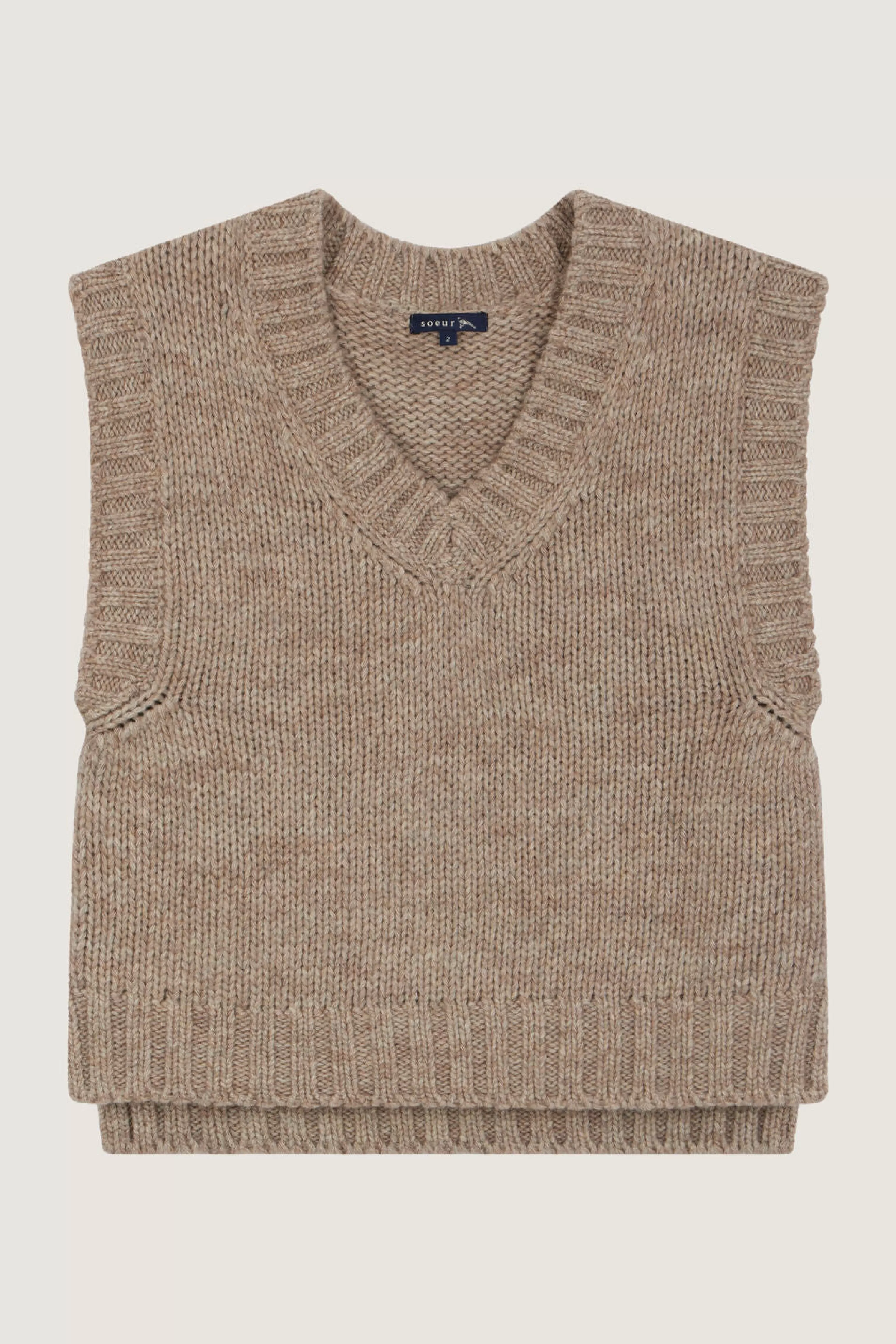 Pull sans manches col V – Coupe droite, courte– Encolure en V et sans manche– Fentes sur les côtés – Grosse maille La laine est mulesing free.