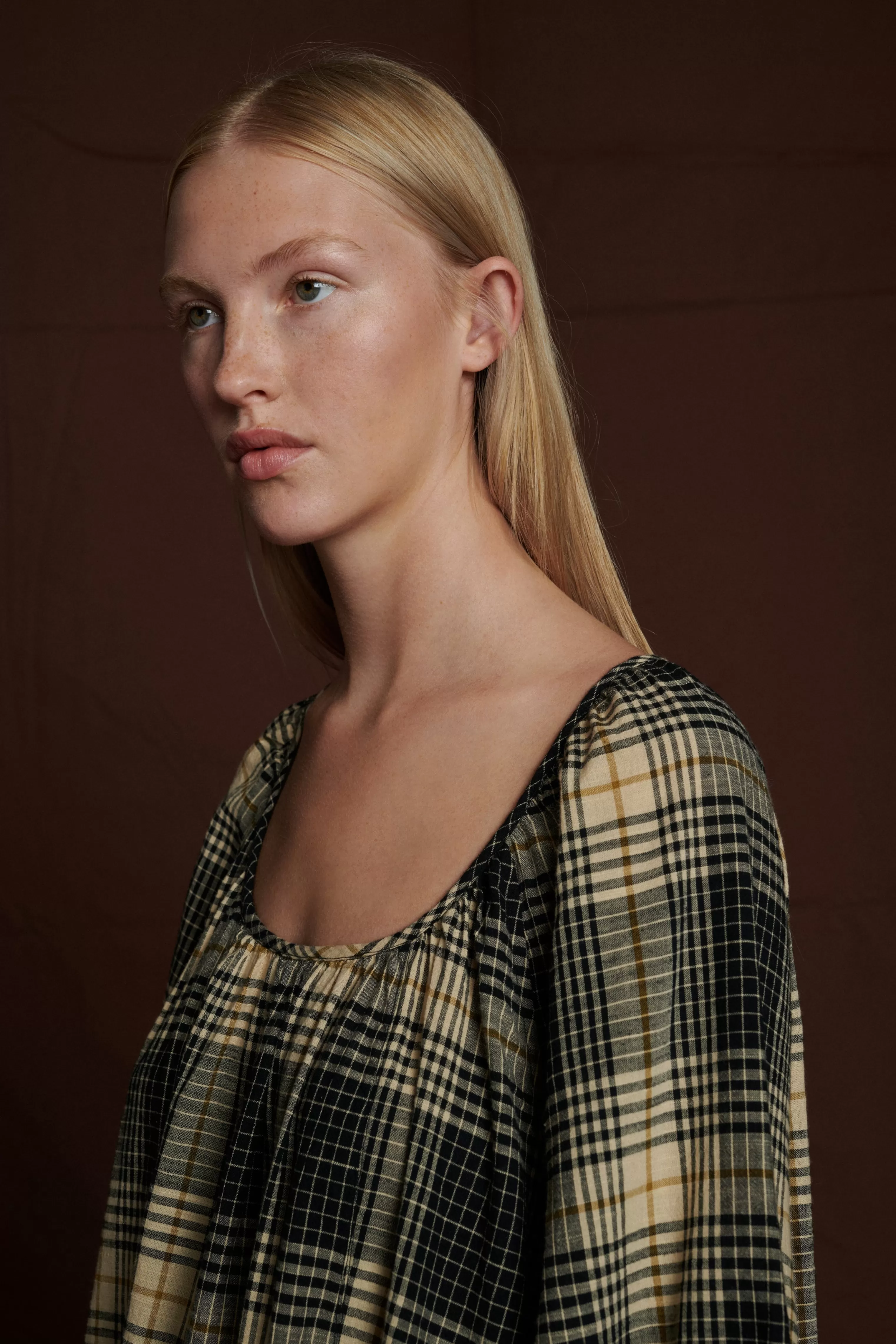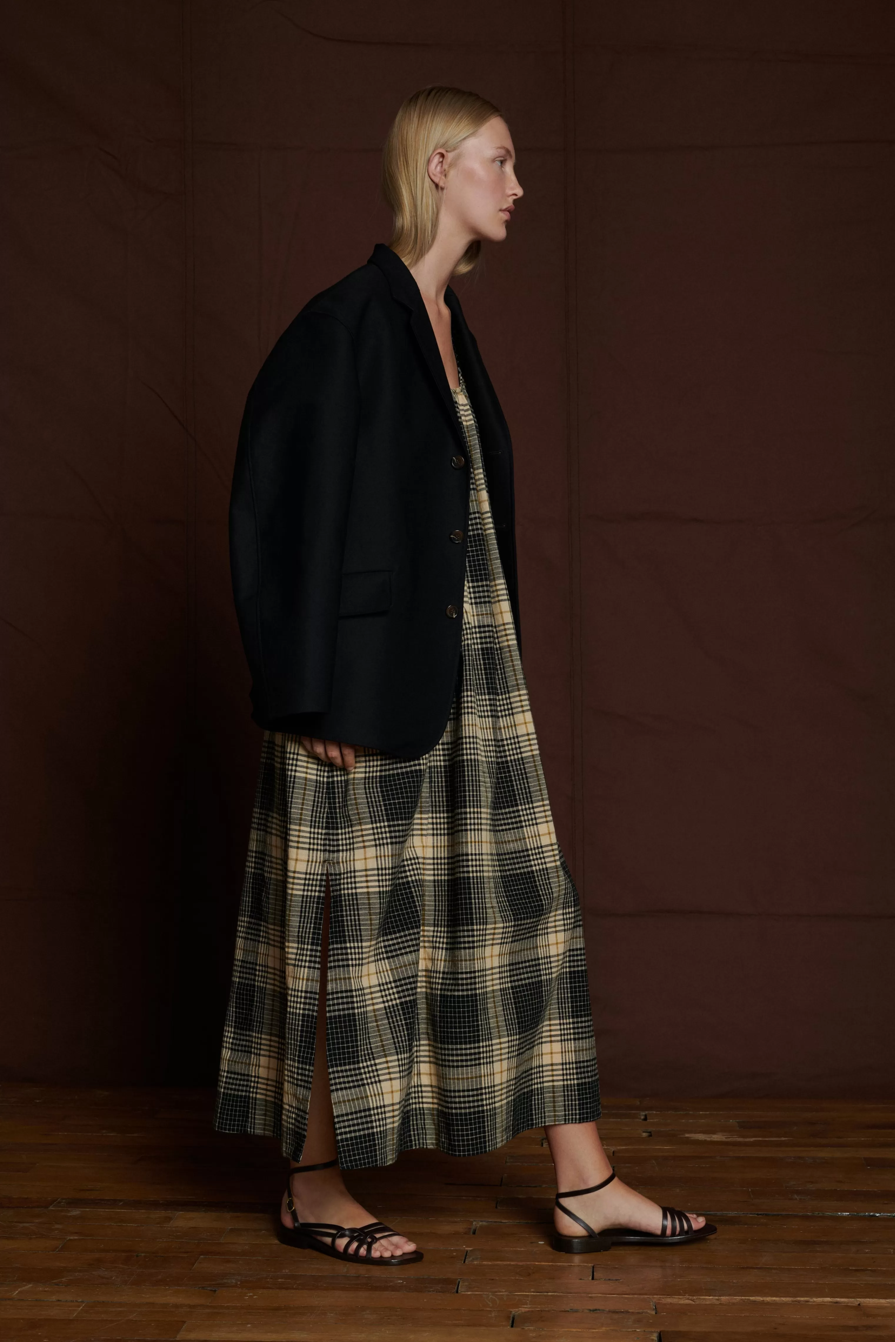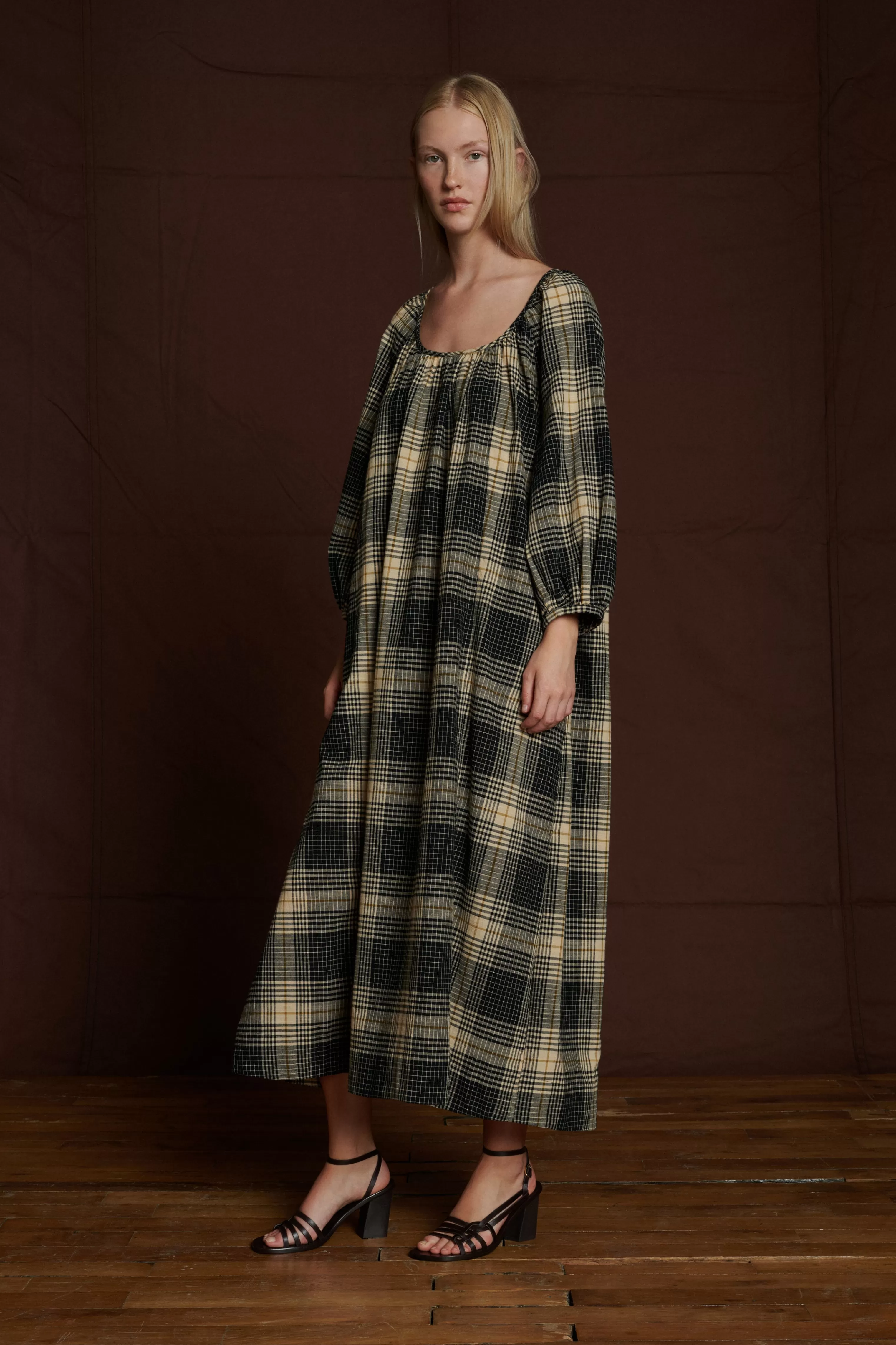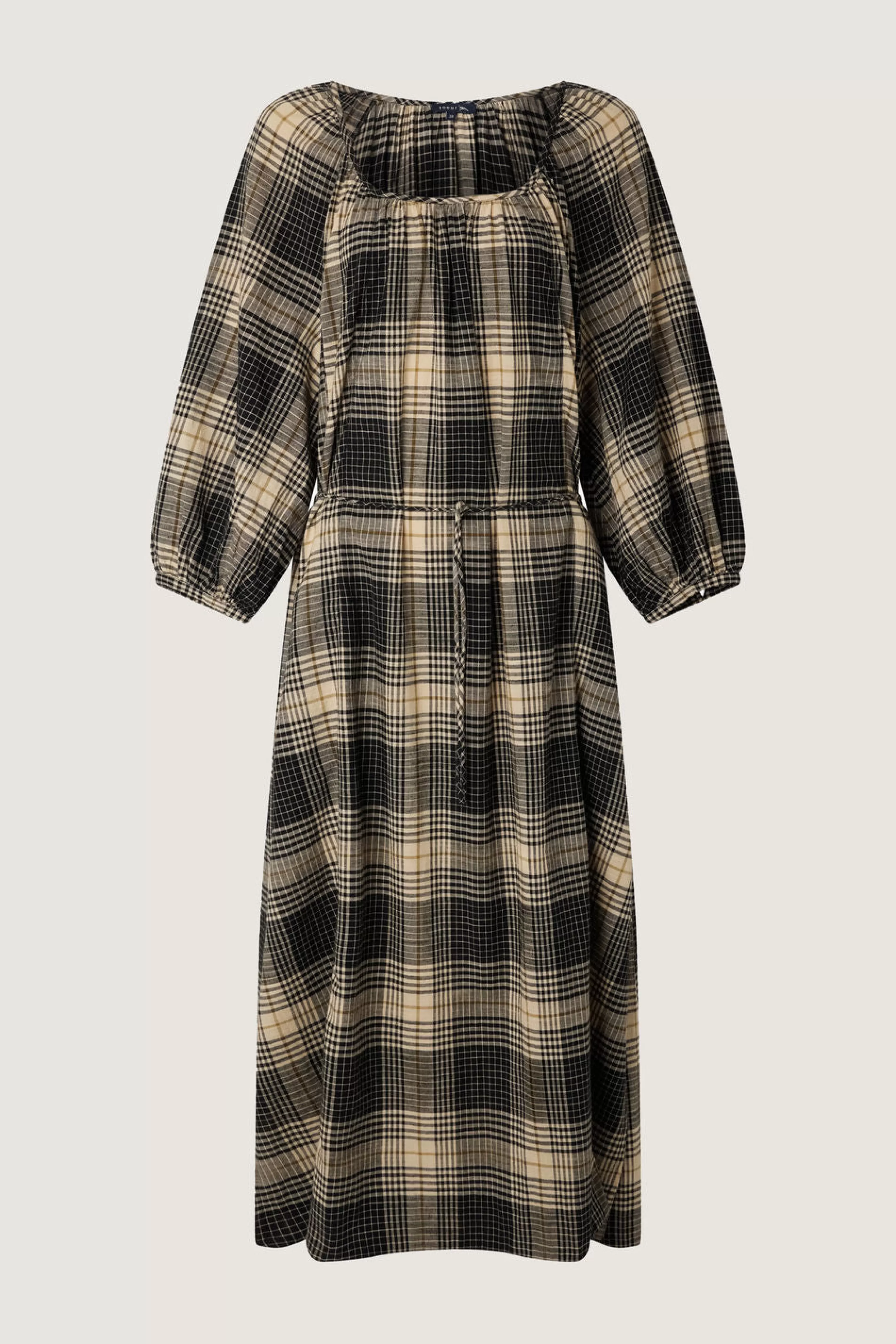 Robe longue ceinturée en toile de coton à carreaux