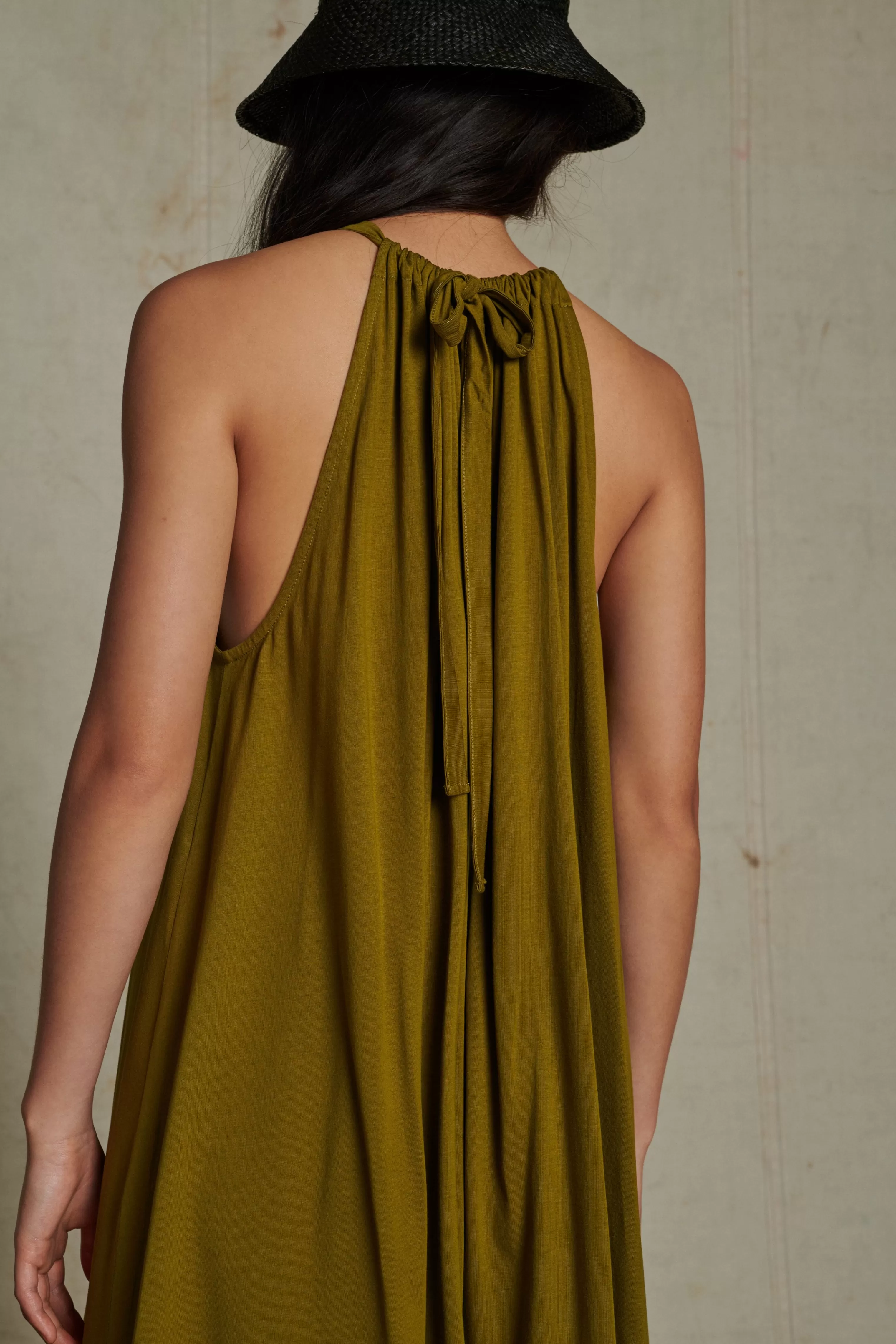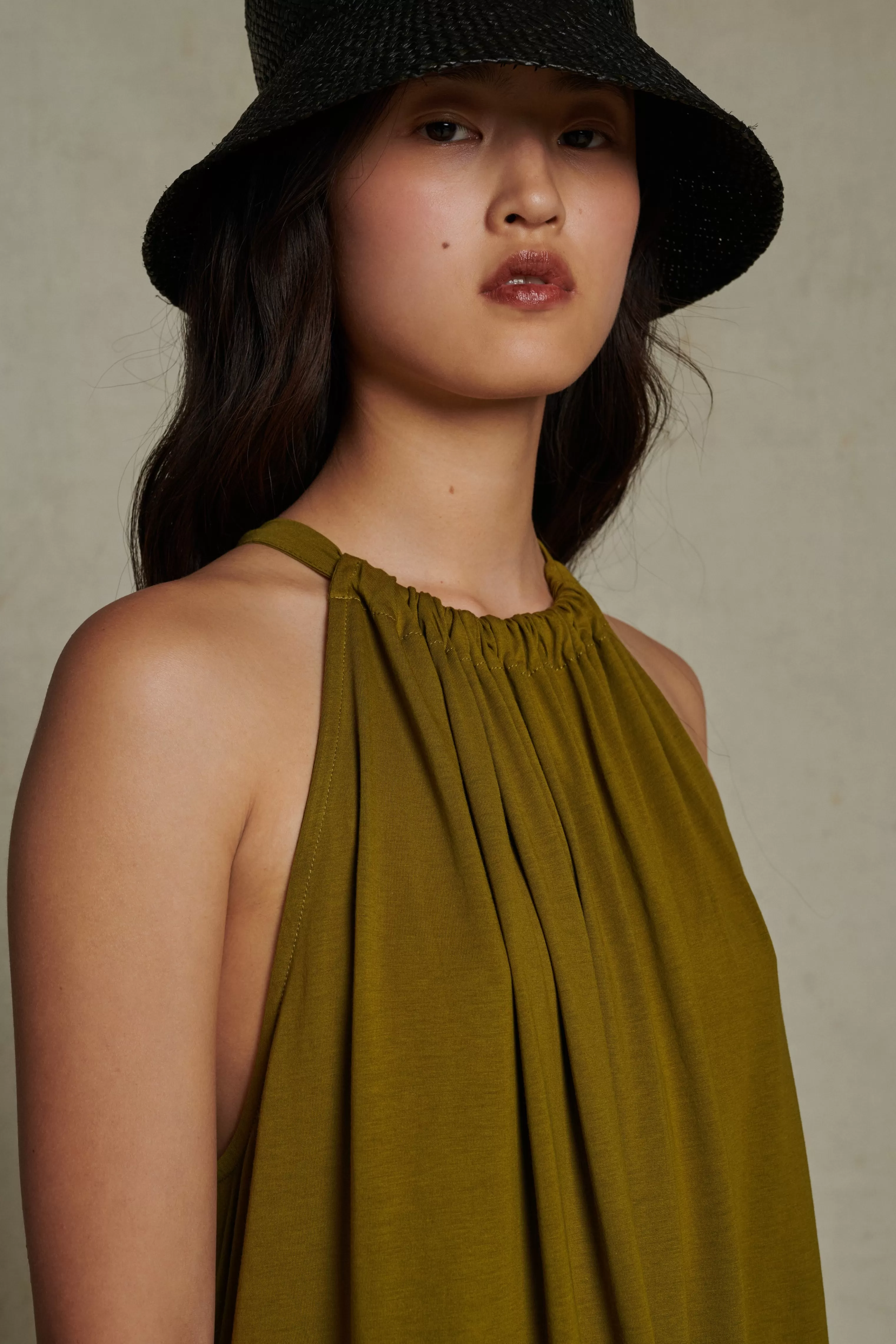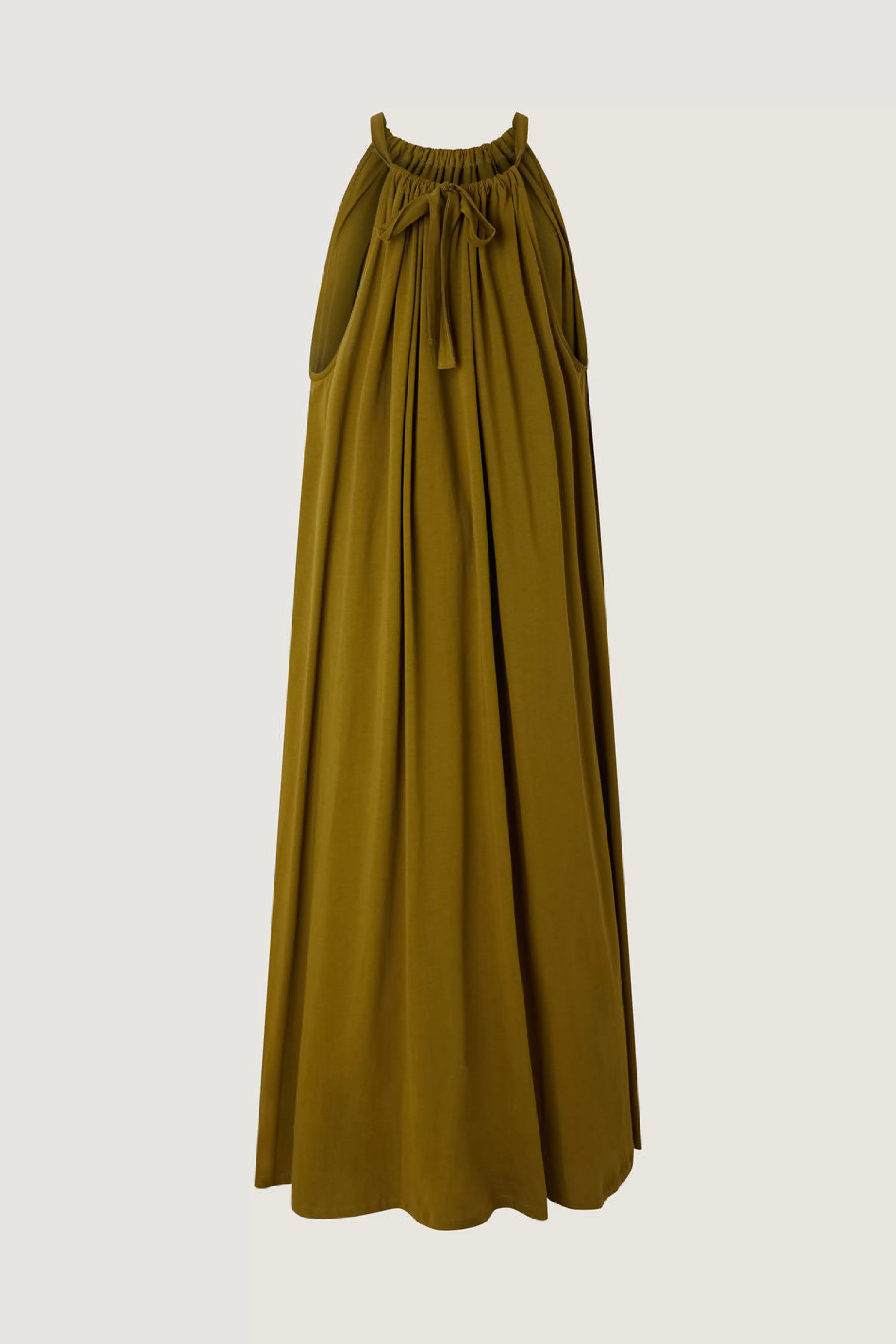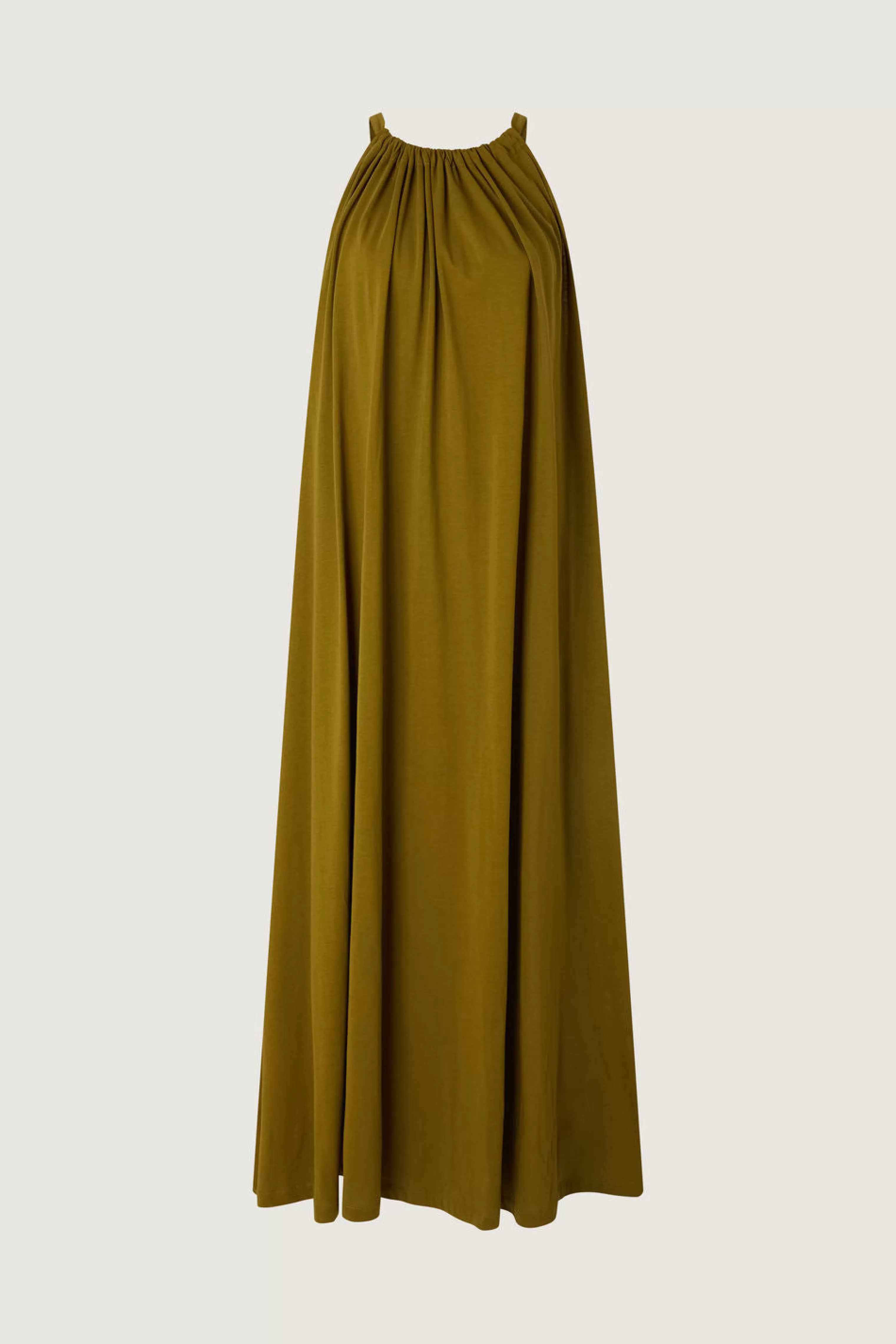 Robe longue froncée à bretelles en coton supima extra fin kaki