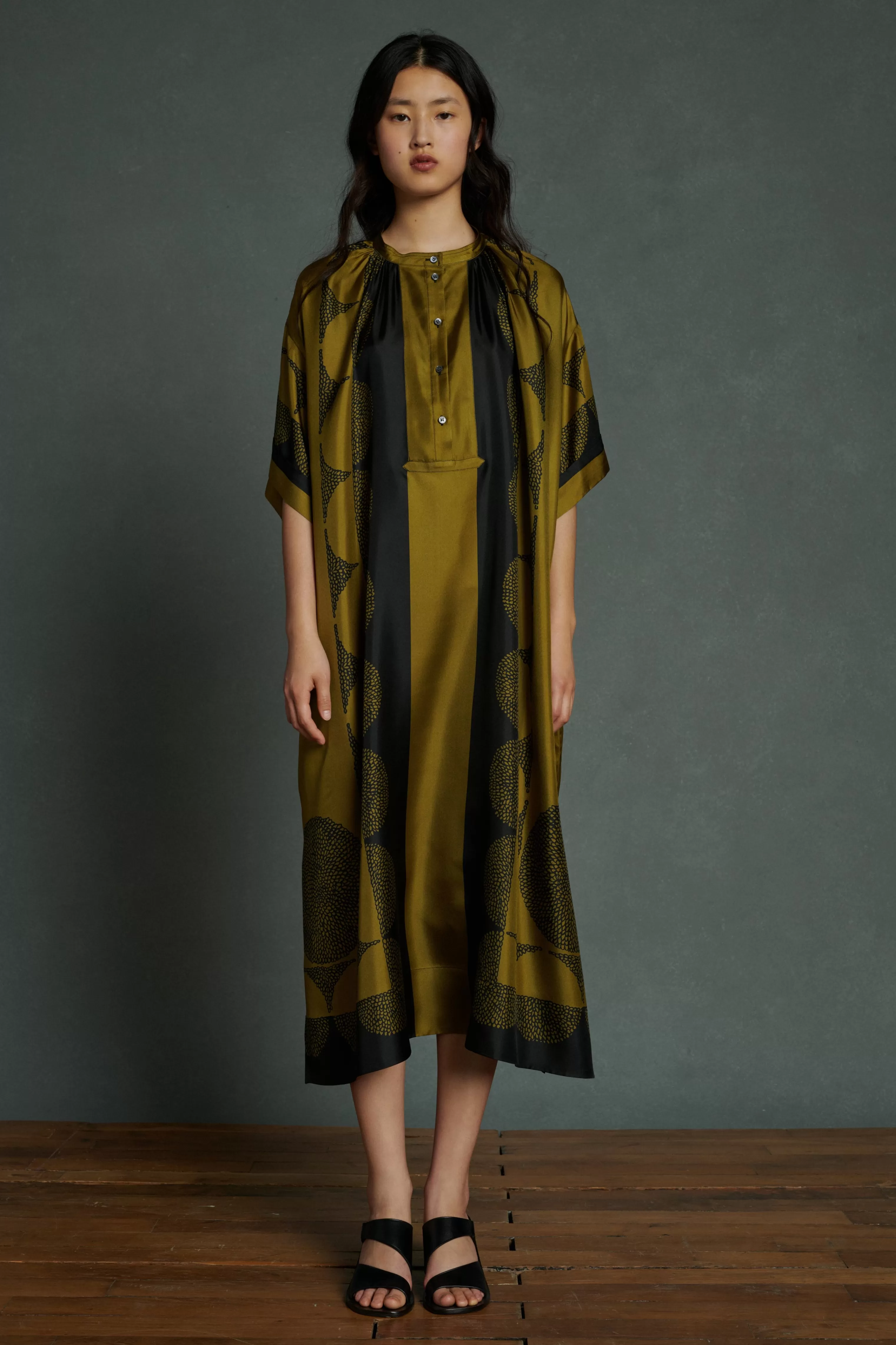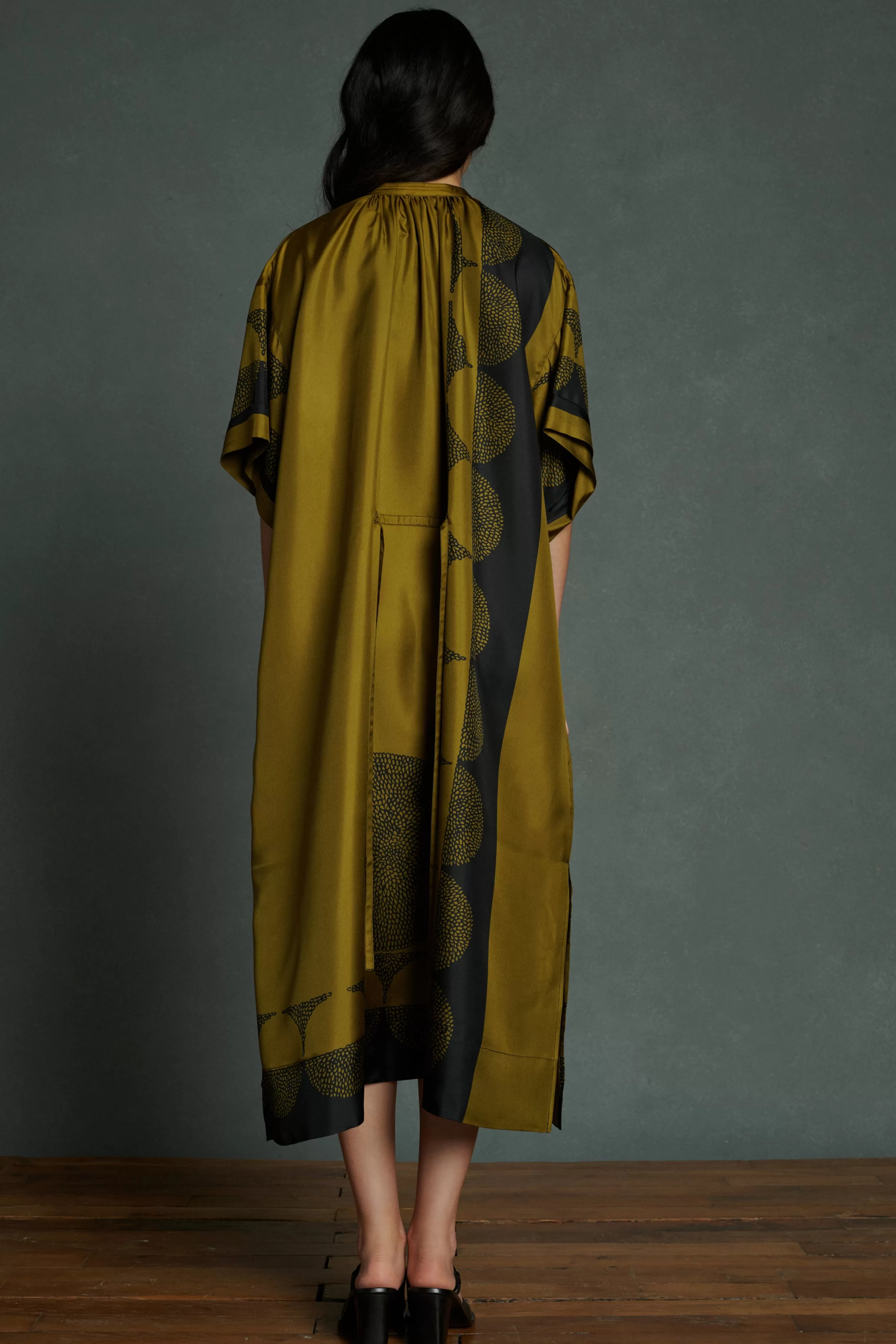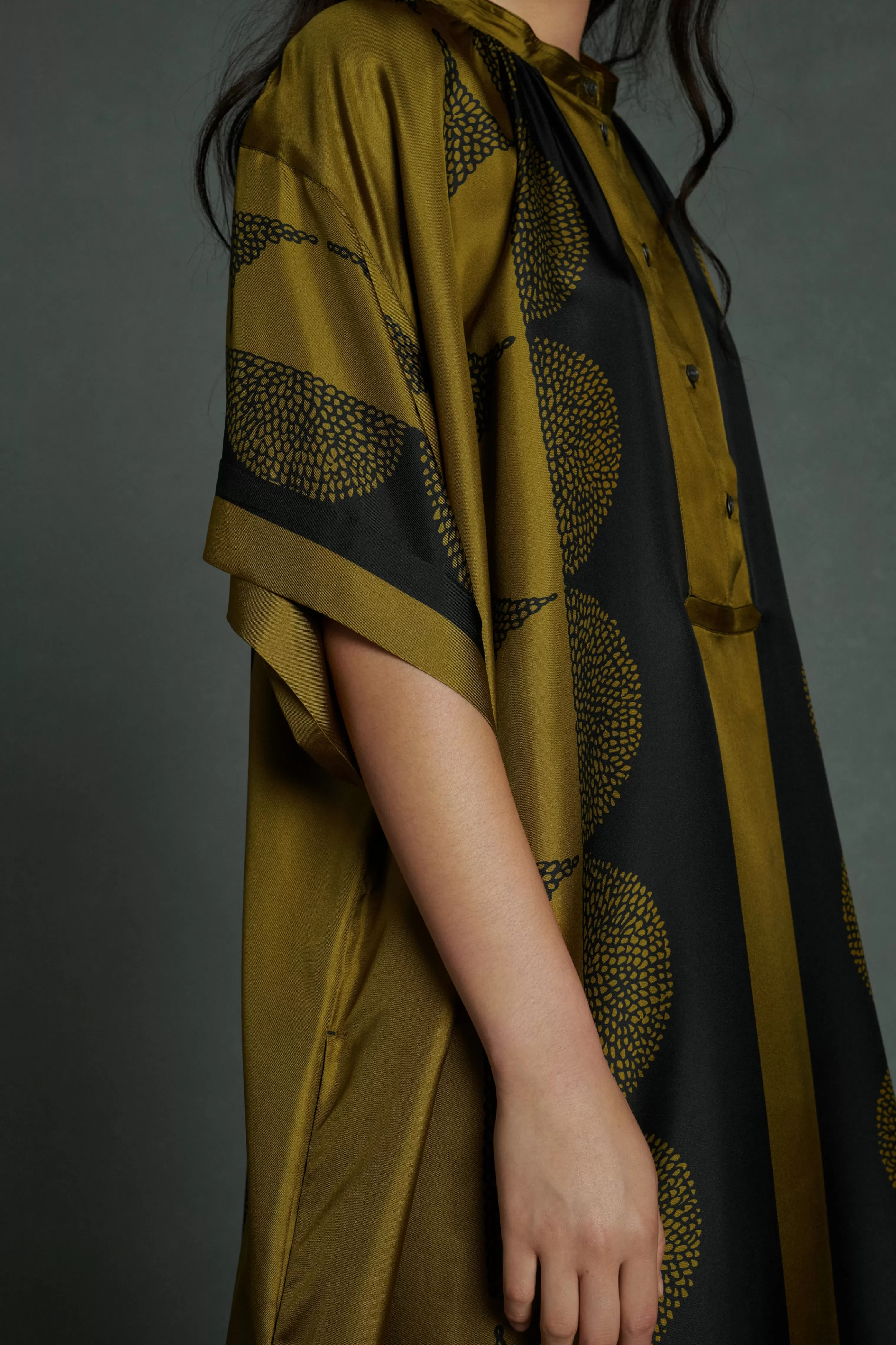 Robe longue à manches courtes en twill de soie imprimé « Pochoir »