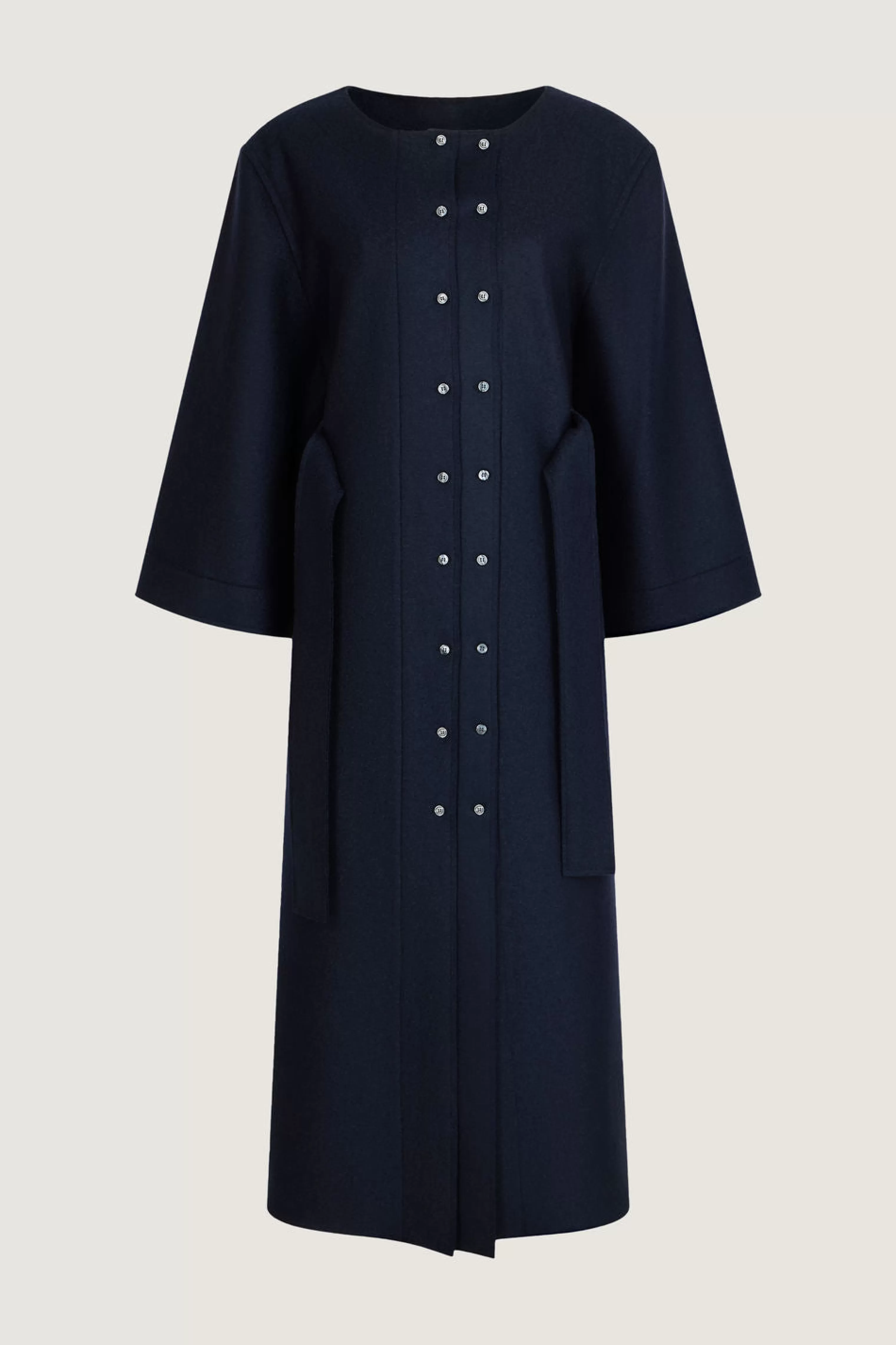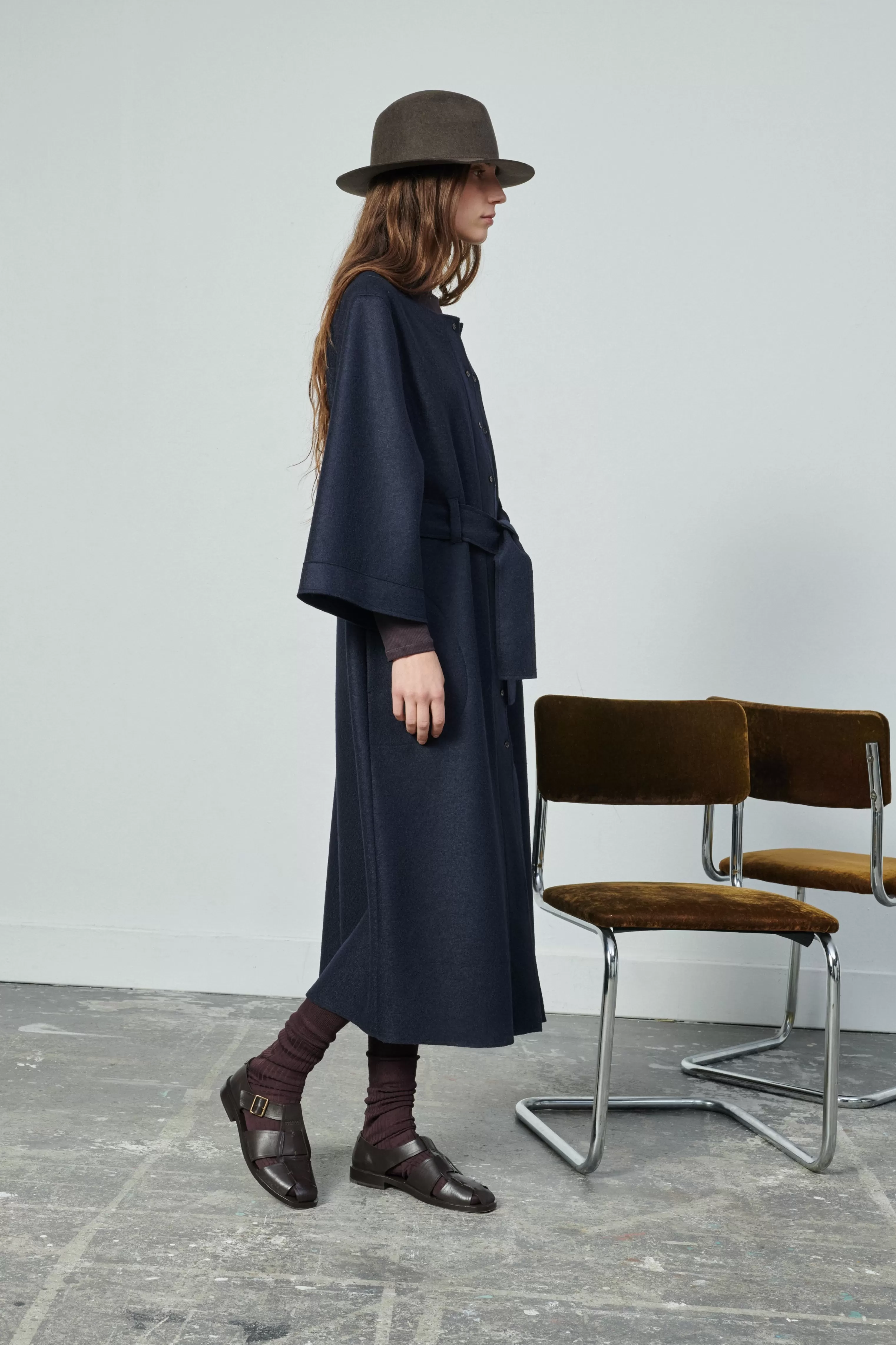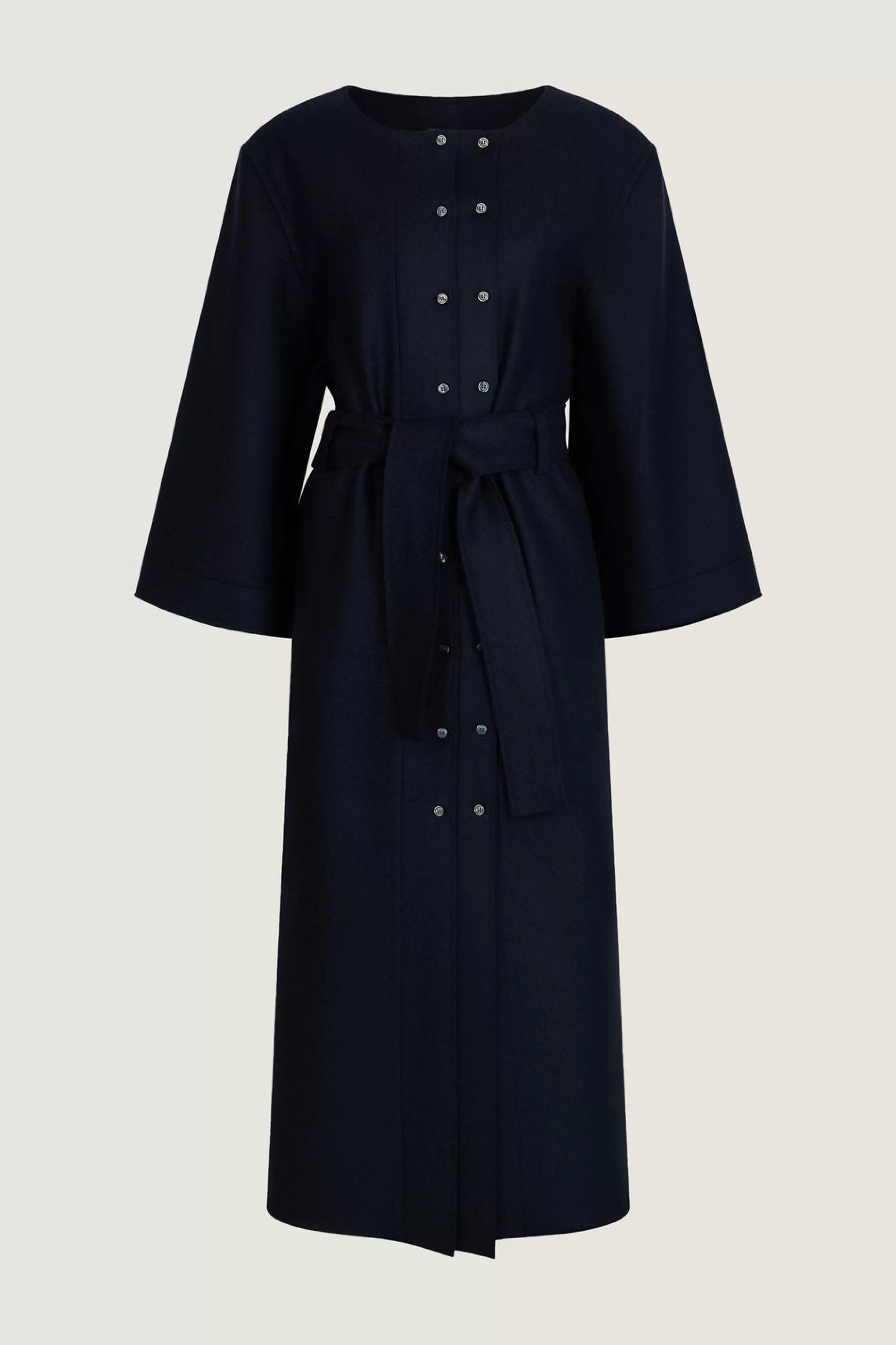 Robe en laine bouillie – Robe longue, coupe ample, ceinturée– Encolure ronde avec empiècement– Ouverture double patte de boutonnage devant– Manches 3/4 larges avec poignets à revers– Poches insérées dans les coutures côtés– Ceinture amovible Cette pièce est certifiée OEKO-TEX Standard 100.