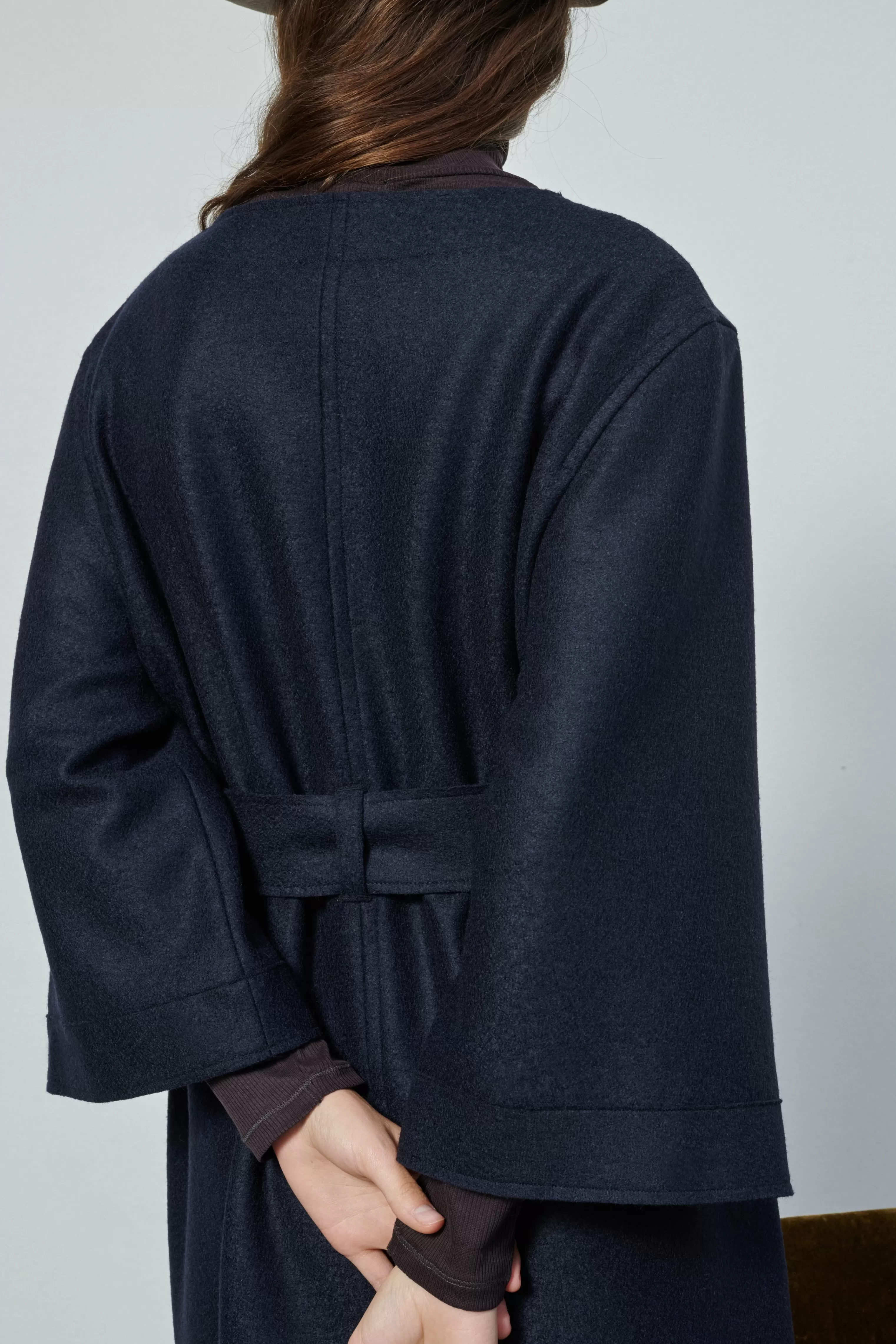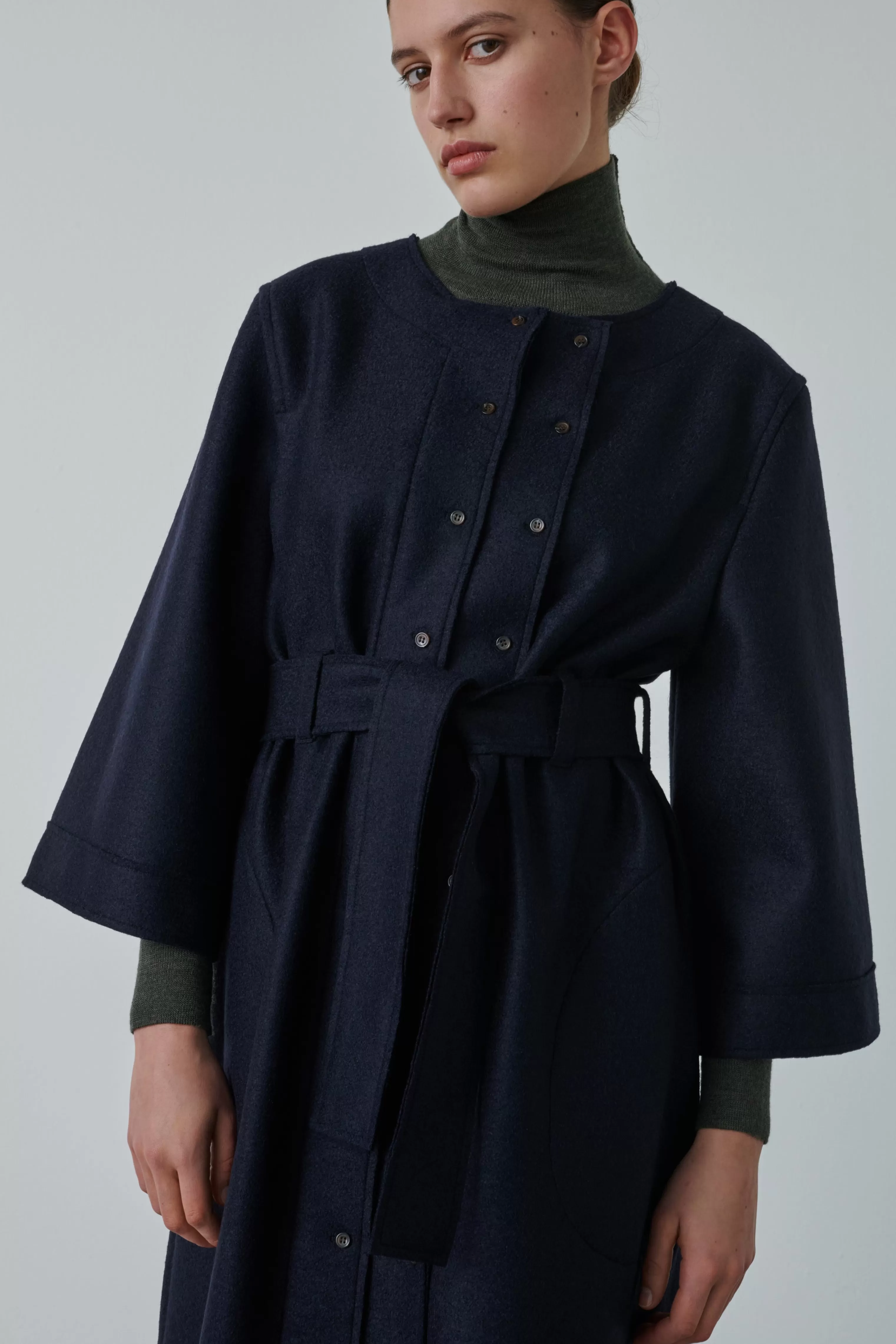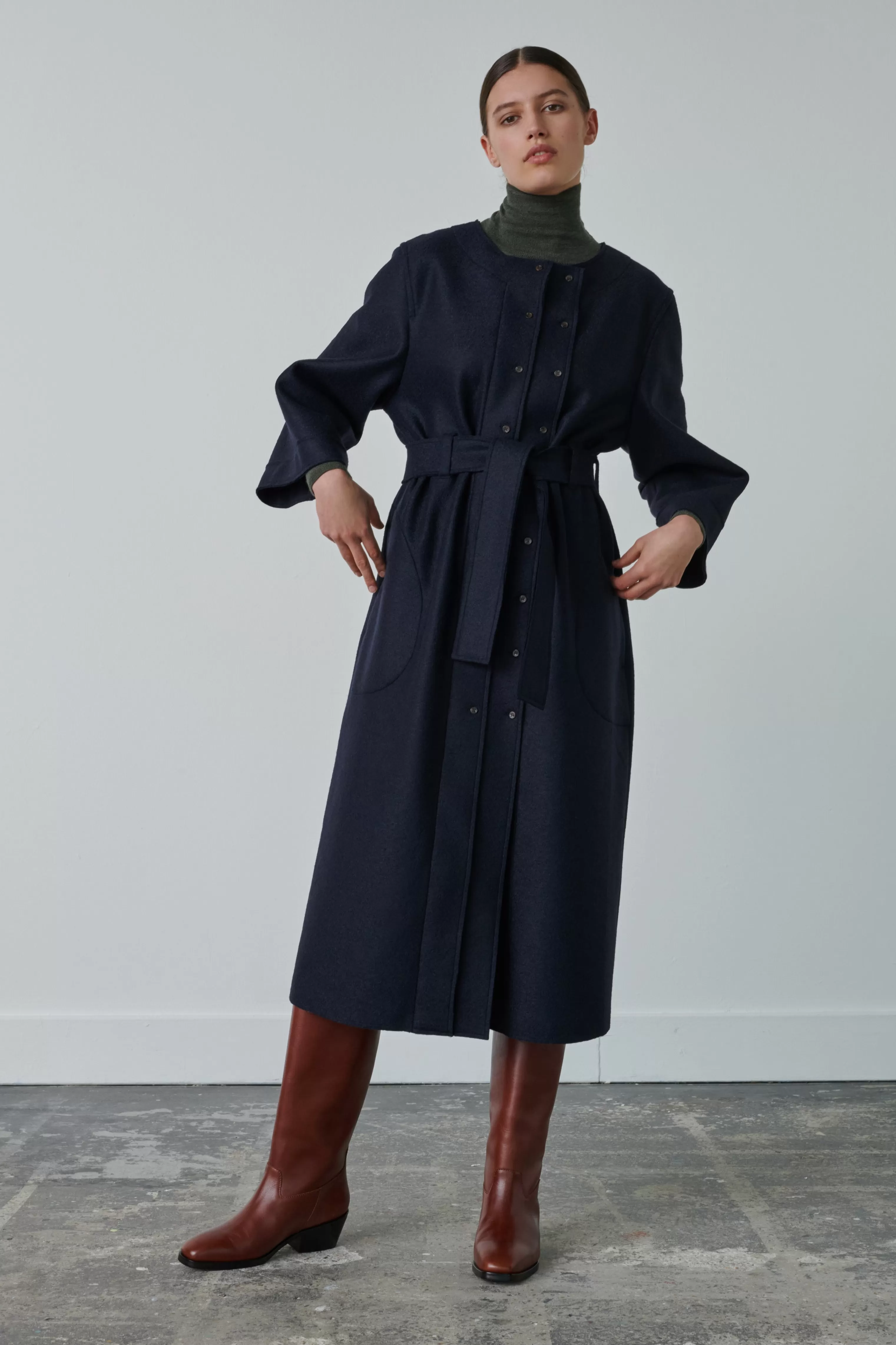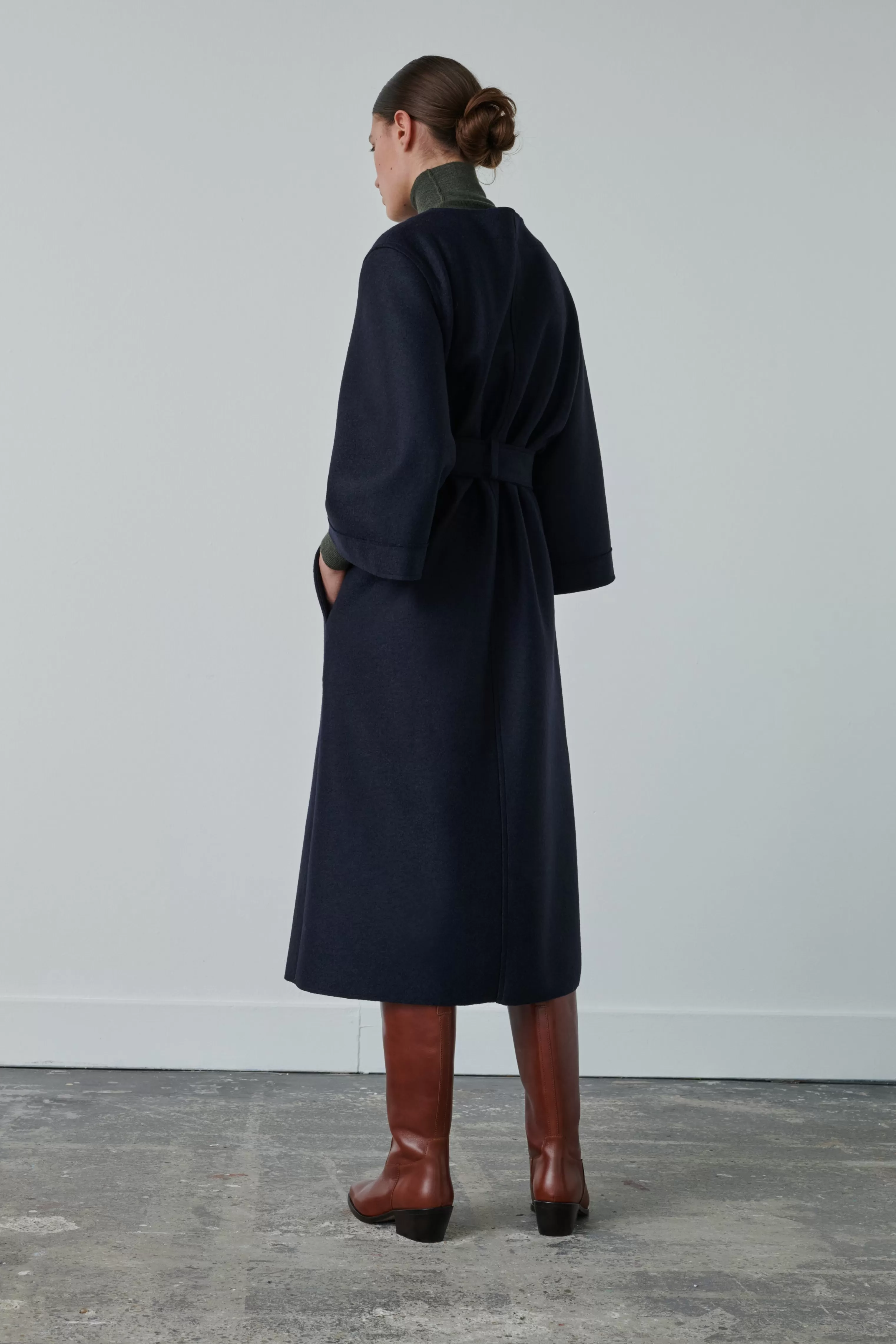 Robe en laine bouillie – Robe longue, coupe ample, ceinturée– Encolure ronde avec empiècement– Ouverture double patte de boutonnage devant– Manches 3/4 larges avec poignets à revers– Poches insérées dans les coutures côtés– Ceinture amovible Cette pièce est certifiée OEKO-TEX Standard 100.