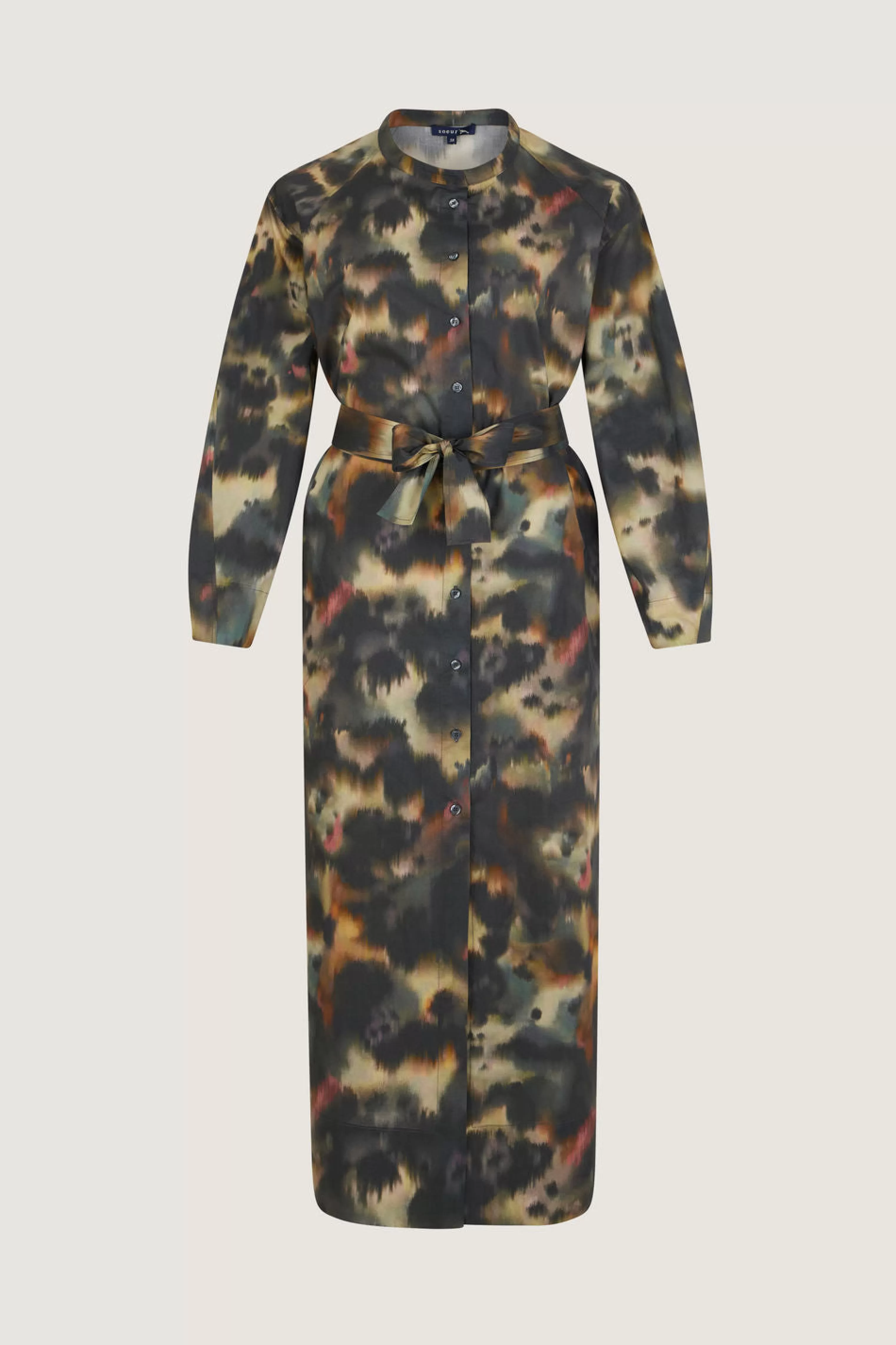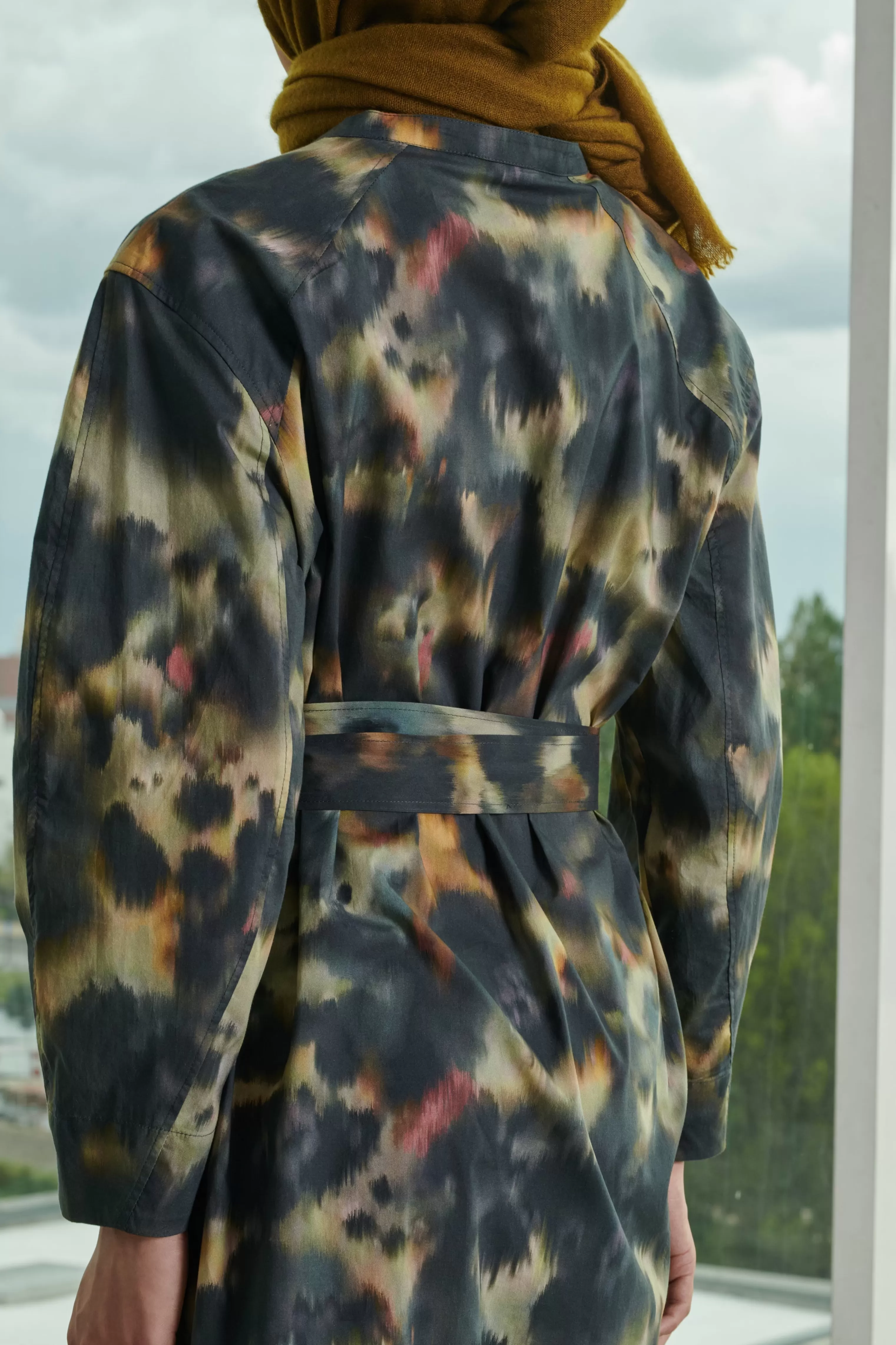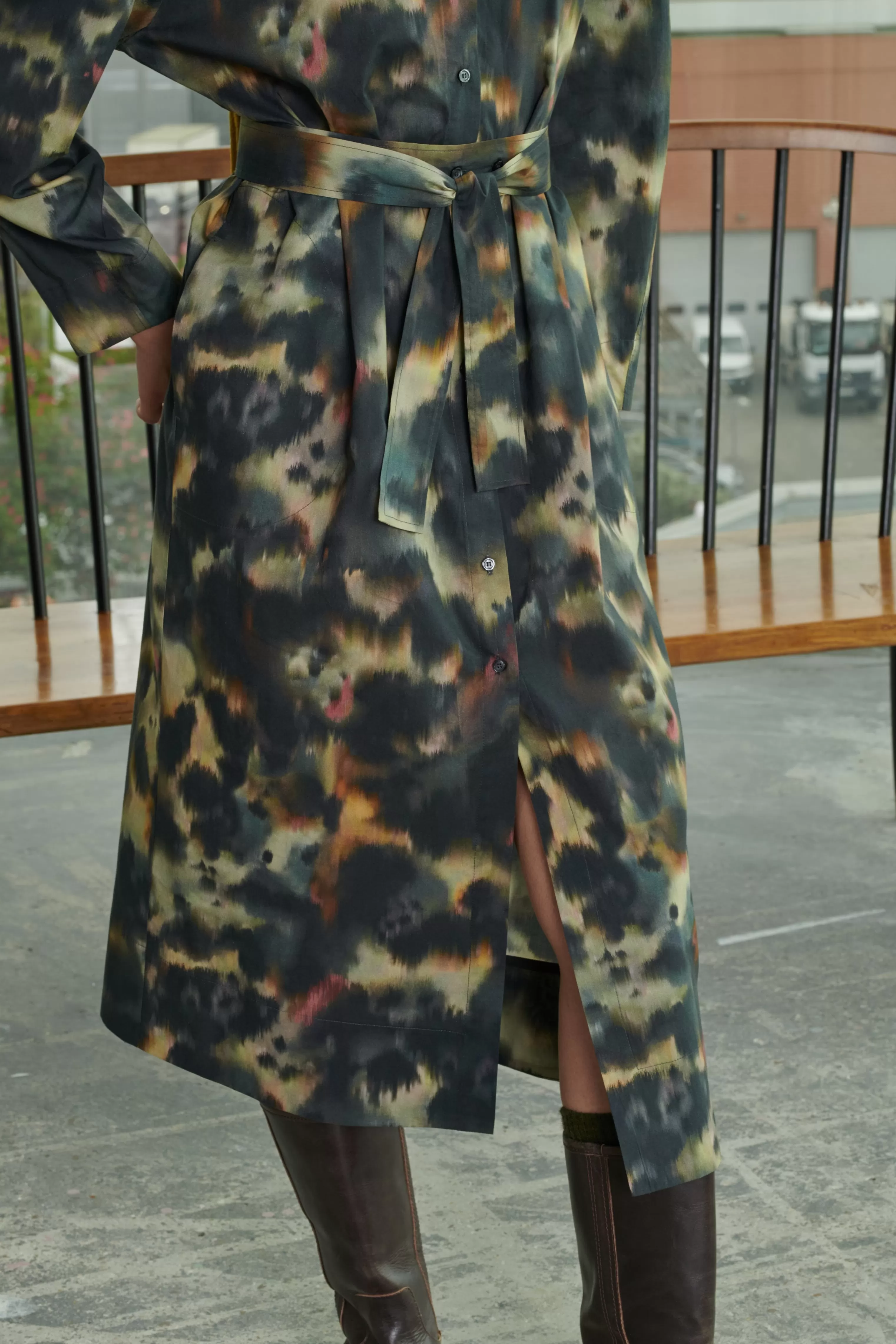 Robe en popeline de coton imprimée – Coupe longue et volume droit, se porte avec ou sans ceinture– Manches amples– Ouverture boutonnée devant– Ceinture amovible