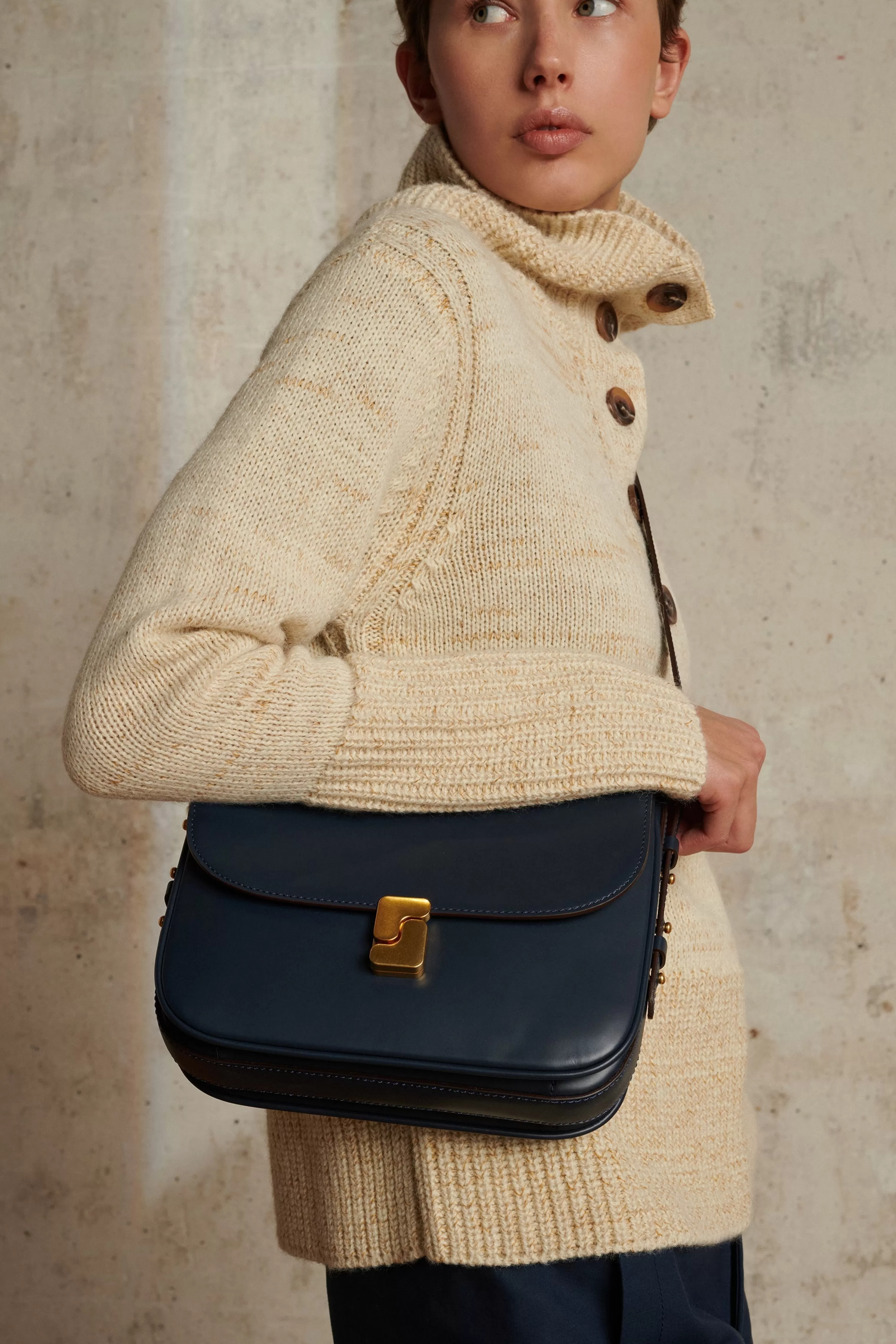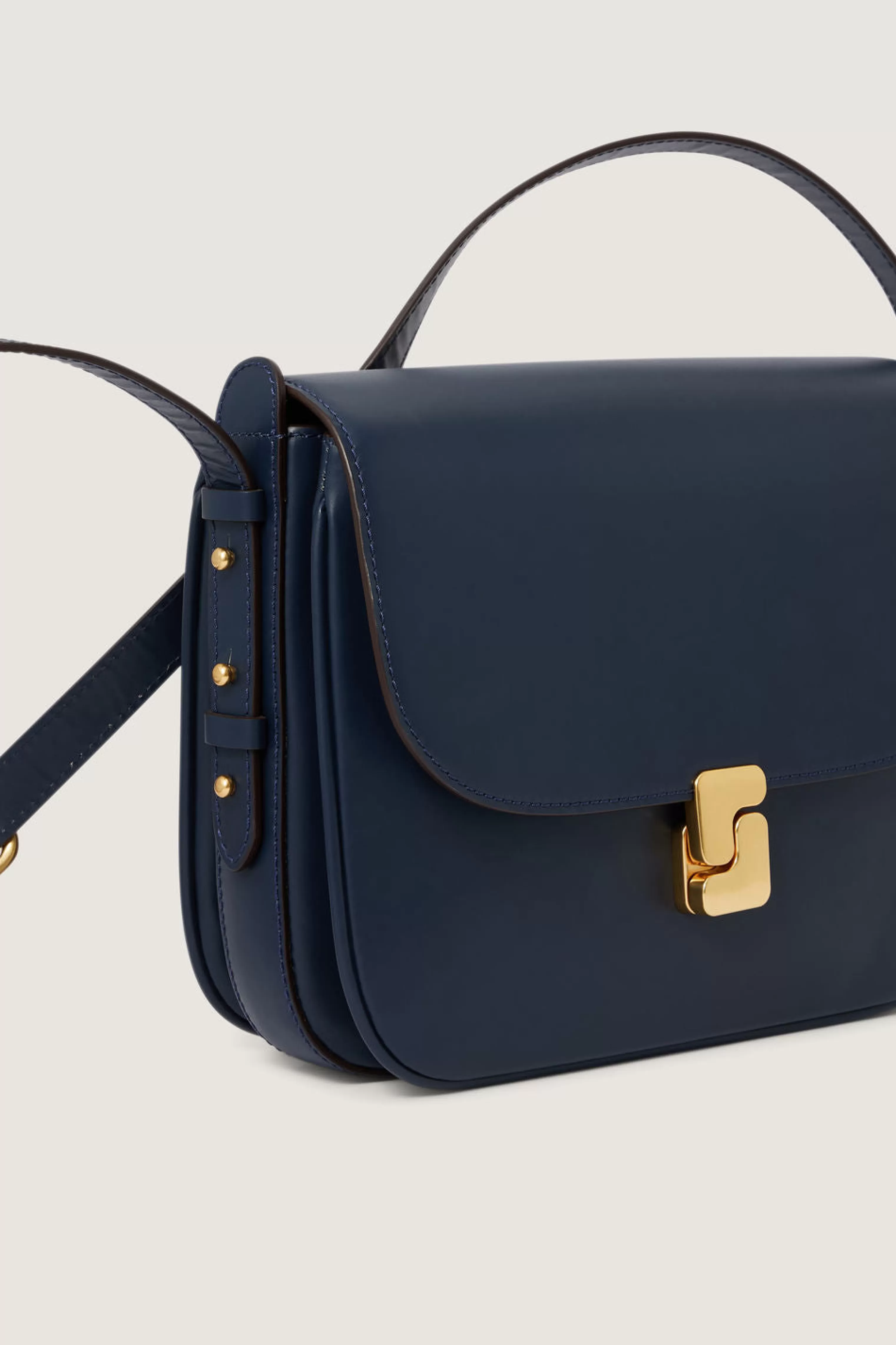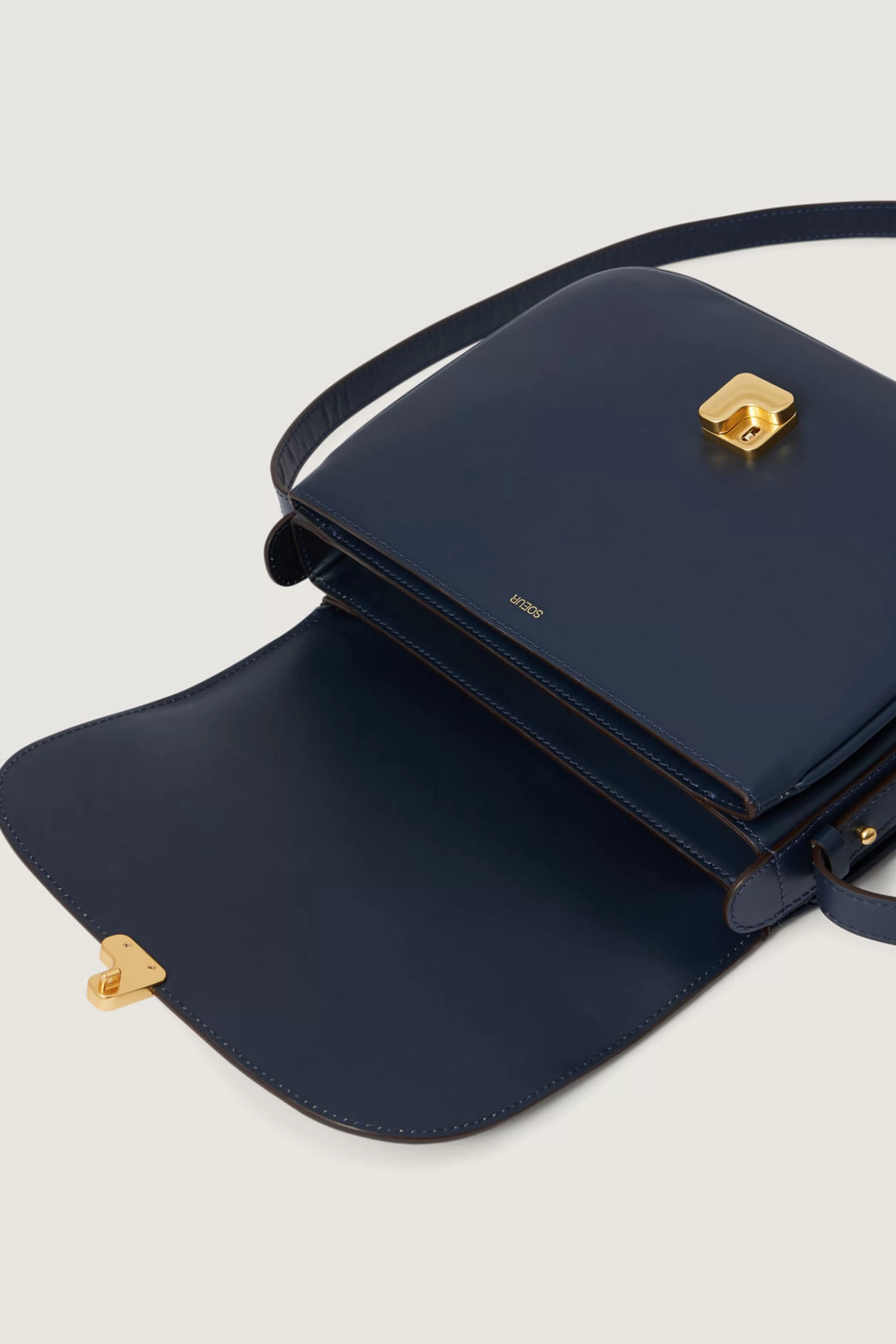 Sac en cuir glacé bleu de prusse avec fermoir monogramme doré