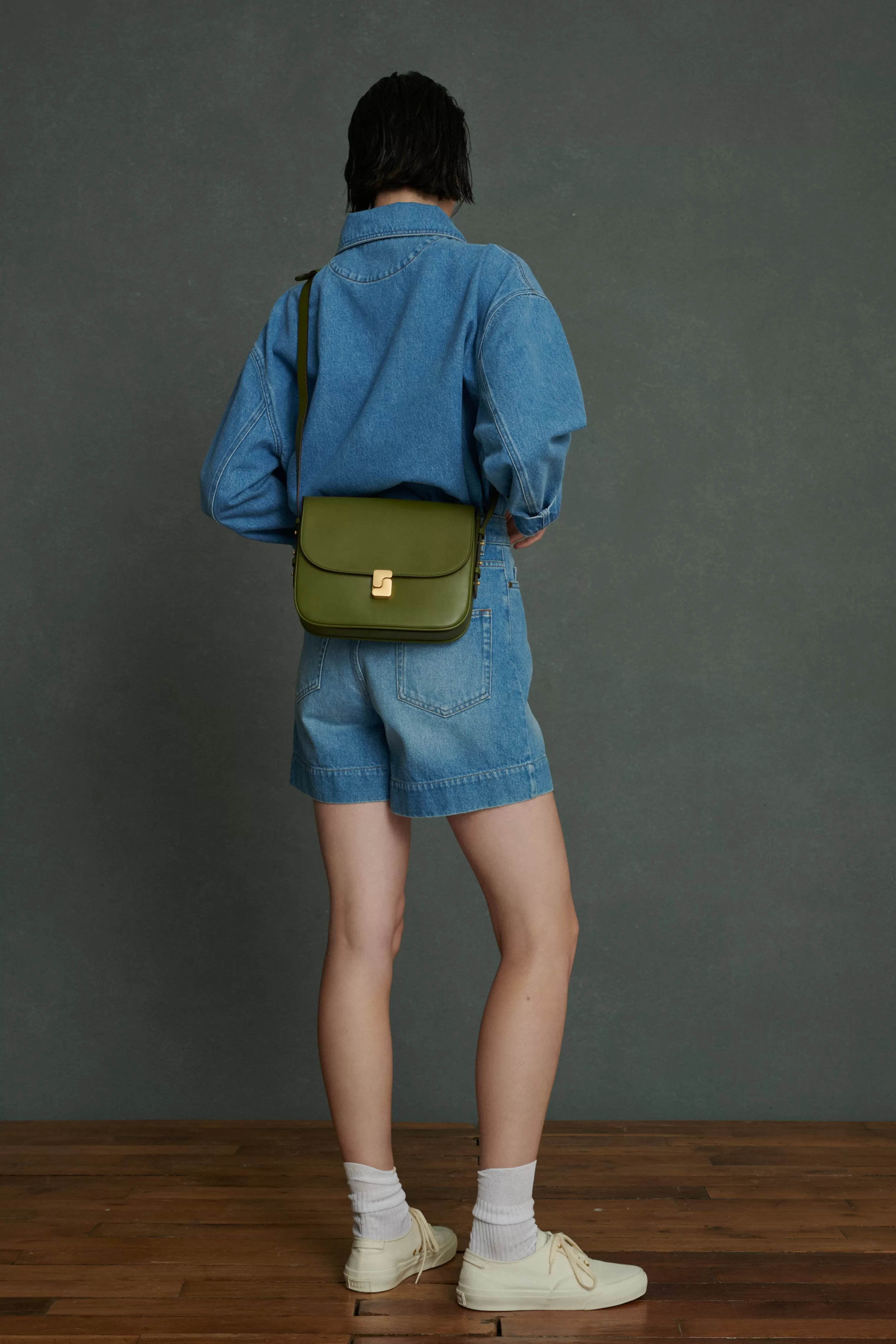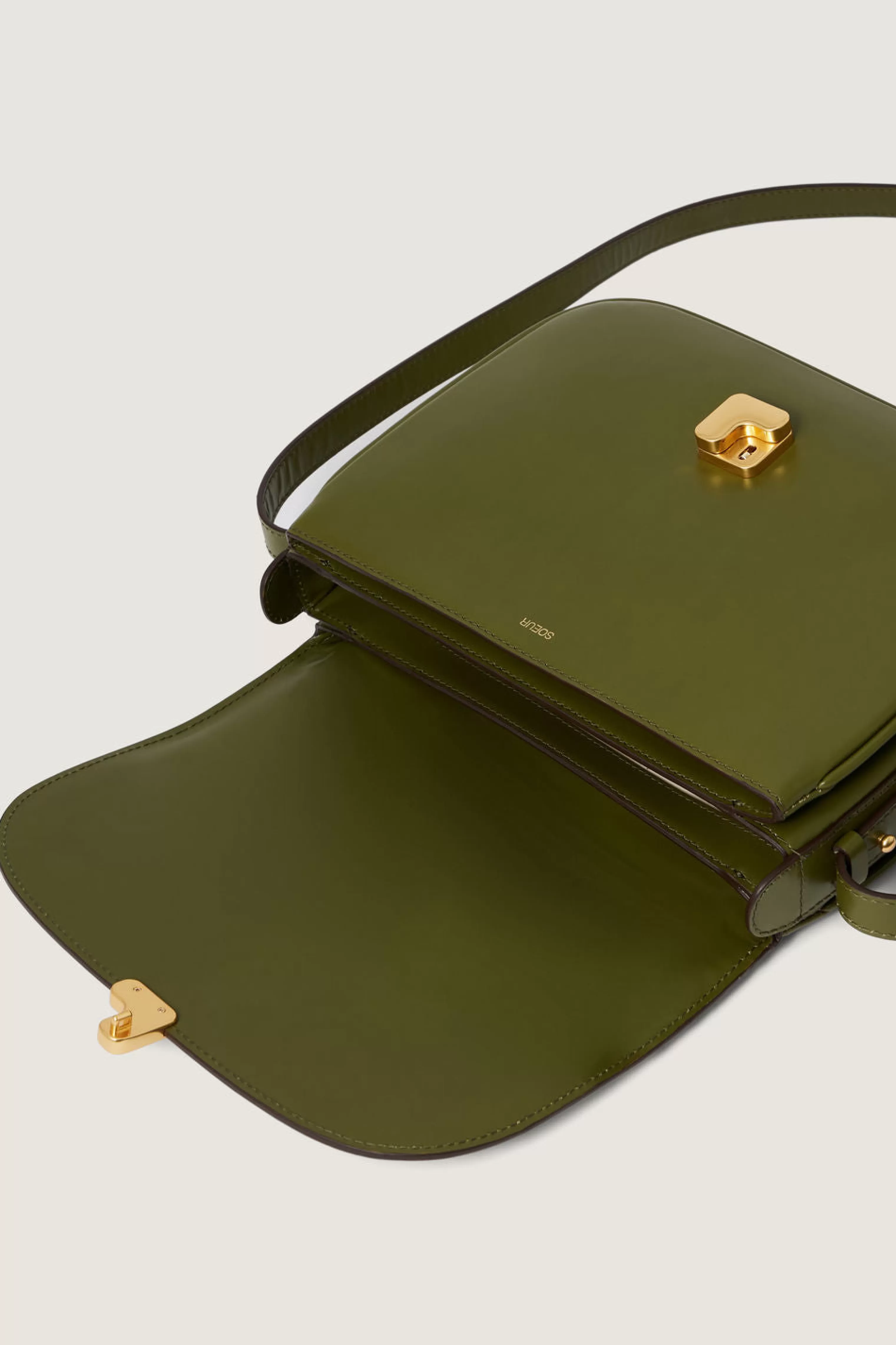 Sac en cuir glacé vert olive avec fermoir monogramme doré