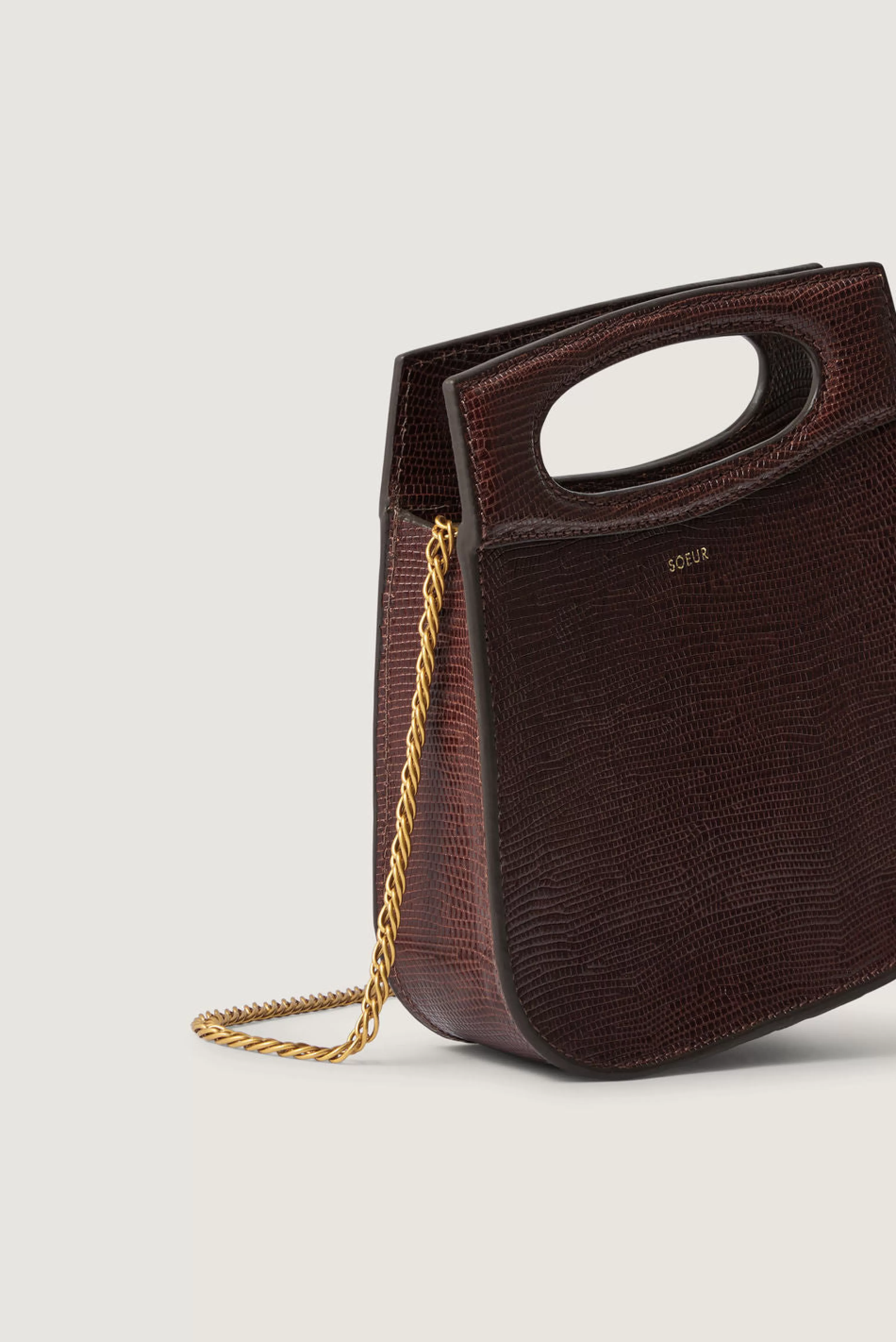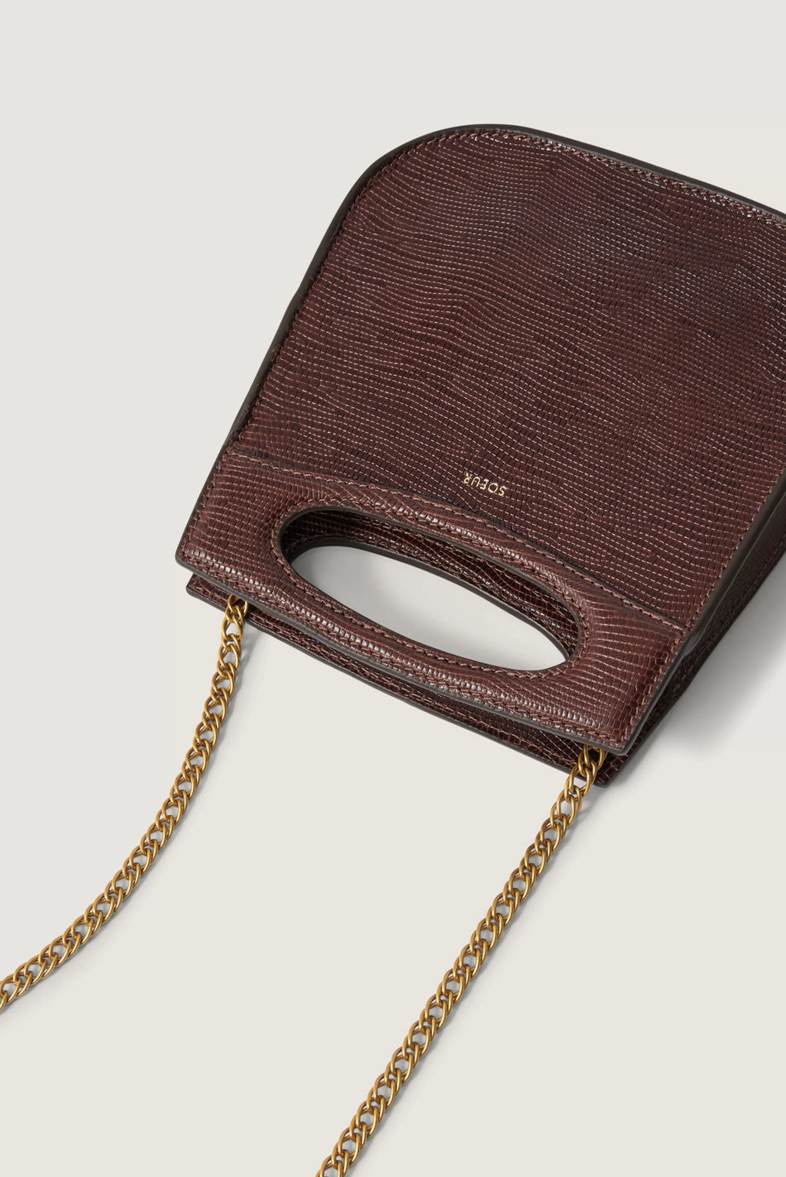 Petit sac en cuir embossé effet lézard chocolat – Sac porté à la main, à l’épaule ou en bandoulière– Une bandoulière en chaîne dorée amovible, longueur 11,5cm– Métallerie dorée– Hauteur 20cm, largeur 17cm, profondeur 4,5cm– Cuir LWG