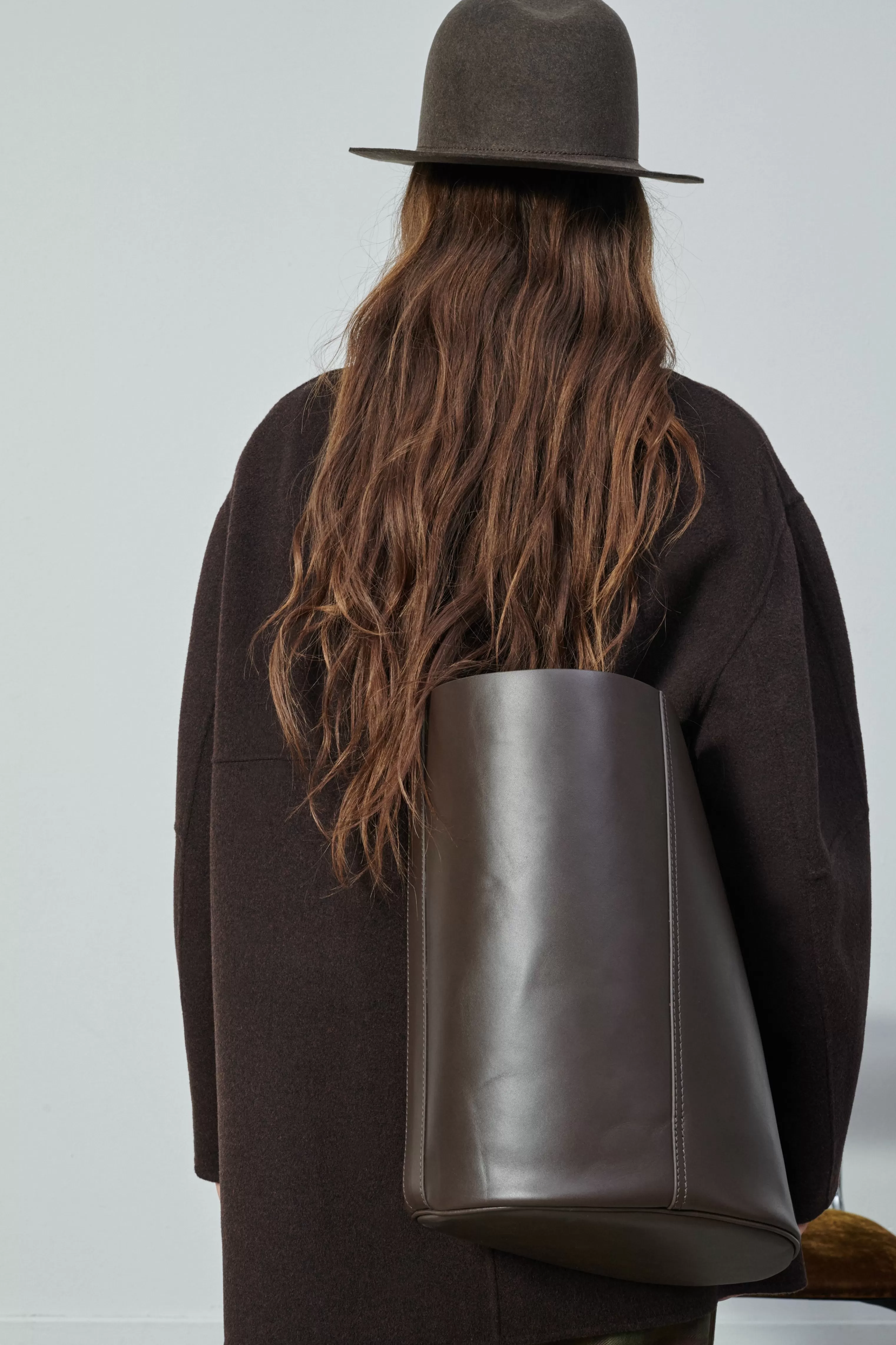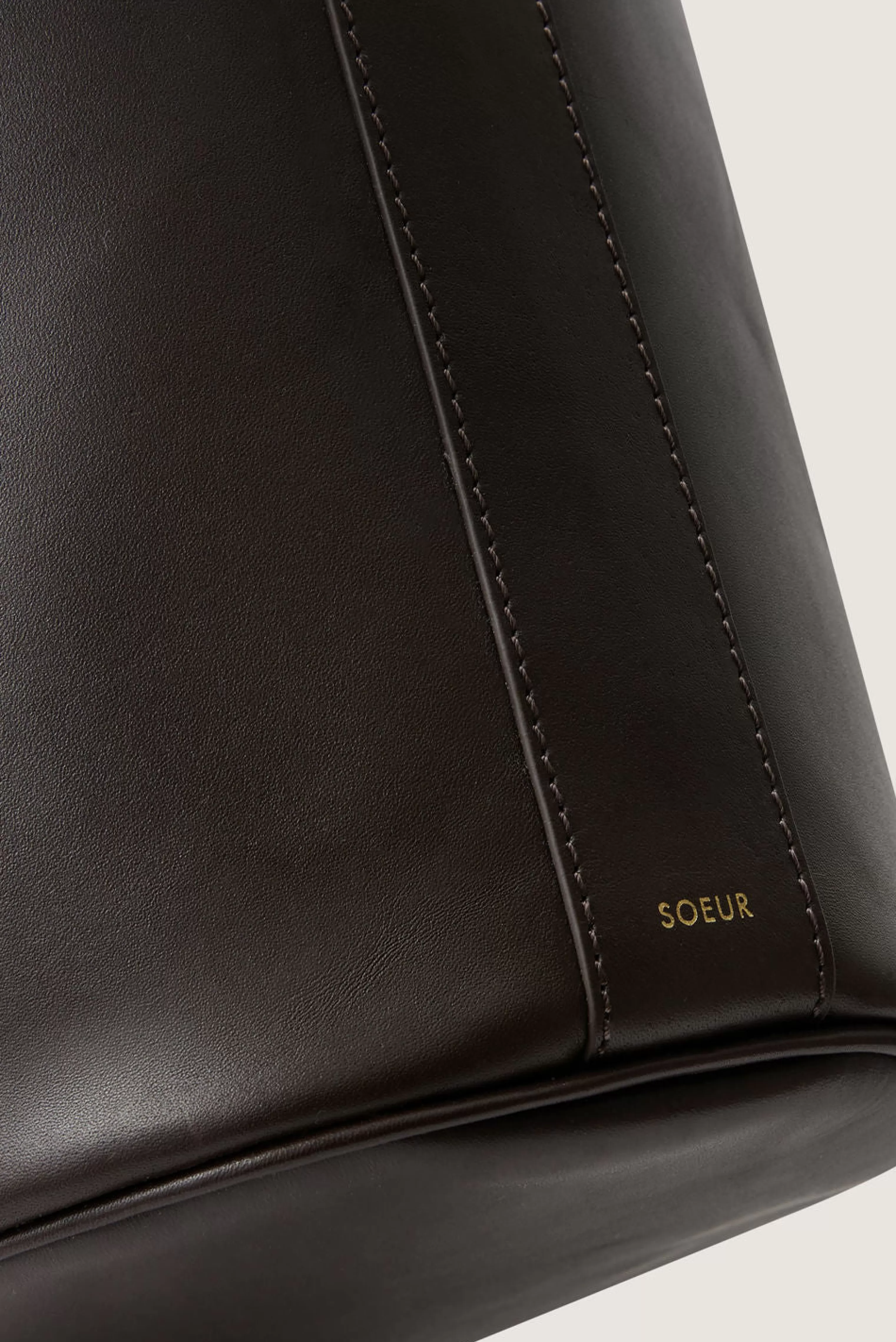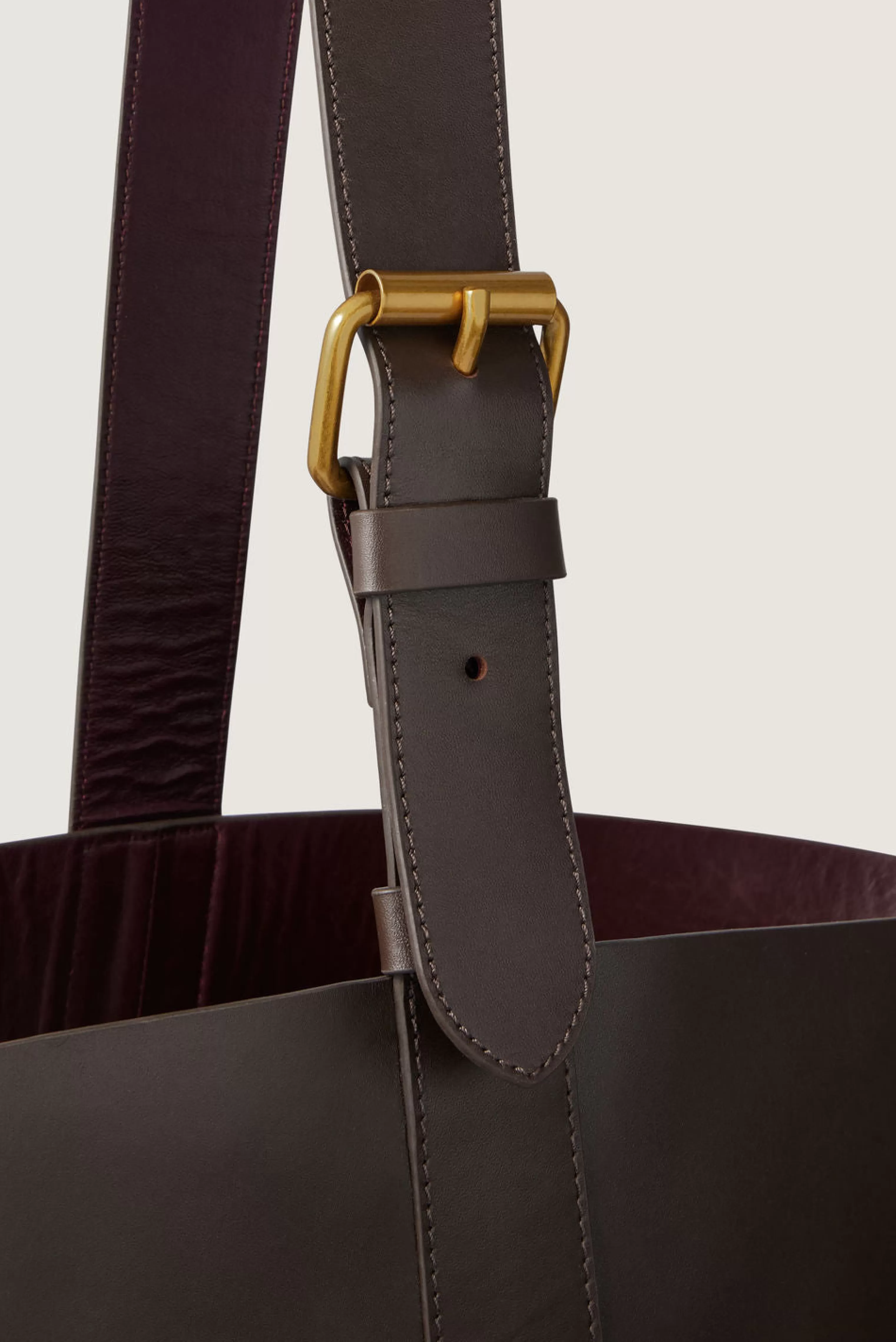 Grand sac seau en cuir souple charbon et prune – Sac seau en cuir bicolore, extérieur charbon et intérieur prune– Longueur de anse ajustable par une boucle en métal doré– Base ovale 27cm x 19cm– Hauteur 35cm, circonférence 94cm– Doublure cuir d’agneau– Métallerie dorée– Cuir LWG