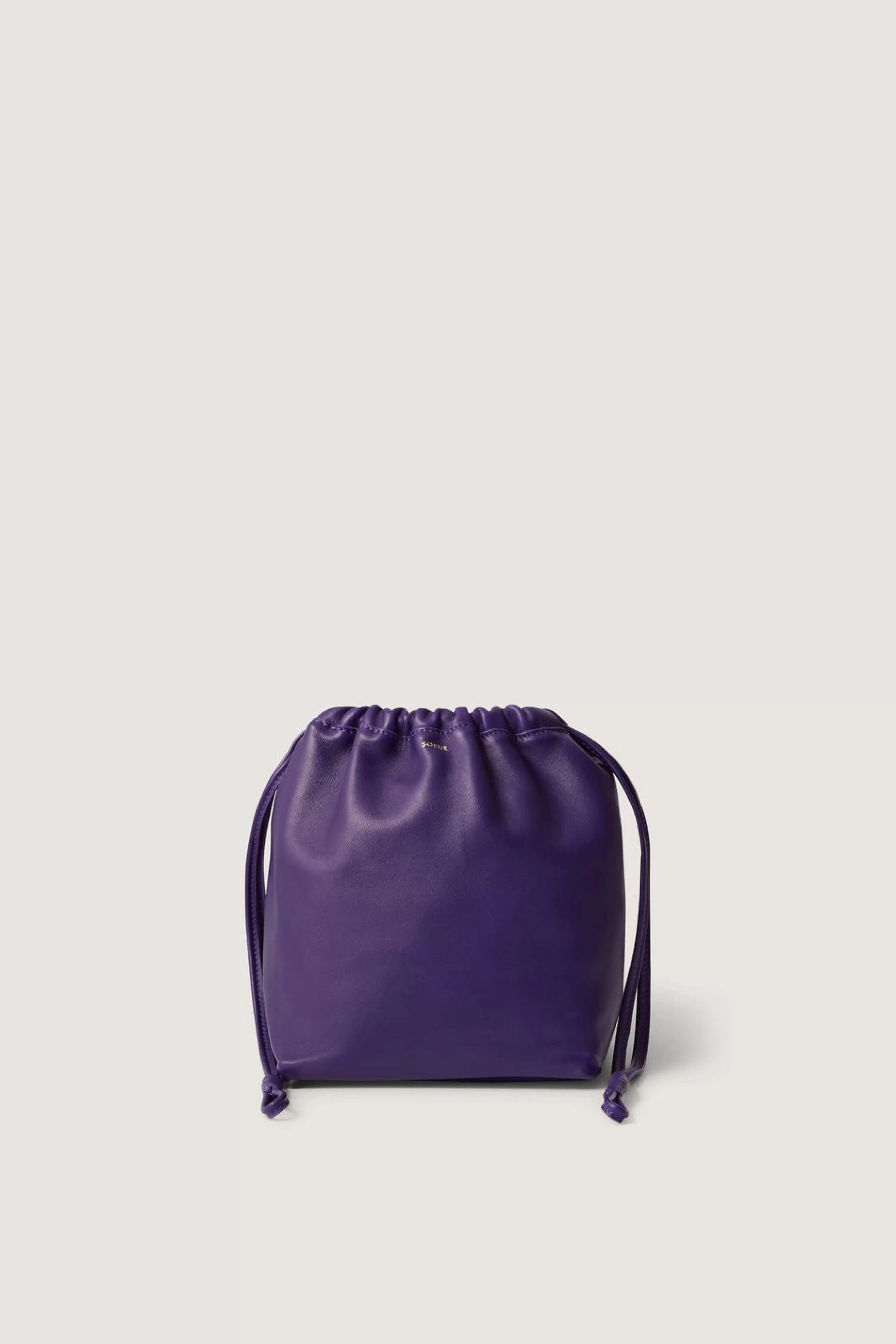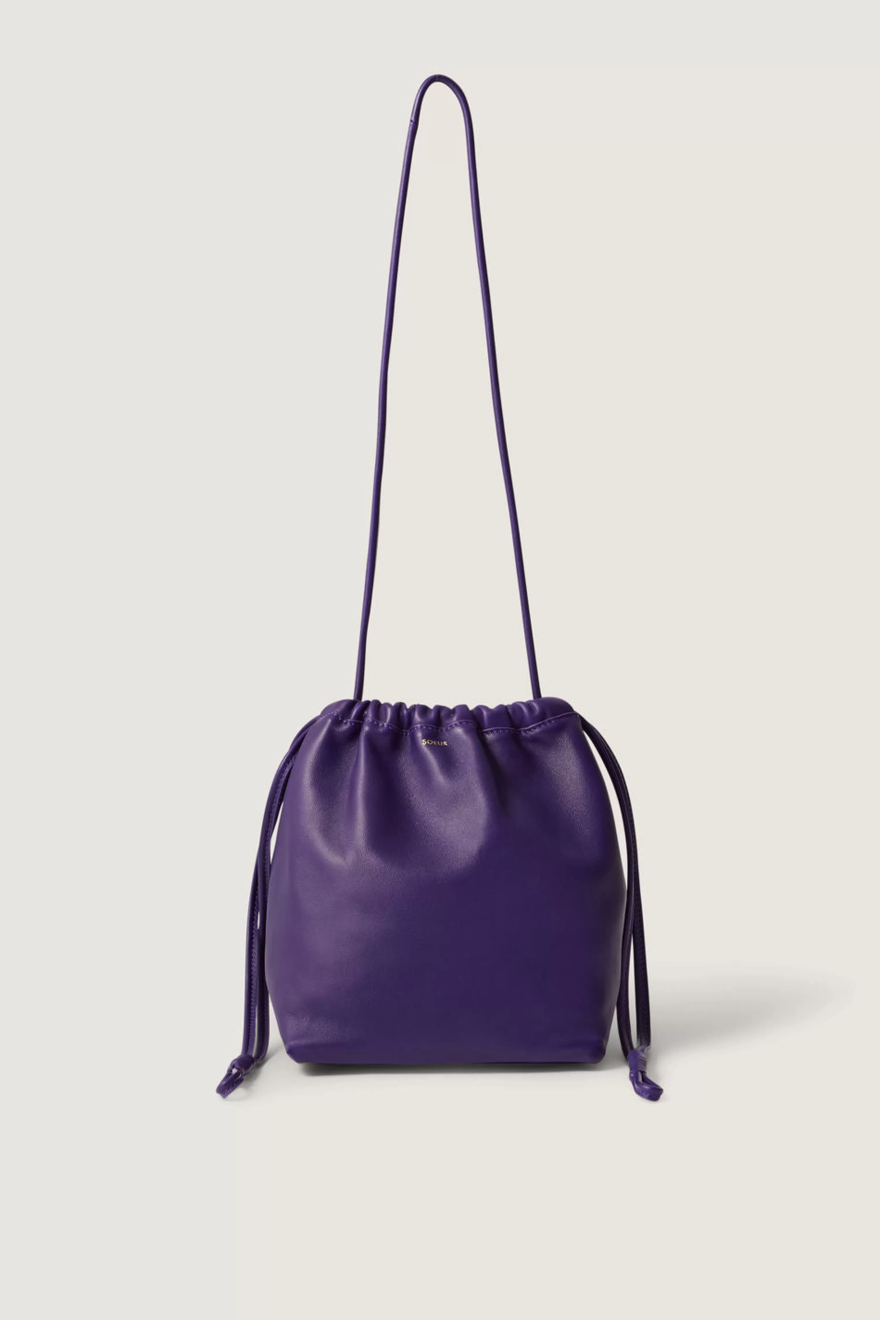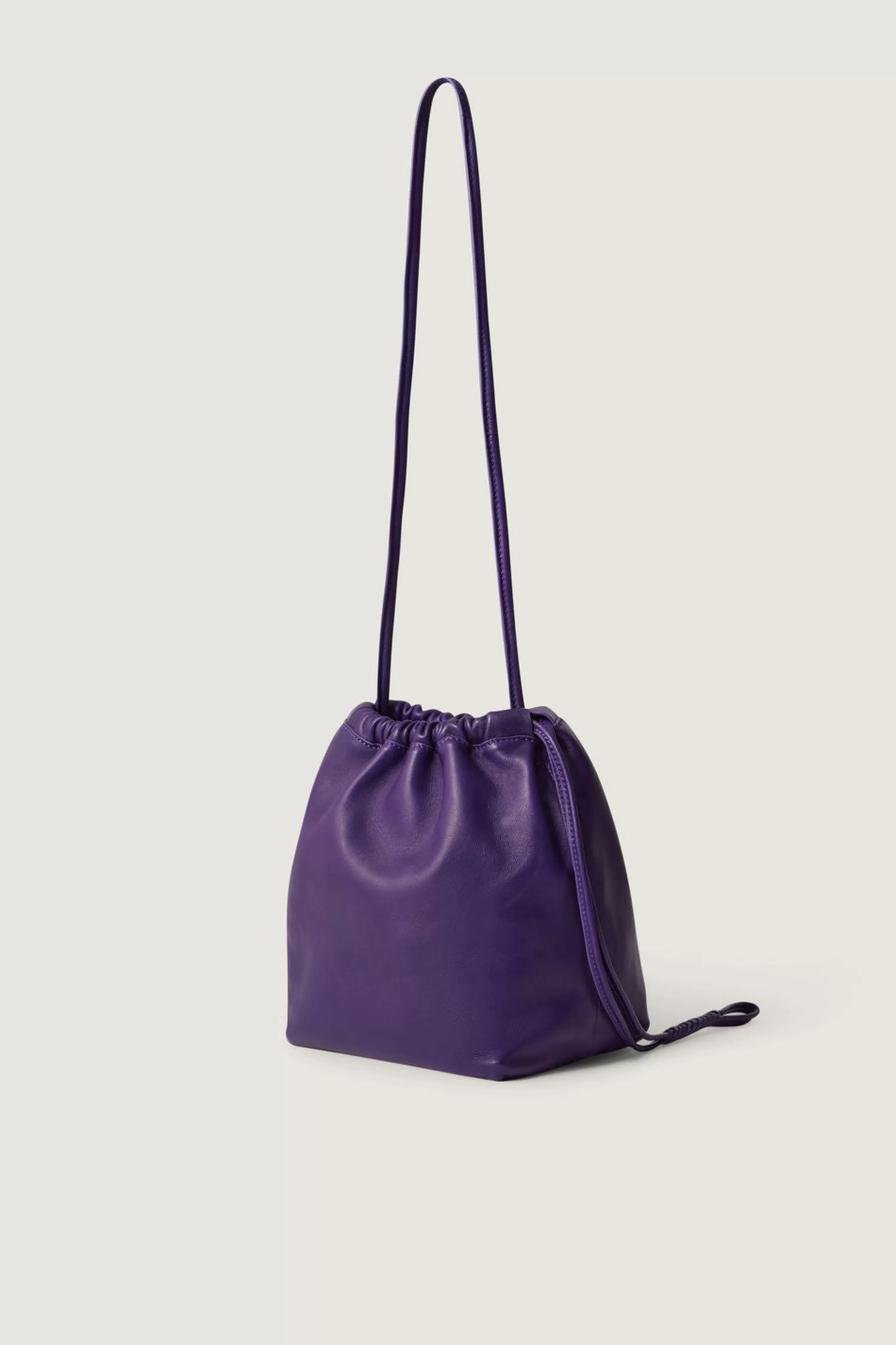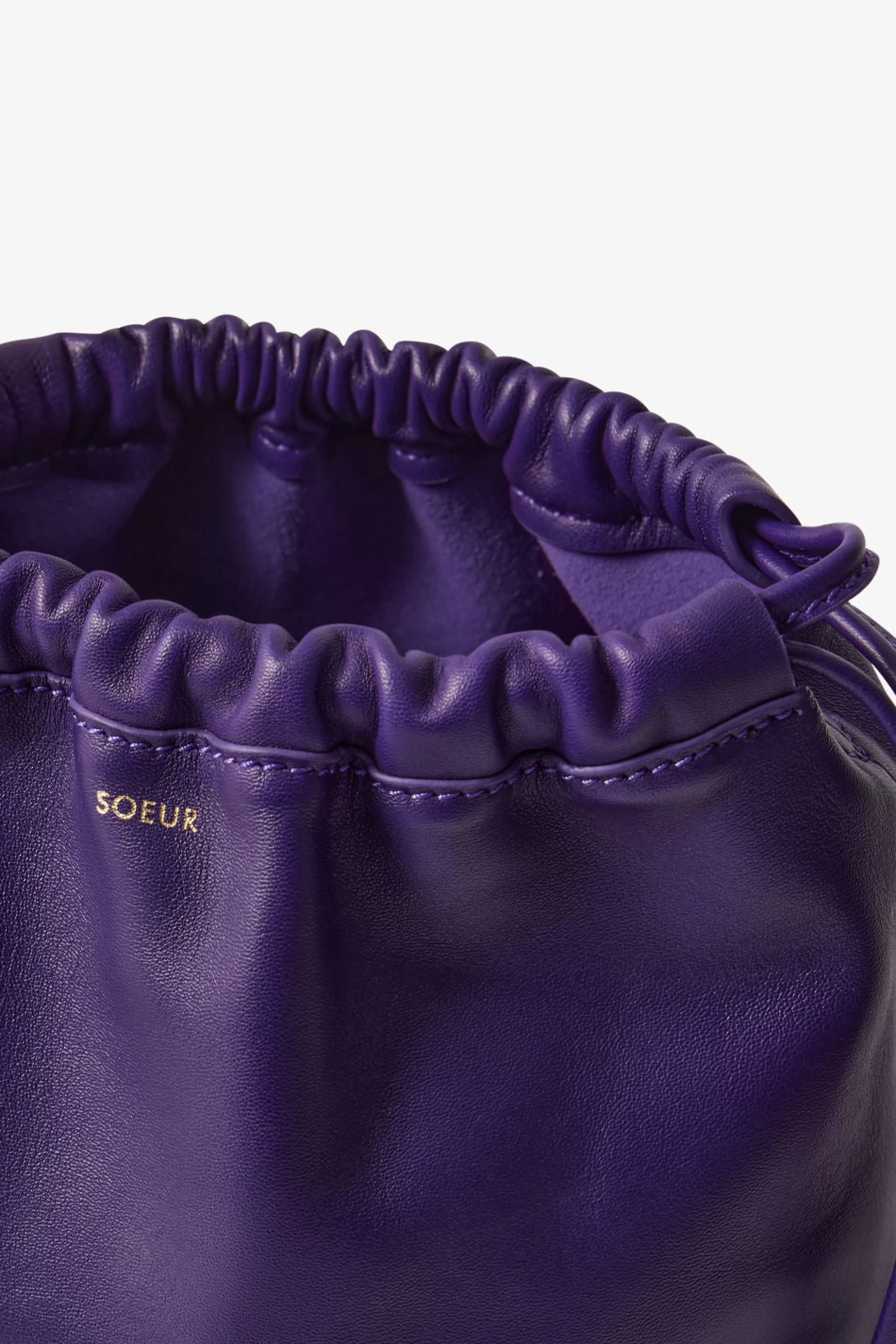 Sac pochon en cuir souple violet – Pochon à porter à la main ou à l’épaule– Base rectangulaire 13,5cm x 15,5cm– Hauteur 21,5cm, Largeur 15,5cm– Longeur bandoulière 74cm – Cuir LWG