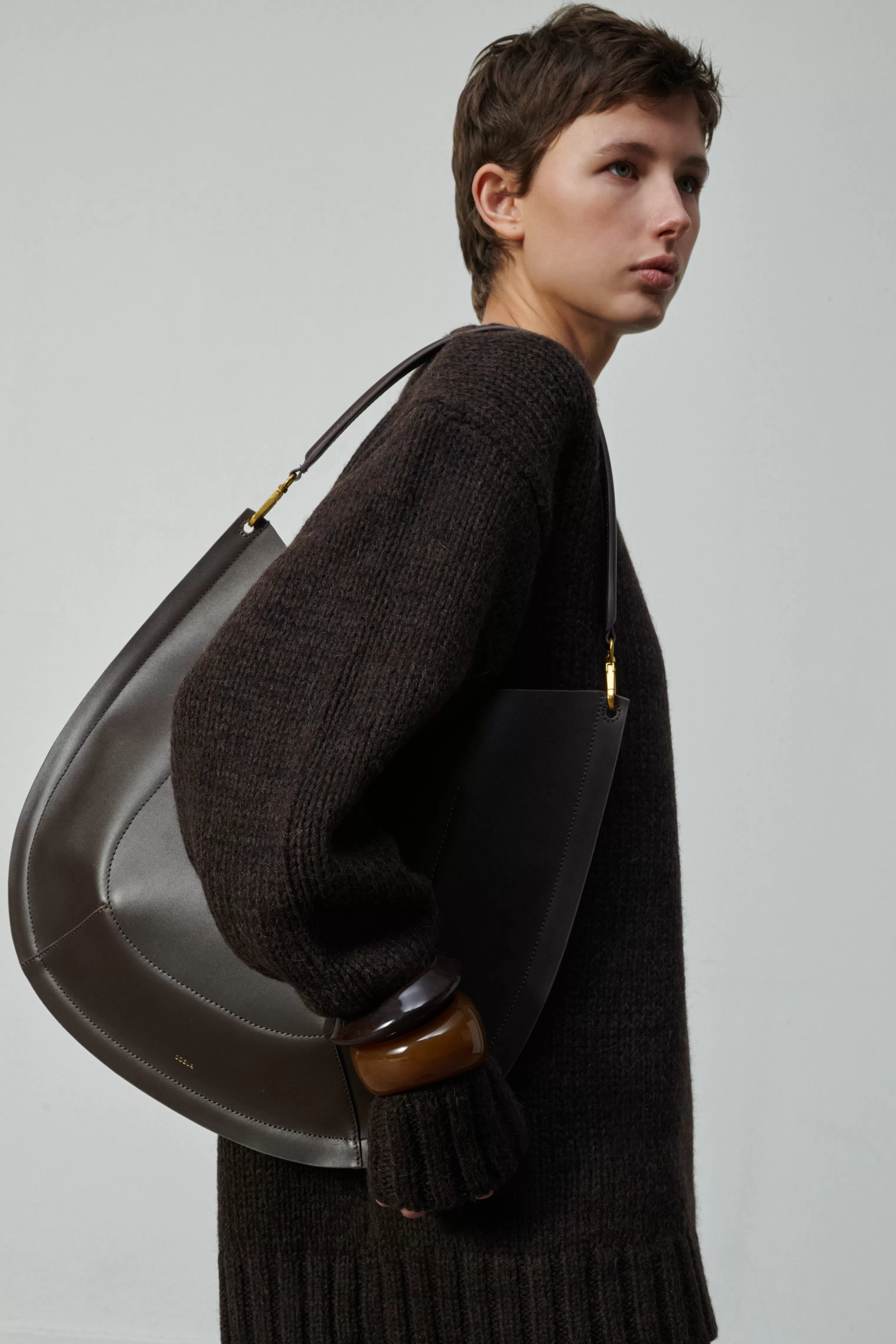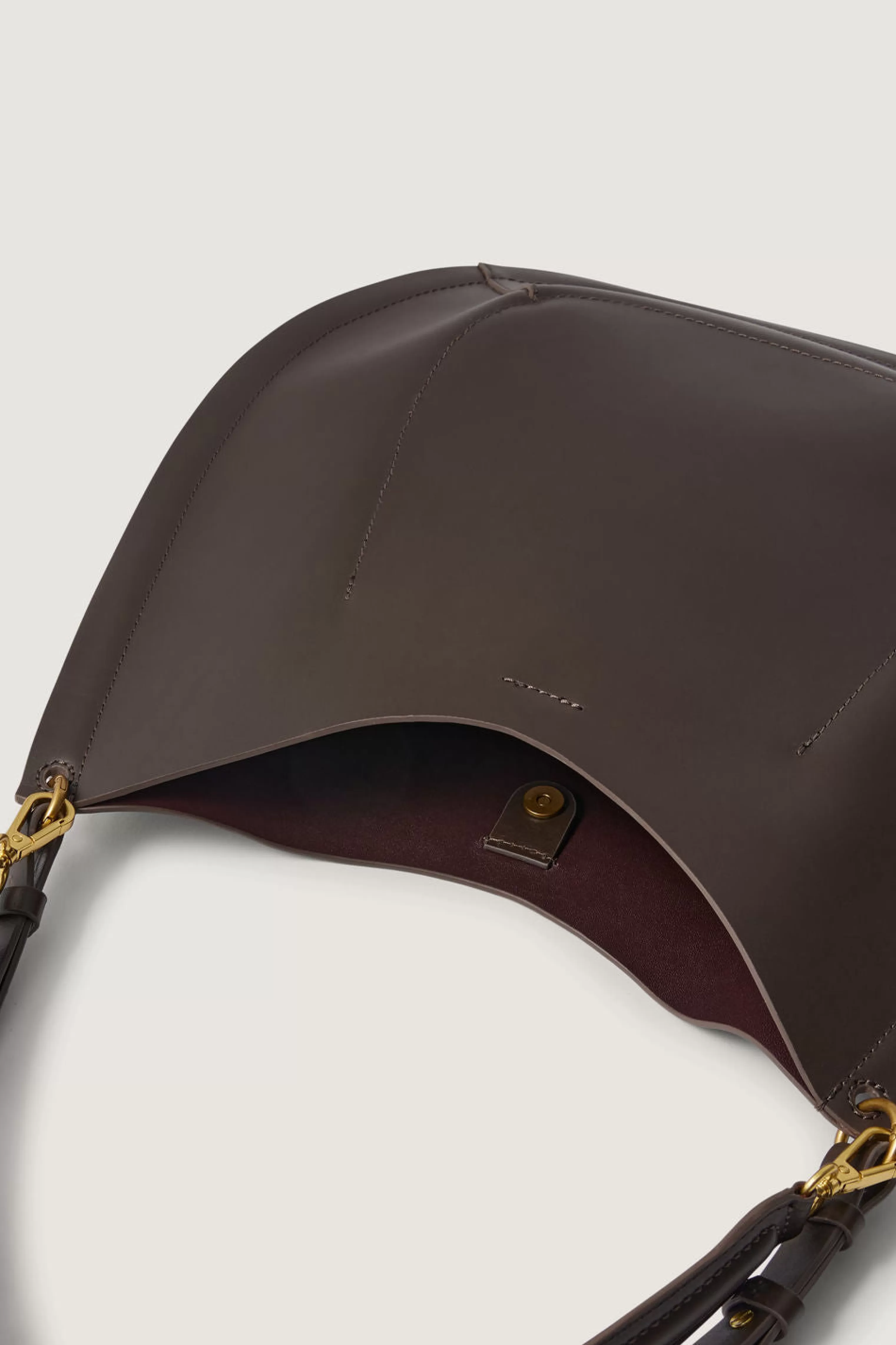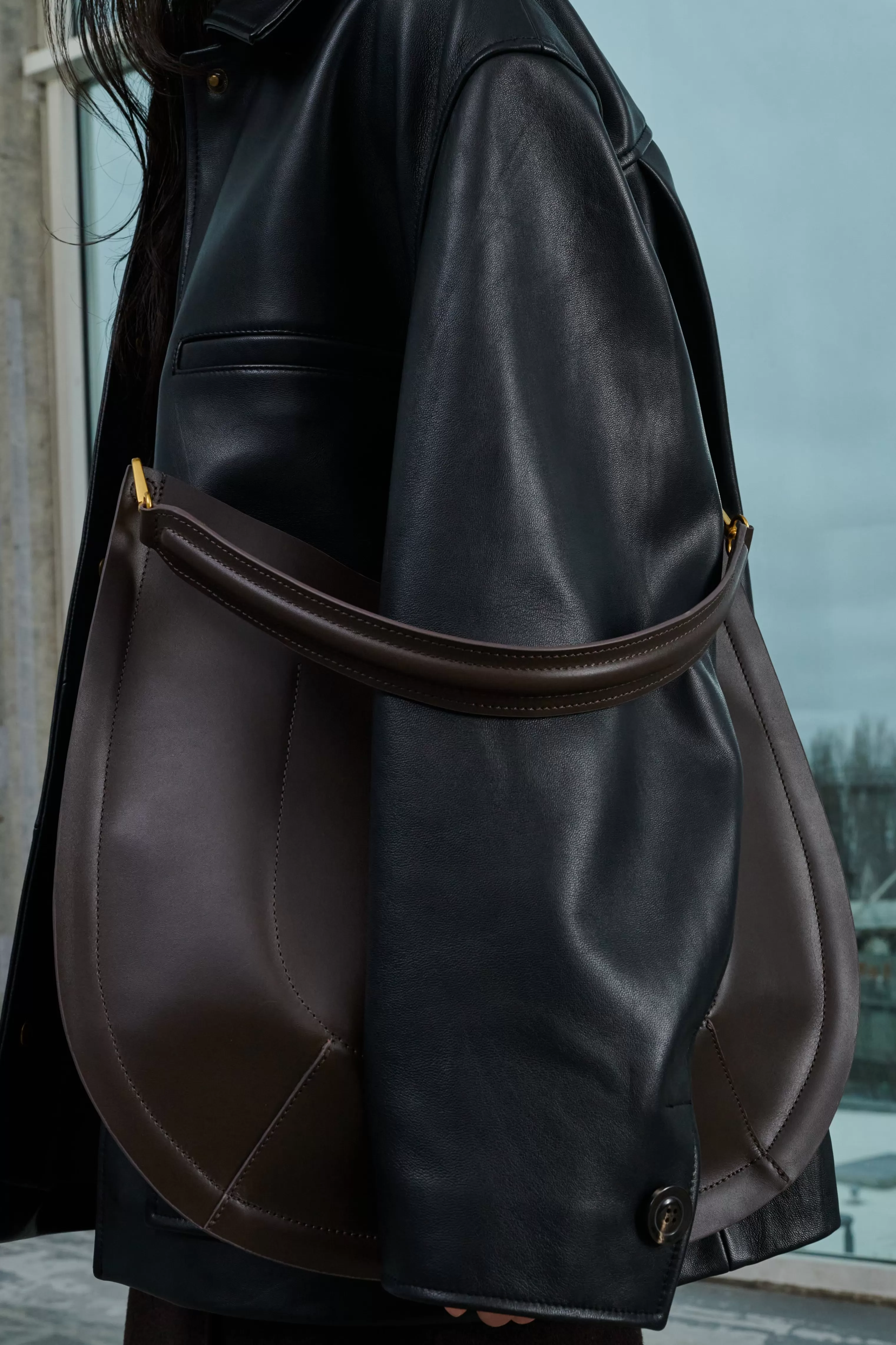 Sac en cuir lisse charbon – Fermeture par bouton-pression– Coins inférieurs arrondis et bombés– Anse en cuir courte amovible 46cm– Une bandoulière en coton et cuir amovible et ajustable, longueur 92cm– Pochette intérieure – Métallerie dorée– Dimensions 40cm x 40cm – Doublure cuir d’agneau