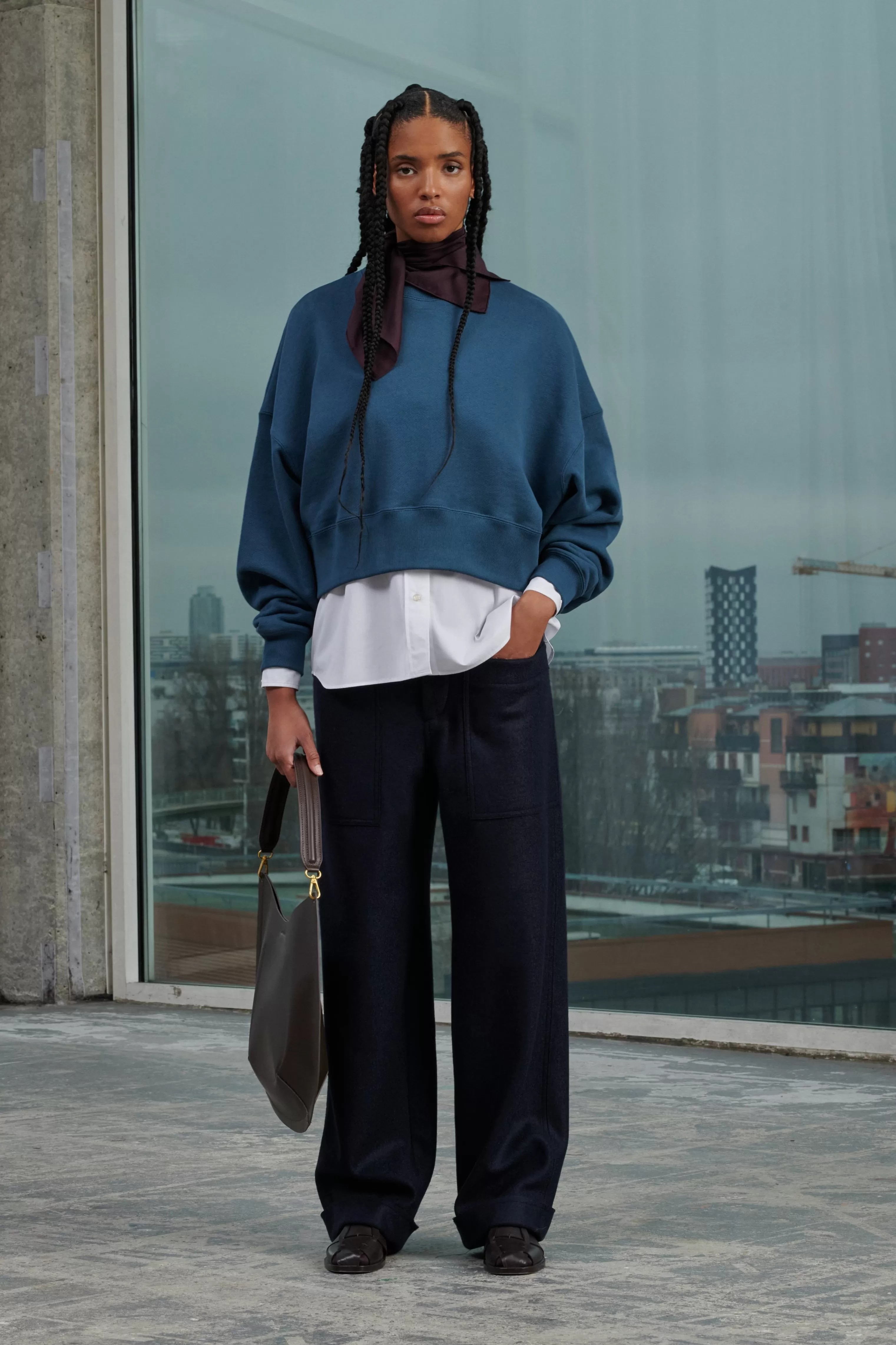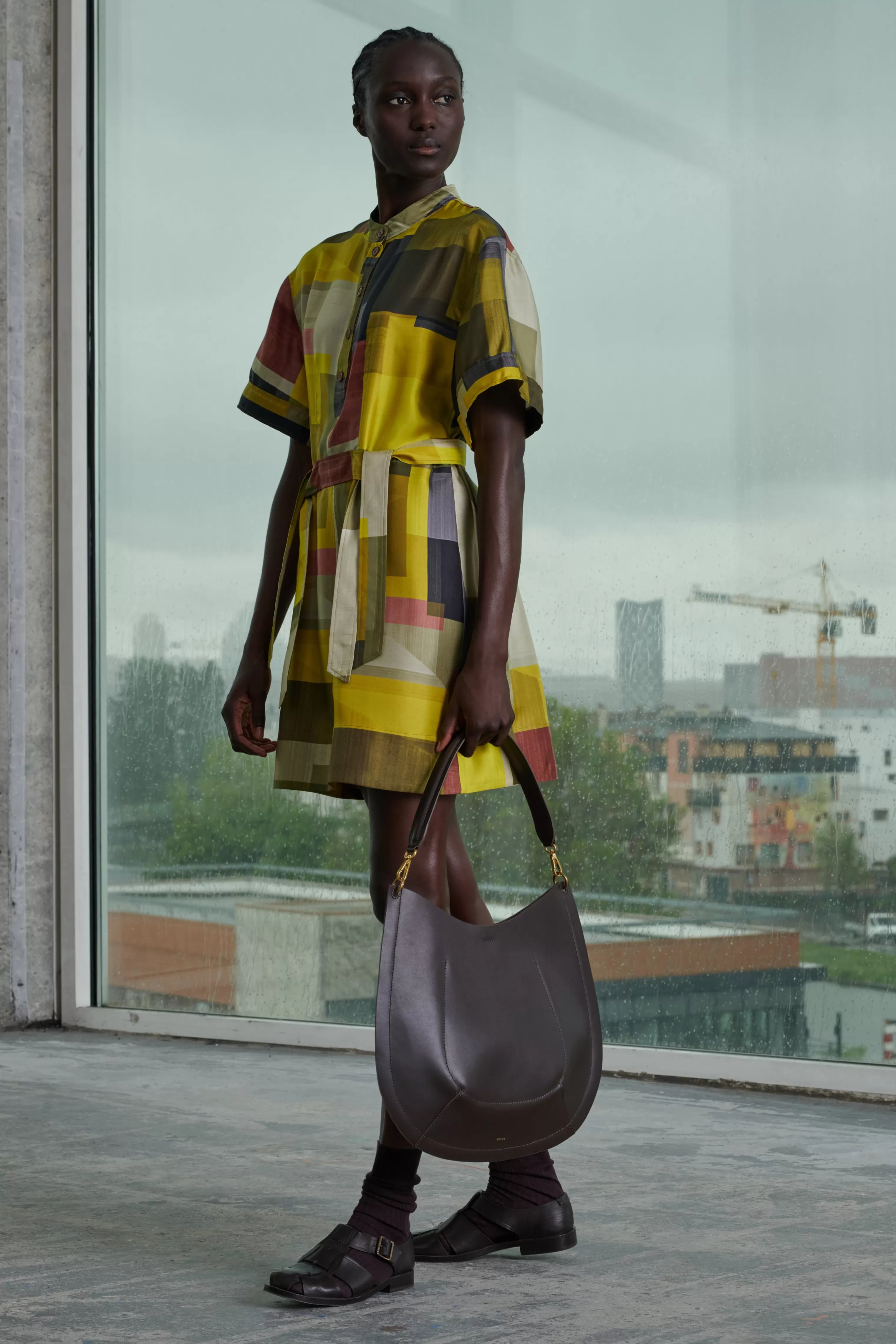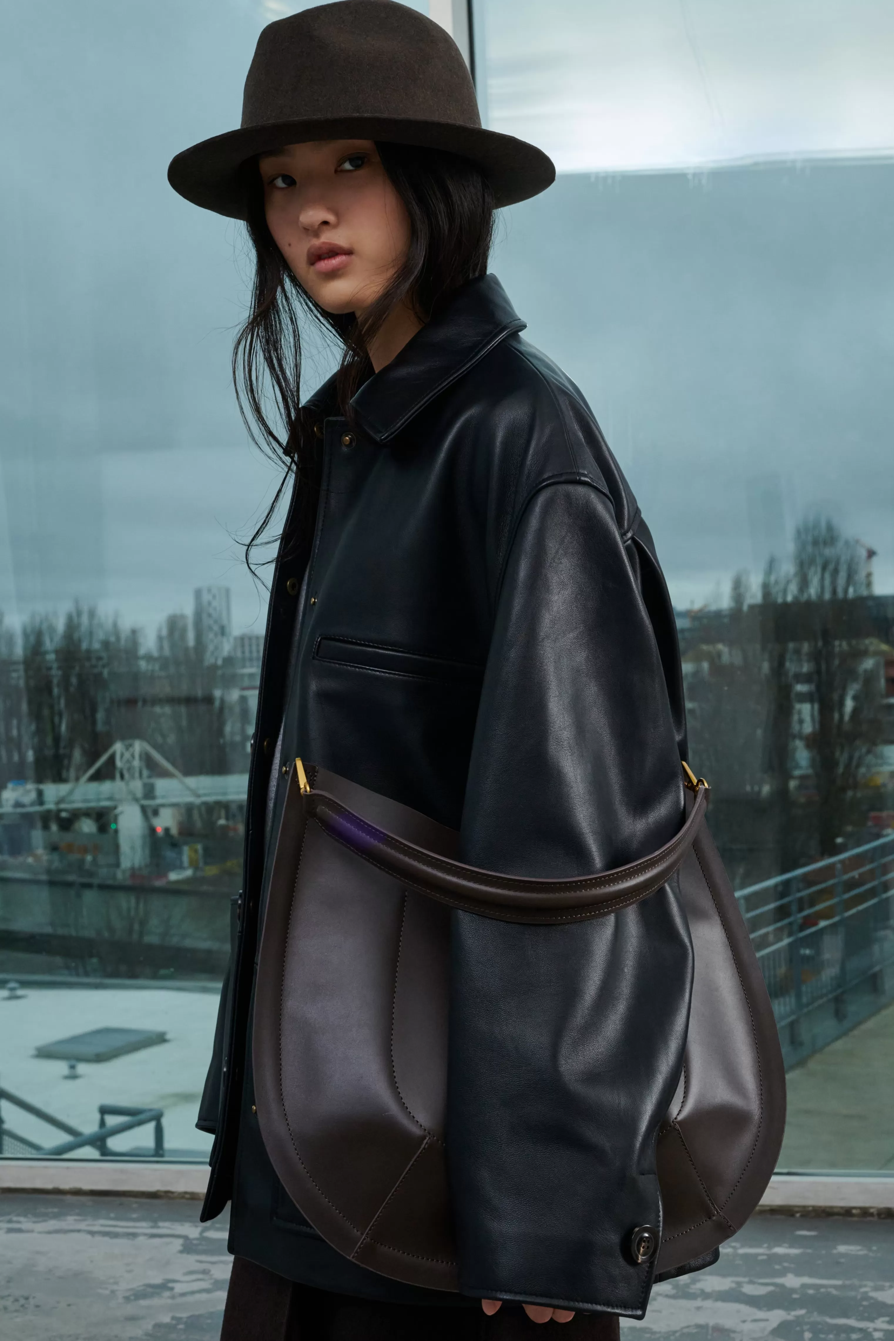 Sac en cuir lisse charbon – Fermeture par bouton-pression– Coins inférieurs arrondis et bombés– Anse en cuir courte amovible 46cm– Une bandoulière en coton et cuir amovible et ajustable, longueur 92cm– Pochette intérieure – Métallerie dorée– Dimensions 40cm x 40cm – Doublure cuir d’agneau