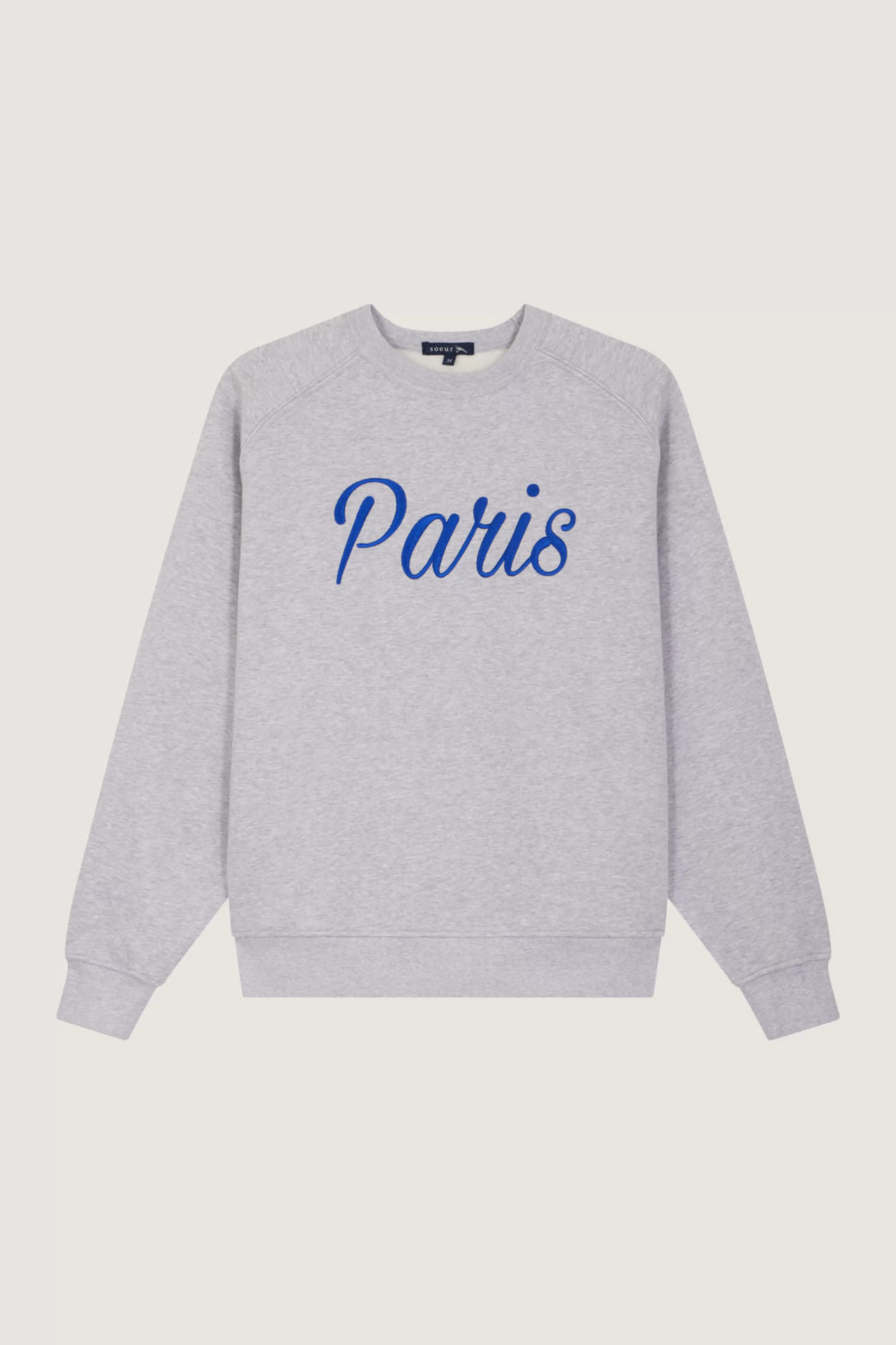 Sweat-shirt oversize avec broderie – Volume ample, encolure ronde– Finitions bord côtes– Inscription « Paris » brodée en bleu– Emmanchures marteau et finitions passepoiles