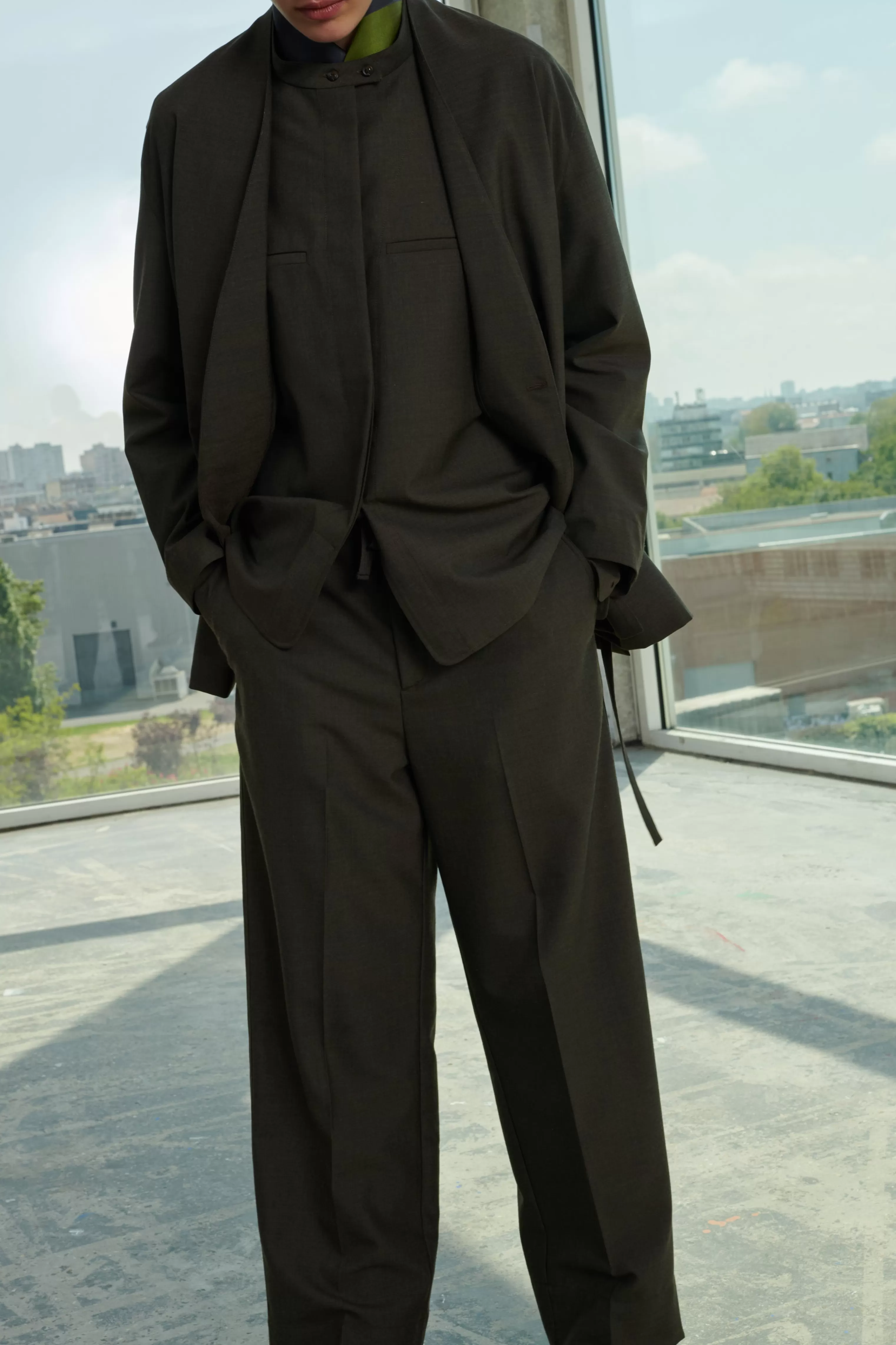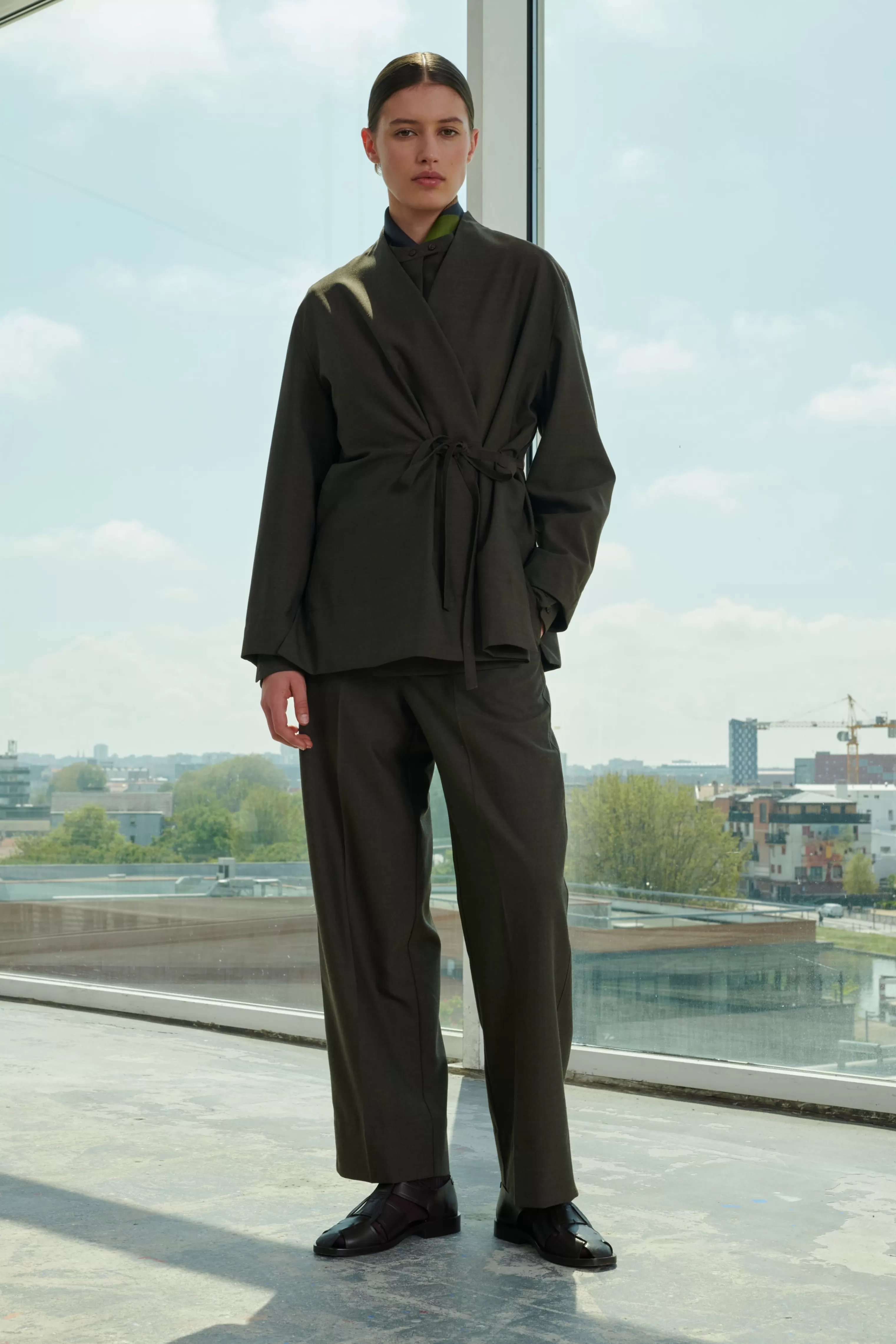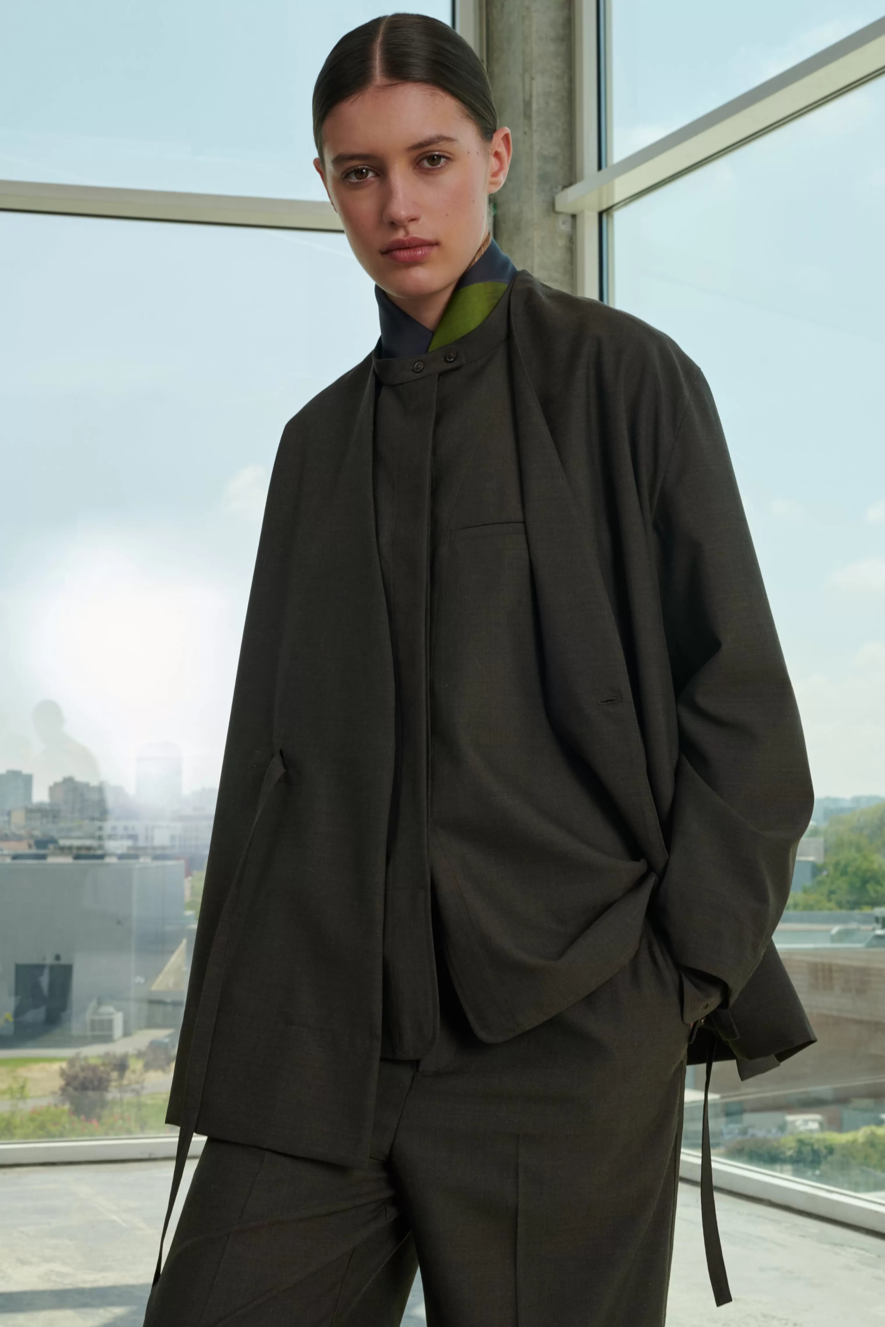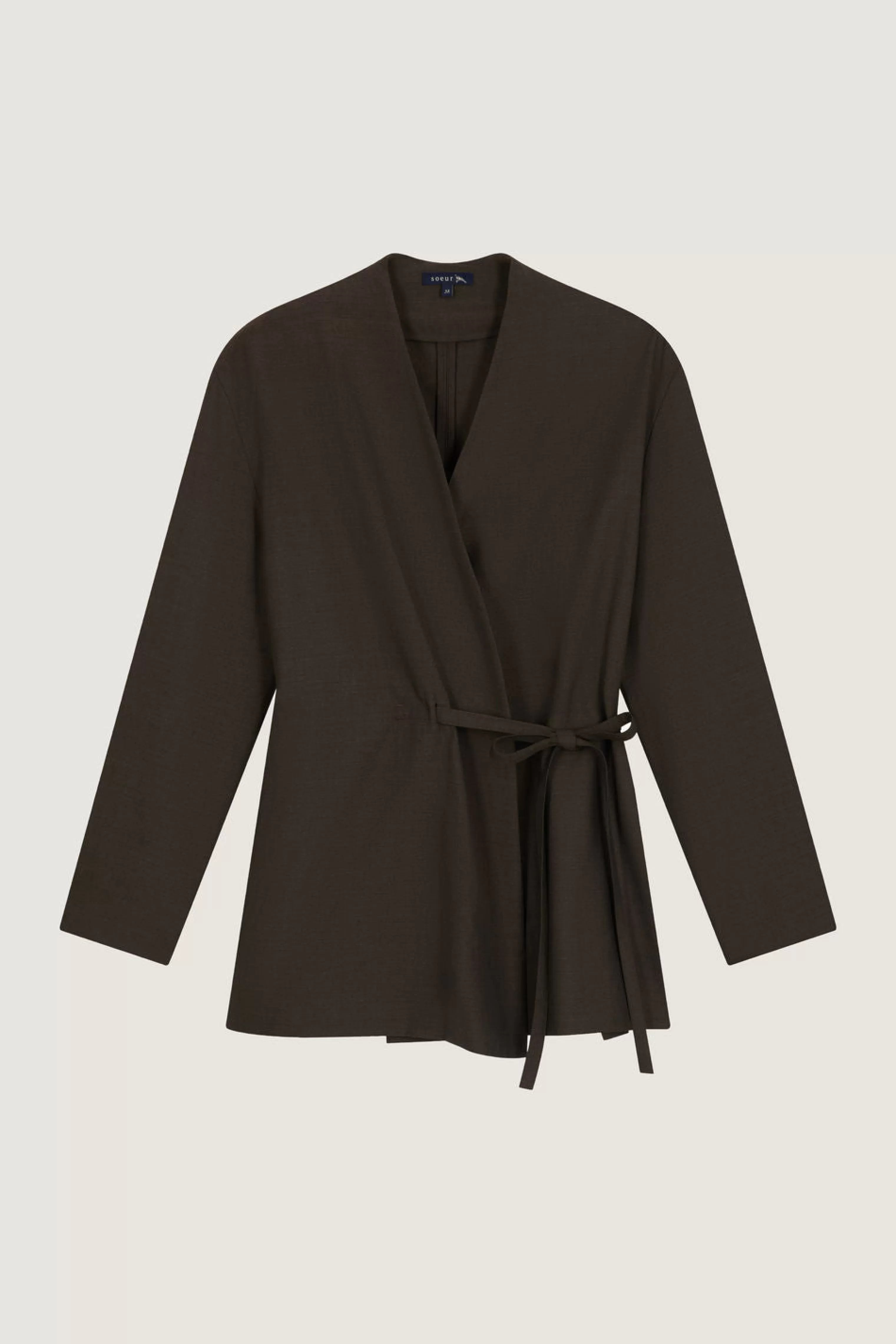 Veste ceinturée en toile de laine souple – Veste portefeuille– Manches longues et coudées– Ouverture devant asymétrique avec liens de serrage– Fentes aux côtés